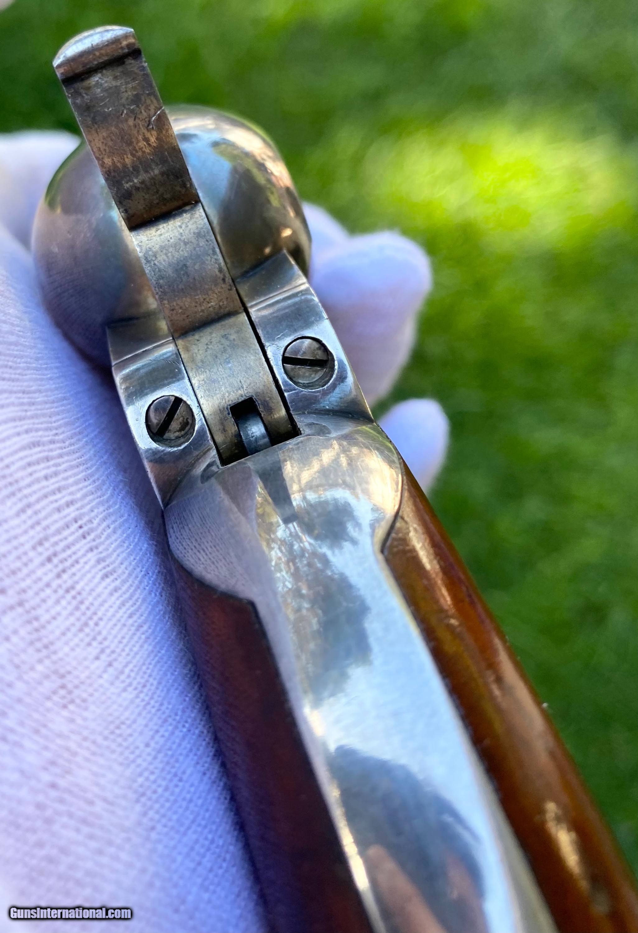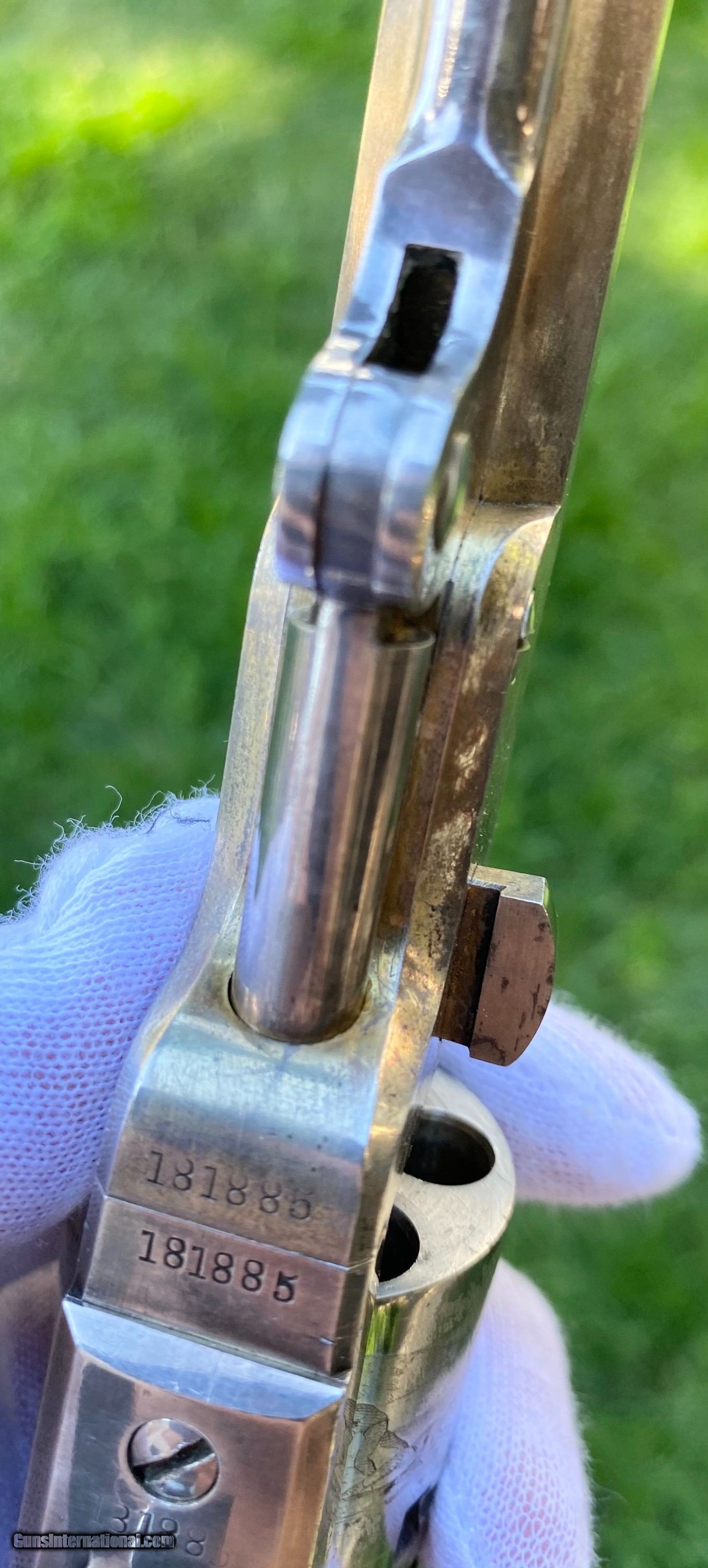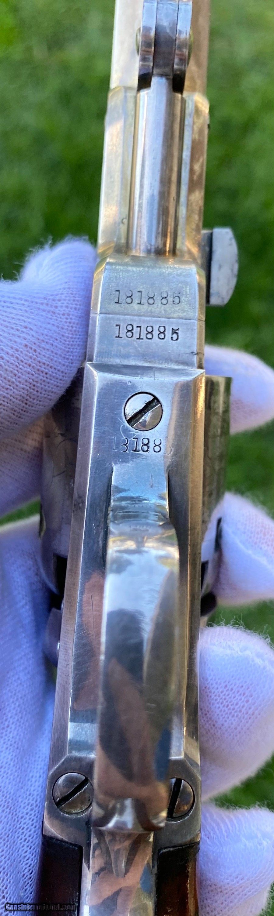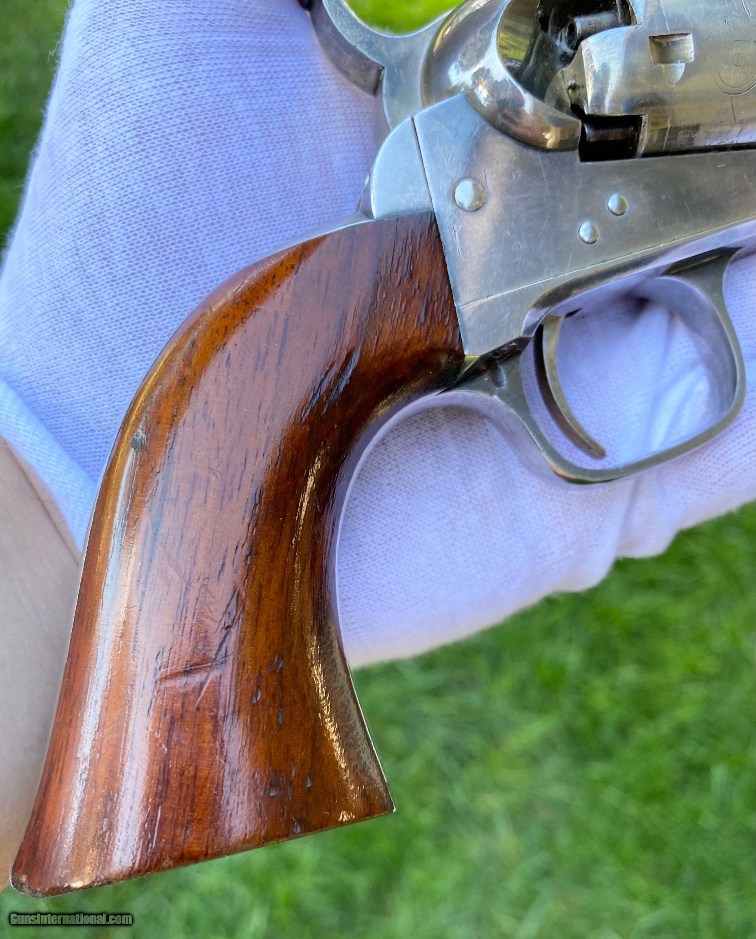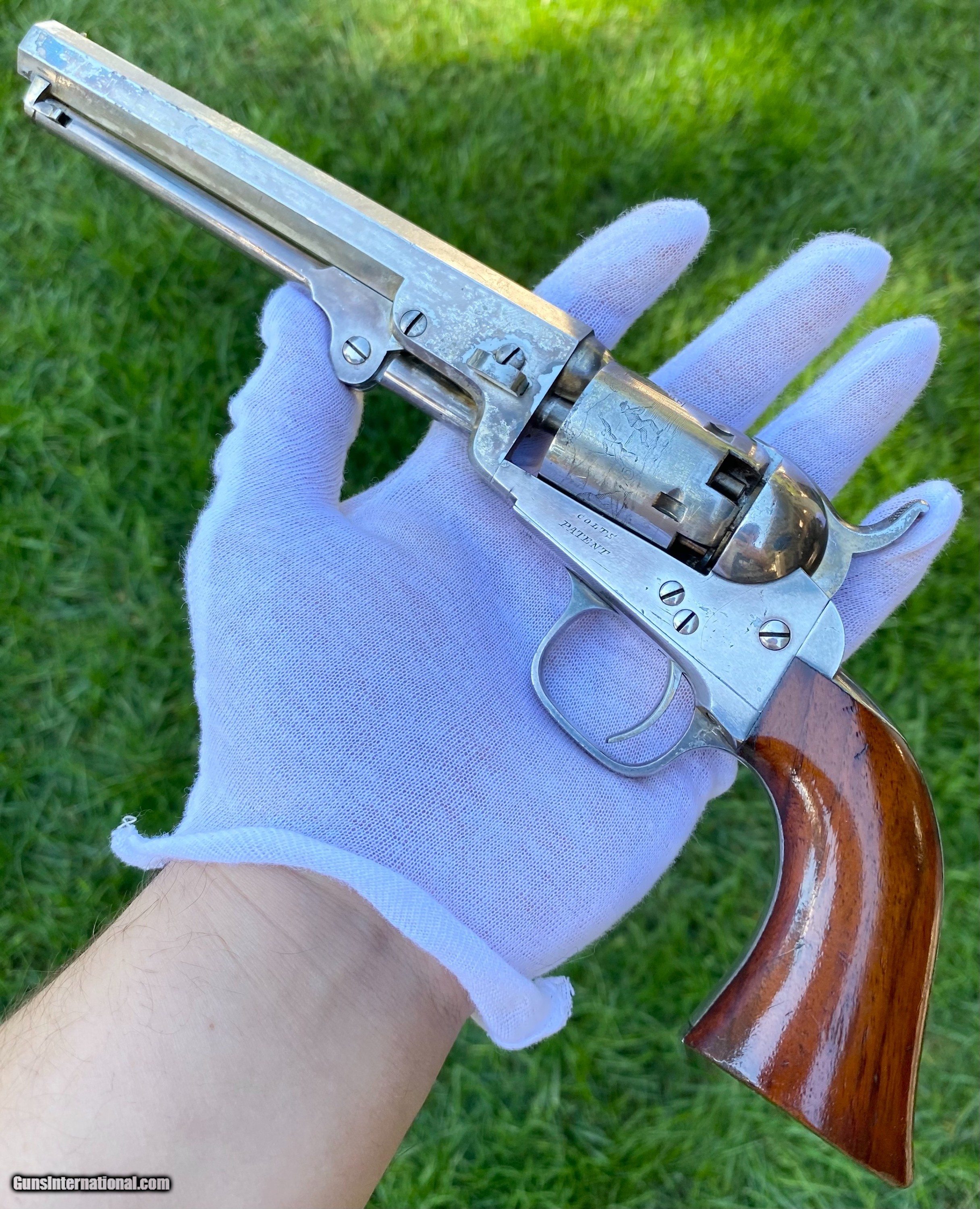 Description: This is an absolutely gorgeous Colt 1849 Pocket with the desirable 6” barrel. This Colt features a unique silver gilt finish. The way this Colt was finished is very interesting, very few, possibly this being the only of its type were manufactured with this type of finish. This example also has the “Colts Patent” marking on the frame factory engraved. This Colt was part of Samuel Colts personal collection and eventually the Colt Factory collection. The pedigree is featured in the booklet of documentation that accompanies this revolver. It was in Colts personal cabinet in his office in the case on the lower right shelf. Its amazing to think that your holding and admiring something that Samuel Colt actually held and admired also. This is truly an honor to own one of Samuel Colts personal guns. Not to many can say that they’ve owned one or do own one! 99% all of the original finish remains. Excellent, mint grips. Mechanically excellent. A true stunner and collection definer. Shipping method can be chosen by the buyer. Shipping will be cost plus actual insurance amount. All offers considered. Asking: $15,500.00 SOLD Antique: Yes |