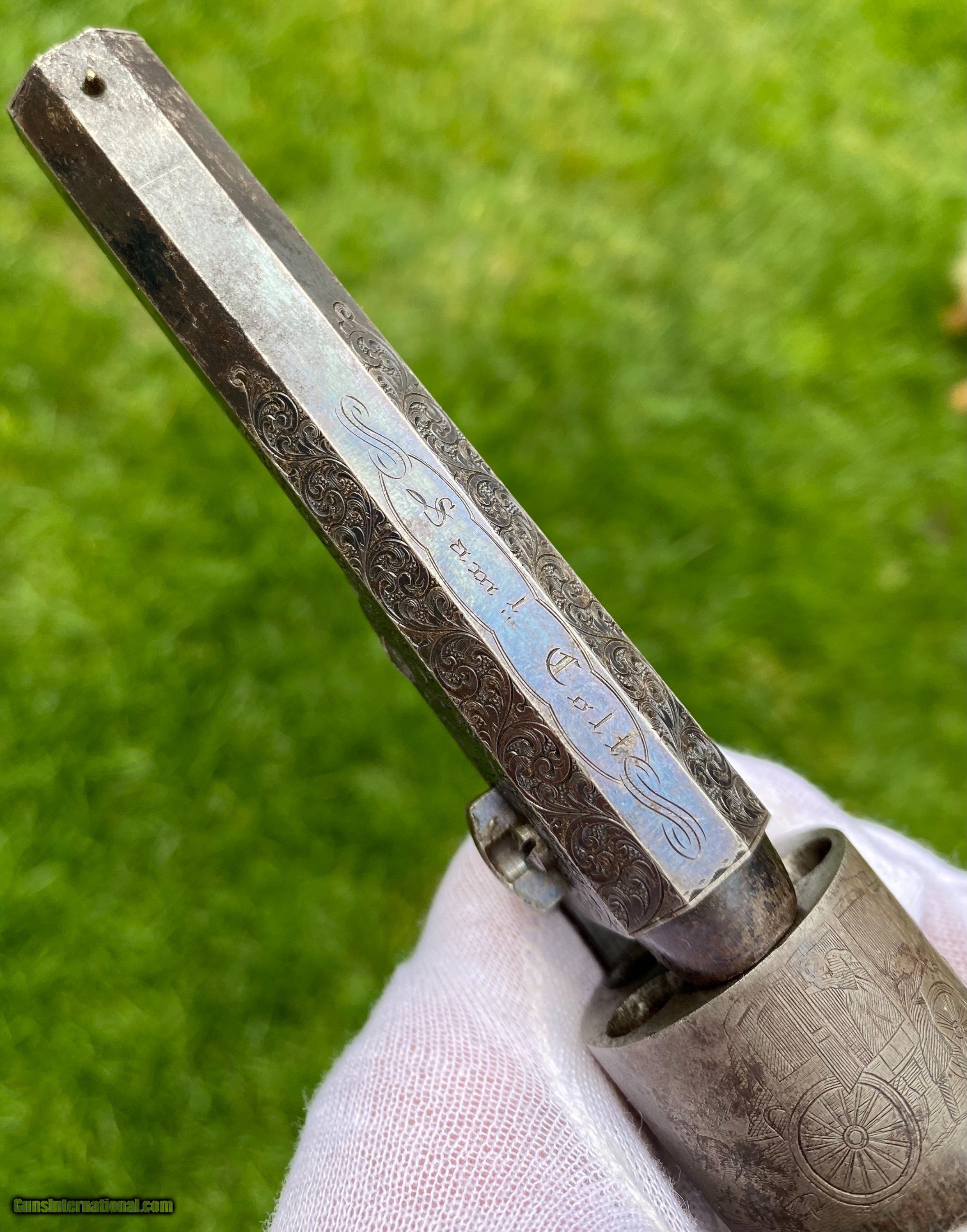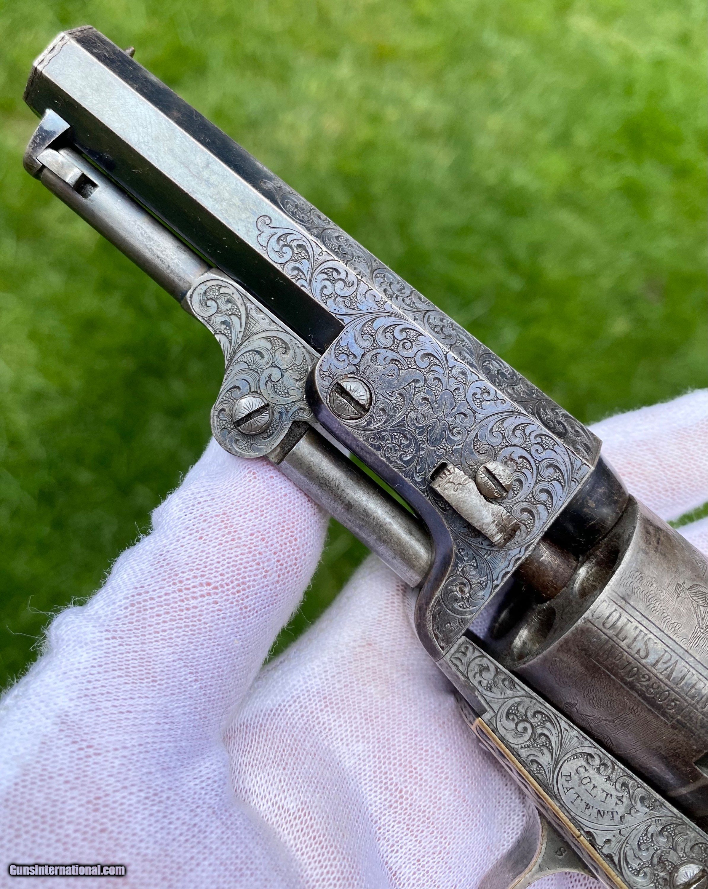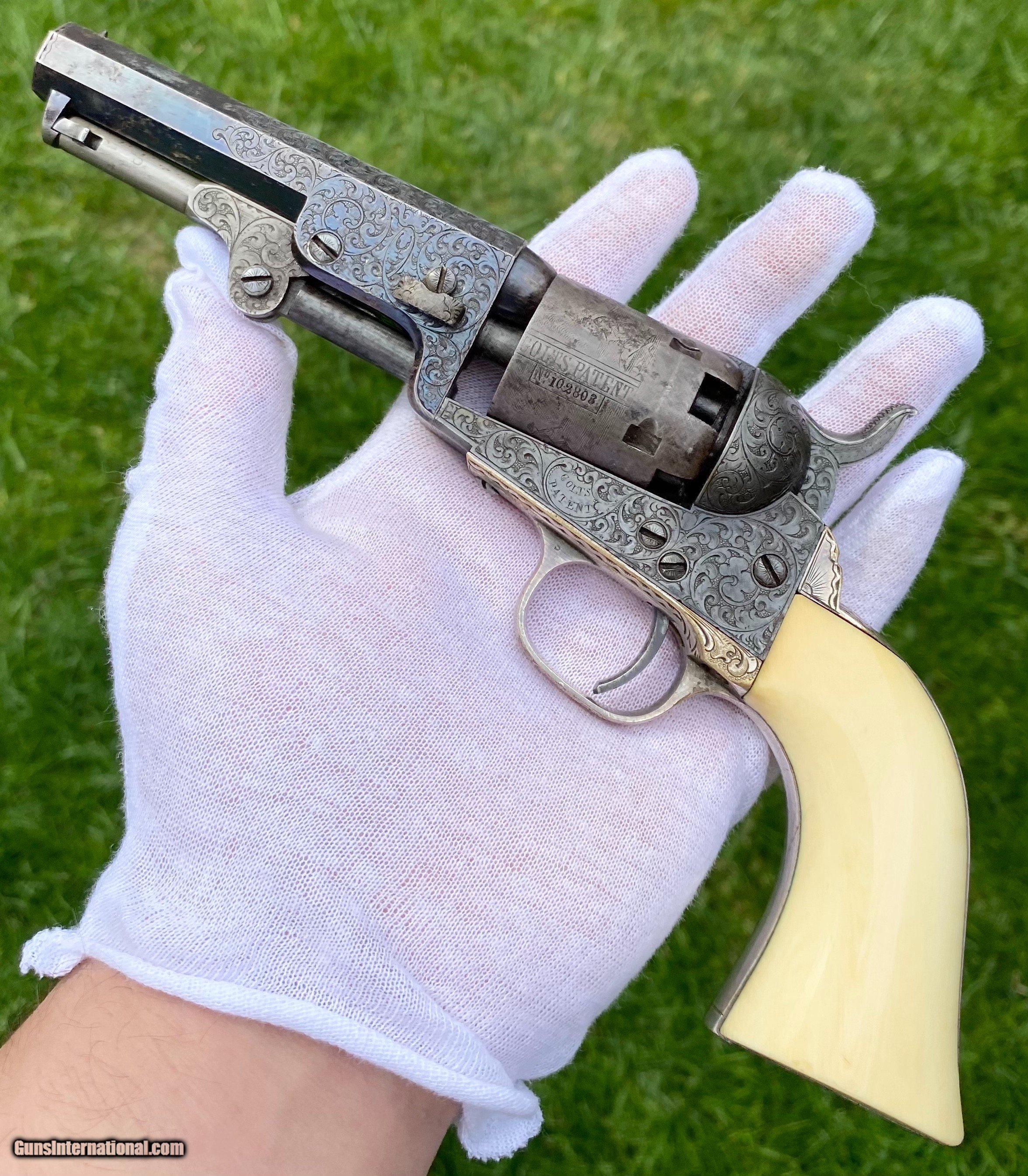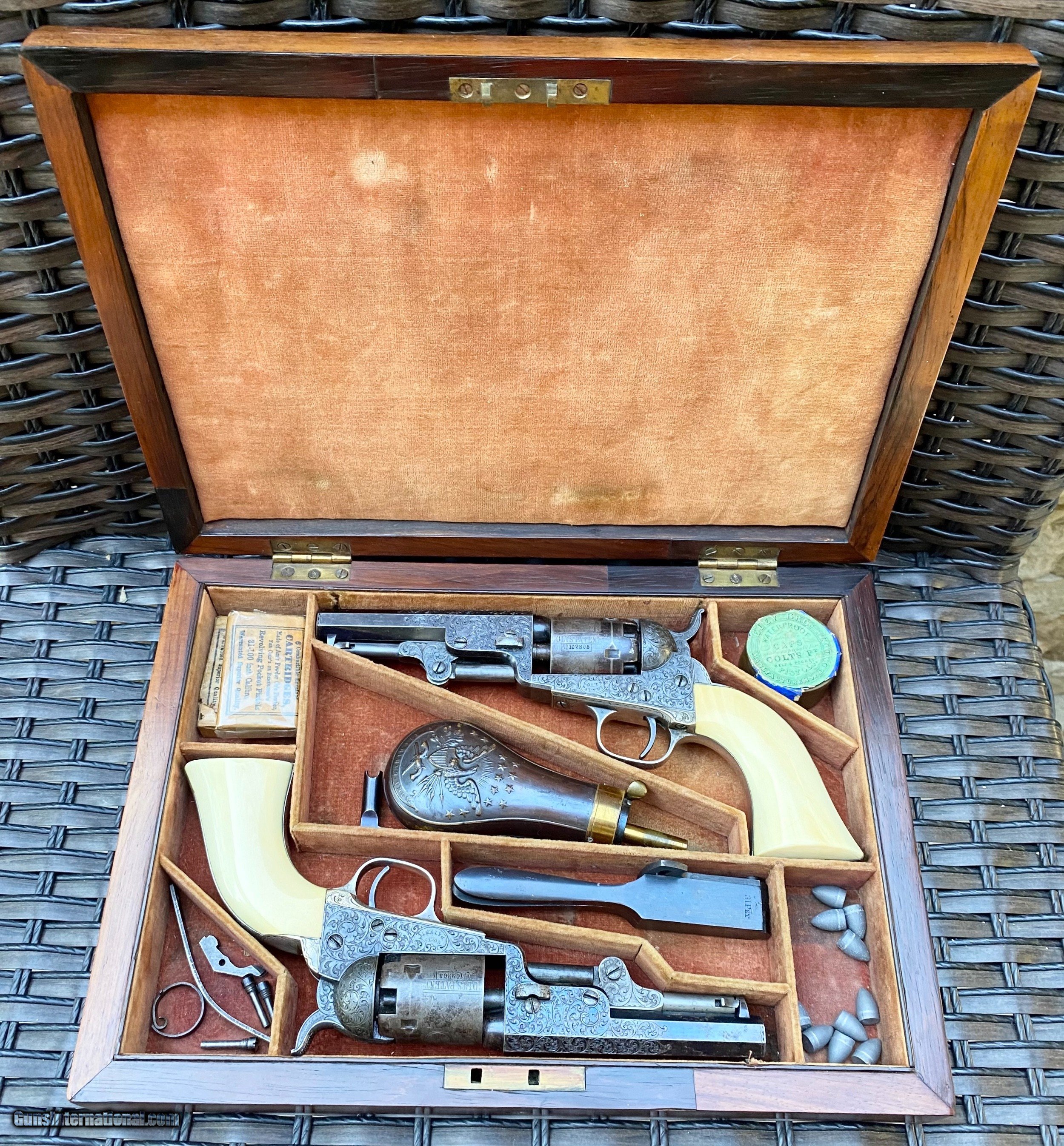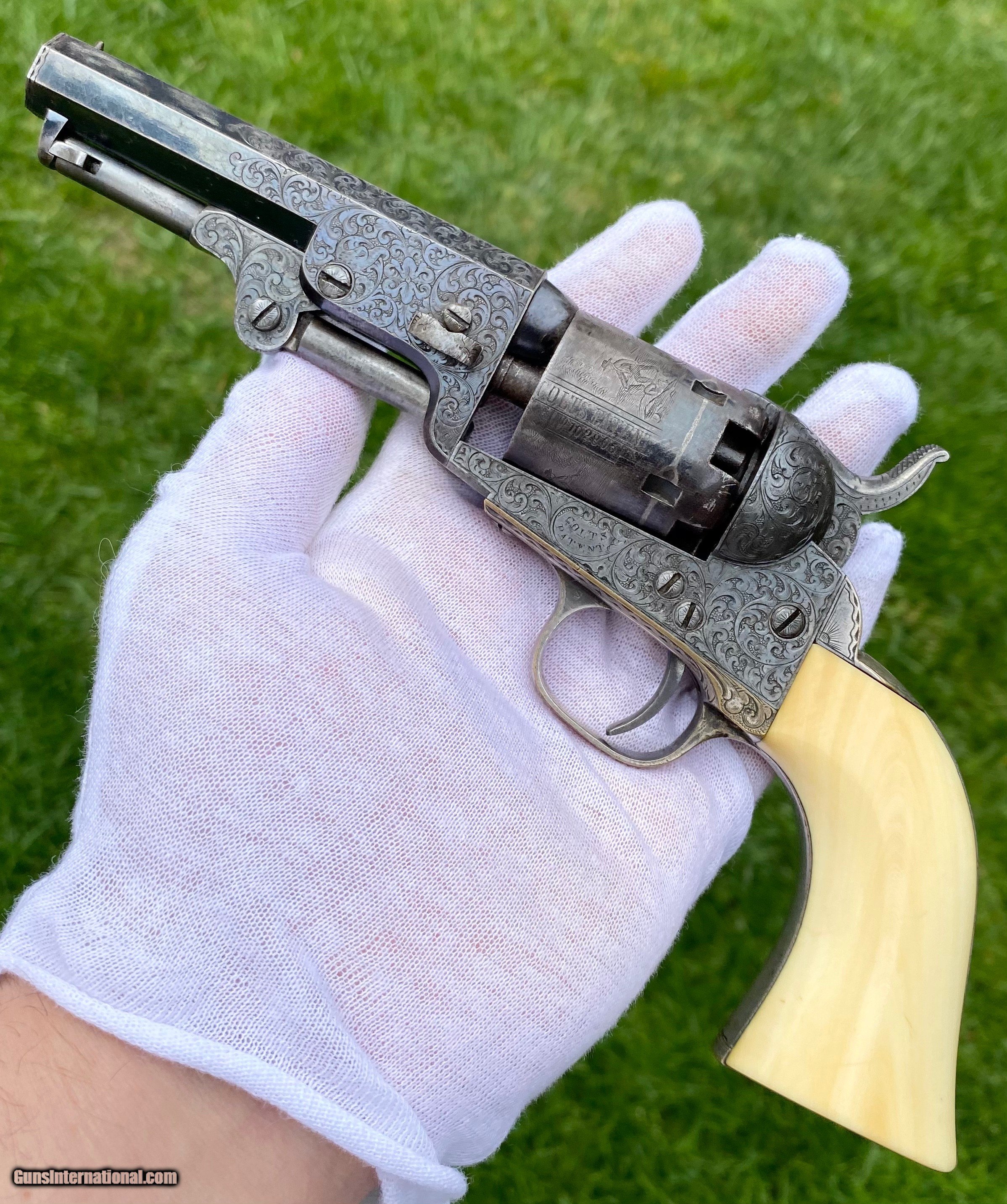Description: This is an exceptional and investment quality true pair of Colt Model 1849 Pocket revolvers. This set is as real deal as they come, these examples have 1 serial number between one another. The case and accessories that these 2 revolvers are housed in, is a genuine original double casing, all accessories are very fine to exceptional condition. The 2 Colts follow closely behind in condition. Serial number #102805 shows virtually all of its original blue finish on the barrel. Some original blue on the cylinder with a fine scene. Silvered patterns of the case hardened finish are visible with stronger patterns showing through. Very deluxe factory engraving done by the hand of the Master Gustave Young with a script "Saml Colt" barrel address. Serial number #102803 also presents some very deluxe factory engraving by Gustave Young. It also features the script "Saml Colt" barrel address. The gun itself shows most of the original barrel blue. The frame shows silvered patterns of the case hardened finish with more vibrant areas also. The cylinder also shows traces of barrel blue. The mechanics on both of the revolvers functions excellent. Both pistols nearly match identical in condition. They are a fantastic true pair of Factory Engraved Colt 1849 revolvers. This pair, when the market was strong brought a lot more money at then I have them priced at. (Nearly double). These have been apart of 2 exceptional collections, although I have to keep the names confidential, the buyer will be supplied by the collectors names. All reasonable offers are considered! This is the best pair on the market for the most reasonable price by far. Shipping method can be chosen by the buyer. Buyer to pay actual shipping and insurance cost. Thank you! Many more photographs available upon request. Asking $37,500.00 Sale Pending SOLD Antique: Yes |