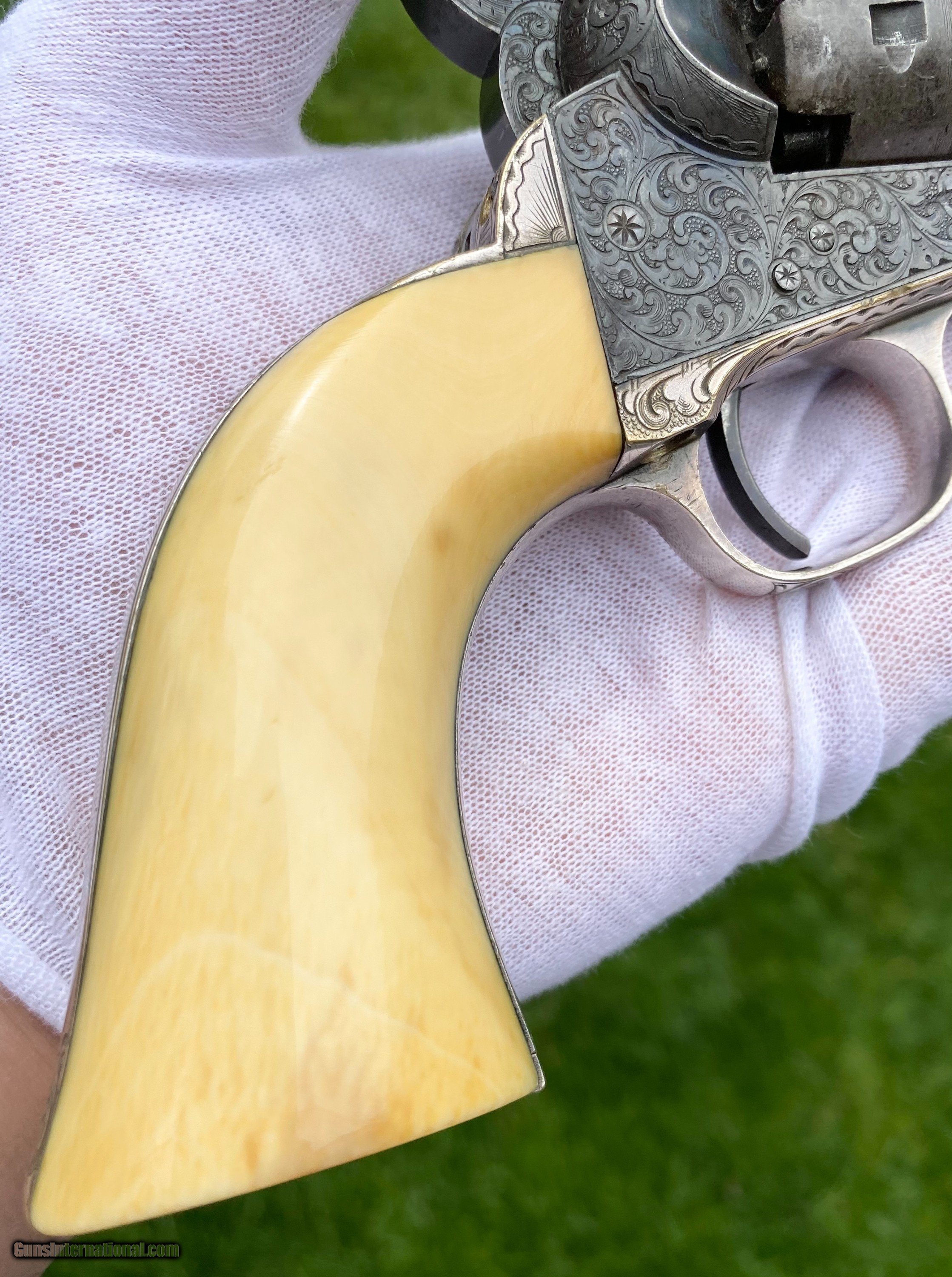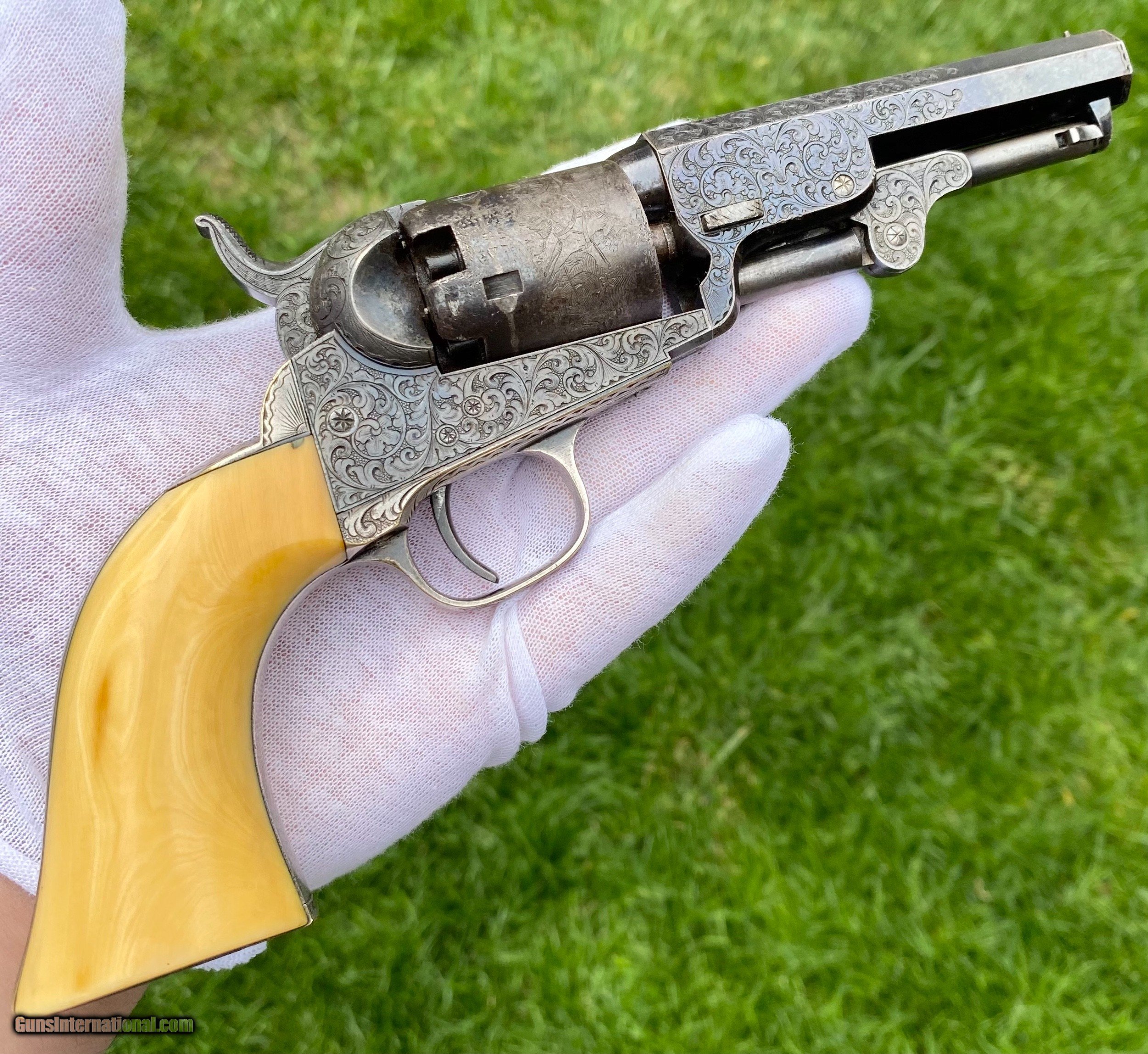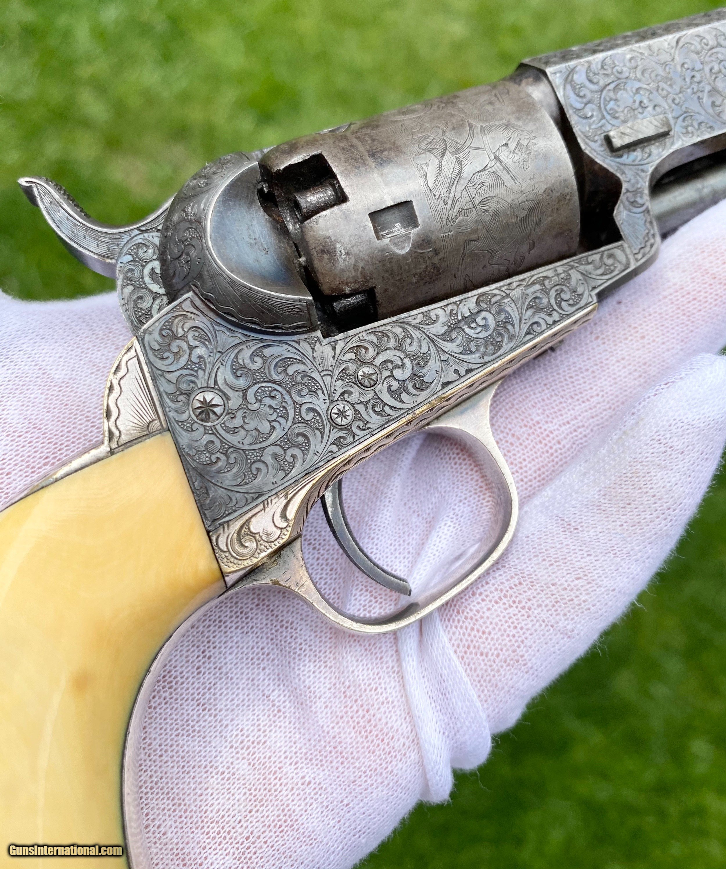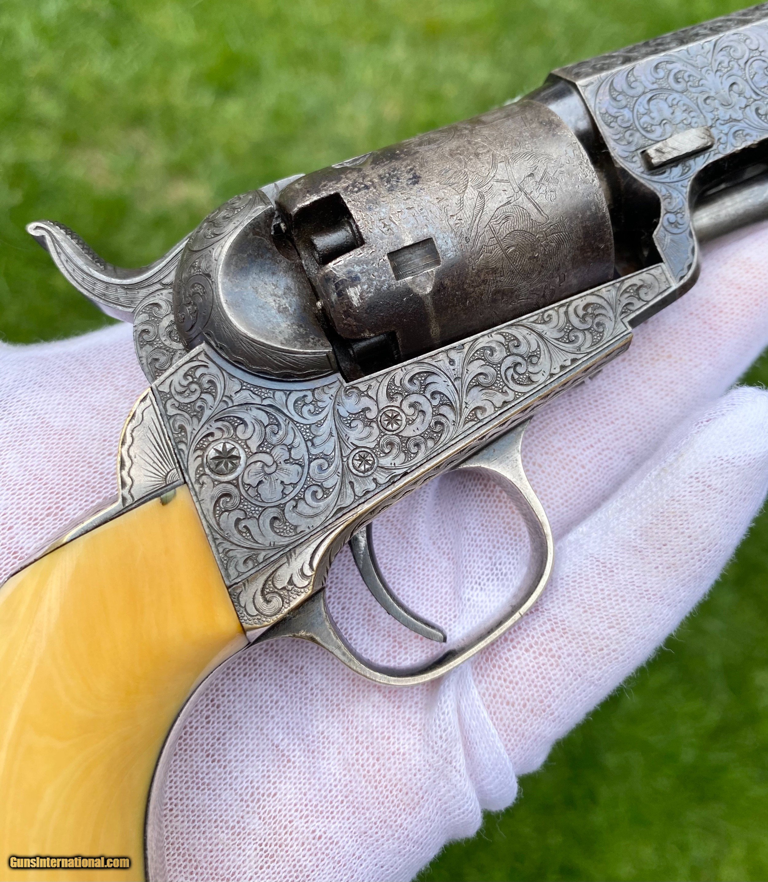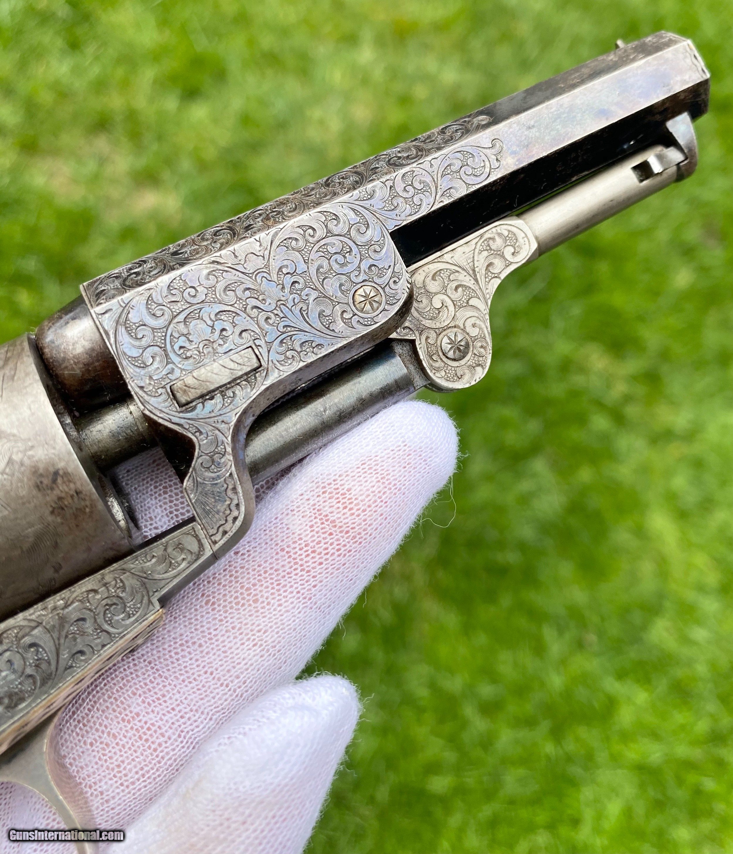 Description: This is an exceptional and investment quality true pair of Colt Model 1849 Pocket revolvers. This set is as real deal as they come, these examples have 1 serial number between one another. The case and accessories that these 2 revolvers are housed in, is a genuine original double casing, all accessories are very fine to exceptional condition. The 2 Colts follow closely behind in condition. Serial number #102805 shows virtually all of its original blue finish on the barrel. Some original blue on the cylinder with a fine scene. Silvered patterns of the case hardened finish are visible with stronger patterns showing through. Very deluxe factory engraving done by the hand of the Master Gustave Young with a script "Saml Colt" barrel address. Serial number #102803 also presents some very deluxe factory engraving by Gustave Young. It also features the script "Saml Colt" barrel address. The gun itself shows most of the original barrel blue. The frame shows silvered patterns of the case hardened finish with more vibrant areas also. The cylinder also shows traces of barrel blue. The mechanics on both of the revolvers functions excellent. Both pistols nearly match identical in condition. They are a fantastic true pair of Factory Engraved Colt 1849 revolvers. This pair, when the market was strong brought a lot more money at then I have them priced at. (Nearly double). These have been apart of 2 exceptional collections, although I have to keep the names confidential, the buyer will be supplied by the collectors names. All reasonable offers are considered! This is the best pair on the market for the most reasonable price by far. Shipping method can be chosen by the buyer. Buyer to pay actual shipping and insurance cost. Thank you! Many more photographs available upon request. Asking $37,500.00 Sale Pending SOLD Antique: Yes |