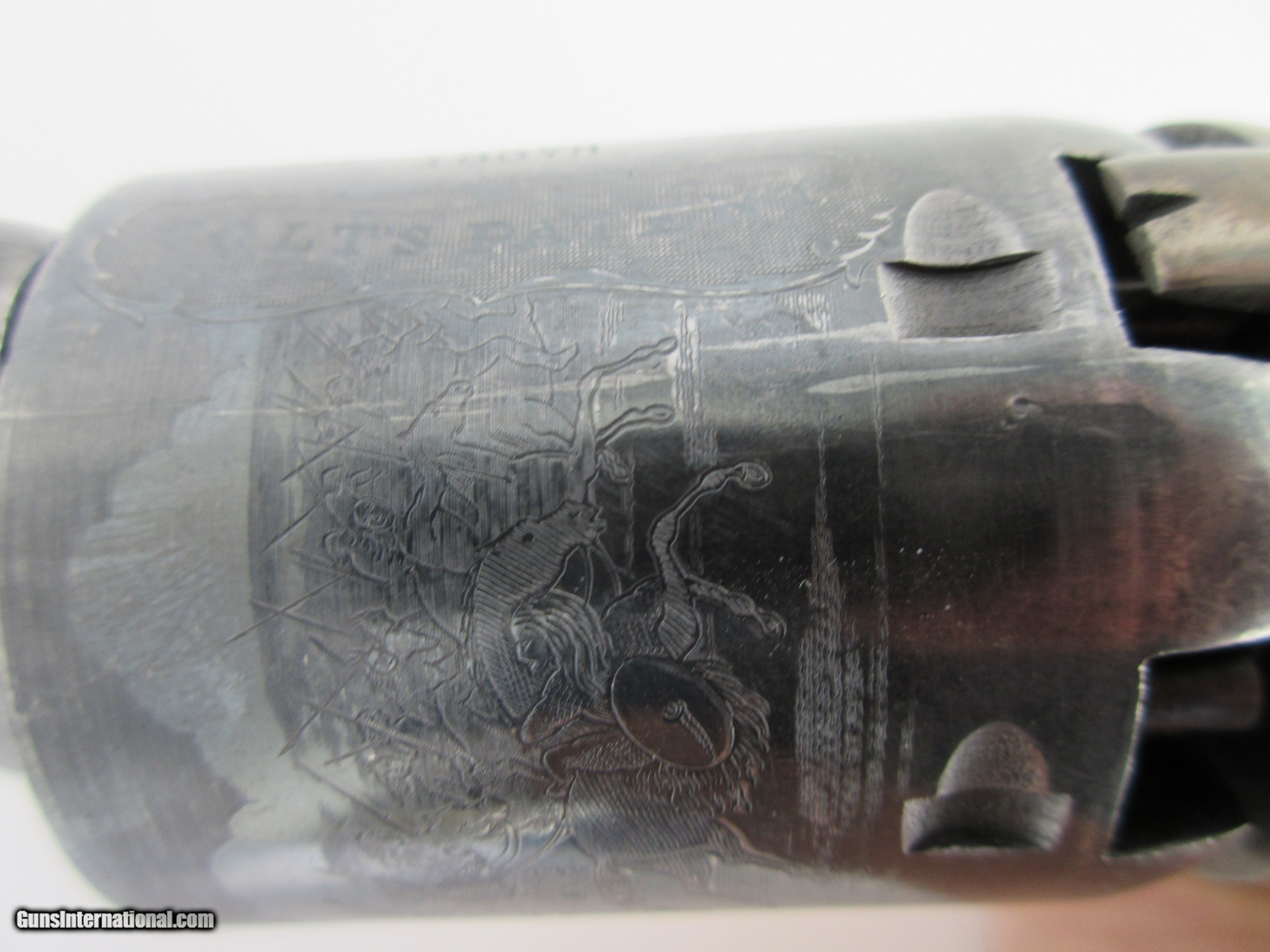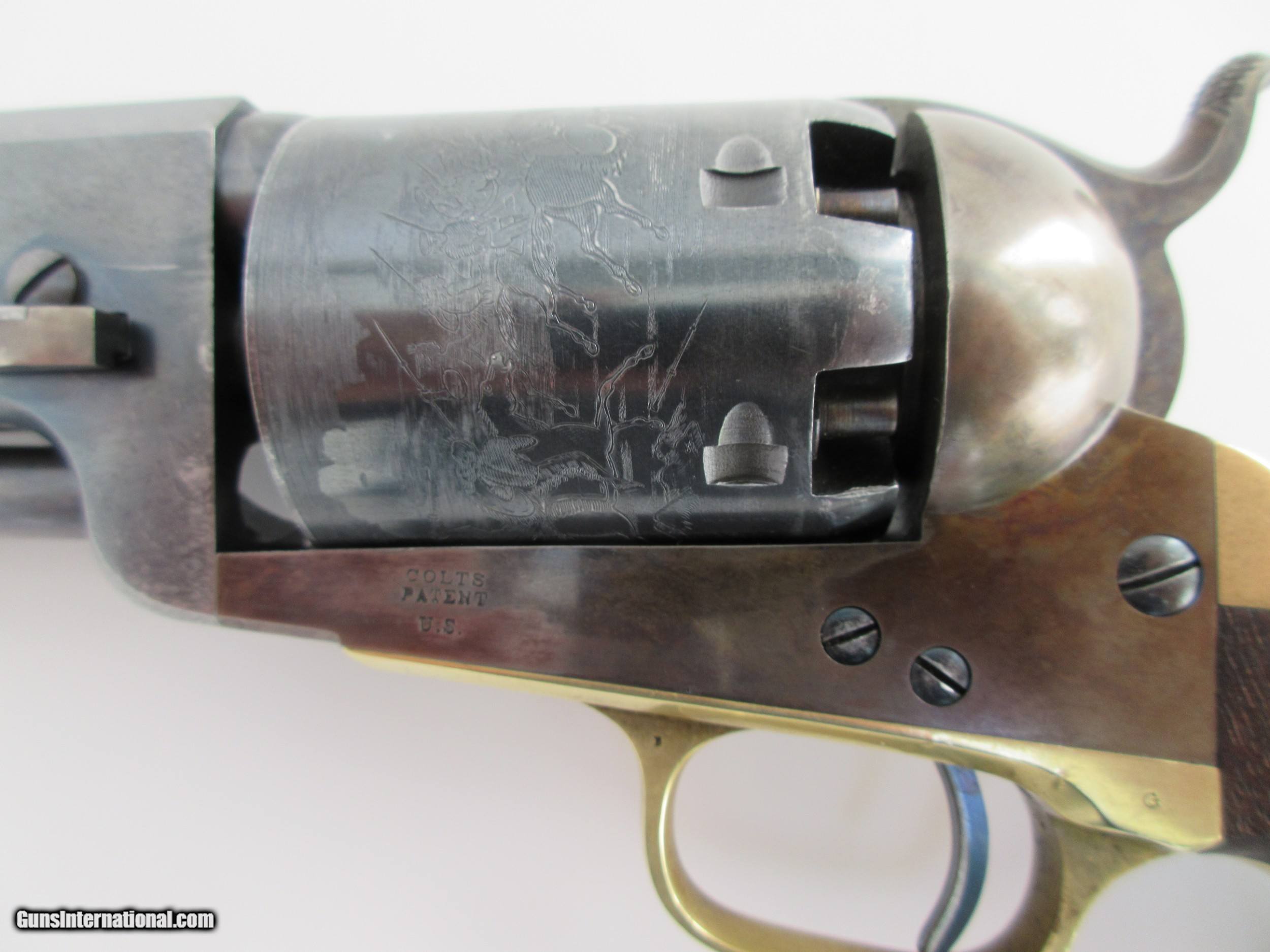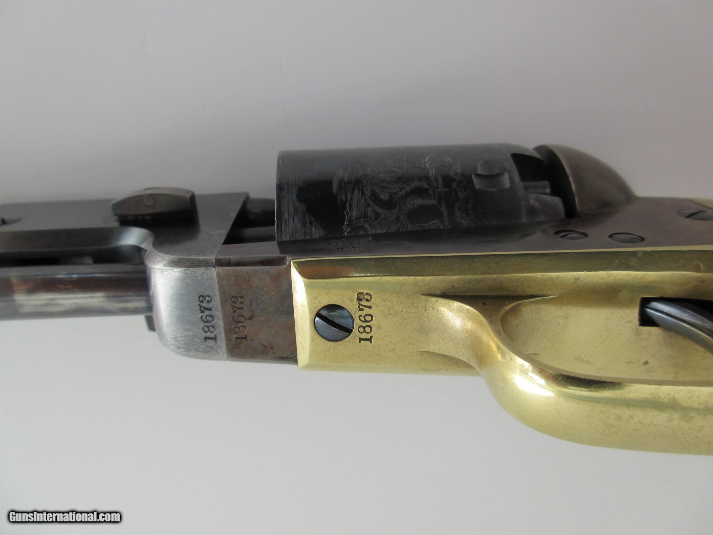 Description: Serial # 18673. 44 cal., 8 inch part round bbl, blue/casehardened finish, walnut grips. Only an estimated 200 U.S. 8 inch Dragoons ever to be produced. Near excellent. The barrel retains 90% strong blue finish, as well as the cylinder with full cylinder scene. The percussion nipples show minimal wear and cylinder safety pins are excellent and way above average condition. The hammer and frame have 70 % color case with loading lever thinning. The grips are oil finished and are excellent, as well. Bore is sharp with slight pitting. Flash pitting in back of cylinder hammer slot and recoil sheild. A definite must have for the serious colt collector! Flayderman's Guide 9th edition shows the value at $ 37,500.00 fine condition. Possible trade on Henry Rifle. SOLD Antique: Yes |