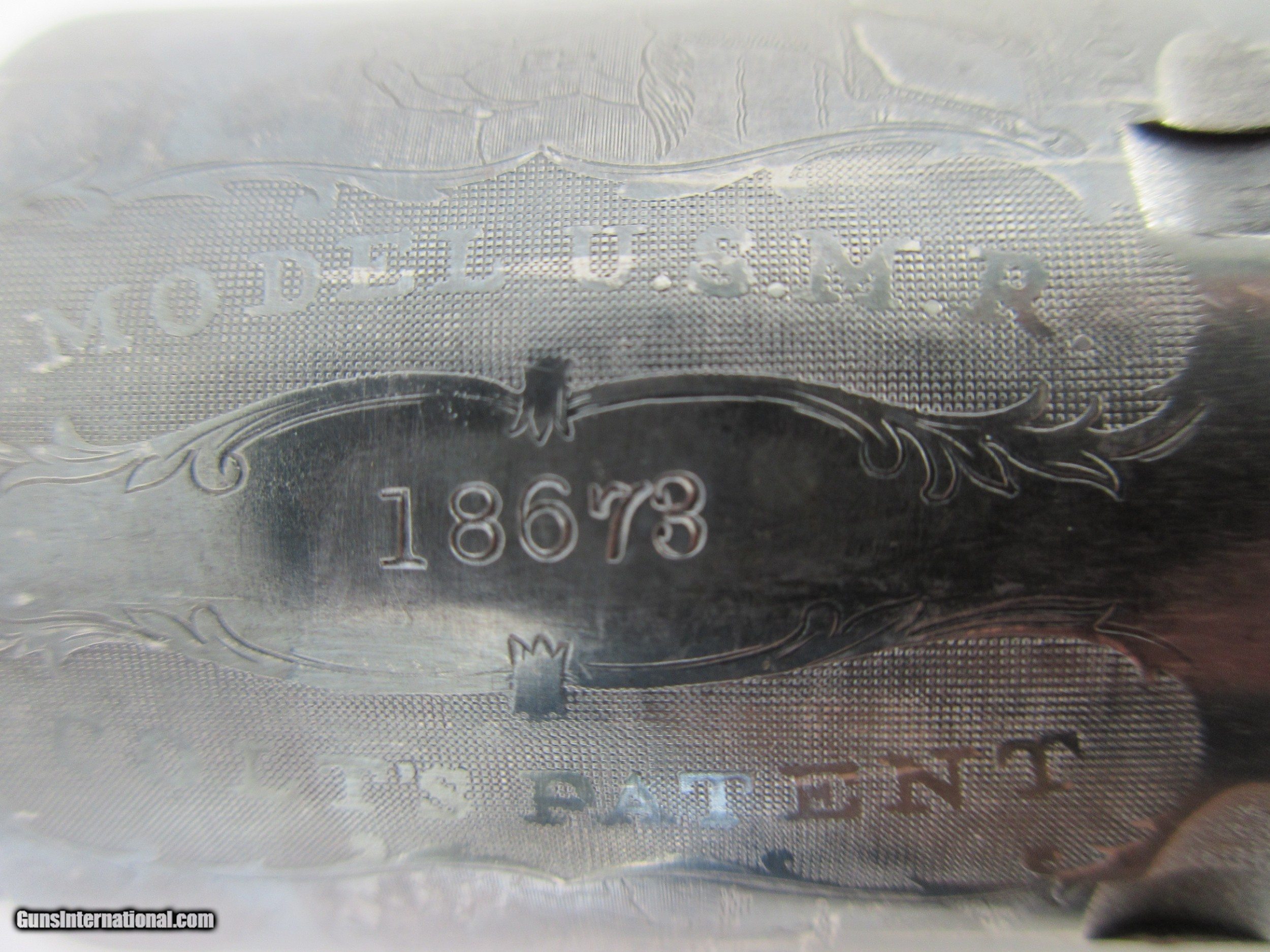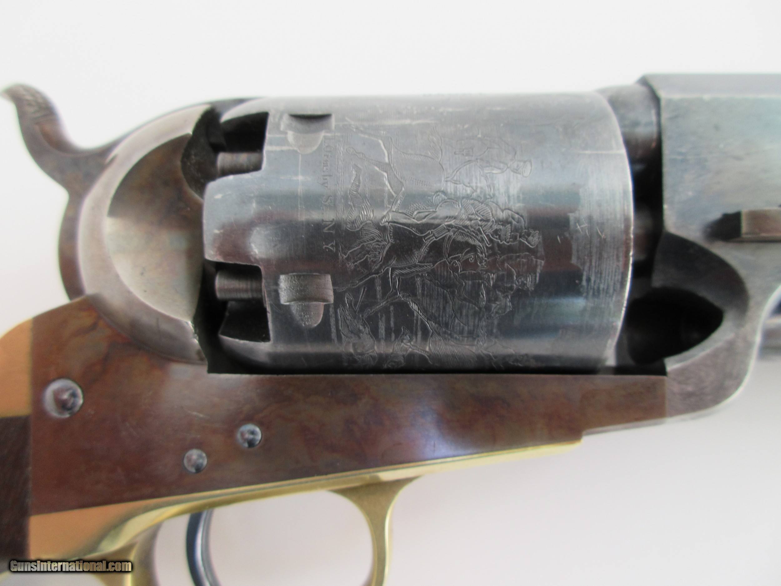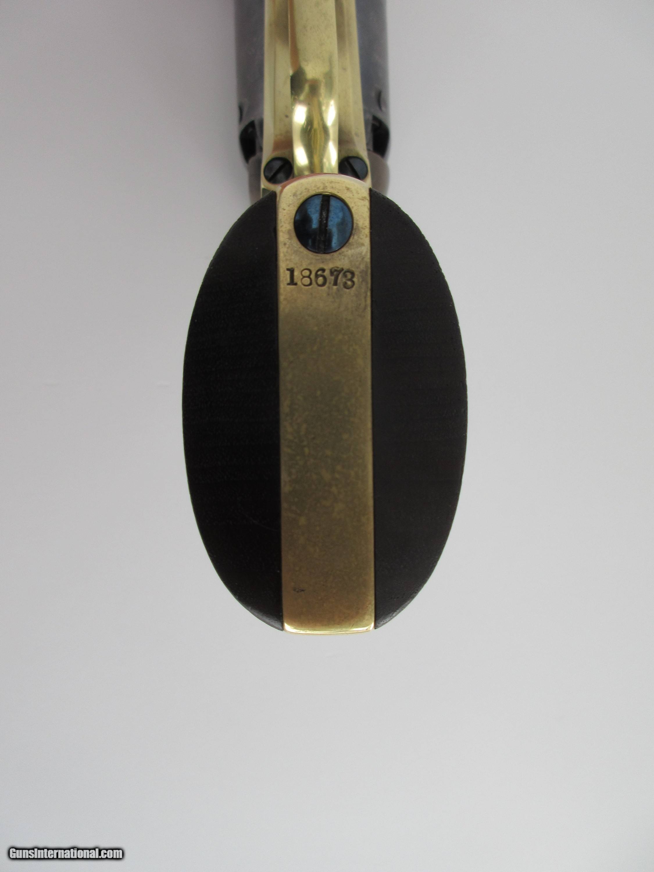 Description: Serial # 18673. 44 cal., 8 inch part round bbl, blue/casehardened finish, walnut grips. Only an estimated 200 U.S. 8 inch Dragoons ever to be produced. Near excellent. The barrel retains 90% strong blue finish, as well as the cylinder with full cylinder scene. The percussion nipples show minimal wear and cylinder safety pins are excellent and way above average condition. The hammer and frame have 70 % color case with loading lever thinning. The grips are oil finished and are excellent, as well. Bore is sharp with slight pitting. Flash pitting in back of cylinder hammer slot and recoil sheild. A definite must have for the serious colt collector! Flayderman's Guide 9th edition shows the value at $ 37,500.00 fine condition. Possible trade on Henry Rifle. SOLD Antique: Yes |