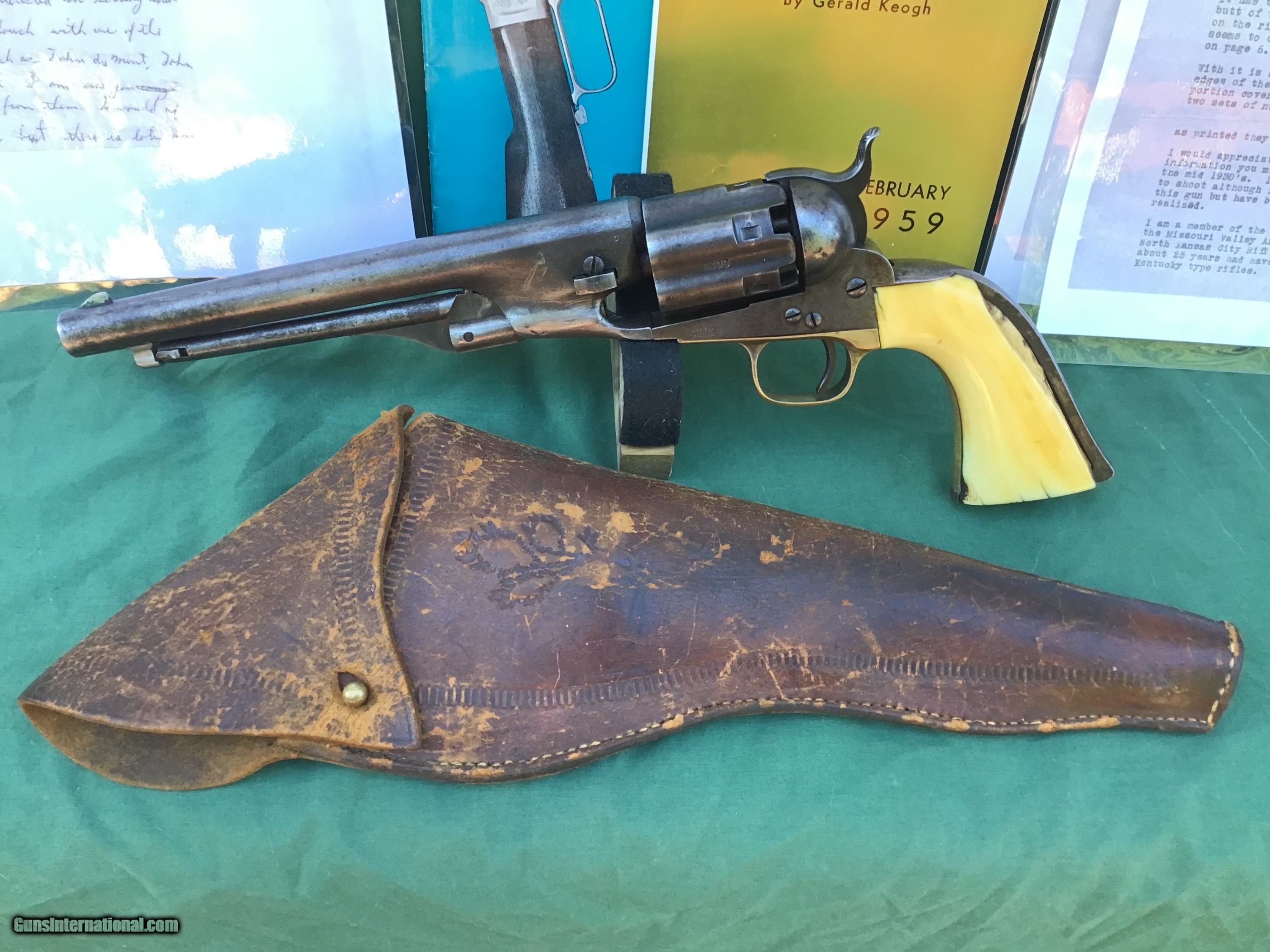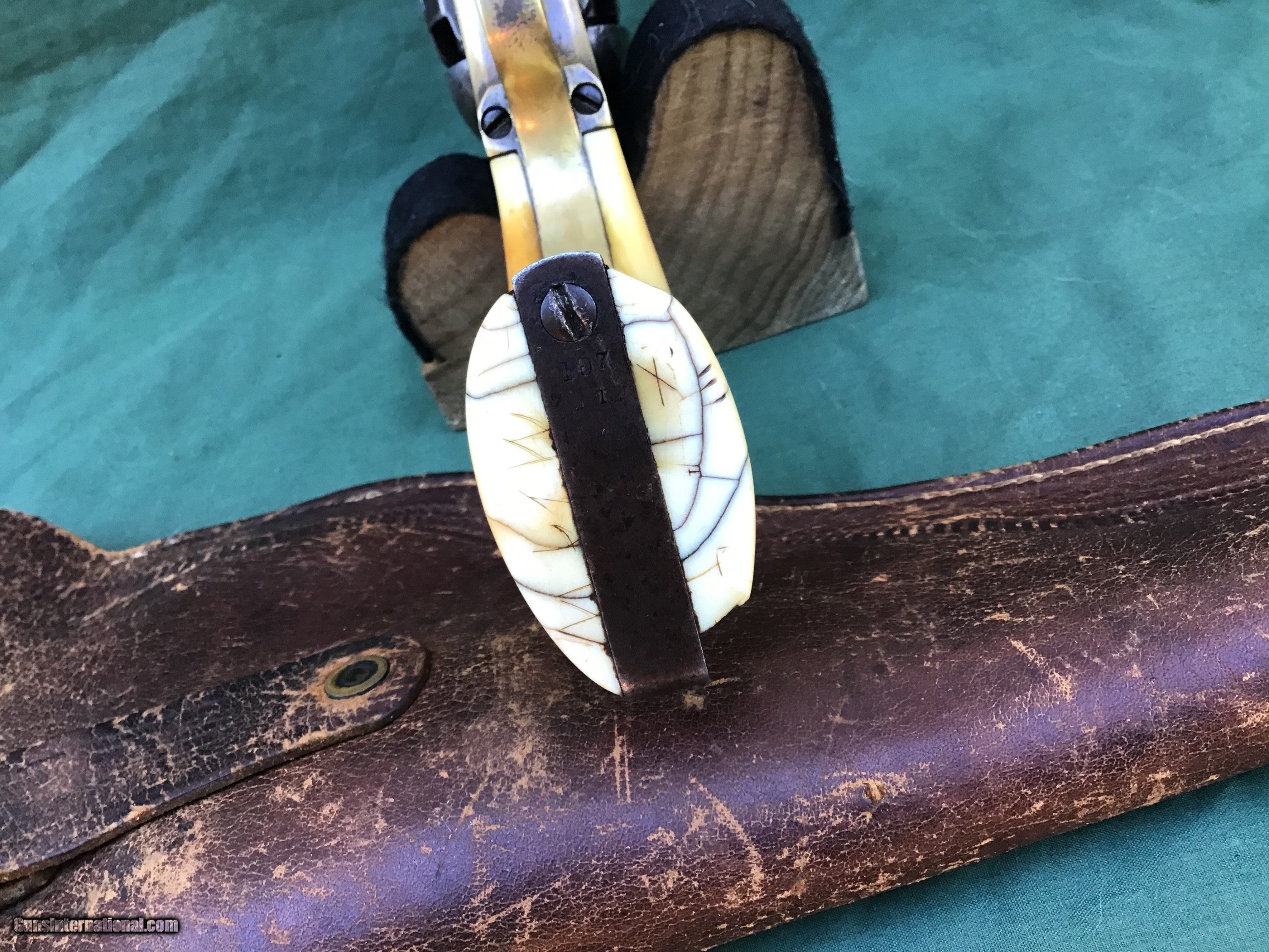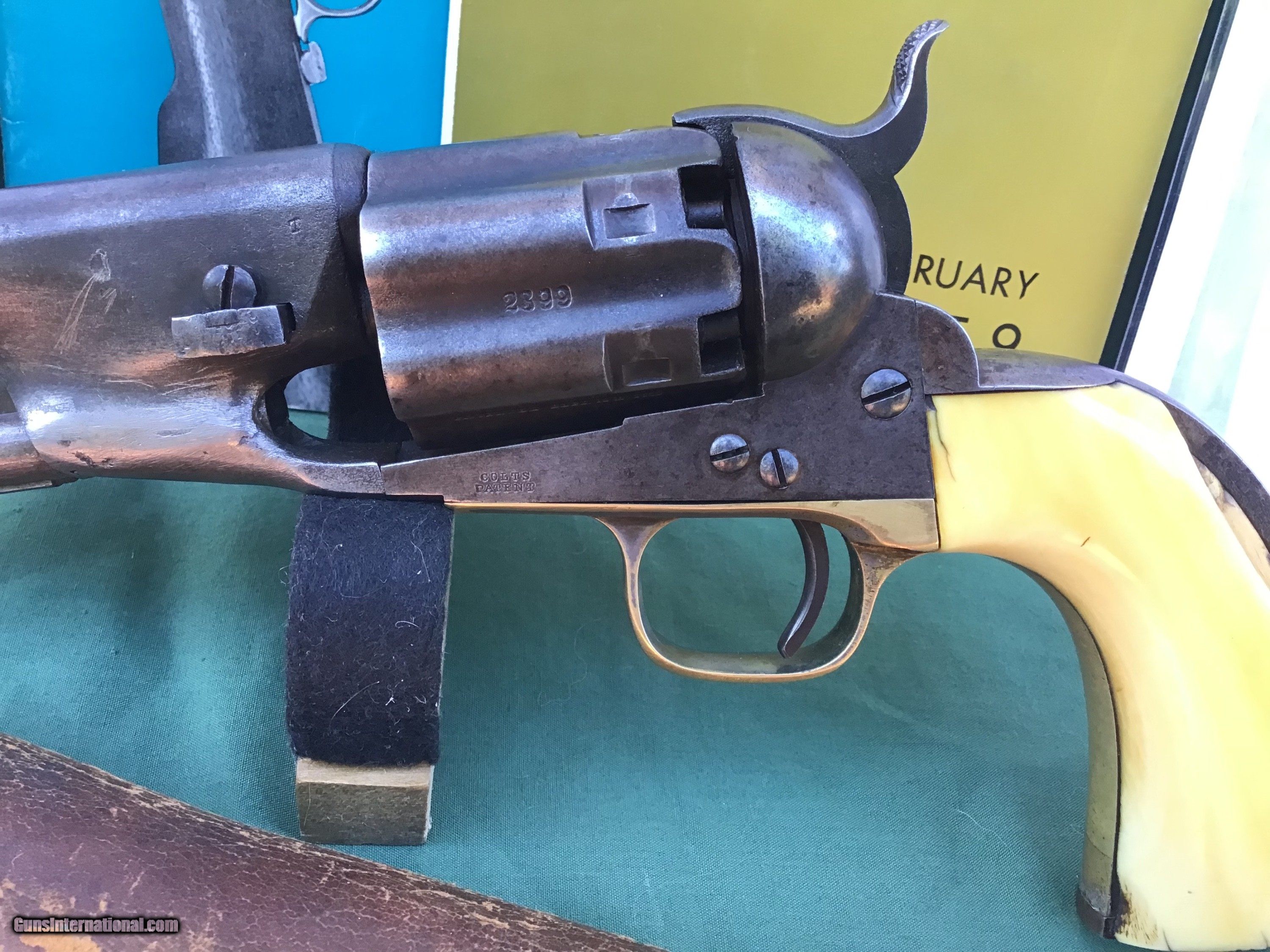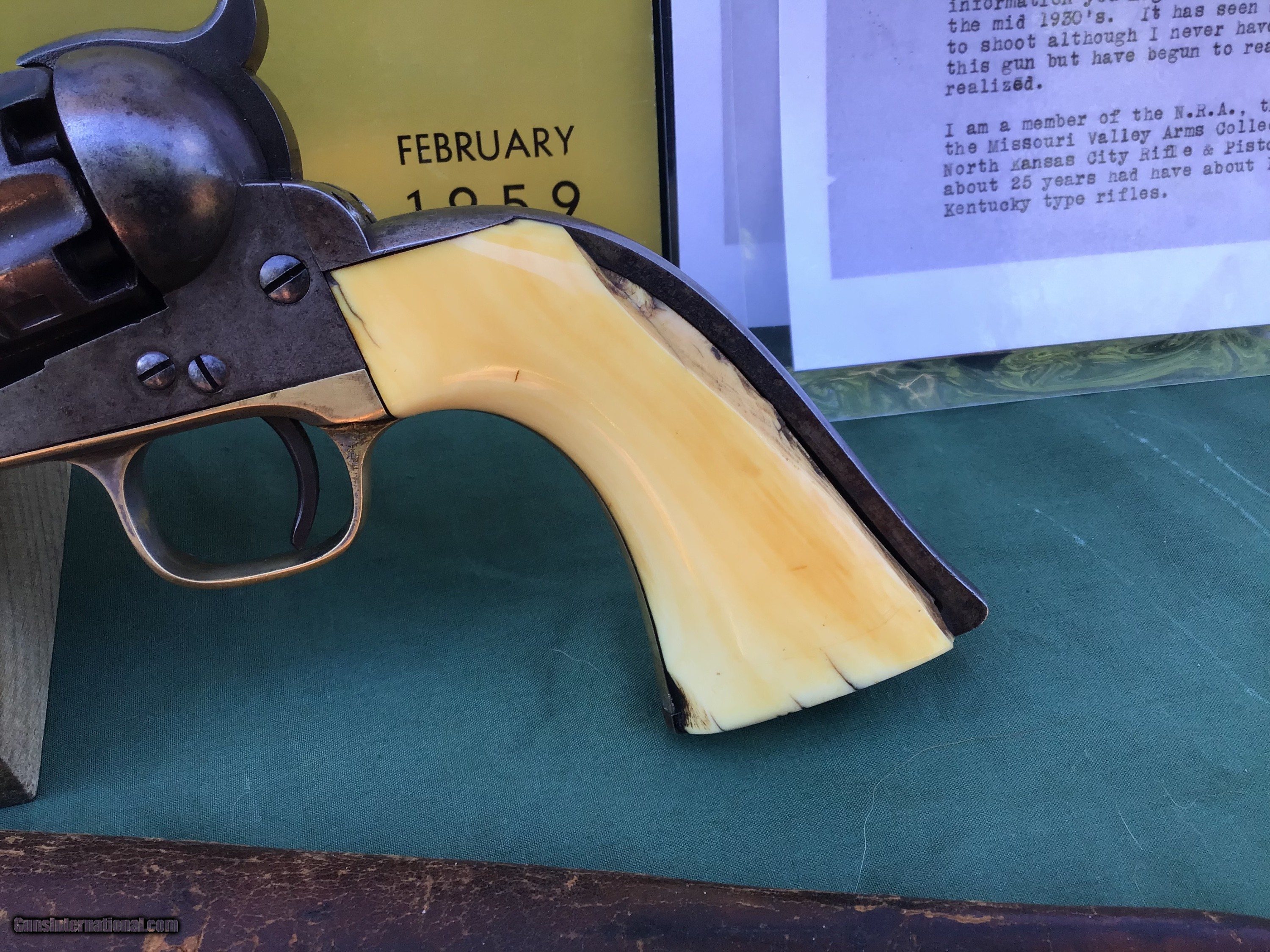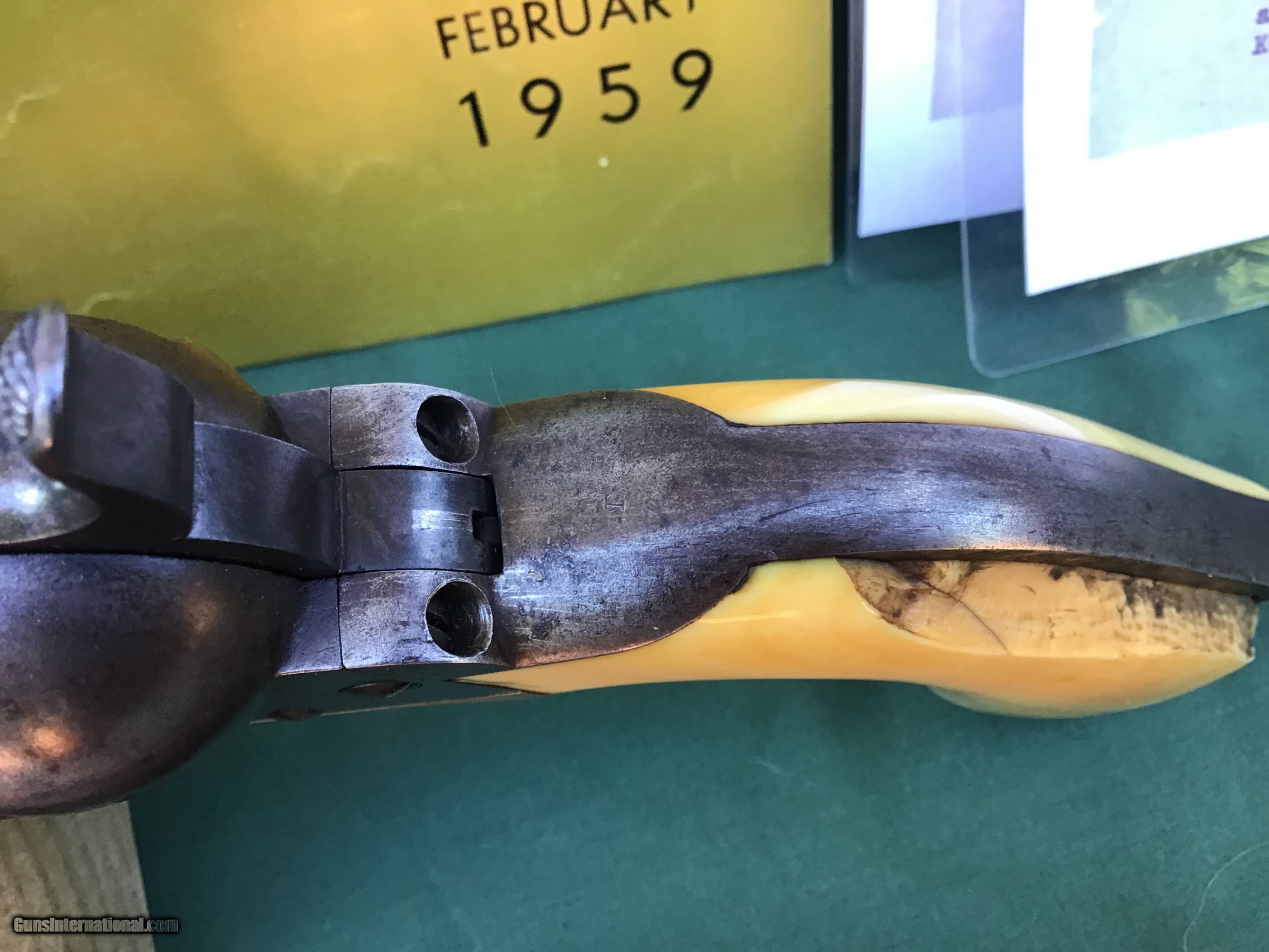 Description: Extremely Rare Pre-Civil War Colt 1860 Fluted Army Serial number 107. 8” barrel Cavalry or FlutedStyle Cylinder One Piece Construction Ivory Grips Hand-Engraved Saml Colt Marking Two of Samuel Colt’s prime promotional techniques exploited by him on a grand scale in Europe as in America were: 1) displays at fairs and expositions and 2) special presentations to monarchy, military brass, and selected politicians. (RLW). Markings and Technical Features of No. 107 The steel parts were finished in what appears to have been a combination of blue, case-hardening, and silver plating. The grips are of ivory, an unusually early example of this model of Colt Revolver with handles of that desirable material. The frame is the civilian variation, with no aperture for a shoulder stock attachment. On the top of barrel is the extremely rare hand-engraved marking in old English lettering: Saml Colt This marking is so seldom observed that a special section in The Colt Engraving Book deals with the many ramifications of it’s presence on a Colt Revolver. Please note that serial No. 104 has the same exact style barrel address. The serial number 107 appears on the bottom of the barrel lug, the bottom of the frame, the forward portion of triggerguard strap, and buttstrap. The number 107 is found on the bottom of wedge, and the cylinder has a non-matching number 2399. The loading lever is also marked 107. Among other features which are important and unusual on No. 107 are the inspector marks as follows: T on left side of barrel flat in front of cylinder T on the top of the breech of the barrel. T on top of backstrap T below the serial number on triggerguard JT under serial number on the butt T on the bottom of the ivory grips The grips on No. 104 Colt Model 1860 Army are extremely rare - seldom observed on early serial number examples of this model. One piece ivory grips are so seldom observed that one would suggest that the total number of percussion Colt stocks of this material was of an extremely low percentage from the total manufactured. Accompanying this extremely rare 1860 Colt Army is a beautiful hand stitched leather holster and two interesting copies of letters between a previous owner and Gerald Keogh who was the author of article written in the February 1959 issue of The Gun Report. The letters are dated March 1959. Most collectors will agree that early 1860 Colt Fluted Armies had a good chance of going South prior to the Civil War. Could serial number 107 be one of the 1860 Colts sold to the South? I have many more pictures available on request. Please feel free to ask as many questions as needed. Antique and can be shipped directly to your doorsteps SOLD Antique: Yes |
