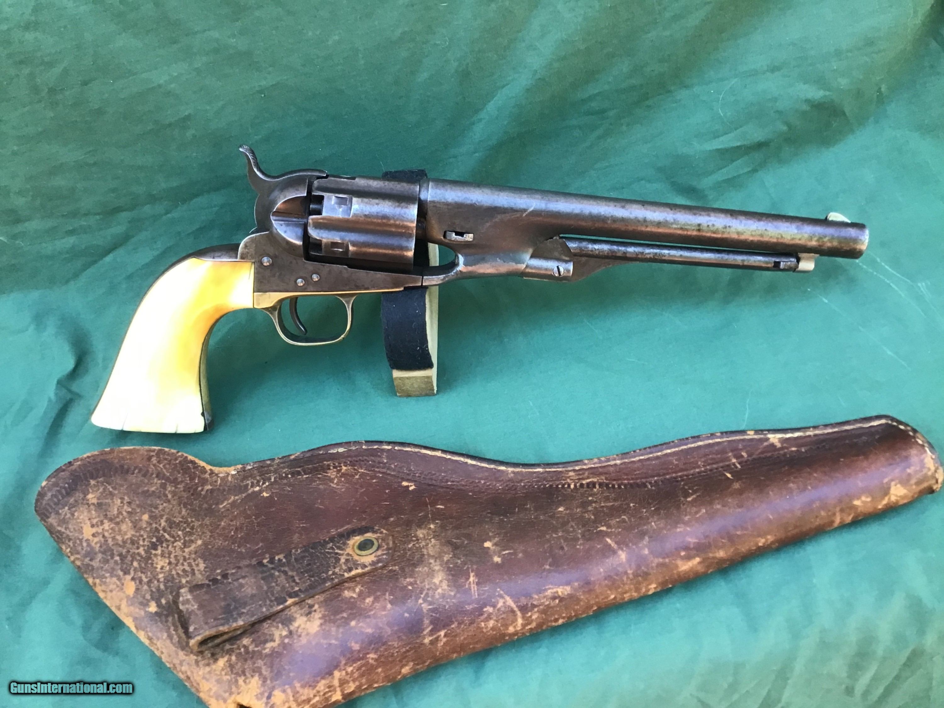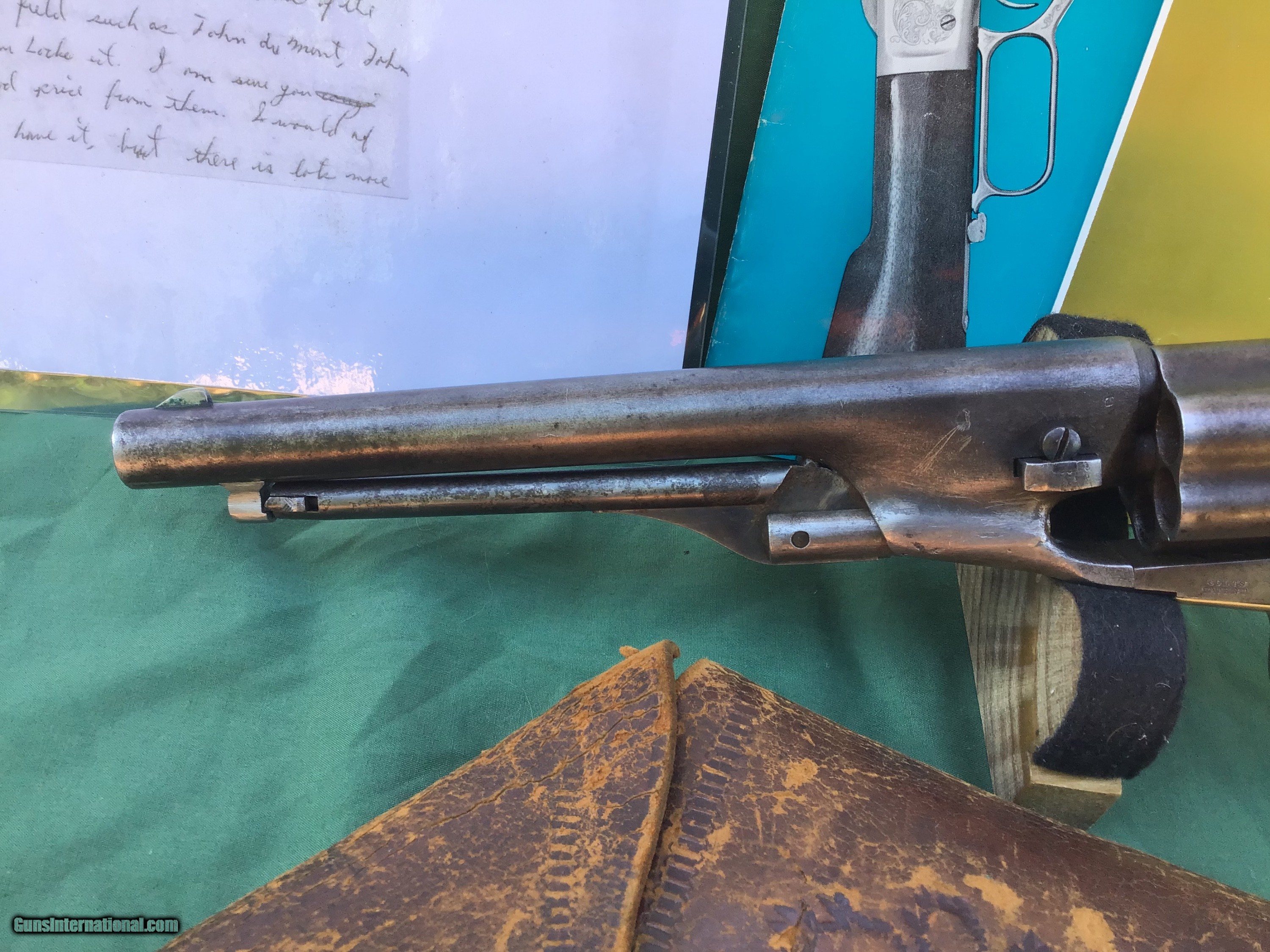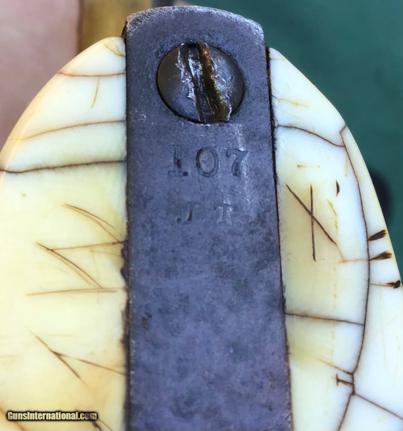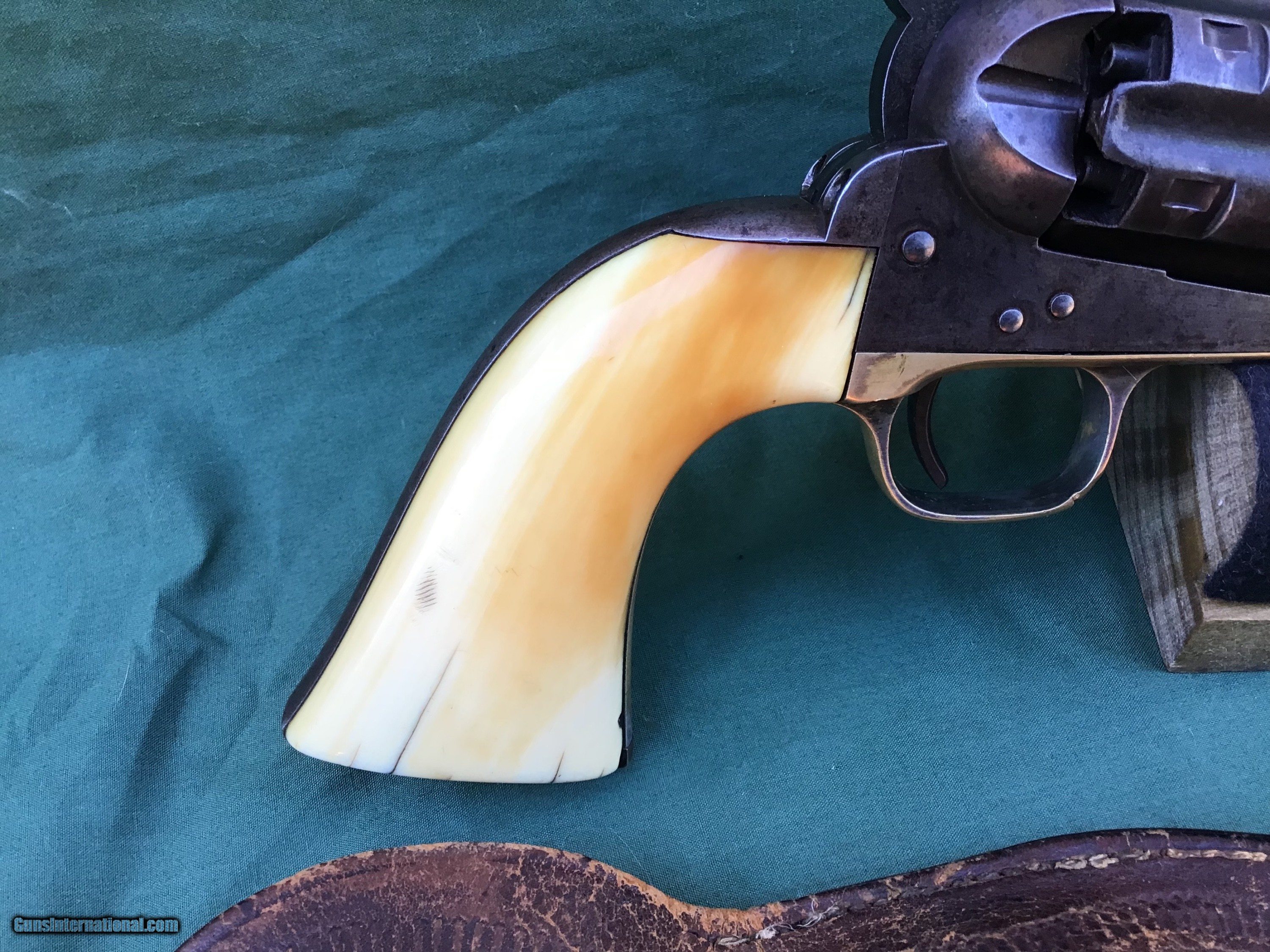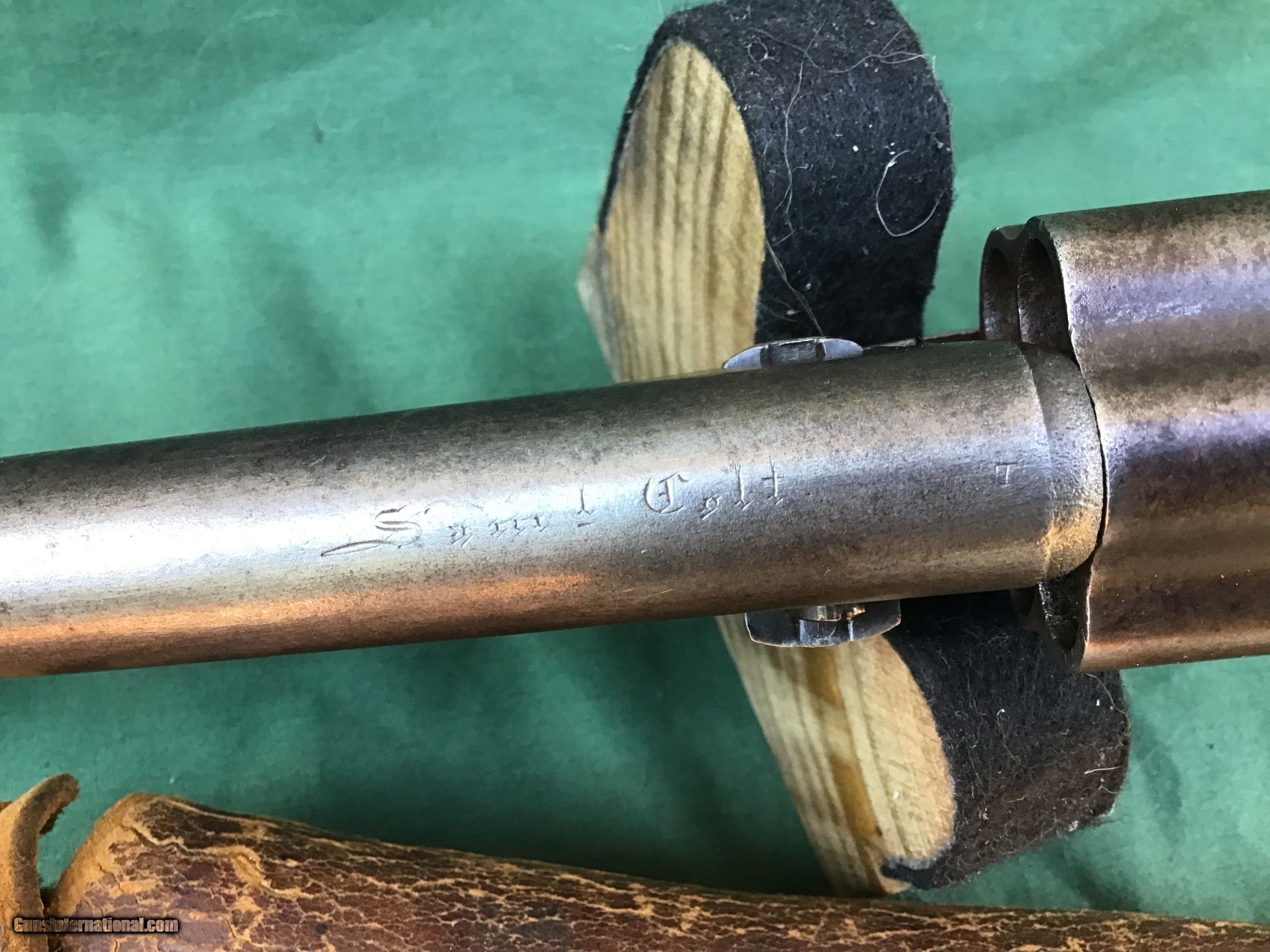 Description: Extremely Rare Pre-Civil War Colt 1860 Fluted Army Serial number 107. 8” barrel Cavalry or FlutedStyle Cylinder One Piece Construction Ivory Grips Hand-Engraved Saml Colt Marking Two of Samuel Colt’s prime promotional techniques exploited by him on a grand scale in Europe as in America were: 1) displays at fairs and expositions and 2) special presentations to monarchy, military brass, and selected politicians. (RLW). Markings and Technical Features of No. 107 The steel parts were finished in what appears to have been a combination of blue, case-hardening, and silver plating. The grips are of ivory, an unusually early example of this model of Colt Revolver with handles of that desirable material. The frame is the civilian variation, with no aperture for a shoulder stock attachment. On the top of barrel is the extremely rare hand-engraved marking in old English lettering: Saml Colt This marking is so seldom observed that a special section in The Colt Engraving Book deals with the many ramifications of it’s presence on a Colt Revolver. Please note that serial No. 104 has the same exact style barrel address. The serial number 107 appears on the bottom of the barrel lug, the bottom of the frame, the forward portion of triggerguard strap, and buttstrap. The number 107 is found on the bottom of wedge, and the cylinder has a non-matching number 2399. The loading lever is also marked 107. Among other features which are important and unusual on No. 107 are the inspector marks as follows: T on left side of barrel flat in front of cylinder T on the top of the breech of the barrel. T on top of backstrap T below the serial number on triggerguard JT under serial number on the butt T on the bottom of the ivory grips The grips on No. 104 Colt Model 1860 Army are extremely rare - seldom observed on early serial number examples of this model. One piece ivory grips are so seldom observed that one would suggest that the total number of percussion Colt stocks of this material was of an extremely low percentage from the total manufactured. Accompanying this extremely rare 1860 Colt Army is a beautiful hand stitched leather holster and two interesting copies of letters between a previous owner and Gerald Keogh who was the author of article written in the February 1959 issue of The Gun Report. The letters are dated March 1959. Most collectors will agree that early 1860 Colt Fluted Armies had a good chance of going South prior to the Civil War. Could serial number 107 be one of the 1860 Colts sold to the South? I have many more pictures available on request. Please feel free to ask as many questions as needed. Antique and can be shipped directly to your doorsteps SOLD Antique: Yes |