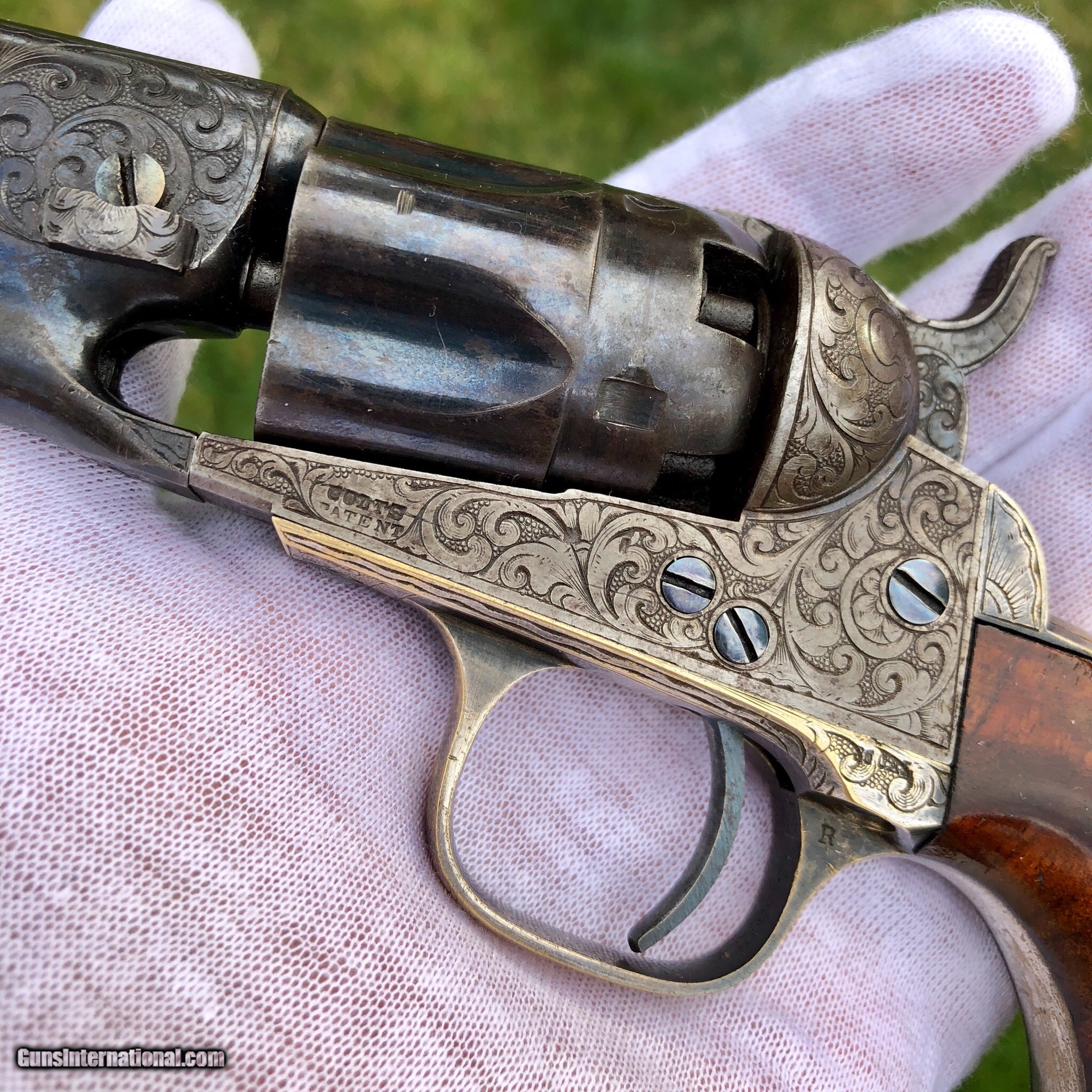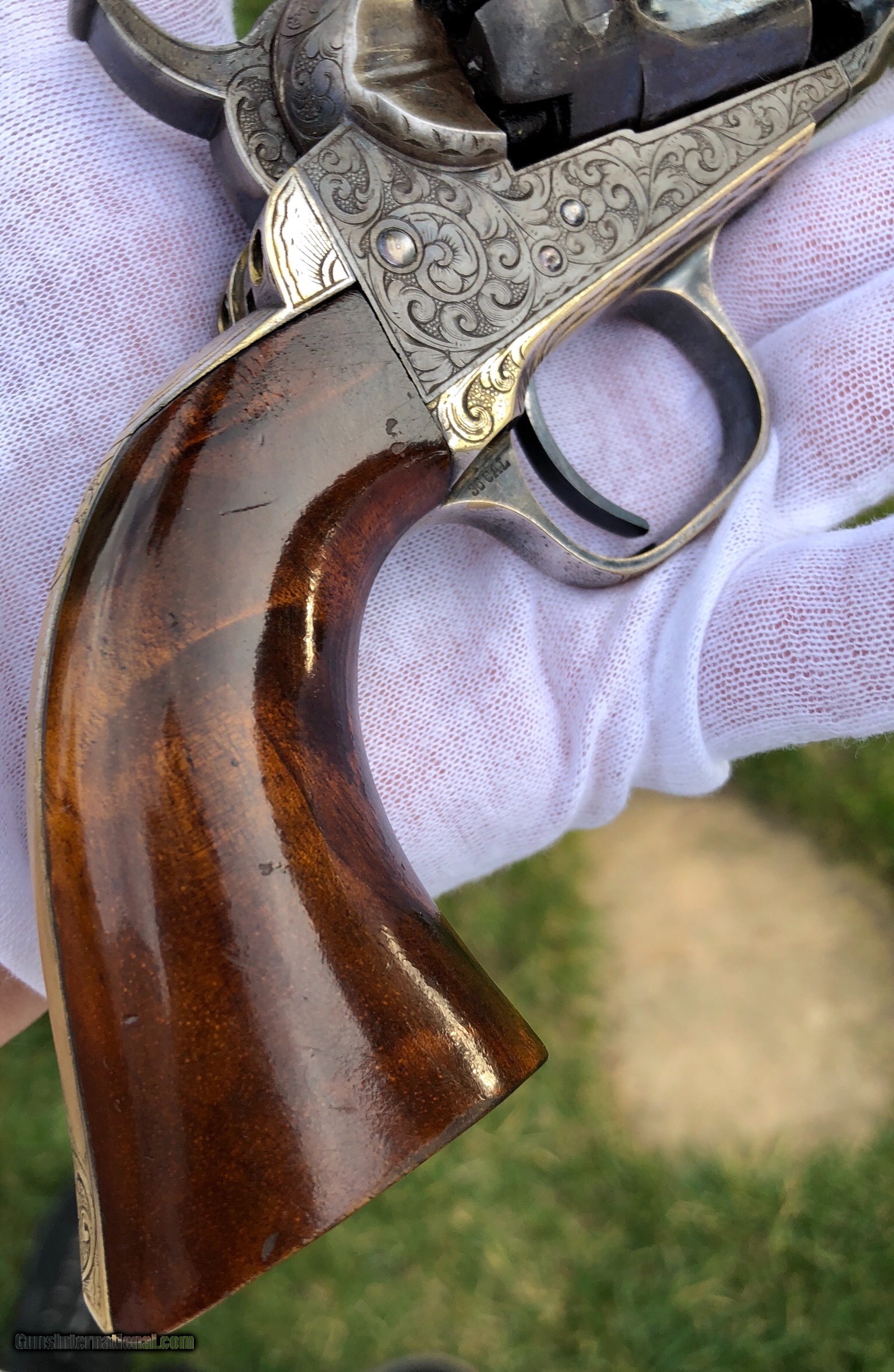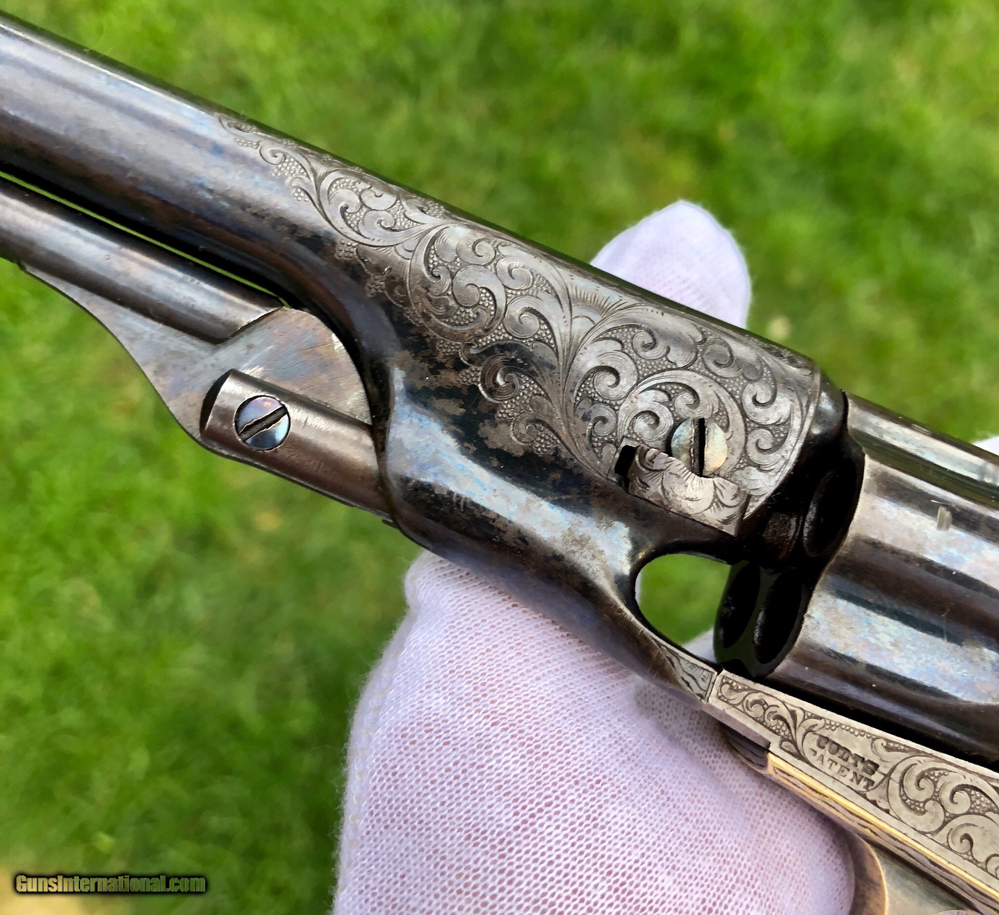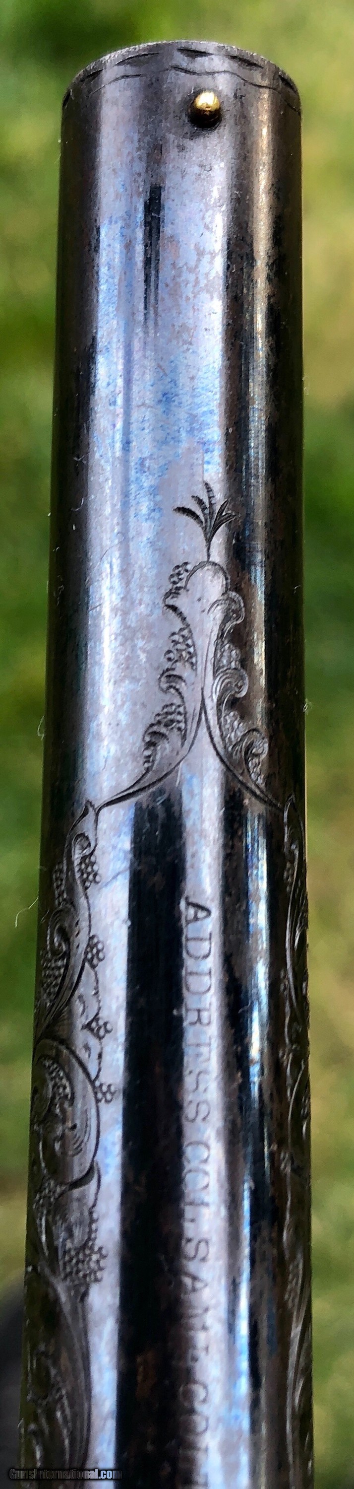Description: Excellent Factory Engraved Colt 1862 Police Revolver that shows 70% original barrel blue. The cylinder also shows 70% original blue. The frame has faint colors showing through the engraving, like most Factory engraved Colts, the case hardening has somewhat fell off but does show some traces throughout, specifcally on the rear frame and backside of the hammer. The burl grips are exceptional. The action functions excellent. Overall this is an excellent and fine overall example of a rare Blued and Case Hardened Factory Engraved Colt 1862 Police priced to move fast. $10,500 SOLD Antique: Yes |