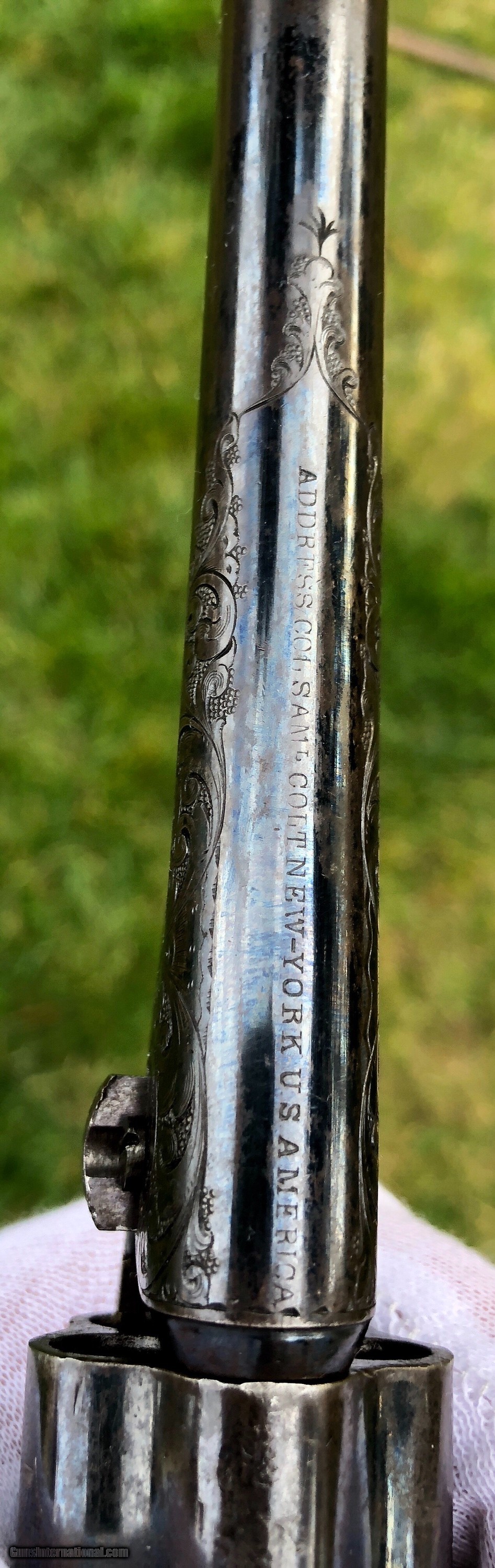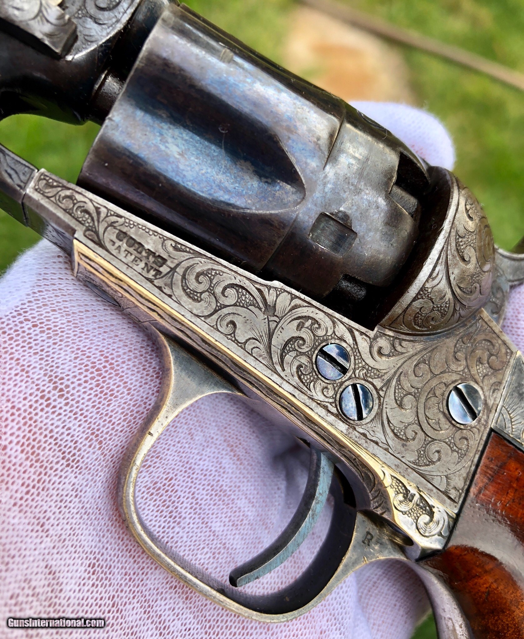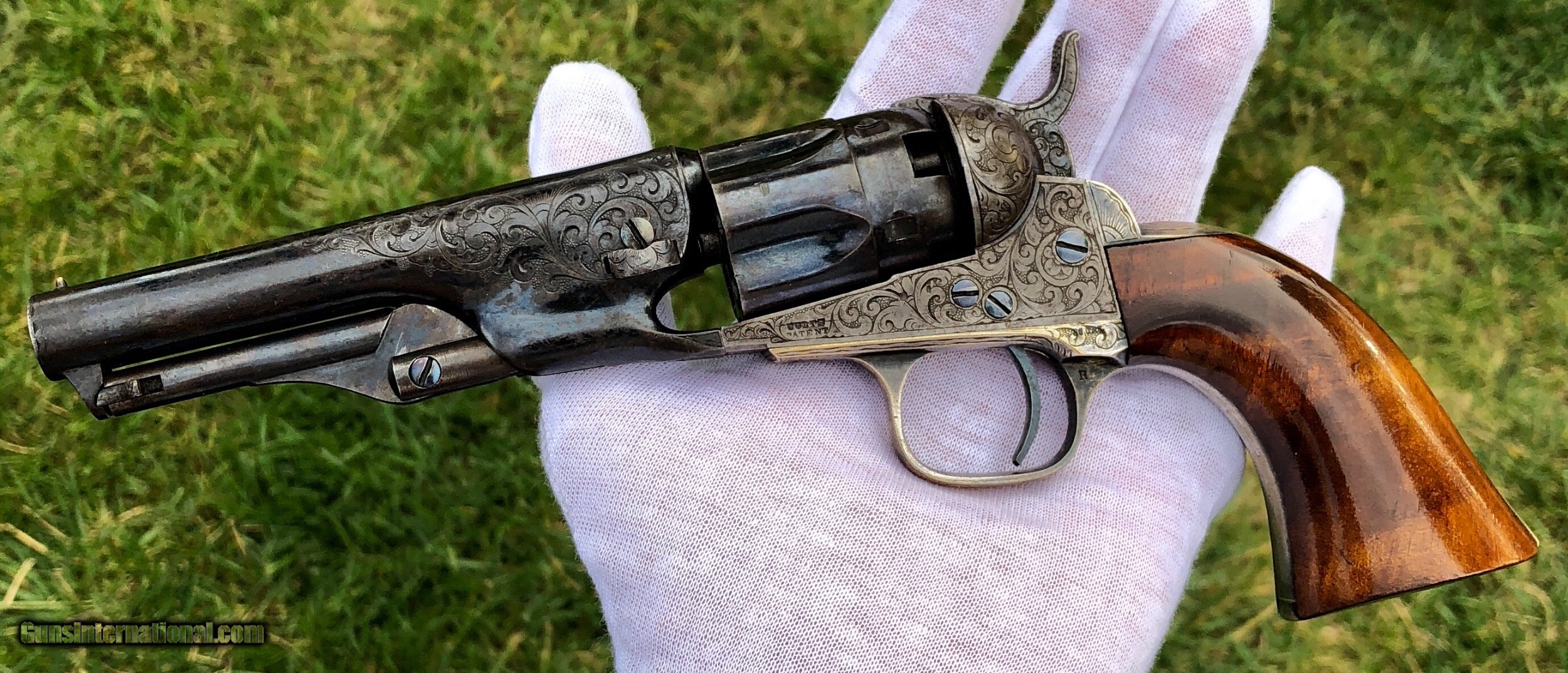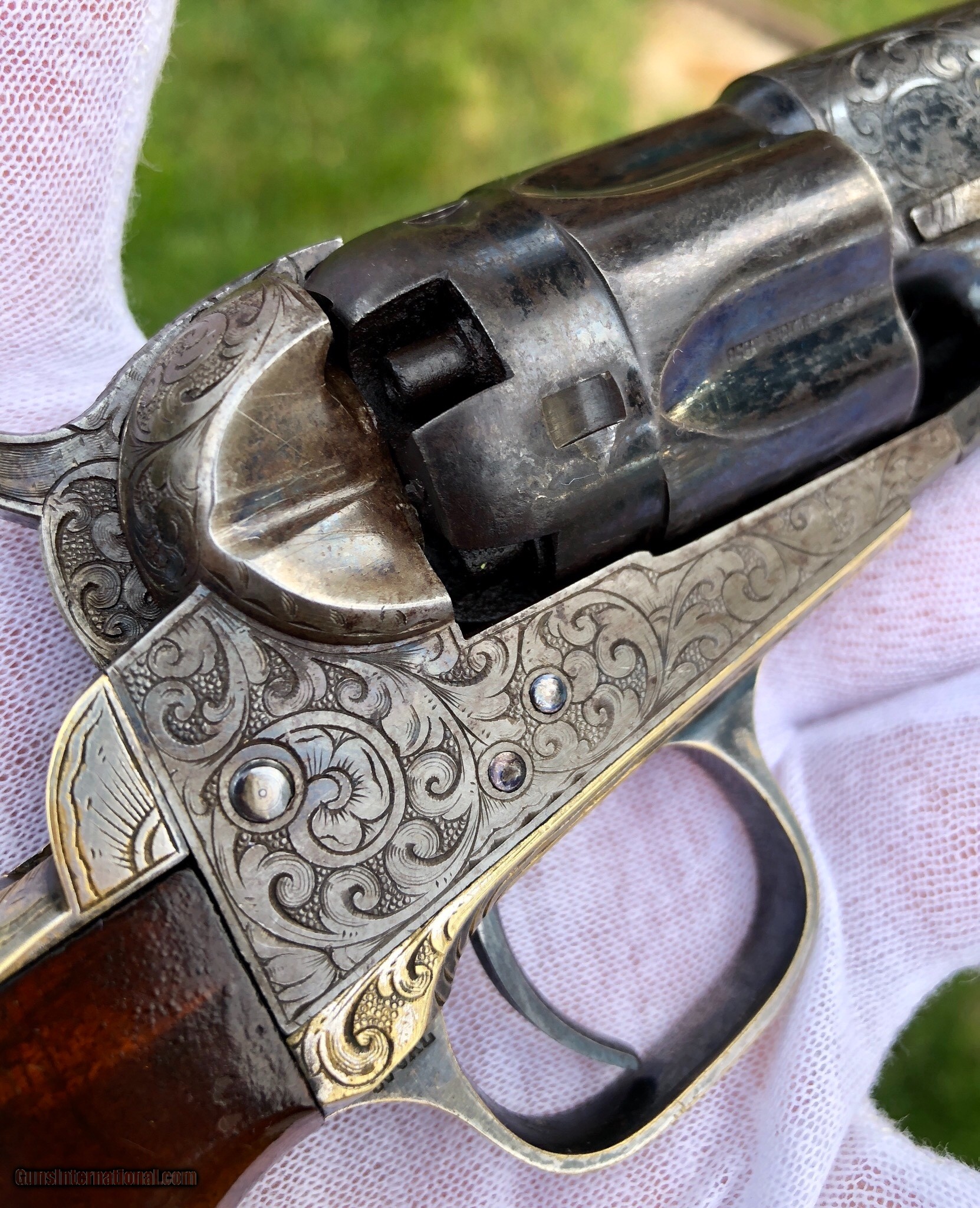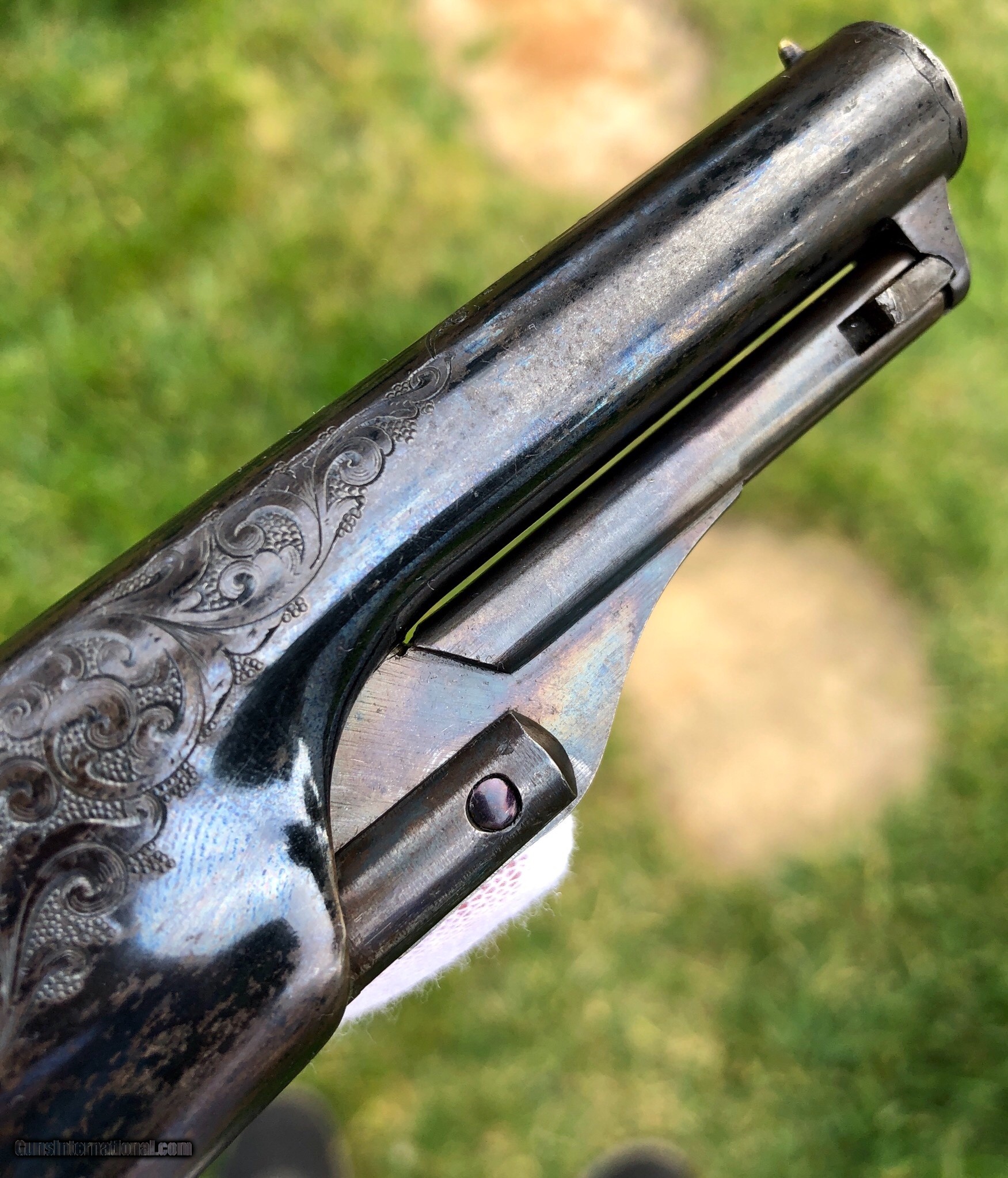 Description: Excellent Factory Engraved Colt 1862 Police Revolver that shows 70% original barrel blue. The cylinder also shows 70% original blue. The frame has faint colors showing through the engraving, like most Factory engraved Colts, the case hardening has somewhat fell off but does show some traces throughout, specifcally on the rear frame and backside of the hammer. The burl grips are exceptional. The action functions excellent. Overall this is an excellent and fine overall example of a rare Blued and Case Hardened Factory Engraved Colt 1862 Police priced to move fast. $10,500 SOLD Antique: Yes |