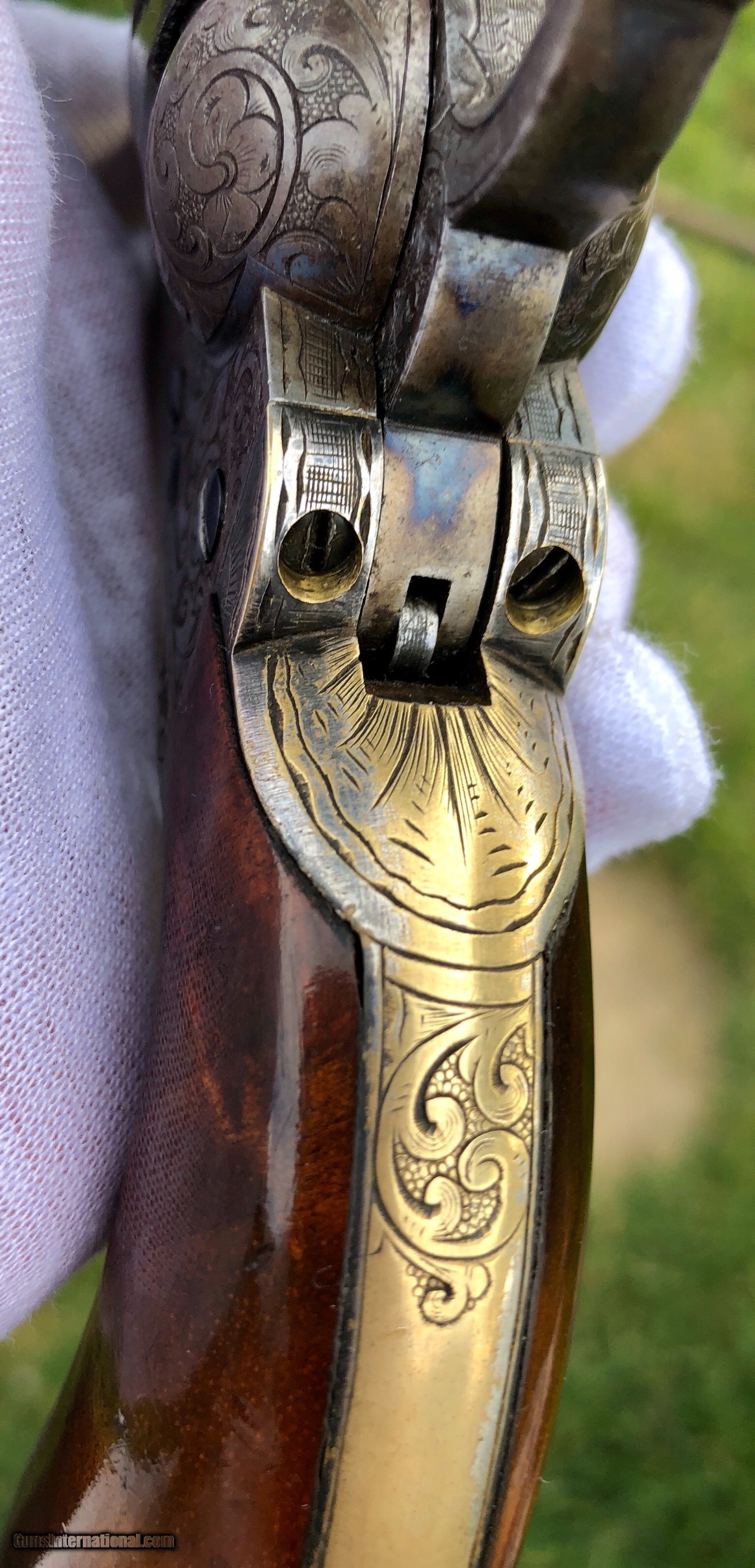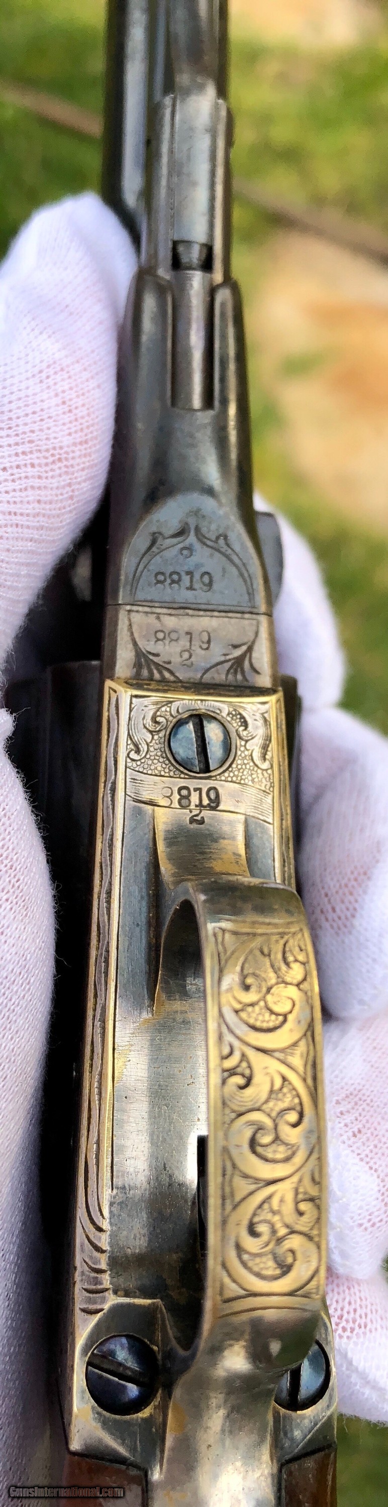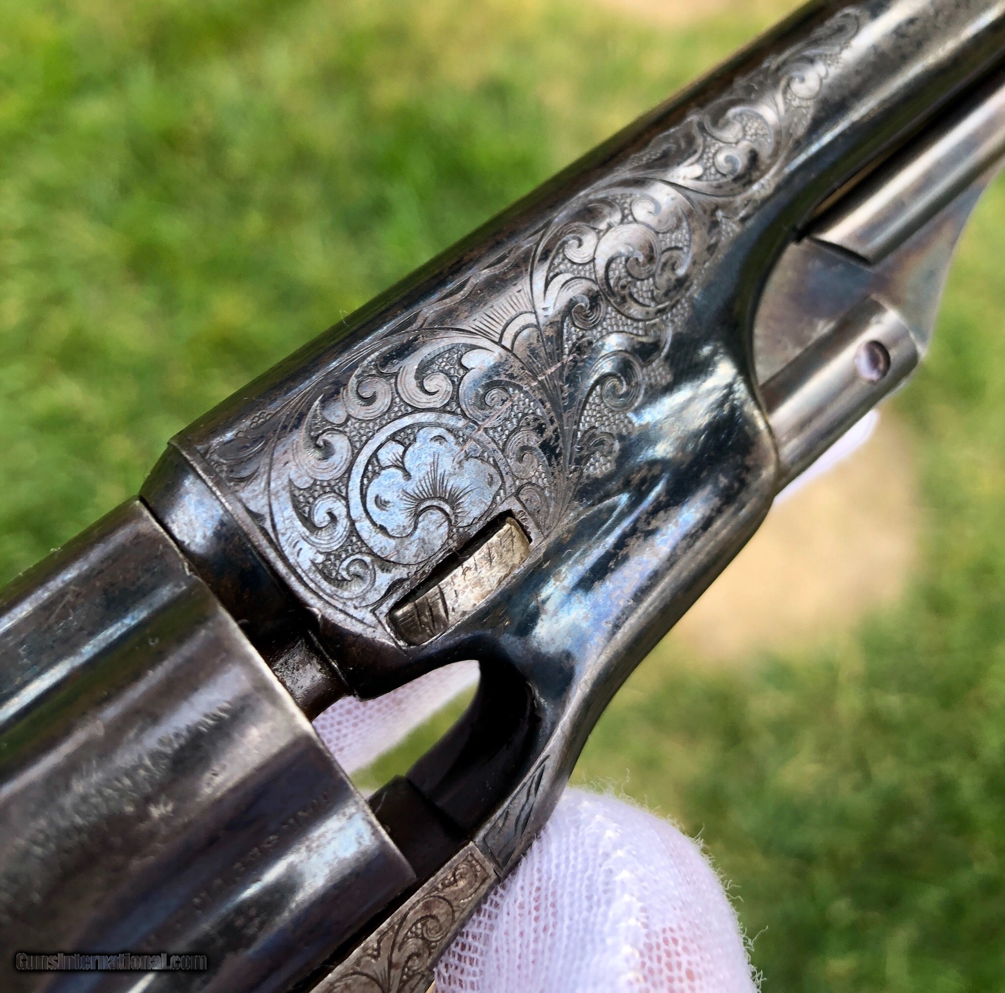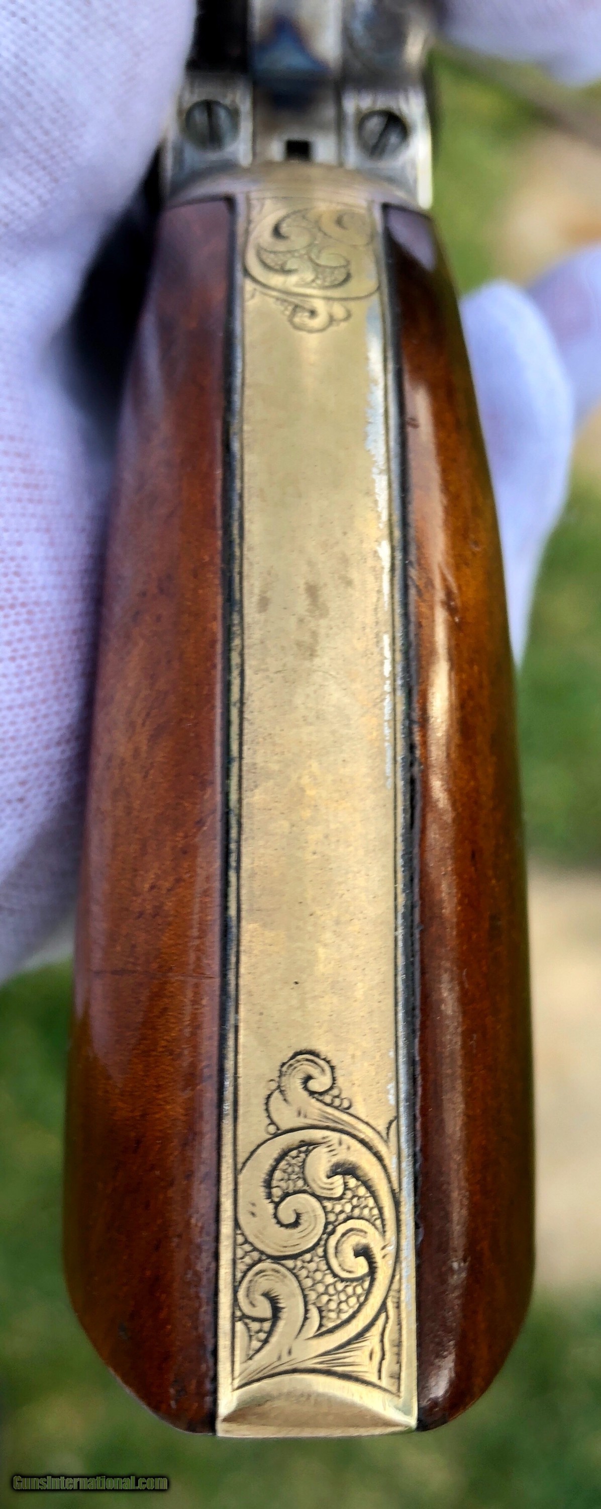 Description: Excellent Factory Engraved Colt 1862 Police Revolver that shows 70% original barrel blue. The cylinder also shows 70% original blue. The frame has faint colors showing through the engraving, like most Factory engraved Colts, the case hardening has somewhat fell off but does show some traces throughout, specifcally on the rear frame and backside of the hammer. The burl grips are exceptional. The action functions excellent. Overall this is an excellent and fine overall example of a rare Blued and Case Hardened Factory Engraved Colt 1862 Police priced to move fast. $10,500 SOLD Antique: Yes |