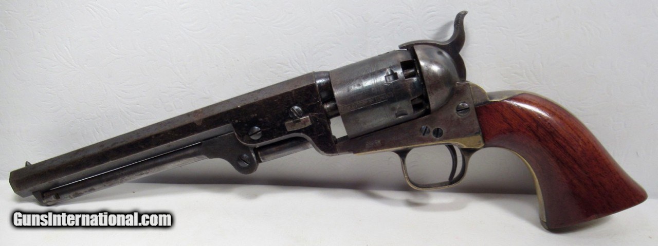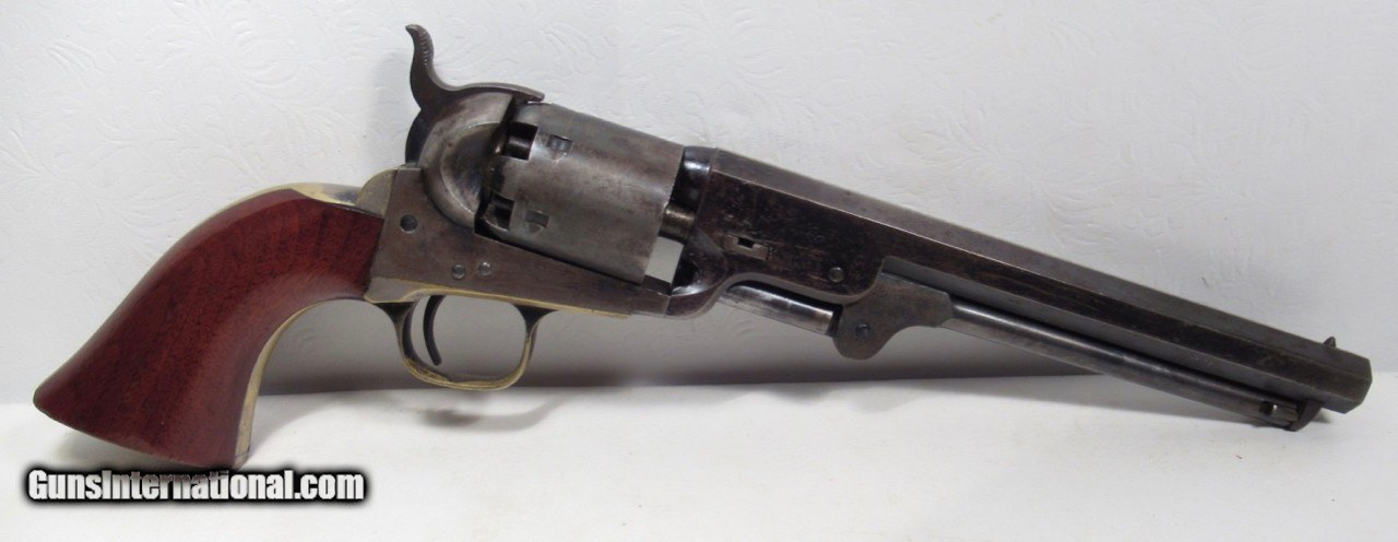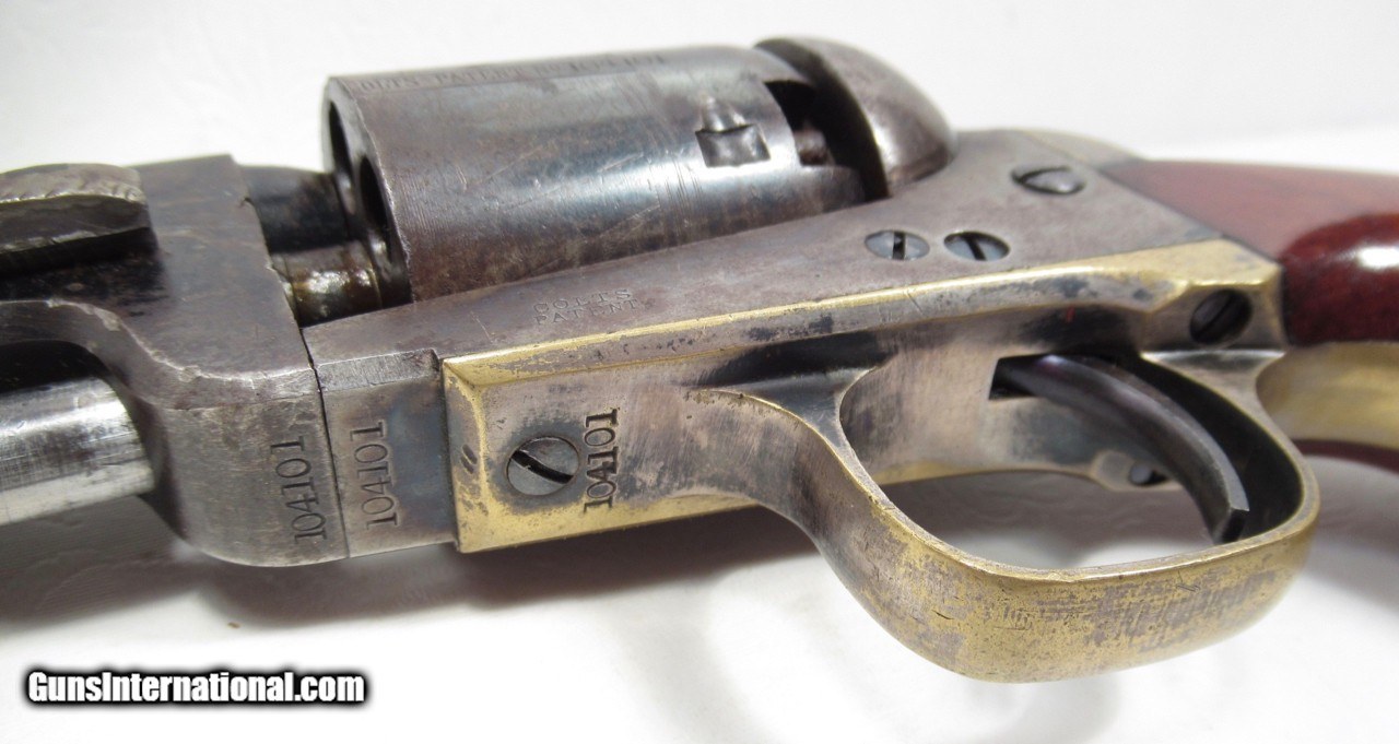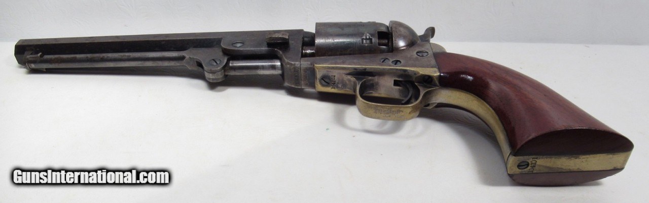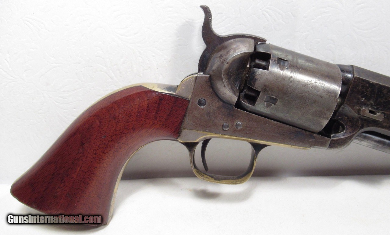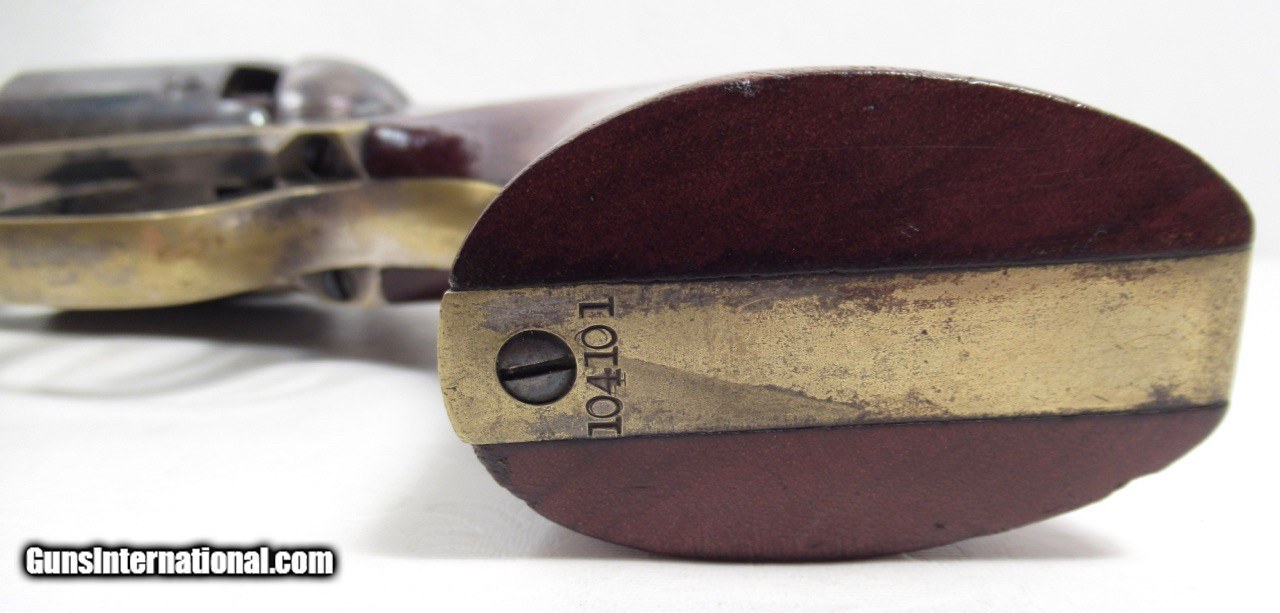 Description: Colt Model 1851 Navy Revolver; Serial No. 104101; .36 Caliber; 7 ½” Barrel; Blue Finish; Factory Letter Indicates a May 8, 1861 Shipment to Cooper and Pond of New York, NY; Most of the Original Metal Finish Remains; Fantastic Wood Grips with Nearly All Original Varnish Present; Excellent Action and Bore; 100% Correct, Original, and Matching; Great 160 Year-Old Colt 1851 Navy Revolver; See All Photos for Condition; No Texts. Call or Email Only; PERSONAL PROPERTY of Harold Wieser; Price: $7,975 + $45 S&H Via FedEx Express; PLEASE DO NOT SEND PAYMENT THROUGH U.S. POSTAL SERVICE; Price includes insured shipping; return policy: three days inspection from the date the item is received; full refund of shipping both ways ONLY IF THE ITEM IS MISREPRESENTED. EMAIL collectingtexashotmail. com PAYMENT ADDRESS- HAROLD WIESER-1466 US HWY 77-ROSEBUD,TEXAS 76570 SOLD Antique: Yes Manufacturer: Colt Model: 1851 Navy Serial Number: 104101 |