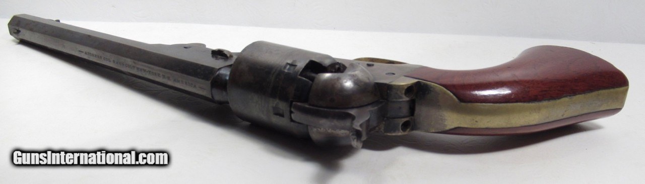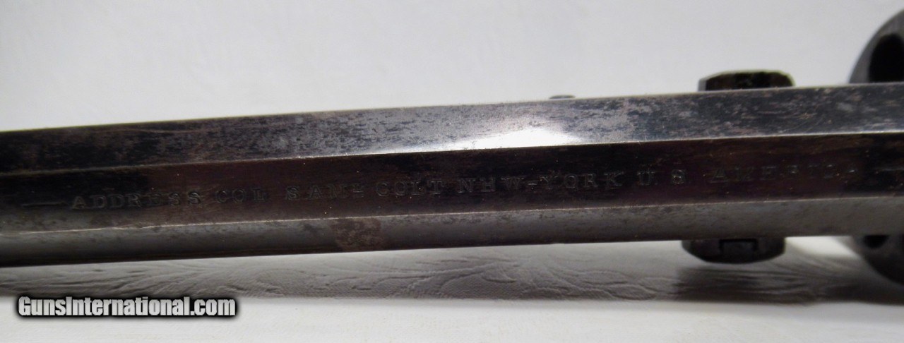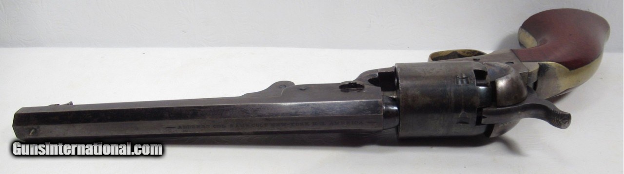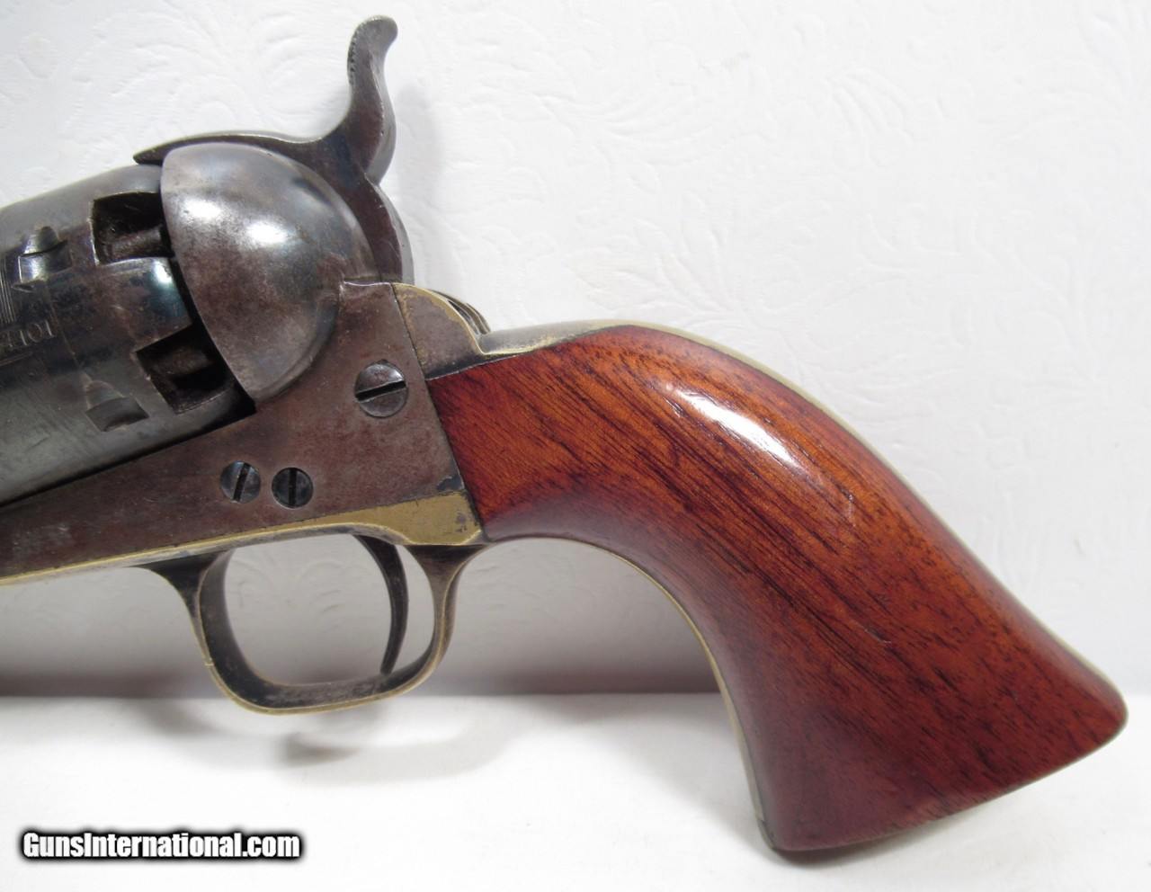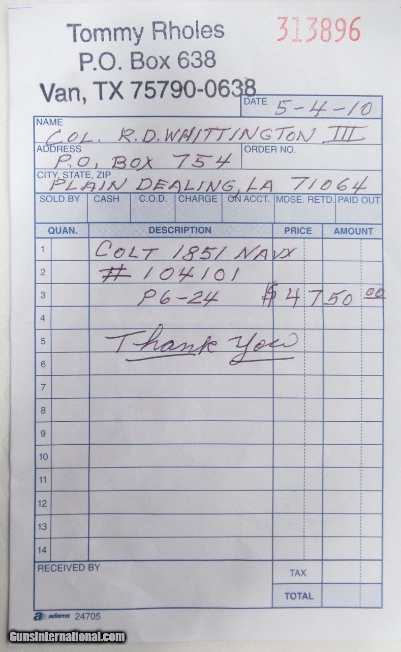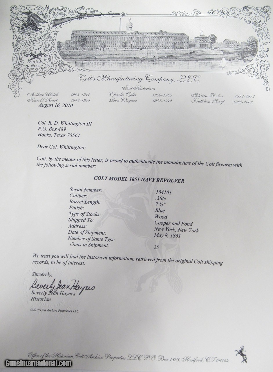 Description: Colt Model 1851 Navy Revolver; Serial No. 104101; .36 Caliber; 7 ½” Barrel; Blue Finish; Factory Letter Indicates a May 8, 1861 Shipment to Cooper and Pond of New York, NY; Most of the Original Metal Finish Remains; Fantastic Wood Grips with Nearly All Original Varnish Present; Excellent Action and Bore; 100% Correct, Original, and Matching; Great 160 Year-Old Colt 1851 Navy Revolver; See All Photos for Condition; No Texts. Call or Email Only; PERSONAL PROPERTY of Harold Wieser; Price: $7,975 + $45 S&H Via FedEx Express; PLEASE DO NOT SEND PAYMENT THROUGH U.S. POSTAL SERVICE; Price includes insured shipping; return policy: three days inspection from the date the item is received; full refund of shipping both ways ONLY IF THE ITEM IS MISREPRESENTED. EMAIL collectingtexashotmail. com PAYMENT ADDRESS- HAROLD WIESER-1466 US HWY 77-ROSEBUD,TEXAS 76570 SOLD Antique: Yes Manufacturer: Colt Model: 1851 Navy Serial Number: 104101 |