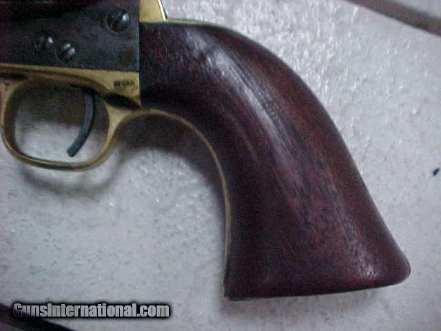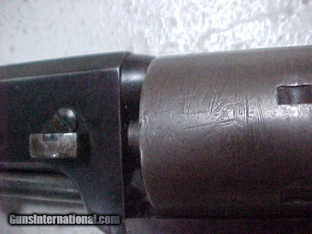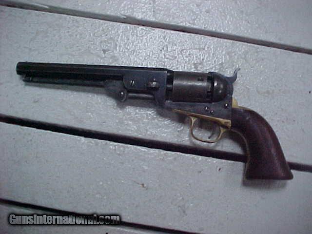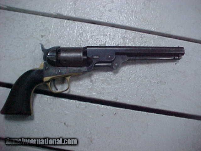 Description: A fine Colt 1851 navy revolver that retains about 90% clear cylinder scene. Also the barrel has about 90% plus original Colt blue. Significant case colors are present on the frame, loading lever and hammer. The grips are excellent and fit perfectly. SN 147xxx all match including arbor pin and wedge. Caliber is .36.There is an unusual number 7 on the left side of the trigger guard...perhaps a company number. The bore is fine showing strong rifling and no pits. Overall, the gun has a good "look" to it and has not been messed with. Mechanically fine and indexes perfectly.REDUCED!! SOLD Antique: Yes |