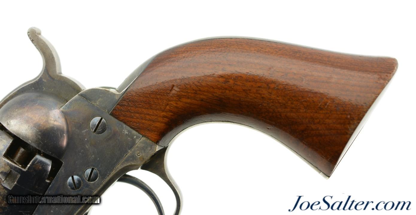 Description: Serial #205248, .31 Caliber, 6 inch octagon barrel with a near excellent bright bore with several scattered small pits and strong rifling. This is a cased two line Hartford address Civil War Colt Model 1849 pocket revolver manufactured in 1862. It comes in an original Colt locking mahogany box with original Colt brass bullet mold, patriotic Colt powder flask, full Hazard powder Colt cartridge packet, combination Colt nipple wrench / screwdriver, and an original full tin of Eley Brothers metal line percussion caps. The revolver remains in very fine / near excellent condition with the barrel and cylinder showing about 60-65% bright blue finish flaking to gray with a crisp two line address marking the top facet and sharp detail on the wagon scene engraving. The address shows the broken die for the "L" in Colt and appears as "COIT" which is correct for this serial number range according to Jordan & Watt in Colt's Pocket '49. The frame, lever and hammer show much of the original vibrant case-colors. The trigger and some screw heads show the original vibrant nitre blue. The gripstraps have retained virtually all of their original silver finish with natural age darkening. The walnut grips rate excellent with only very minor handling blemishes. The action functions properly with tight lock up and smooth action. Condition of the original mahogany locking case is near excellent with the blue crushed velvet interior intact, the lock working correctly and the corners just slightly proud when closed. The ammo packet is full with excellent graphics, the original pull cord intact having separation along the top exposing some of the cartridges inside. A very fine example of a cased Civil War Pocket '49 with the desirable 6 inch barrel and all the original Colt extras. Antique. Antique: Yes Price: $4,995.00 Contact Seller |