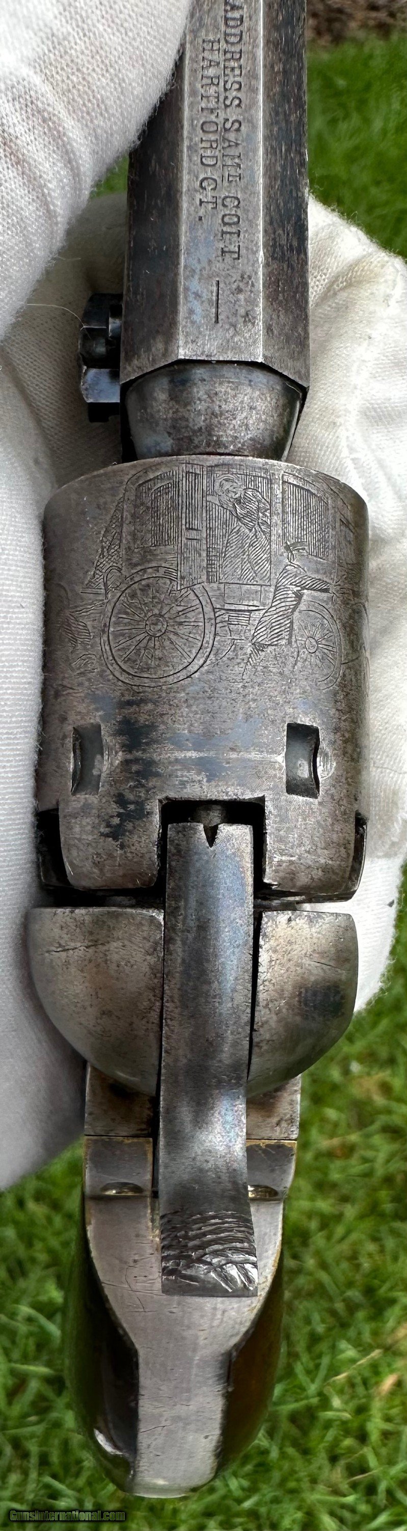 Description: Beautiful example of a Hartford barrel addressed Colt 1849 Pocket with a large percentage of original finish. This example has a great appearance with a unique case hardening pattern on the left side of the frame. About 80-90% of it remains. The barrel retains about 60% of the barrel blue. Much of the silver remains on the straps. A near perfect cylinder scene. Grip is minty. Mechanically works most of the time but sometimes the cylinder won't spin when cocked. Shipping is $25 plus actual insurance. Asking: $3,100.00 SOLD Antique: Yes |