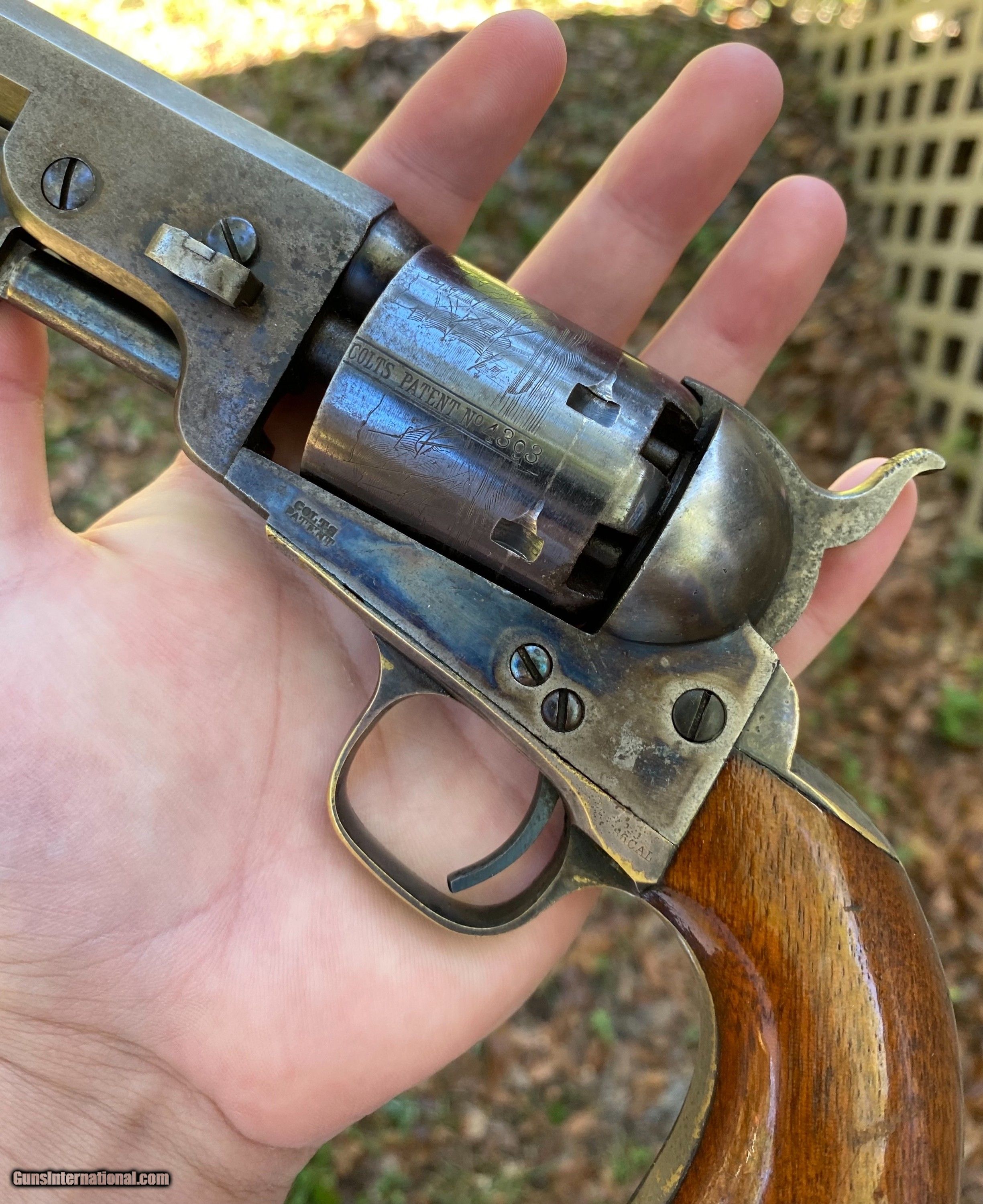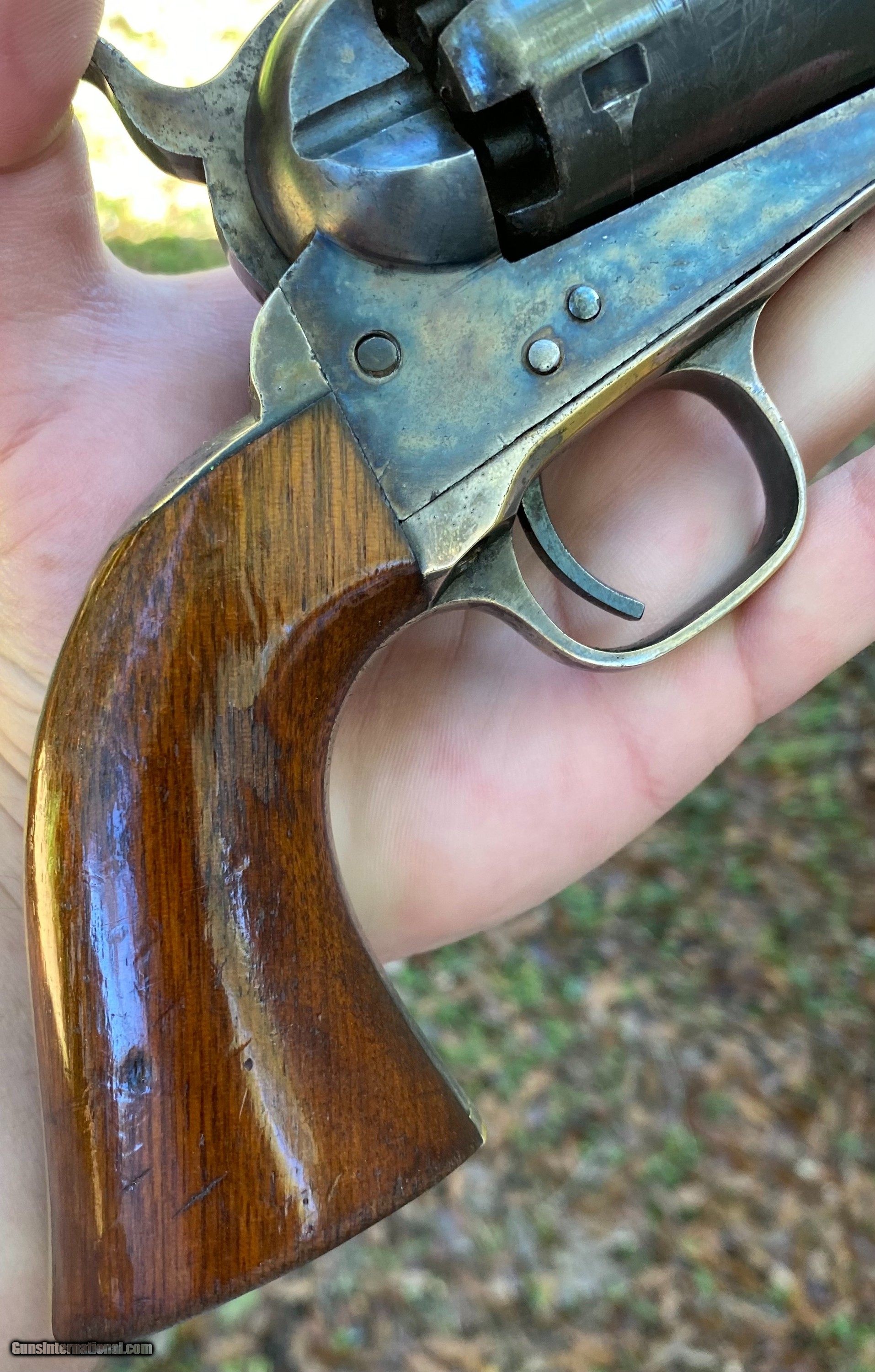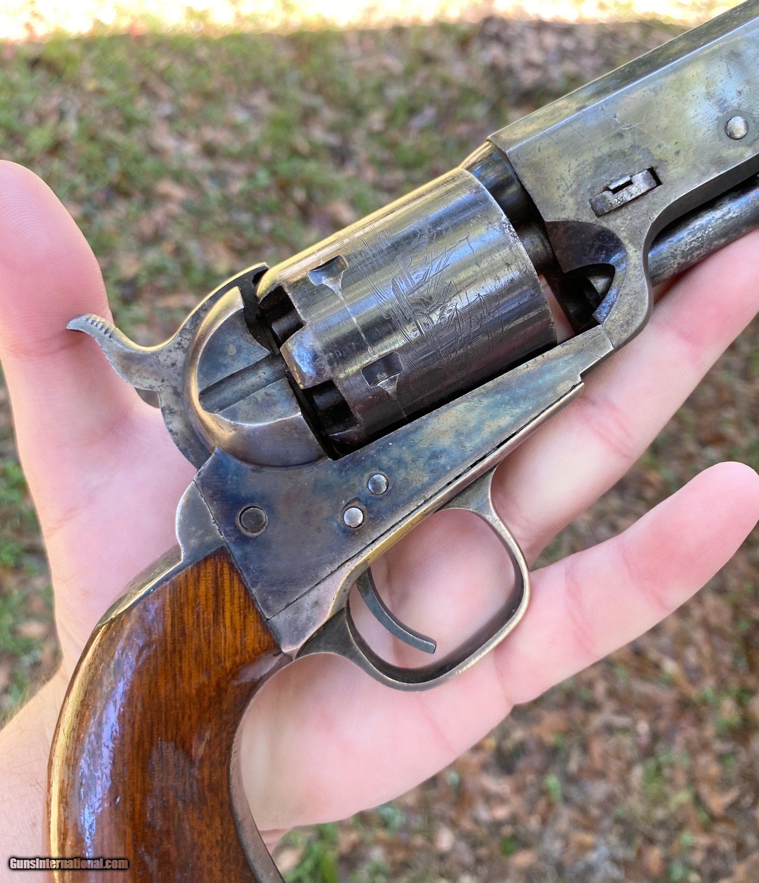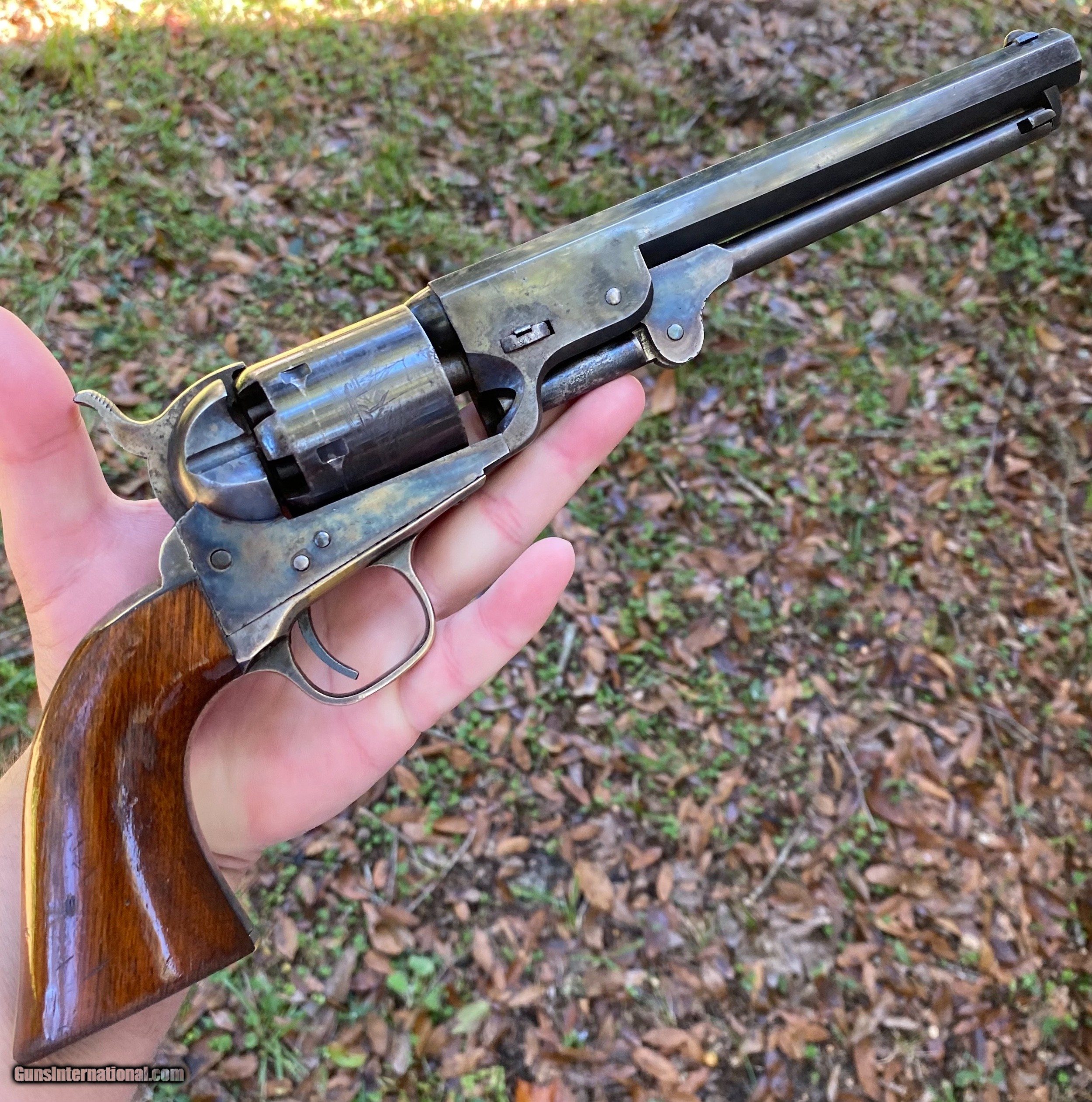 Description: This is a extremely nice Navy that for some reason on the left side of the barrel has lost its blue finish. How this happened, I am unsure. This would’ve been a hell of a nice Navy that would’ve retailed for over $10,000. This example retains approximately 60% of its original barrel blue. Approximately 95% original case hardened finish. Around 90% cylinder blue with an excellent cylinder scene. Backstrap and trigger guard retail approximately 70% silver wash. Grips are excellent with most original varnish visible. There is a period “XX” scratched into the trigger guard. All serial numbers match except the loading lever which is likely a factory mismatch as the condition matches the revolver perfectly. Period altered front dovetail sight. Mechanically excellent. This is a really nice Navy for the money as you are getting a little less condition but for half the value of what this gun would’ve been. Shipping is $25 plus actual insurance. Sale Pending SOLD Antique: Yes |