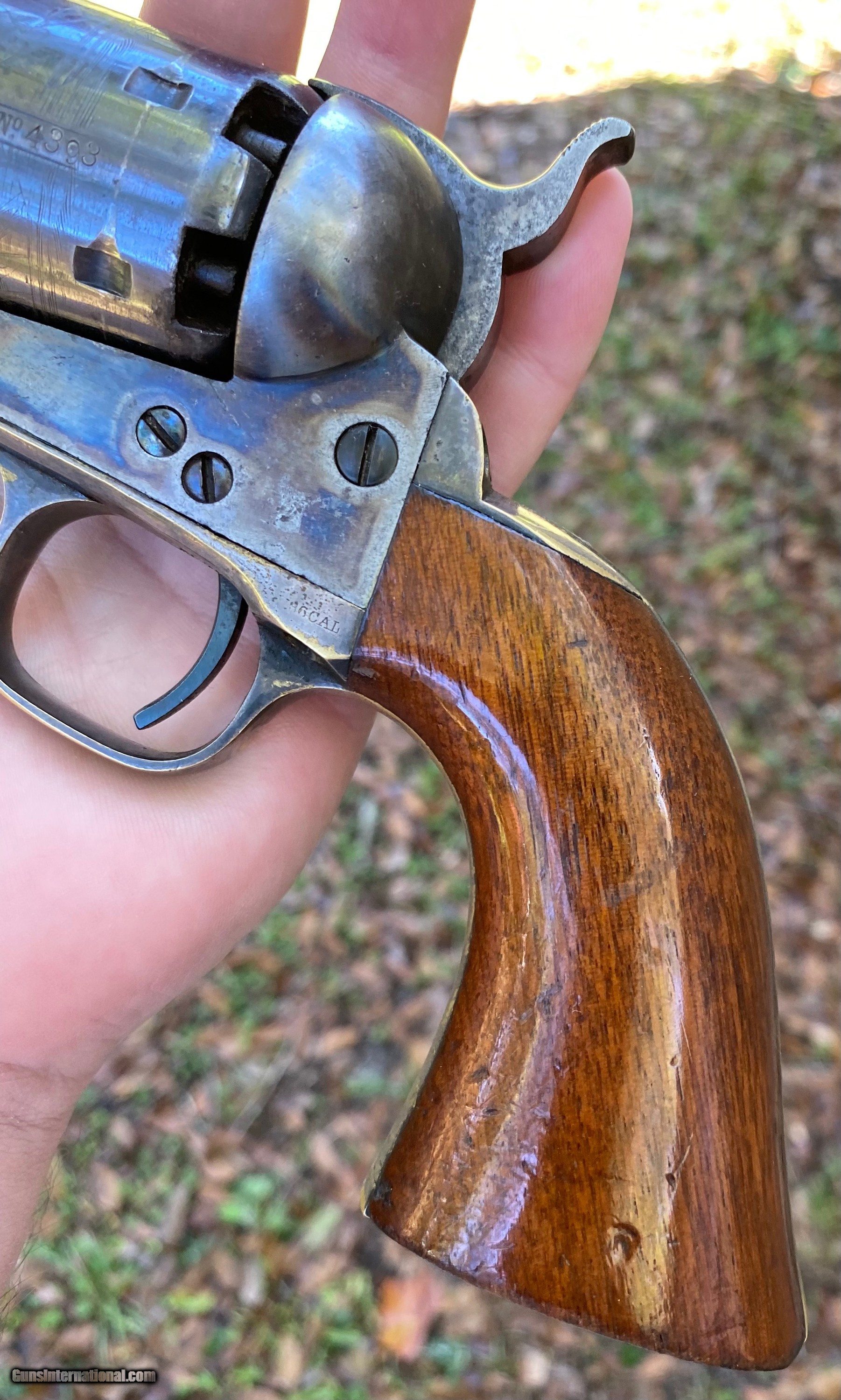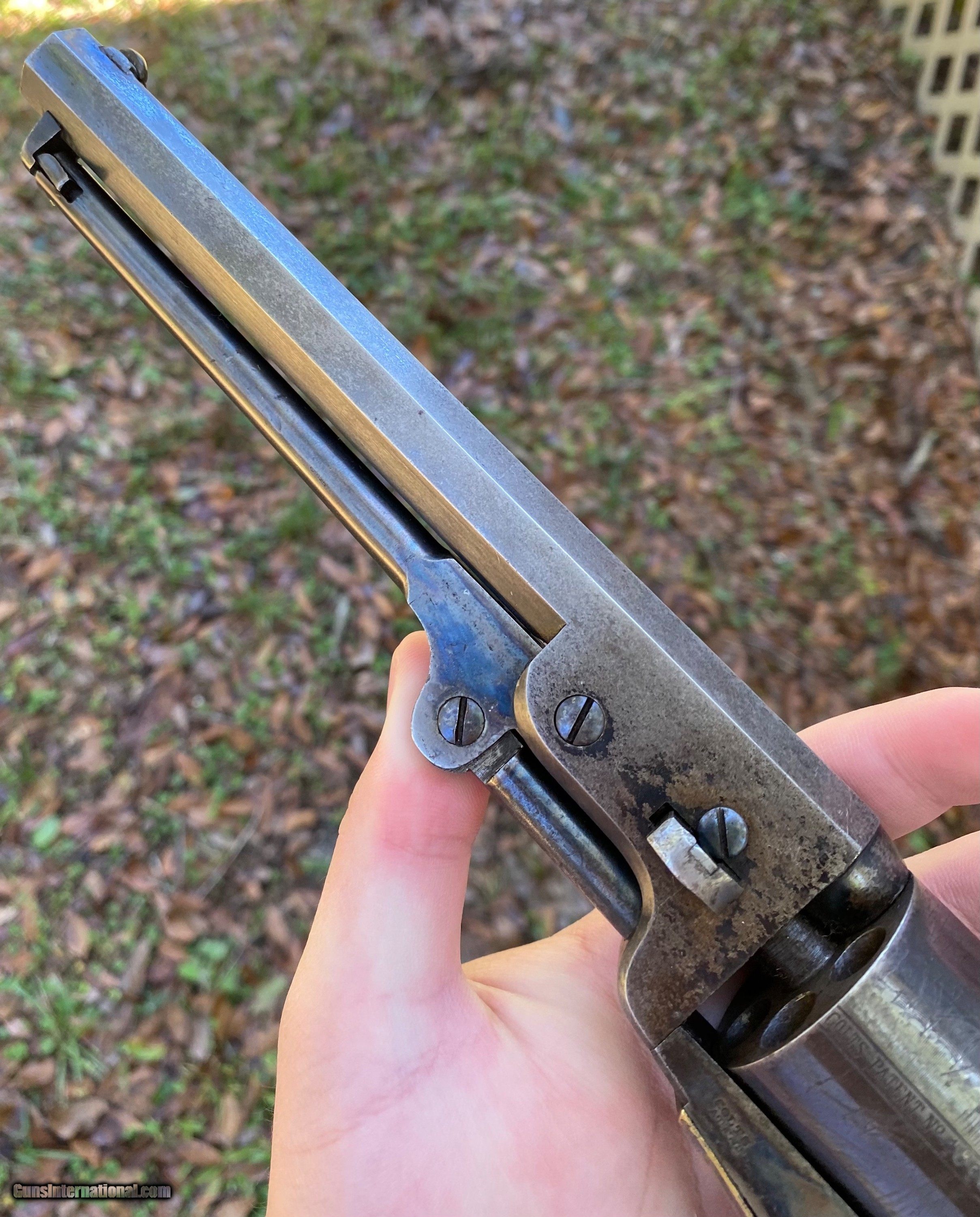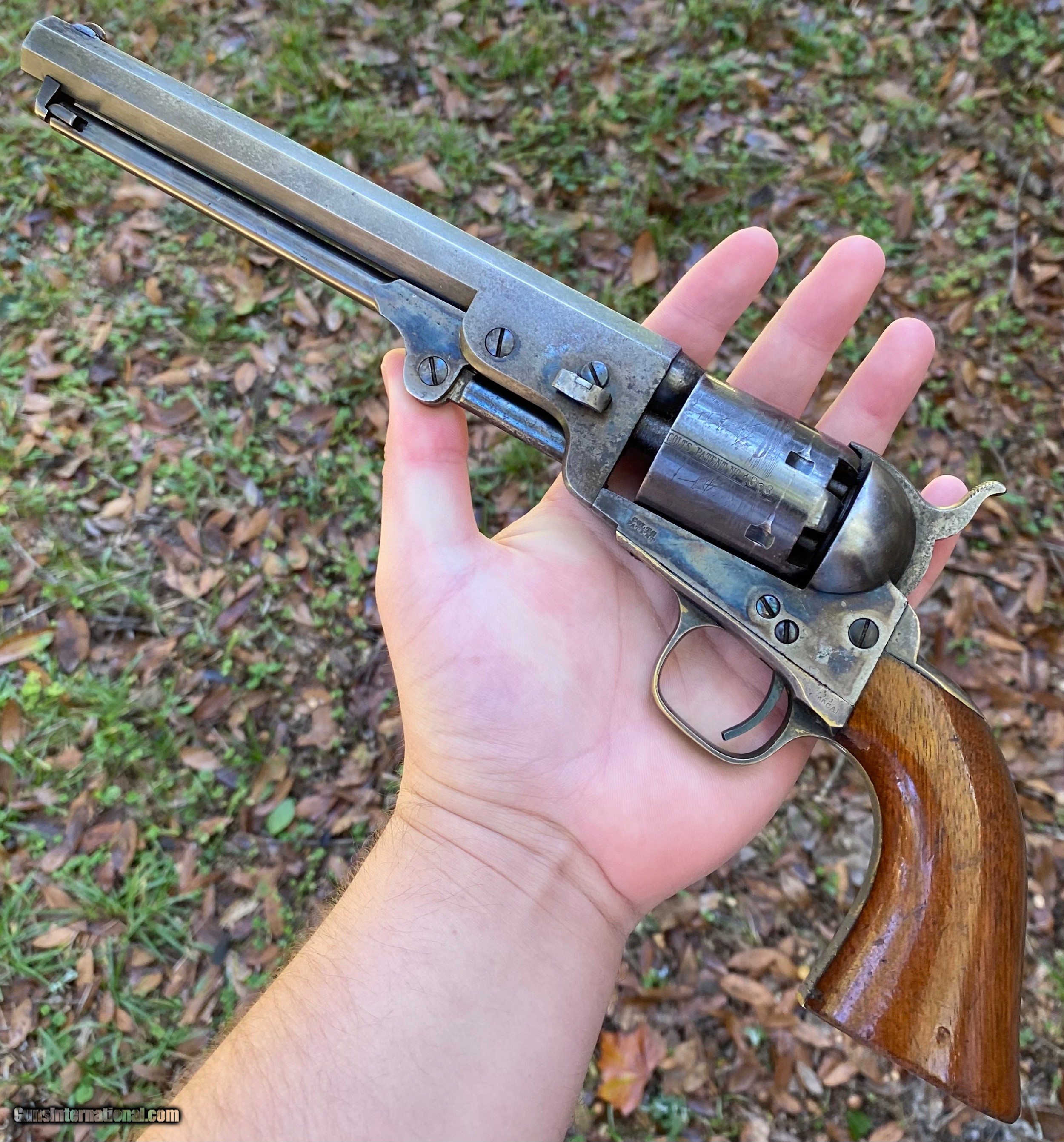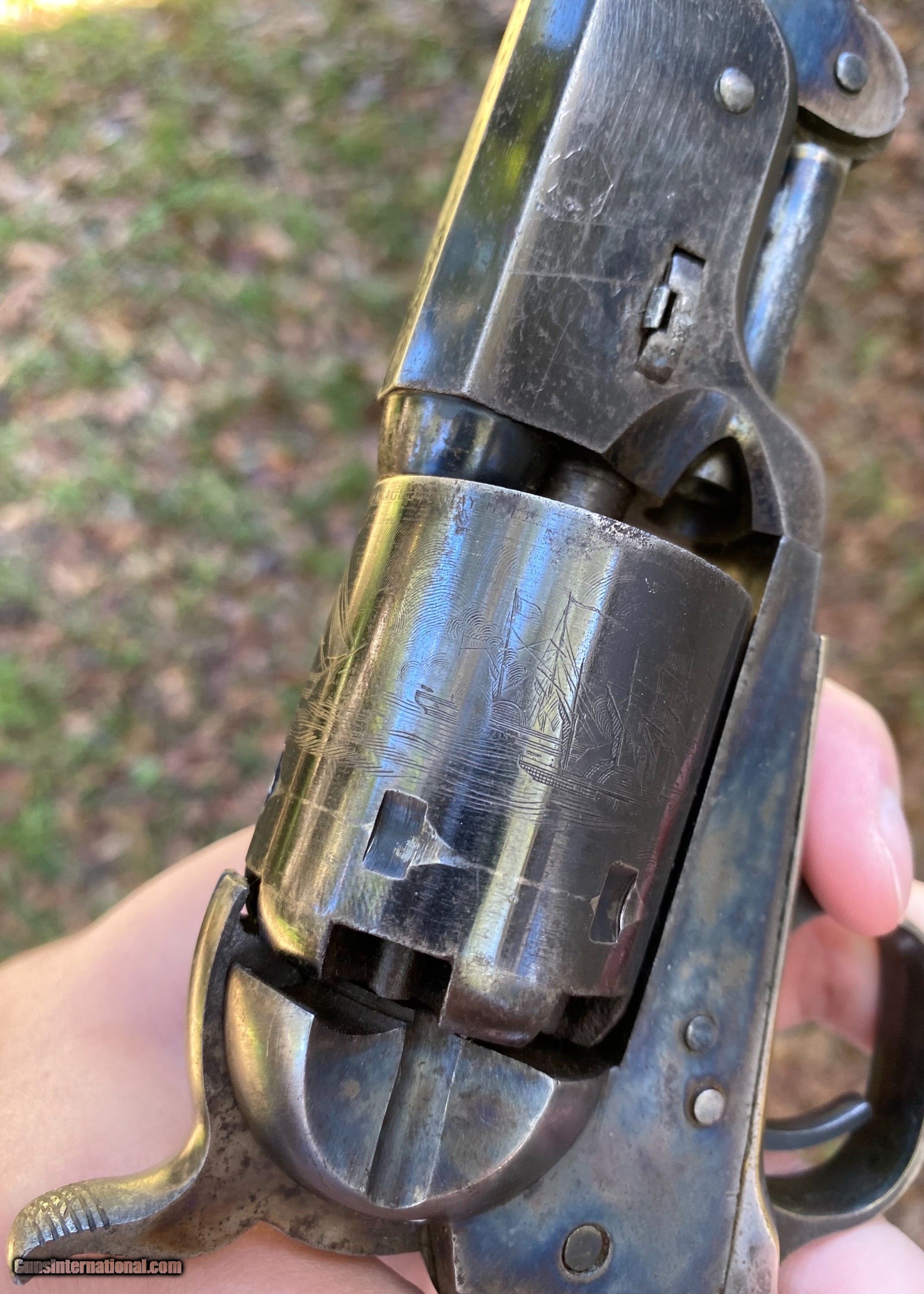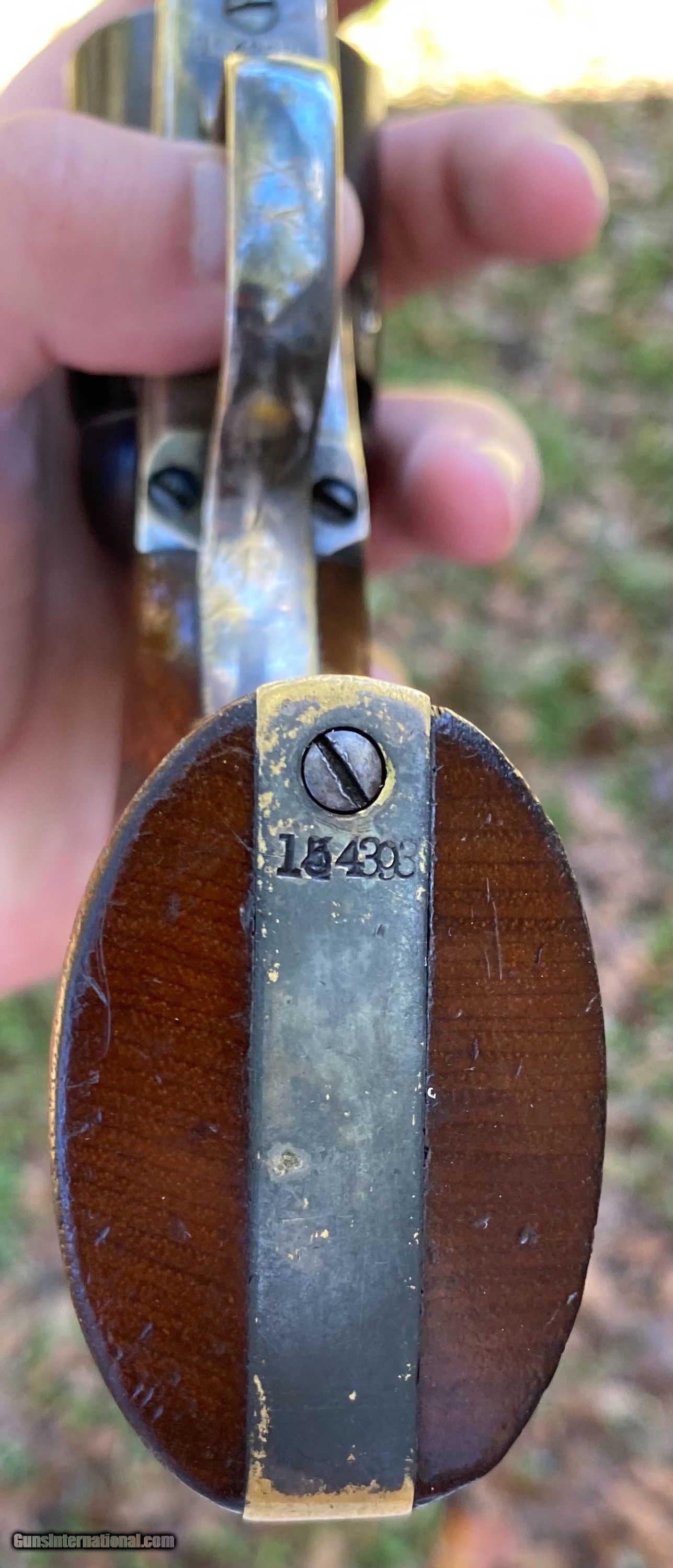 Description: This is a extremely nice Navy that for some reason on the left side of the barrel has lost its blue finish. How this happened, I am unsure. This would’ve been a hell of a nice Navy that would’ve retailed for over $10,000. This example retains approximately 60% of its original barrel blue. Approximately 95% original case hardened finish. Around 90% cylinder blue with an excellent cylinder scene. Backstrap and trigger guard retail approximately 70% silver wash. Grips are excellent with most original varnish visible. There is a period “XX” scratched into the trigger guard. All serial numbers match except the loading lever which is likely a factory mismatch as the condition matches the revolver perfectly. Period altered front dovetail sight. Mechanically excellent. This is a really nice Navy for the money as you are getting a little less condition but for half the value of what this gun would’ve been. Shipping is $25 plus actual insurance. Sale Pending SOLD Antique: Yes |