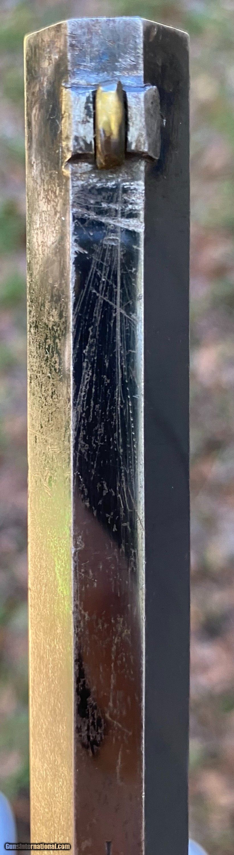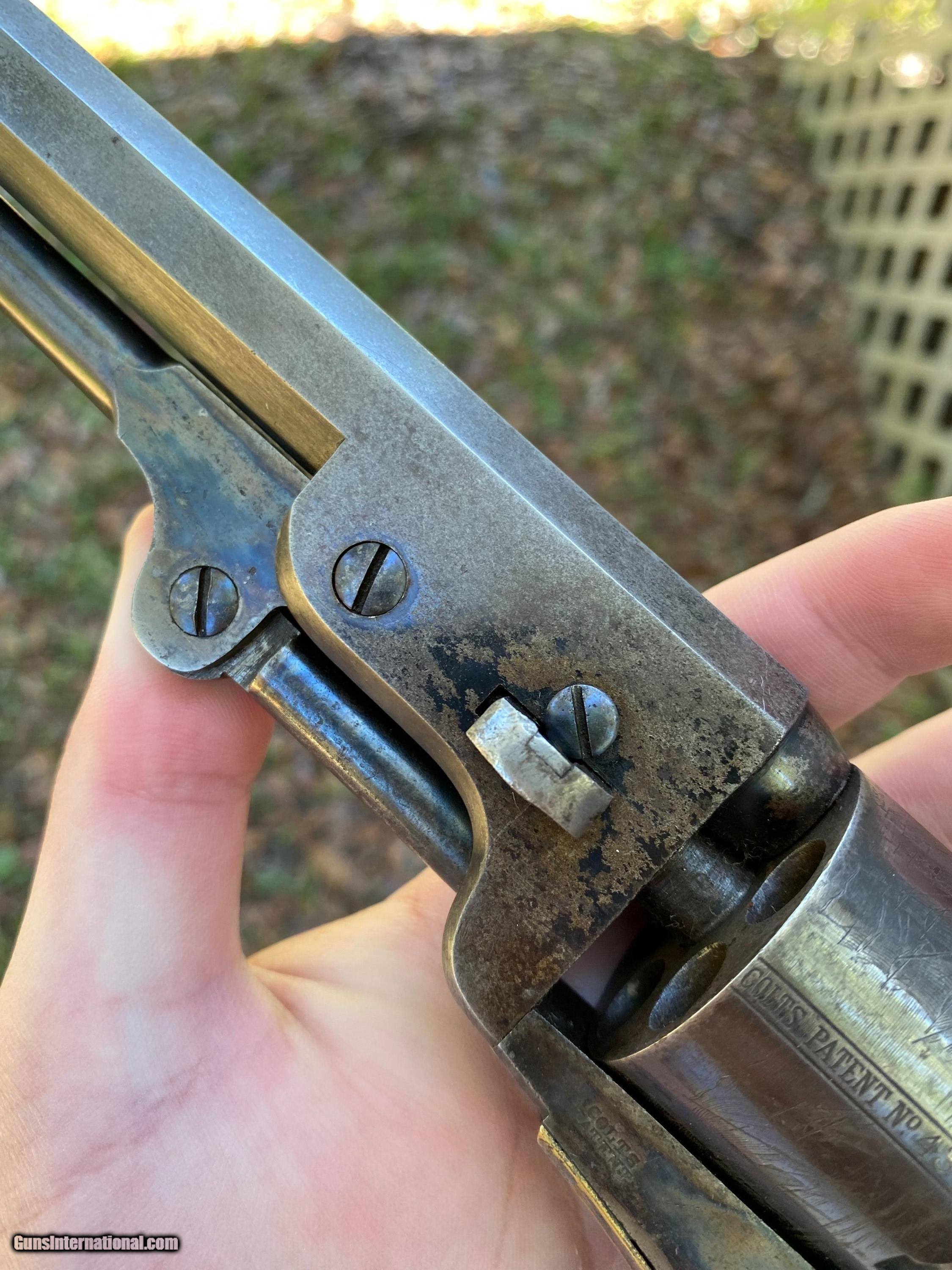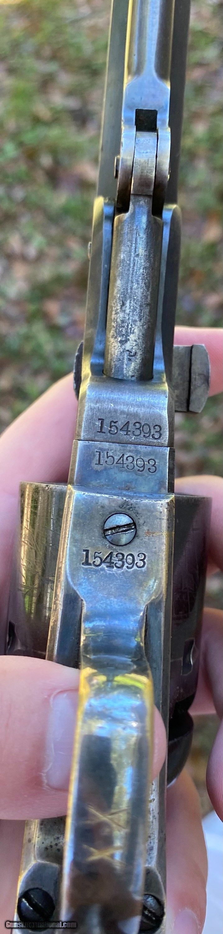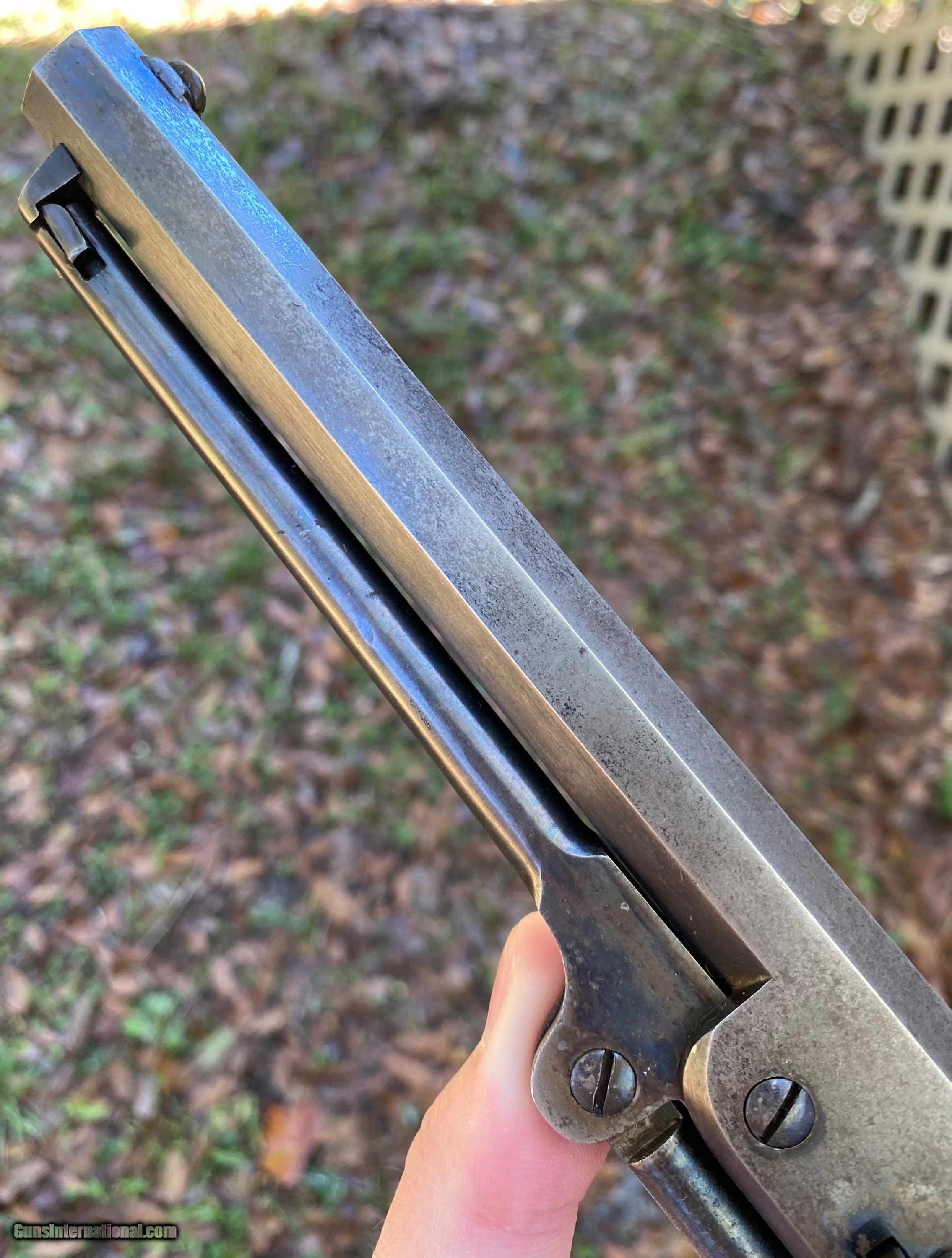 Description: This is a extremely nice Navy that for some reason on the left side of the barrel has lost its blue finish. How this happened, I am unsure. This would’ve been a hell of a nice Navy that would’ve retailed for over $10,000. This example retains approximately 60% of its original barrel blue. Approximately 95% original case hardened finish. Around 90% cylinder blue with an excellent cylinder scene. Backstrap and trigger guard retail approximately 70% silver wash. Grips are excellent with most original varnish visible. There is a period “XX” scratched into the trigger guard. All serial numbers match except the loading lever which is likely a factory mismatch as the condition matches the revolver perfectly. Period altered front dovetail sight. Mechanically excellent. This is a really nice Navy for the money as you are getting a little less condition but for half the value of what this gun would’ve been. Shipping is $25 plus actual insurance. Sale Pending SOLD Antique: Yes |
