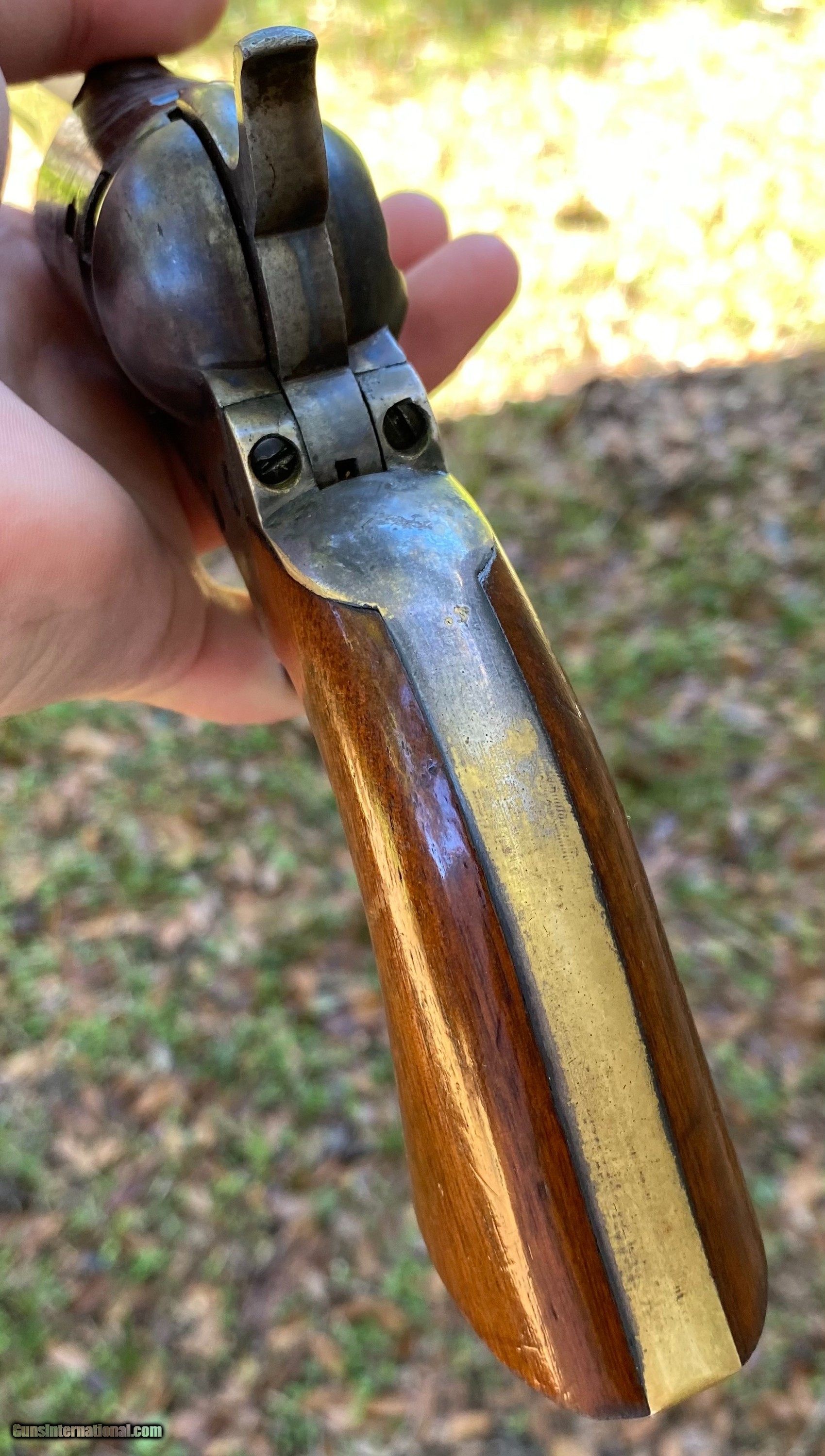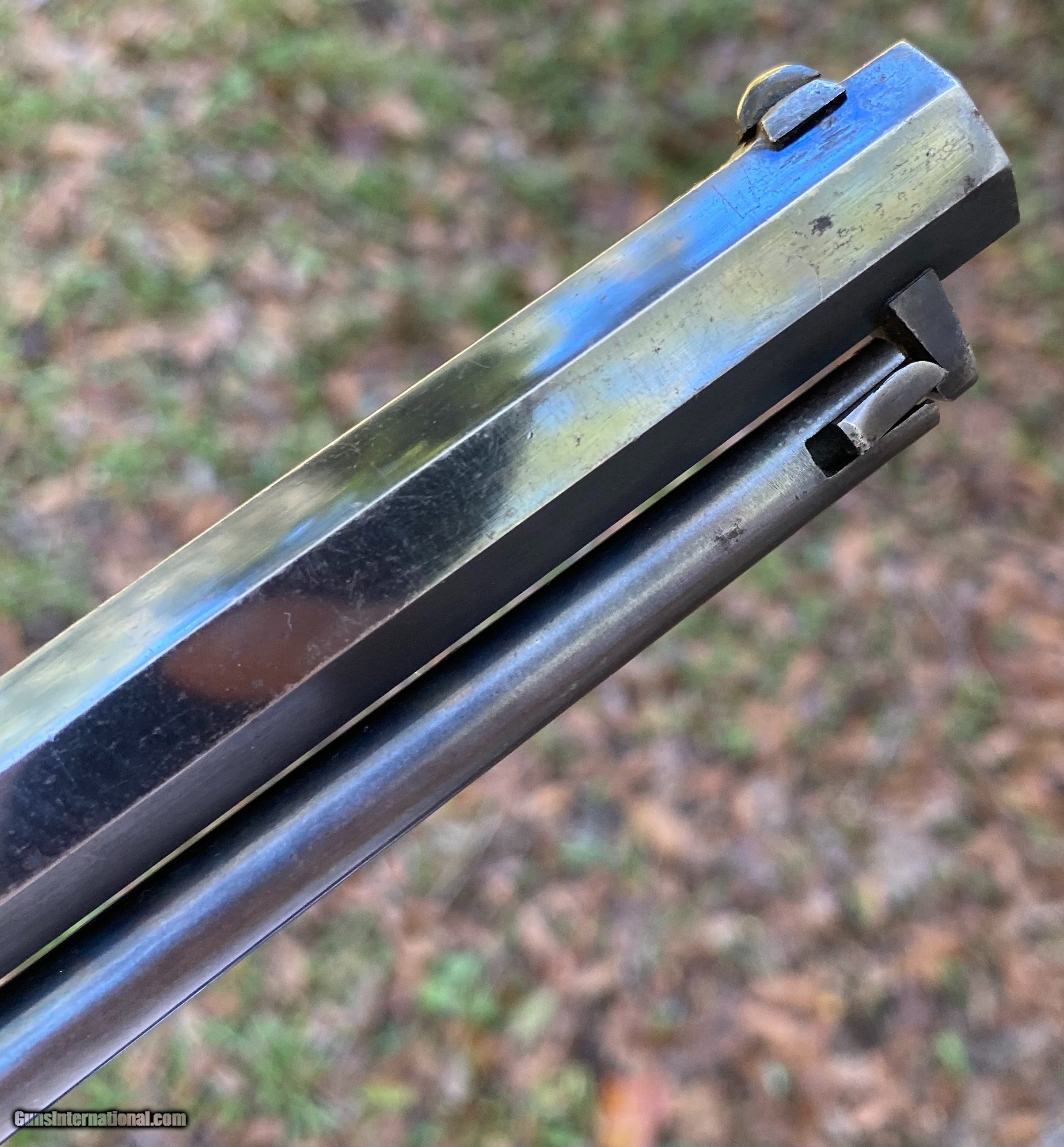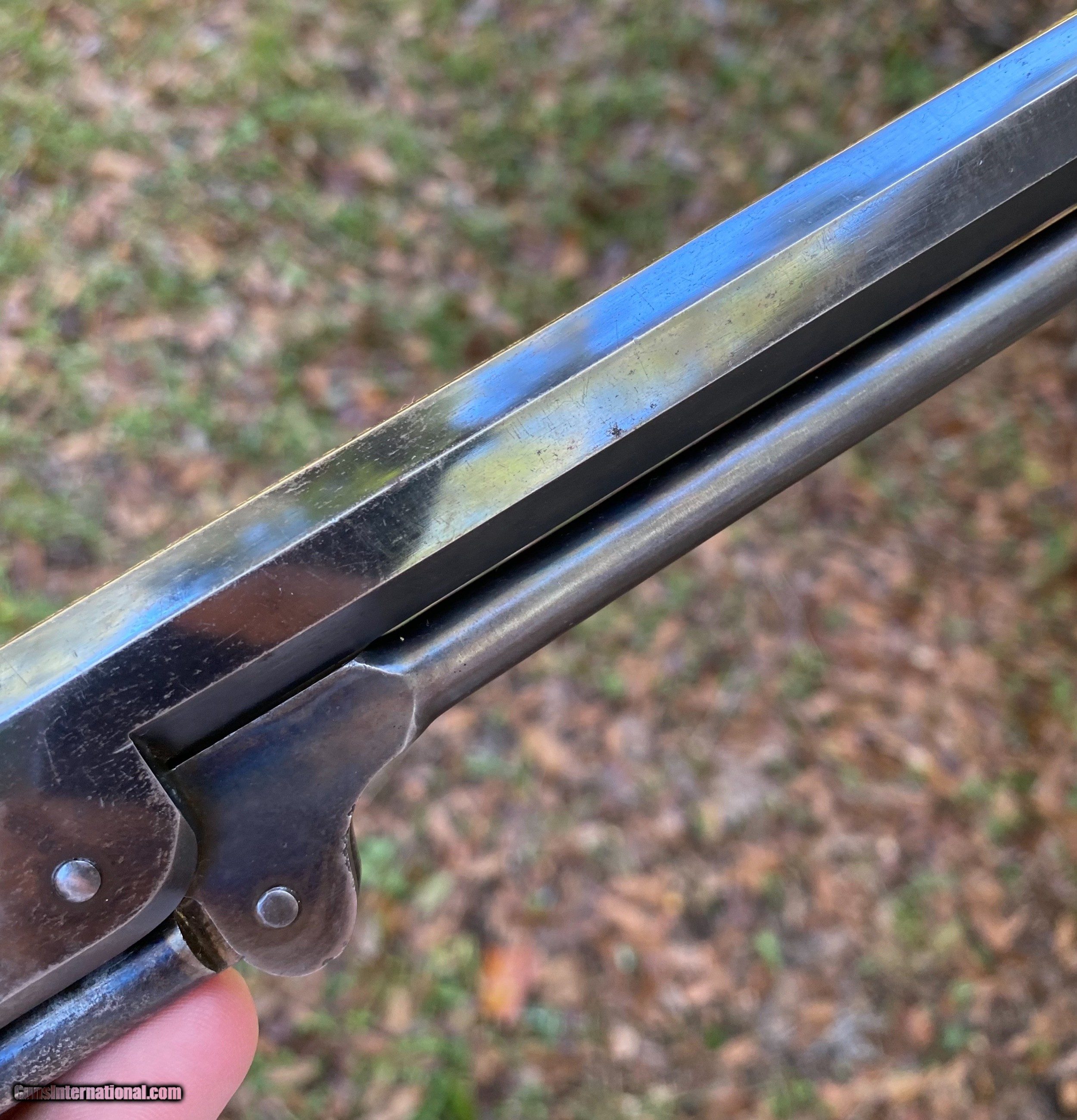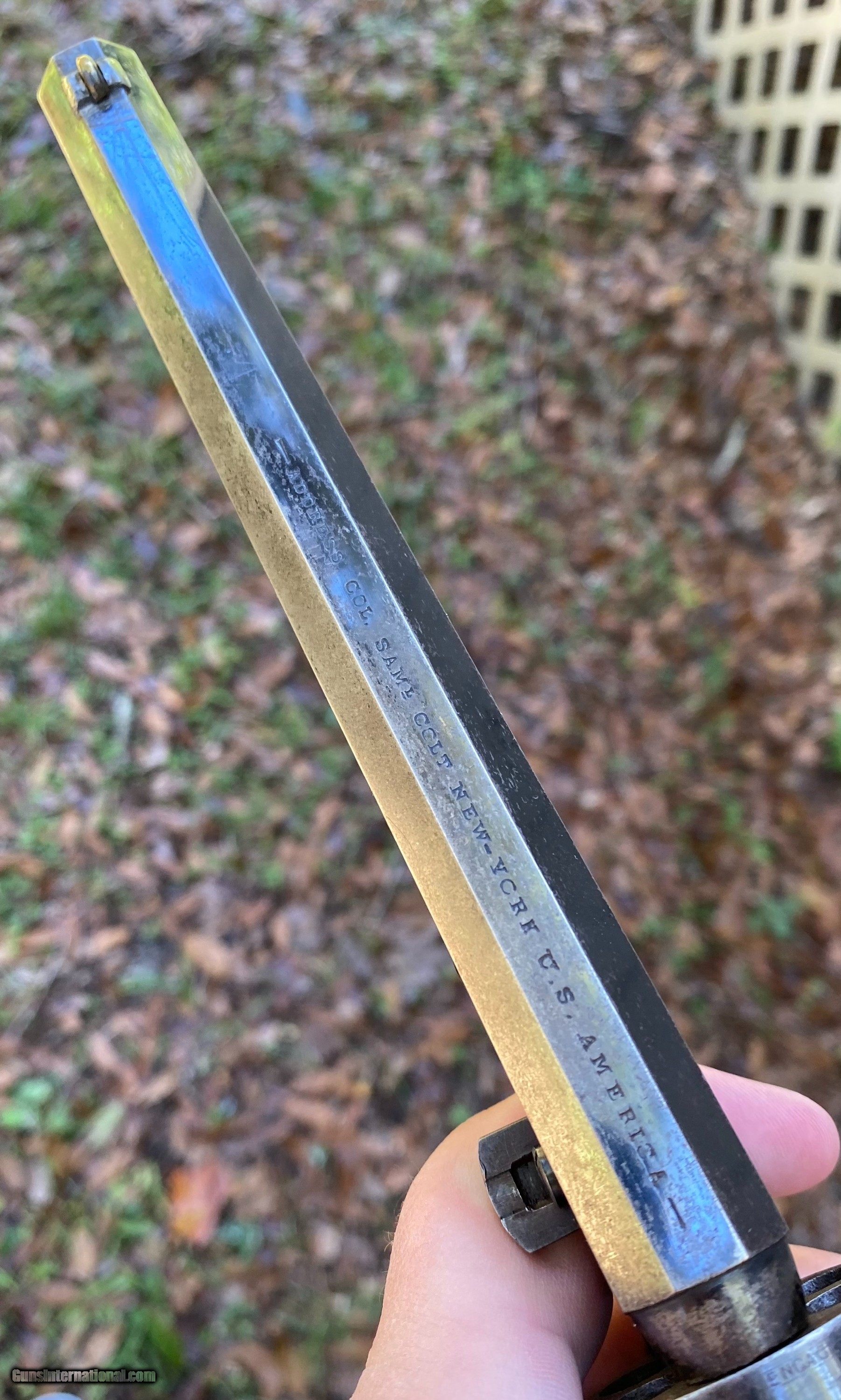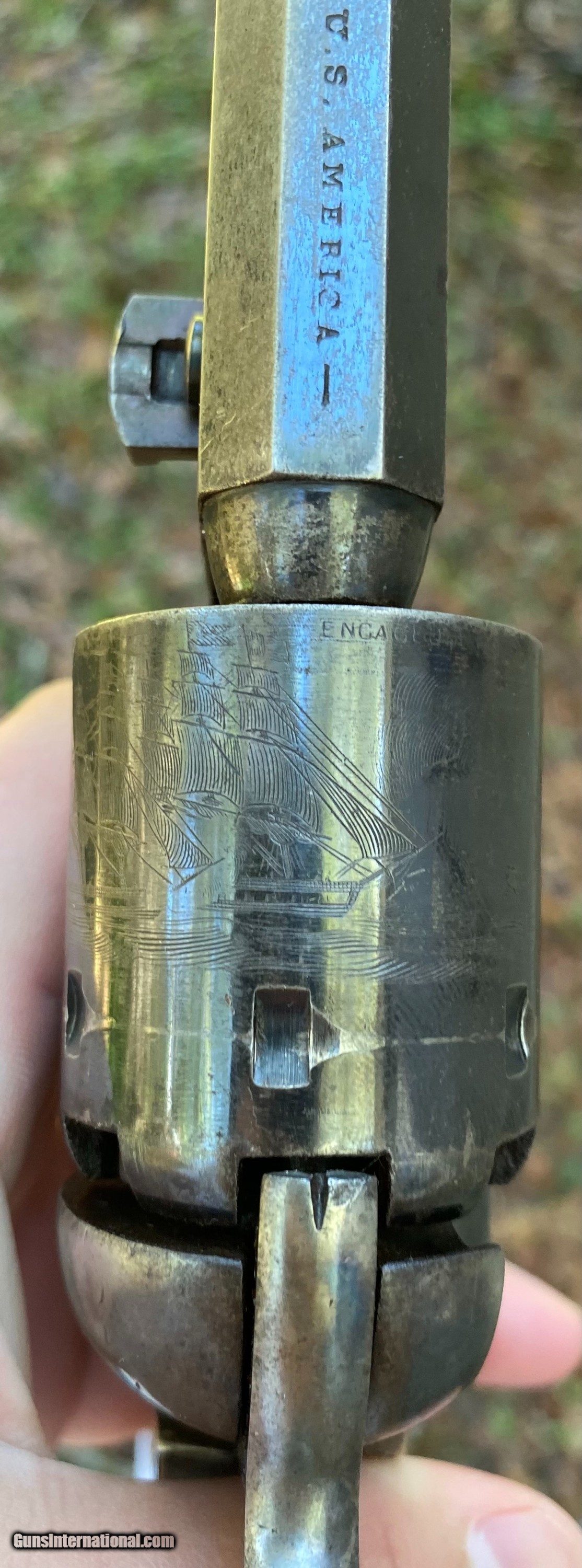 Description: This is a extremely nice Navy that for some reason on the left side of the barrel has lost its blue finish. How this happened, I am unsure. This would’ve been a hell of a nice Navy that would’ve retailed for over $10,000. This example retains approximately 60% of its original barrel blue. Approximately 95% original case hardened finish. Around 90% cylinder blue with an excellent cylinder scene. Backstrap and trigger guard retail approximately 70% silver wash. Grips are excellent with most original varnish visible. There is a period “XX” scratched into the trigger guard. All serial numbers match except the loading lever which is likely a factory mismatch as the condition matches the revolver perfectly. Period altered front dovetail sight. Mechanically excellent. This is a really nice Navy for the money as you are getting a little less condition but for half the value of what this gun would’ve been. Shipping is $25 plus actual insurance. Sale Pending SOLD Antique: Yes |