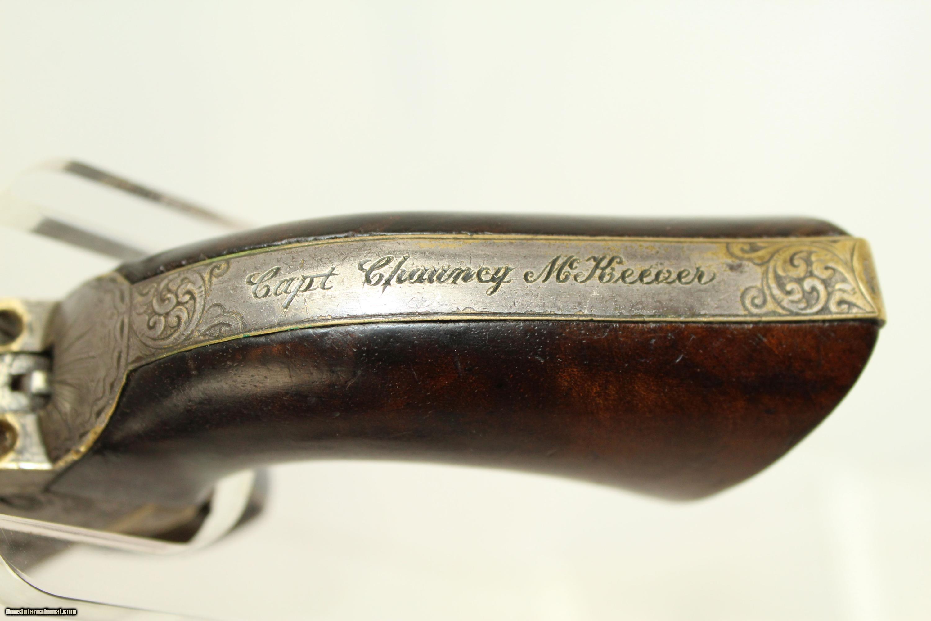 Description: INSCRIBED Gustave YOUNG Engraved COLT 1849 Pocket CIVIL WAR Capt Chauncey McKeever’s Personal Weapon Here we present an antique Colt 1849 Pocket Revolver, made in 1855, in Hartford, Connecticut. This revolver was factory engraved by the famous and trend-setting master engraver Gustave Young. Gustave Young was one of many German immigrants who came to the United States and worked in the firearms industry. However, Young’s talents were most assuredly in engraving and his style set him apart from his contemporaries. This influx of German engravers starting in about 1850 was perhaps the beginning of what R.L. Wilson has called the “golden age of arms engraving in America”. Other names such as Bodenstein, Helfricht, Nimschke, and several Ulrichs would also make their enormous contributions to the craft, imparting their Germanic influence and become legends as well. Wilson goes on to say that “Young is generally considered to have been the best arms engraver active in 19th Century America.” Young was “Colt’s chief engraving contractor from 1852-1869.” This revolver displays two of Young’s key trademarks, each side of the hammer being engraved in the likeness of a wolf’s head, and another animal’s head on the barrel flat on the left side of the gun. This revolver also features the hand engraved “Saml Colt” barrel address in fancy scroll. Serial numbers all feature a dot, denoting this as a factory specimen earmarked for engraving. The silver plated brass grip strap is inscribed “Capt Chauncy McKeevers”. Chauncey McKeever was born on August 31, 1829 in Baltimore, Maryland. His father, Isaac McKeever, joined the United States Navy at age 14, fighting in the War of 1812, his death ending his 47-year career in the Navy in 1856 at the rank of Commodore. Chauncey entered the United States Military Academy at West Point in 1845, at the age of 16. Most of his classmates were at least 2 years older, and included many who would fight on the side of the Confederacy during the American Civil War. Chauncey graduated in 1849, going on to fight the Seminoles in Florida through 1851. He was stationed in San Francisco, California in 1855, participating in the “Puget Sound War”, which was a territorial dispute between the U.S. and several tribes of Native Americans in that region. In 1858, Chauncey participated in the Utah Expedition, a series of armed encounters the United States Army had with Mormon settlers in the Utah Territory. In 1861 the War Between the States erupted and McKeever served right through it under the likes of Sherman, Heintzelman, McDowell, and perhaps most interestingly, Frémont. In Kenneth Powers Williams’s Grant Rises in the West: The first year, 1861-1862, Captain Chauncey McKeever is mentioned several times. This was during General John C. Frémont’s brief tenure over the Department of the West, based in St. Louis, Missouri. Captain McKeever was Frémont’s Assistant Adjutant General, and it is interesting to note that Powers Williams mentions McKeever when speaking more broadly of Frémont’s reign. “Just how affairs were being directed in the Western Department at this time is a puzzle. After Frémont took the field in late September, Captain Chauncey McKeever exercised authority considerably in excess of that normal for an adjutant, though he seems to have informed his chief as to his actions”. Frémont’s style has been described as that of a European autocrat, establishing a lavish headquarters in St. Louis, appointing his own handpicked “bodyguard” cavalry unit of 300 strapping Kentuckians, employing cronies outside of the military to achieve his ends, promoting officers unilaterally, declaring martial law in Missouri, and sending his fiery wife, Jessie, as an emissary to personally make demands of President Lincoln, when the President opposed Frémont’s unilateral Emancipation Proclamation in the Western Theater. Though he was relieved of his command after refusing to retract the statement (it having a detrimental effect on volunteer units, counties and even states that were pro-slavery and pro-Unionist), it is said that this event was very influential to Lincoln’s federal Emancipation Proclamation. Back to the point, it was under these circumstances that we find Captain McKeever being one of the primary points of contact for General Ulysses S. Grant while in command at Cairo. After Frémont’s removal, McKeever went on to be promoted throughout the war, being breveted several times for his “Meritorious and Faithful Services During the Rebellion”. He finally retired from the military in 1893 at the rank of Colonel. He died in late 1901. The overall condition of the piece is good. The patina is returning. Iron parts are lightly pitted. Brass grip frame and trigger guard retain about 75% of the original silver plate. Traces of original gold plate on the protected parts of the hammer. Cylinder scene is quite nice. Markings are legible. Serial numbers match. The barrel wedge is an unnumbered replacement. The cylinder’s number has been restamped. The fancy walnut grips are in very good condition, having been refinished. Bore is in good condition. Action is fine. Own the original! This is a legitimate antique and not a reproduction. Barrel is 6 inches in length. Caliber: .31 percussion Bore is in good condition. The firing mechanism is fine. Overall condition as seen in photos. Don’t miss a rare opportunity to own a rare Young engraved Colt, inscribed to Captain Chauncey McKeever, U.S. Army officer during the American Civil War! Very Fast. Very Safe. FREE SHIPPING WORLDWIDE. Delivered directly to your door by express mail! Guaranteed AUTHENTIC & Includes CERTIFICATE OF AUTHENTICITY. ancestryguns $7100 #21793 SOLD Antique: Yes |