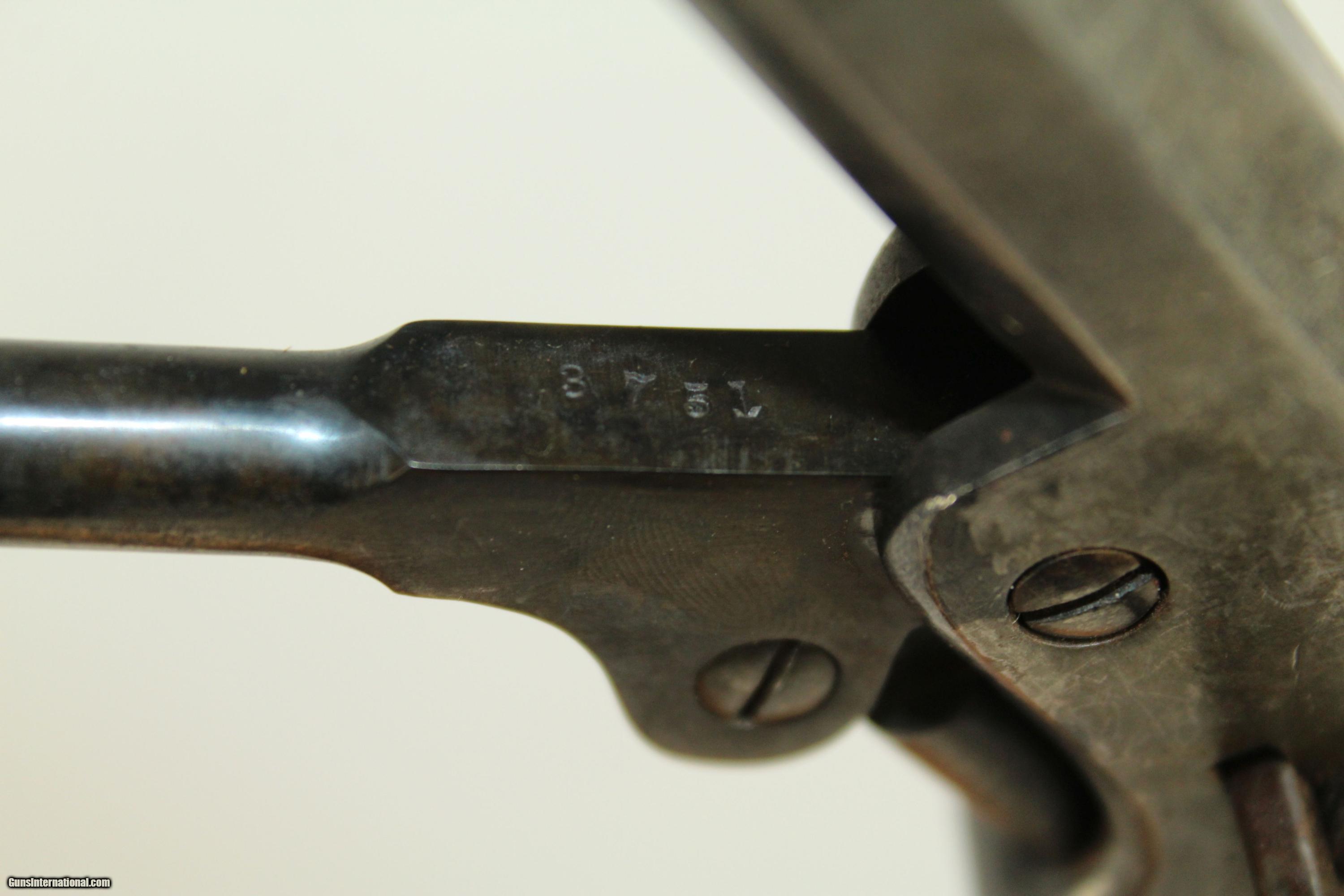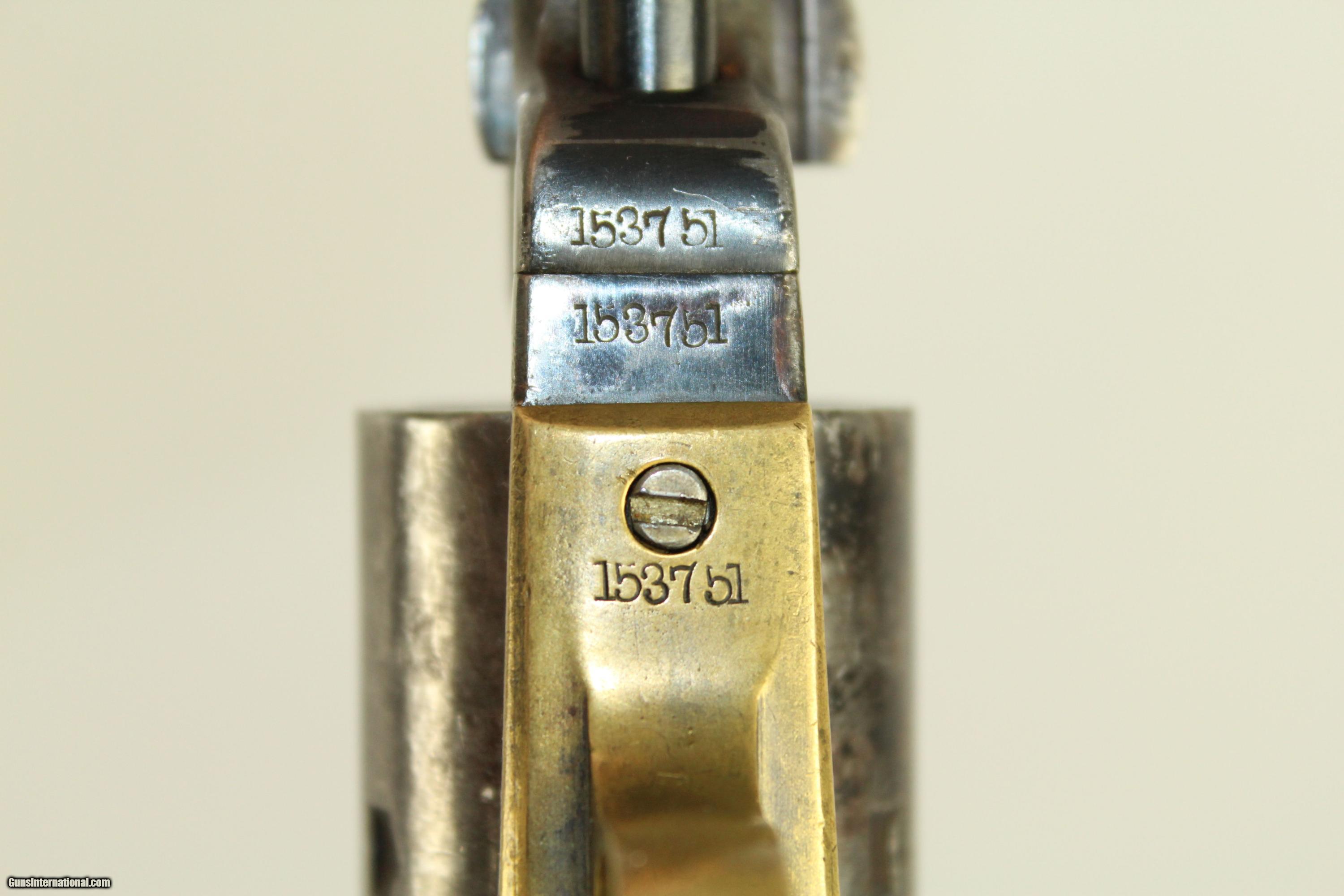 Description: Japanese Inscribed CIVIL WAR-era COLT 1851 NAVY Made During the Civil War 1863 w Japanese Characters Here we present an antique Colt 1851 Navy Revolver, made in 1863, in Hartford, Connecticut. The 1851 Navy was one of Colt’s most famous and successful lines, reaching a production total of 257,348 from 1850 to 1873 (right up to the time of SAA production) from both Hartford and London factories. From Hartford alone, 185,000 were made by the end of the American Civil War. Many of these saw service during the conflict on both sides. There were some military purchases and lots of private purchases by soldiers going off to war. In addition, the Model 1851 was a favorite of “Wild Bill” Hickok, who carried two of these most famously in his red sash. This specimen is very interesting. It features Japanese characters inscribed on each side of the grip. Back in 1853, the U.S. began relations with Japan as Commodore Matthew C. Perry was ordered by President Millard Fillmore to take naval ships to the capital city of Edo. This marked the beginning of enormous change in Japan, including modernization and Westernization. In 1860, Japan sent a Japanese Embassy to the United States, just on the cusp of the American Civil War. One wonders who owned this revolver and where it has been. Perhaps someone familiar with this language can shed light on its history. The revolver shows both a high degree of care, and also much use. For instance, the cylinder scene has been worn smooth, other markings like the barrel address are faded (one line New York address), and the bore shows no more rifling. Yet, the barrel still fits tight to the frame, and the original wedge was retained. All serial numbers match. The blue is a very old refinish. This is clearly a gun that was prized and still utilized. This specimen is in very good condition. Bluing is from a very old refinish, with about 50% remaining. The markings are legible, with some fading. Serial numbers match, including the grips. The original walnut grips are in near fine condition with Japanese characters inscribed on both sides. The bore is smooth and in good condition. The action is strong. Own the original! This is a legitimate antique and not a reproduction. Barrel is 7-1/2 inches in length. Caliber: .36 percussion The bore is in very good condition, and the firing mechanism is functional. Overall condition as seen in photos. Here is a very nice Civil War production Colt 1851 Navy Revolver for your collection. Very Fast. Very Safe. FREE SHIPPING WORLDWIDE. Delivered directly to your door by express mail! Guaranteed AUTHENTIC & Includes CERTIFICATE OF AUTHENTICITY. ancestryguns $1750 #21926 SOLD Antique: Yes |