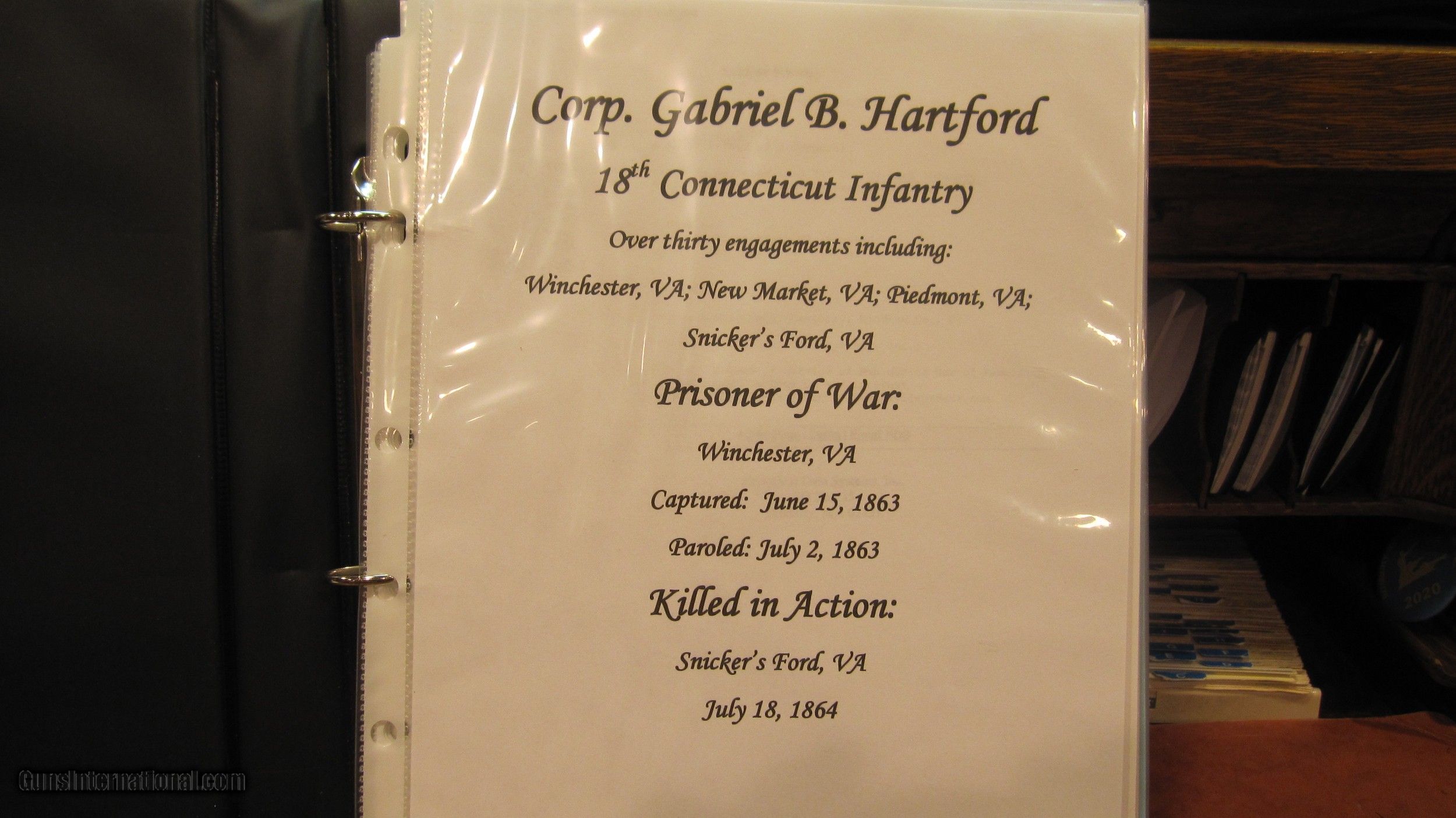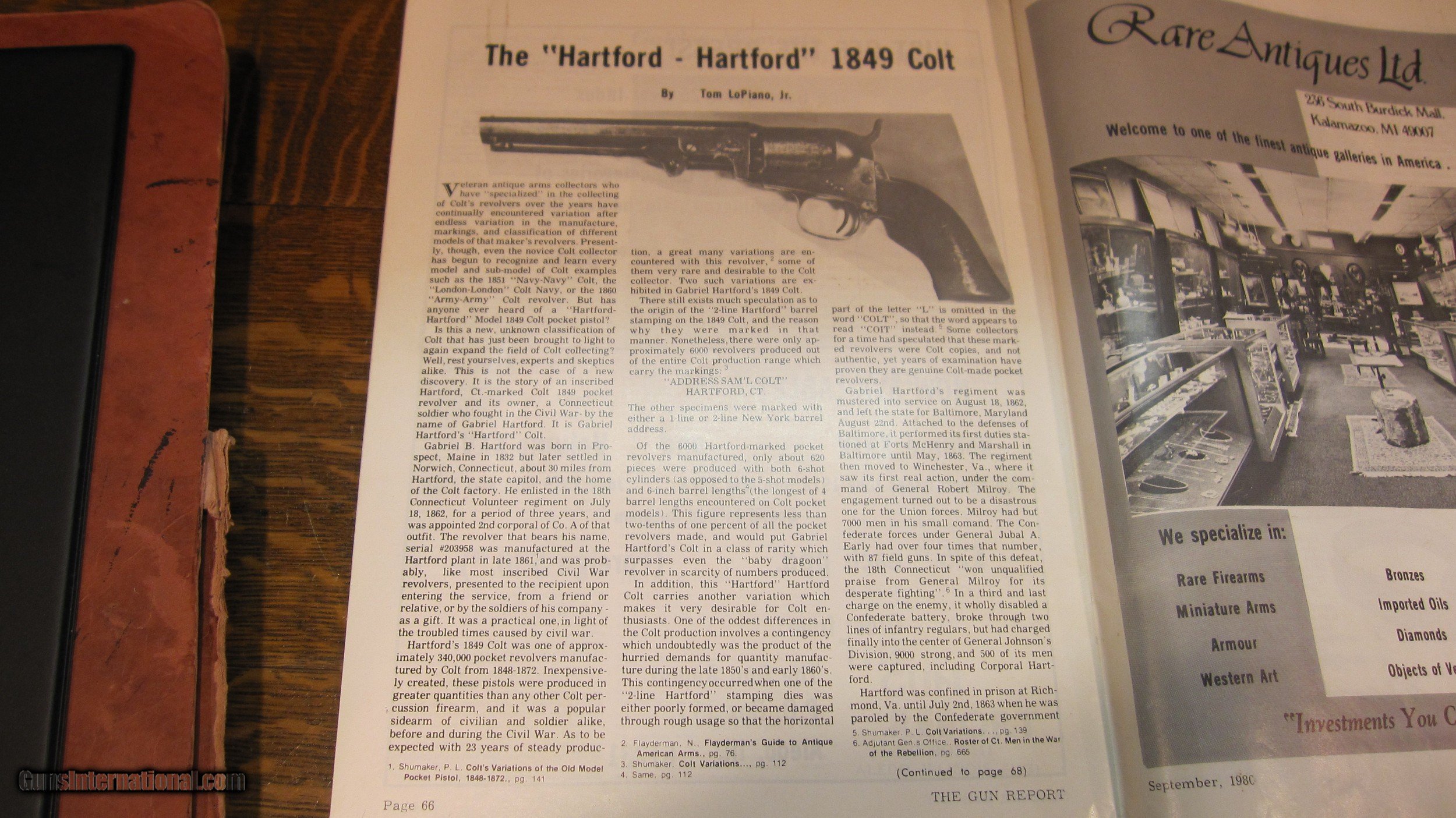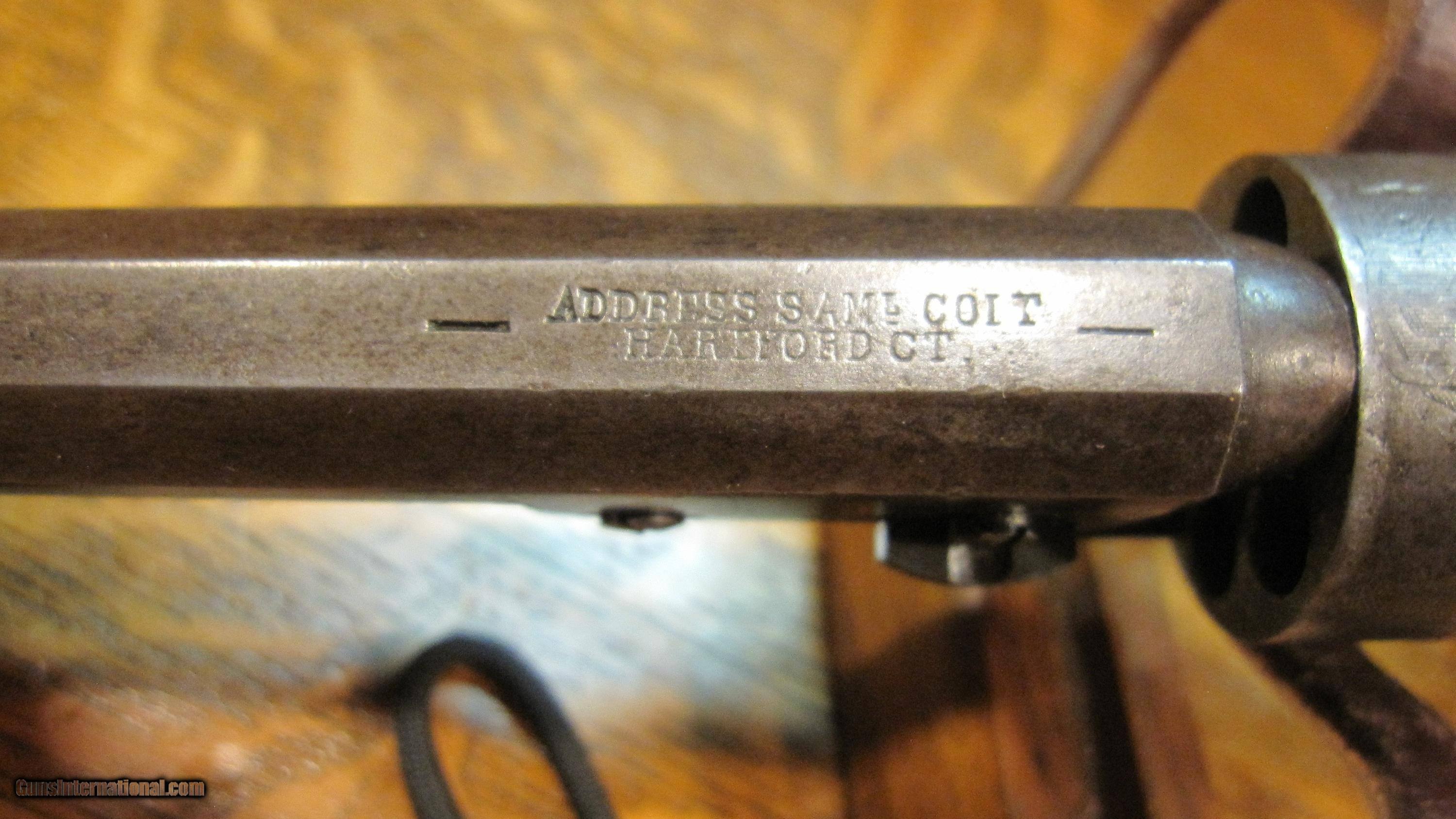 Description: "THE HARTFORD-HARTFORD".Colt 1849 6" Pocket Revolver. .31 Cal. Desirable Hartford barrel address.Very rare variation of the 1849 Pocket. Out of about 340,000 examples made, only about 620 had 6"barrels, in six shot (instead of 5), and the 2 line Hartford Address. Serial #203958. Manufactured in 1861. Inscribed to Corp. Gabriel B. Hartford of the 18th Connecticut Infantry KIA at Snickers Ford, Va. 18 July 1864. Hartford enlisted on 18 July 1862, exactly 2 years prior to his death. He was also captured on 15 June 1863 at Winchester, Va. Paroled a month later. Gun is all original. No original finish remains, just a beautiful natural patina. You'll love it! Has some silver left on trigger guard and backstrap. Most original varnish on grips. Action is fine. Gun was featured in the September 1980 issue of THE GUN REPORT. This is right after it was discovered by Tom LoPiano Jr. in Connecticut. Comes with a binder of military and pension records. Also an original copy of the 18th Connecticut Regimental. Thats rare! KIA inscribed revolvers are pretty scarce. Please call 973-214-3407 with questions SOLD Antique: Yes |