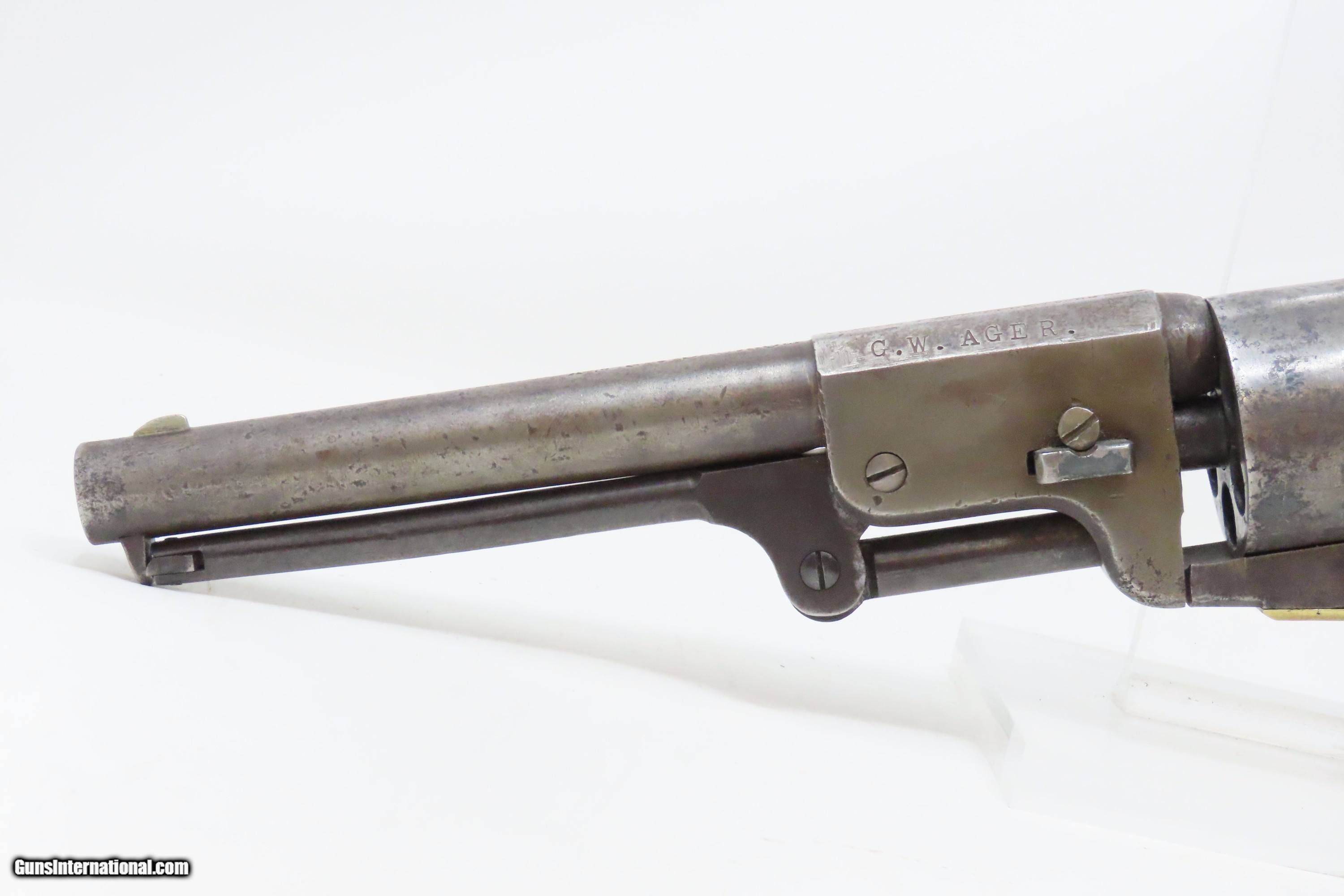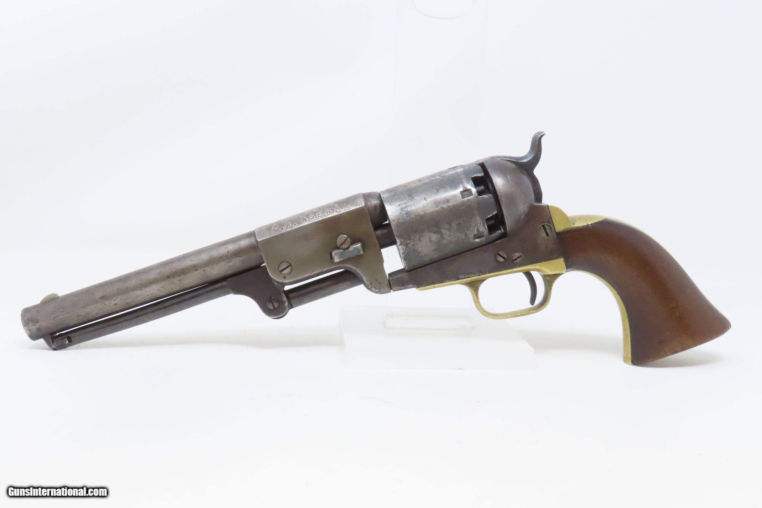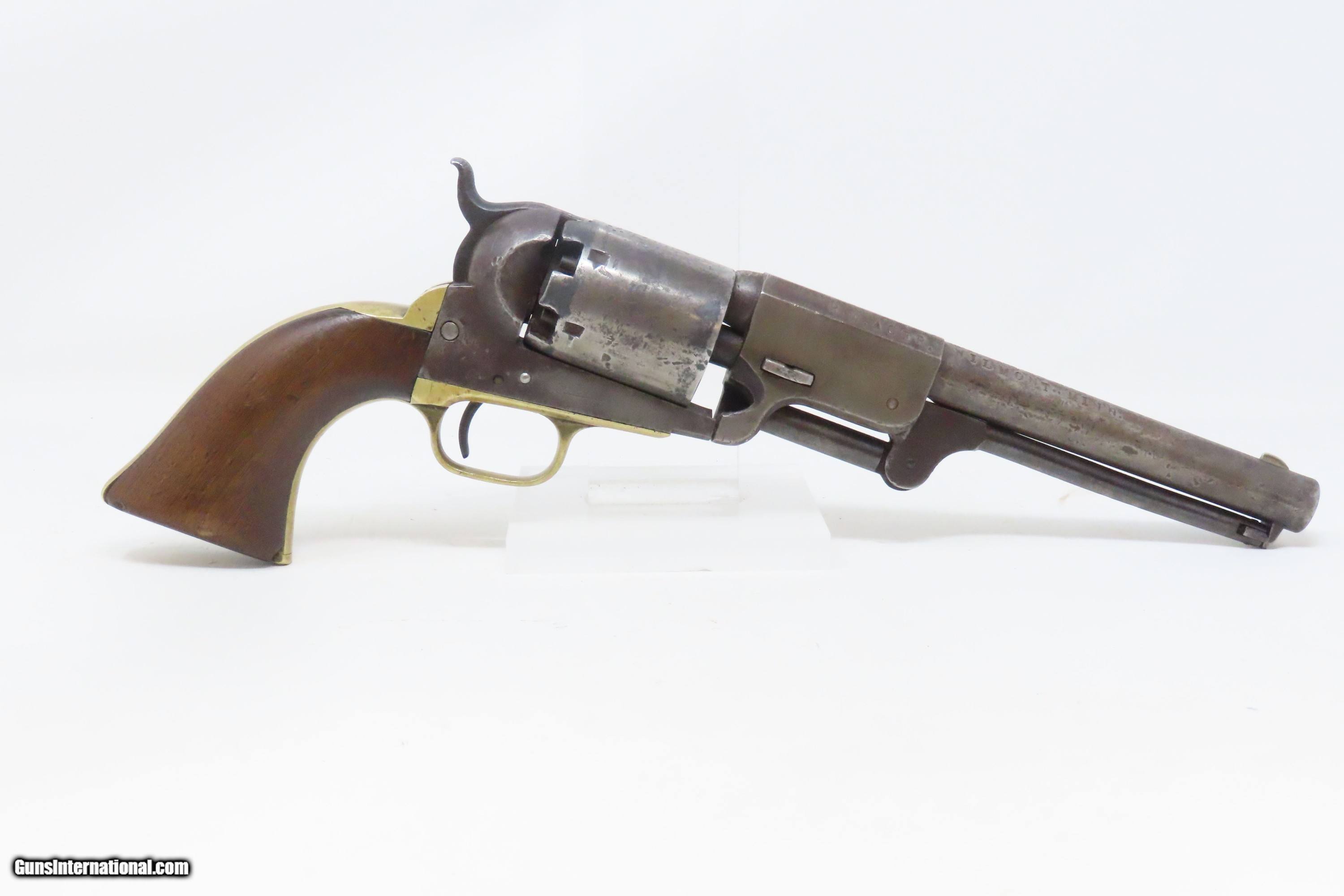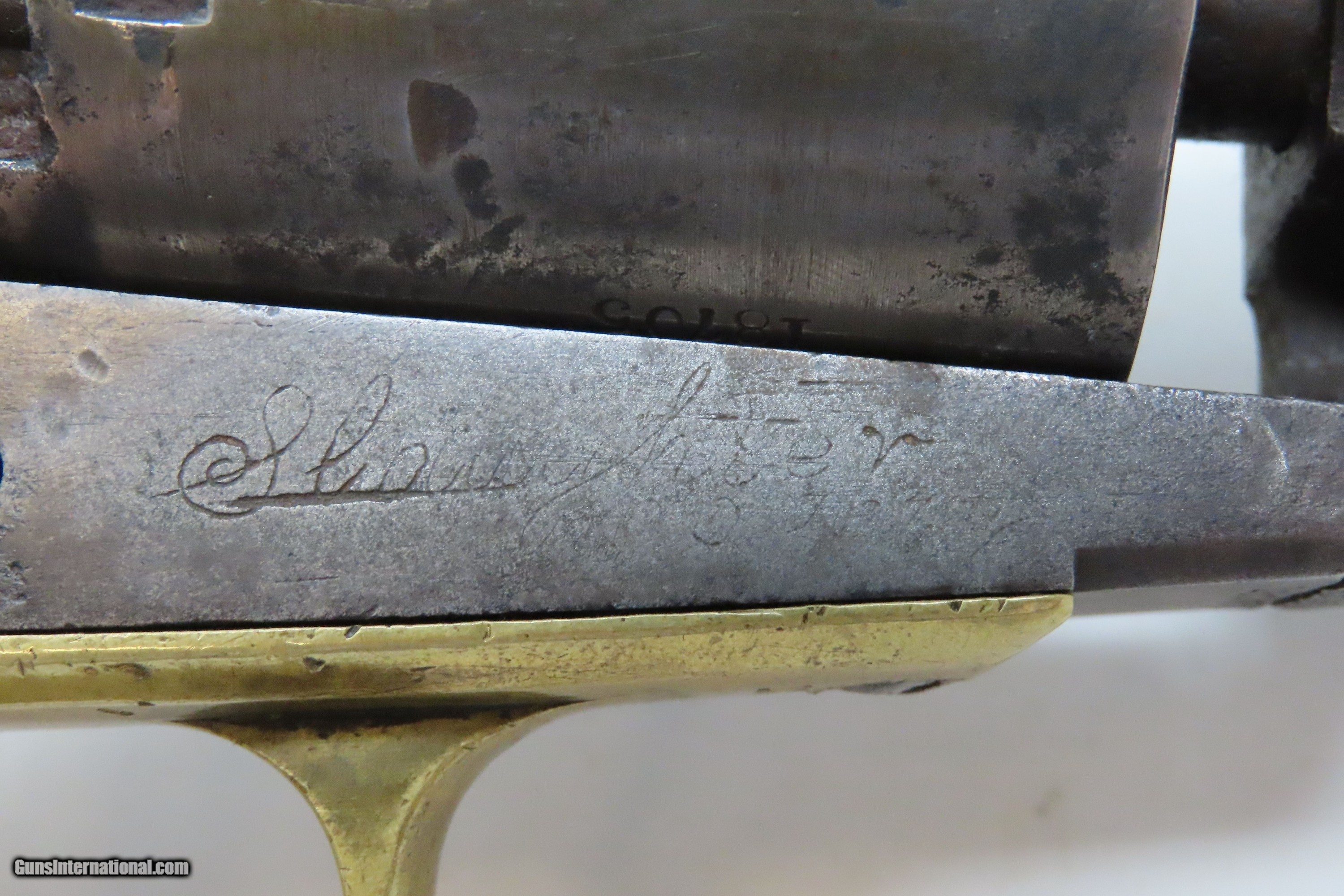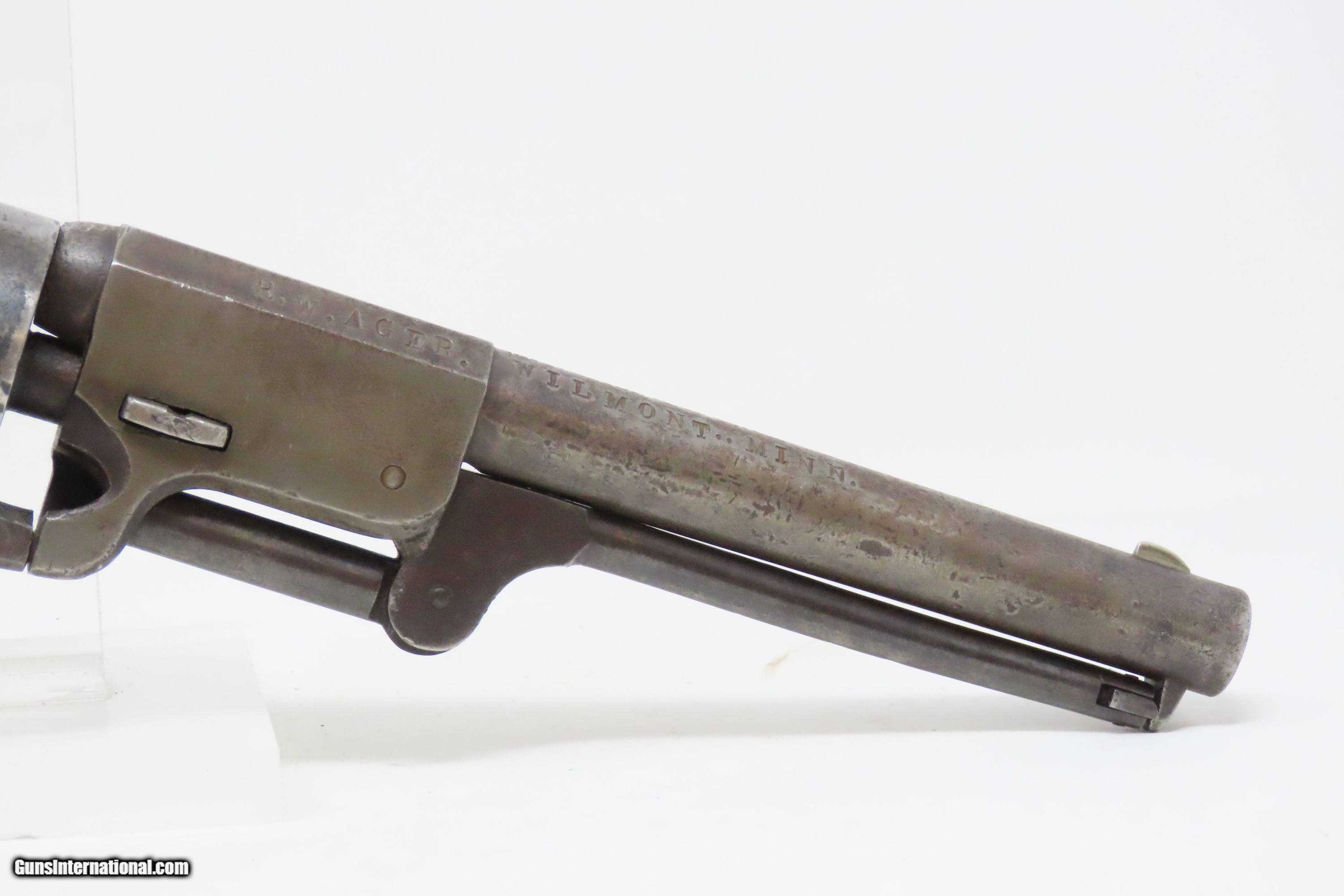 Description: KY 1st CAVALRY MEADE COUNTY Antique COLT DRAGOON .44 Revolver CIVIL WAR CSA 3rd Model Made in 1860 Here we present an antique Colt 3rd Model Dragoon, manufactured in 1860 in Hartford, Connecticut. Only 10,500 of this model were produced. The Third Model was first offered in 1851 and continued production through 1861, for a total of 10,500. The revolver is in .44 caliber and has a part round and part octagonal barrel. Colt’s Dragoons experienced some of the harshest conditions the mid-19th century had to offer, and it is amazing that any survived, in any condition. This pistol was designed for use by horse-mounted rifleman, and it is so much pistol that you will want a horse to carry it for you because of its significant weight. This one would have seen use during the American Civil War. This is a great opportunity to add one of Samuel Colt’s most recognized inventions to your collection, a Civil War era Colt Dragoon! This one has several names marked throughout. The bottom of the grip frame is inscribed with what appears to be the oldest: “G.L. NEAFUS”. George Louis Neafus was born in Meade County, Kentucky circa 1840. His father, George W. Neafus, was the captain of a steamer called the Tishomingo, which operated on the Ohio River stopping at Owensboro, Evansville, and Henderson and all points between. George L. would have been 21 years of age when the Civil War broke out. He enlisted as a Private and mustered into the Confederate Kentucky 1st Cavalry K Company on 1 November 1861. Kentucky was very much a divided state during the war, with loyalties torn between the Union and the Confederacy. According to a newspaper article in The Courier-Journal from 13 December 1862, he and others were homeward bound from Vicksburg, Mississippi, along with many of the Shacklett clan from the KY 1st, some of whom appear to have engaged in guerilla warfare in the area of Meade County. George would become a successful farmer after the war. His wife passed before him and at least one of his sons. At some point he moved to southwest Oklahoma where he continued farming. George Neafus passed away in December of 1925 at the age of 85 and it was lamented in the local paper that he and several other Civil War veterans were gone, both gray and blue. Of the other names, we could locate them to Nobles County, Minnesota, where Wilmont is, but as to how the revolver came to be in their possession remains a mystery. They seemed to have used it as a yearbook of sorts by adding their three names to it: Raymond William Ager, Adam W. Ager, and Tom Carey. Perhaps there is more to be discovered! The overall condition is very good. Gray patina throughout. The numbers match with the exception of the barrel wedge, which is not numbered. The action is excellent. The bore is in good condition: patinated with good rifling. The grip is solid. A very neat piece of history! Own the original! This is a legitimate antique and not a reproduction. Barrel is 8 inches. Caliber: .44 Percussion Overall condition as seen in photos. Very Fast. Very Safe. FREE SHIPPING WORLDWIDE. Delivered directly to your door by express mail! Guaranteed AUTHENTIC & Includes CERTIFICATE OF AUTHENTICITY. ancestryguns $7800 #233154 SOLD Antique: Yes |