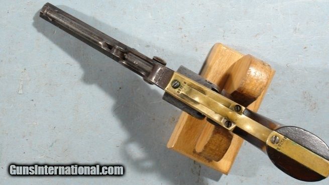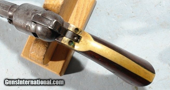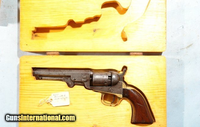 Description: ORIGINAL CIVIL WAR COLT MODEL 1849 POCKET REVOLVER. All original 5 shot .31 cal. with 5” barrel having the “COL SAML. COLT” one line New York address. All matching serial numbers in the 292,xxx range. Very good overall with the original patina and excellent markings including a mostly visible “STAGECOACH HOLDUP” cylinder scene. Excellent grips with most of the original varnish. Working order and good bore and chamber. Modern wood case but old tag that states it belonged to a Judge Gruenwell of Washington, D. C. Priced reasonably for an all original Colt Model 1849. SOLD Antique: Yes |
