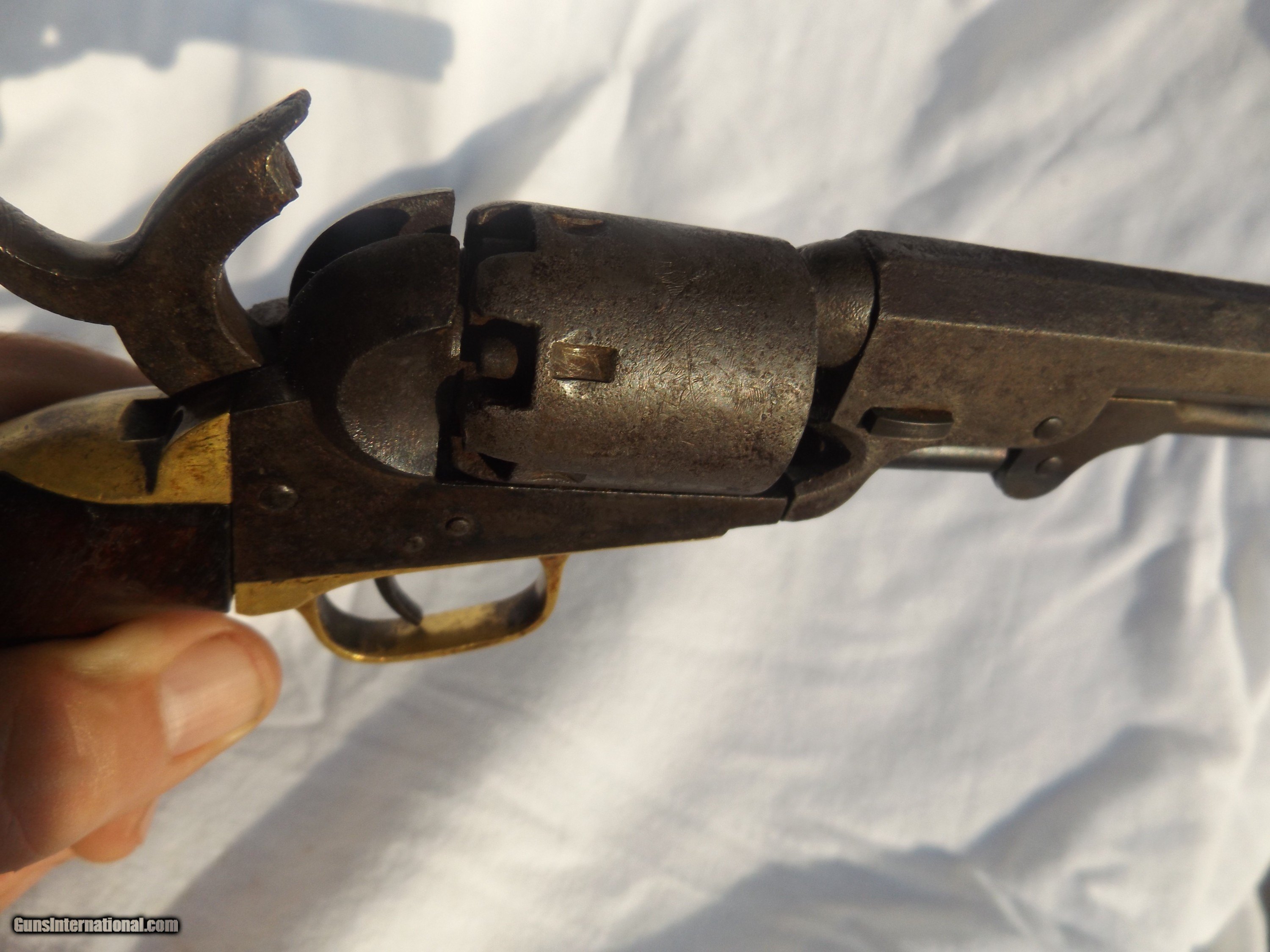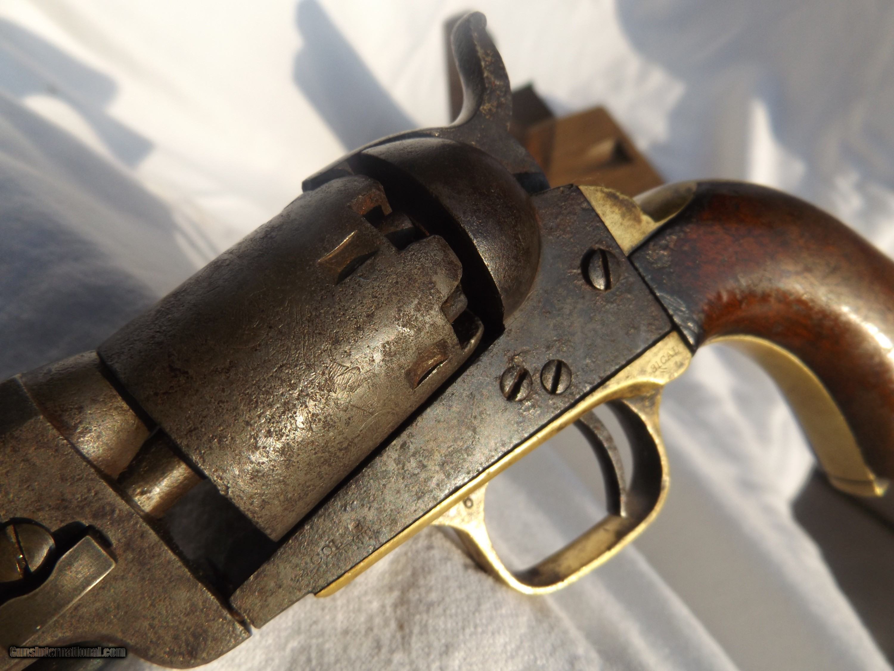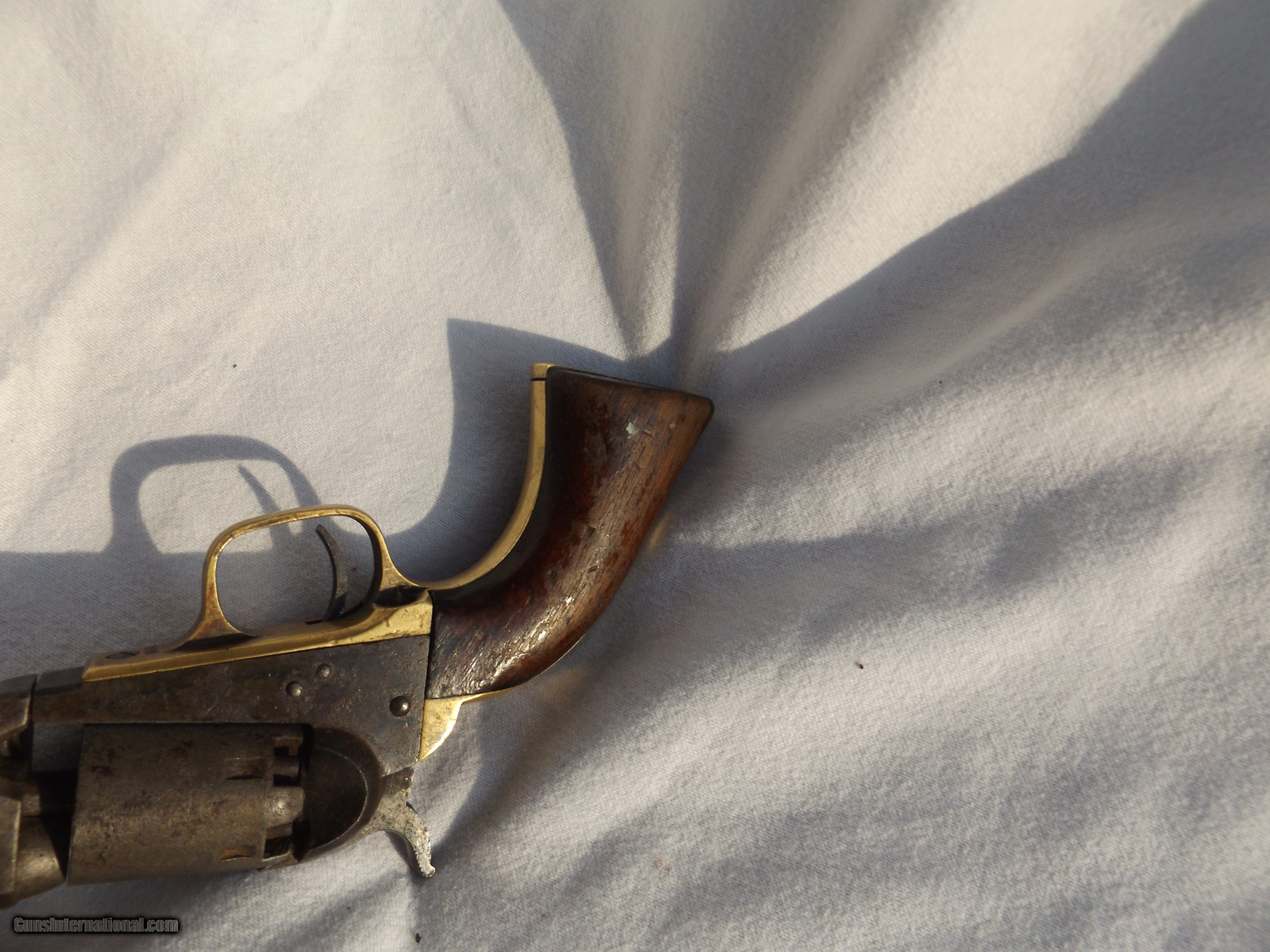 Description: This is an Original Colt 31 Cal. model 1849 Pocket Revolver. The Naval battle scene is only 10% visible. The serial number is 244764. It was made in 1863. These Colt revolvers were a Civilian weapon, small easy to conceal. But many were purchased by Civil War officers and Calvarymen as a Backup Gun. The Stagecoach scene is almost gone, but both Stagecoach wheels are easily seen. The matching serial number is clear. Other parts of the scene are there but weak. Shipping is $25.00 to the lower 48. AL, CA, HI, OR, WA, pay $35.00. I ship Priority Mail and it includes tracking and insurance. Money back if not satisfied, with the buyer paying the return shipping. SOLD Antique: Yes Handgun Caliber: .31 Manufacturer: Colt Model: 1849 Pocket Serial Number: 244764 Barrel Length: 6 inches Bore: Rifled Chambers: 6 Condition: Good+ Metal Condition: Some pitting Wood Condition: Chips and dings Bore Condition: Good Barrels: 1 Barrel Type: Octogon Action: Single Action Triggers: 1 Finish: Even Patina Sights: Fixed Engraving: Partial naval scene Item Location: Indiana |