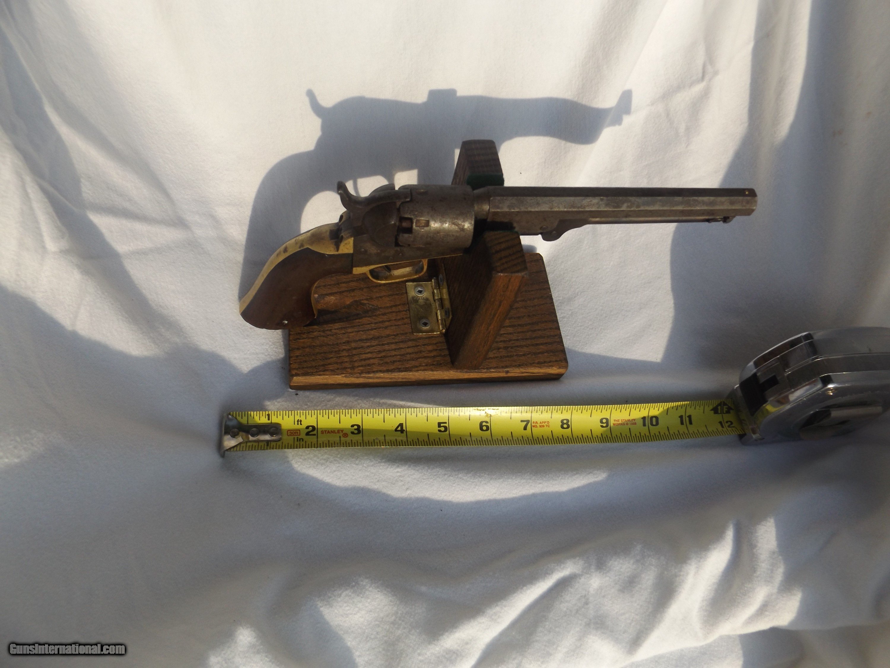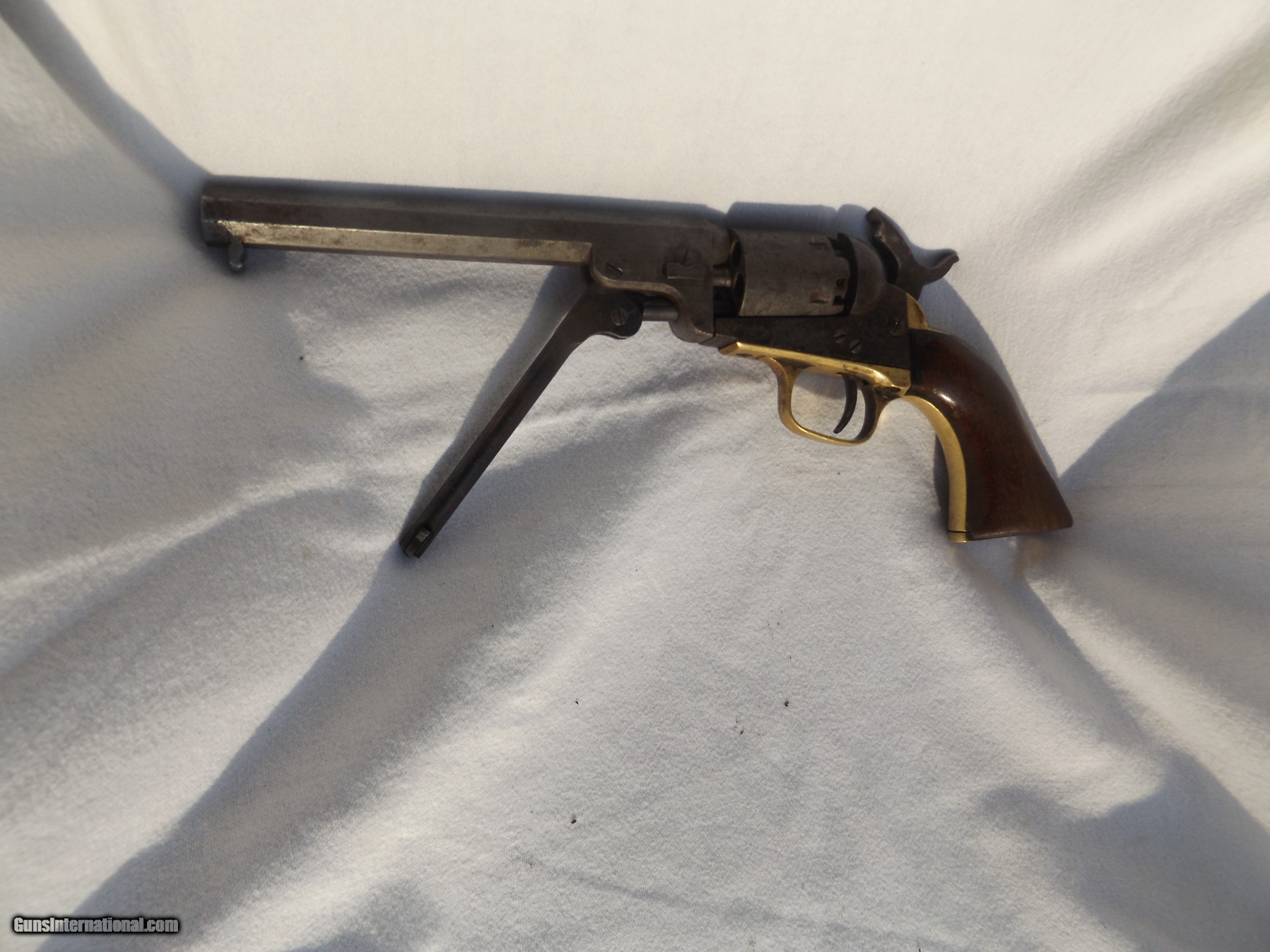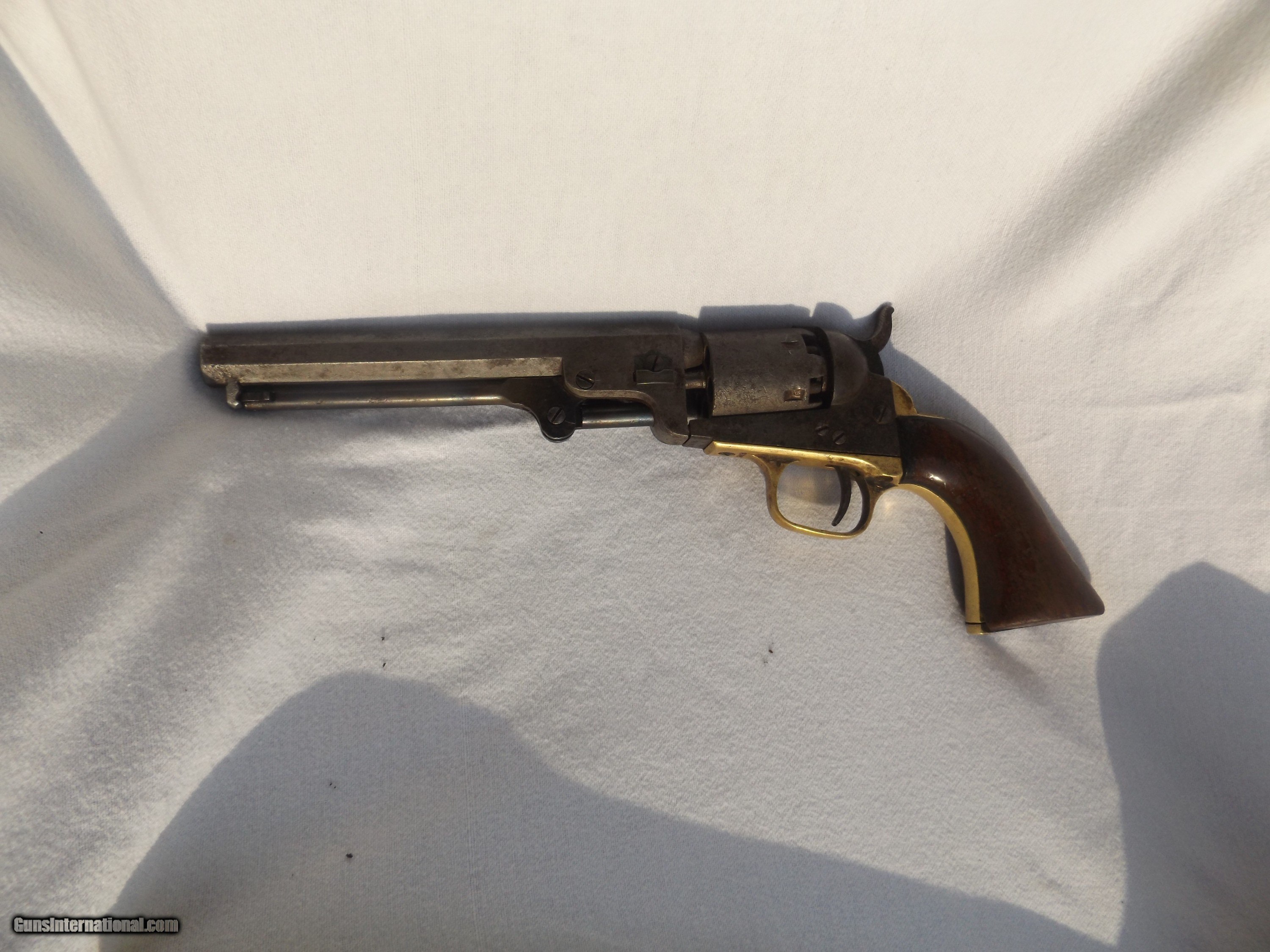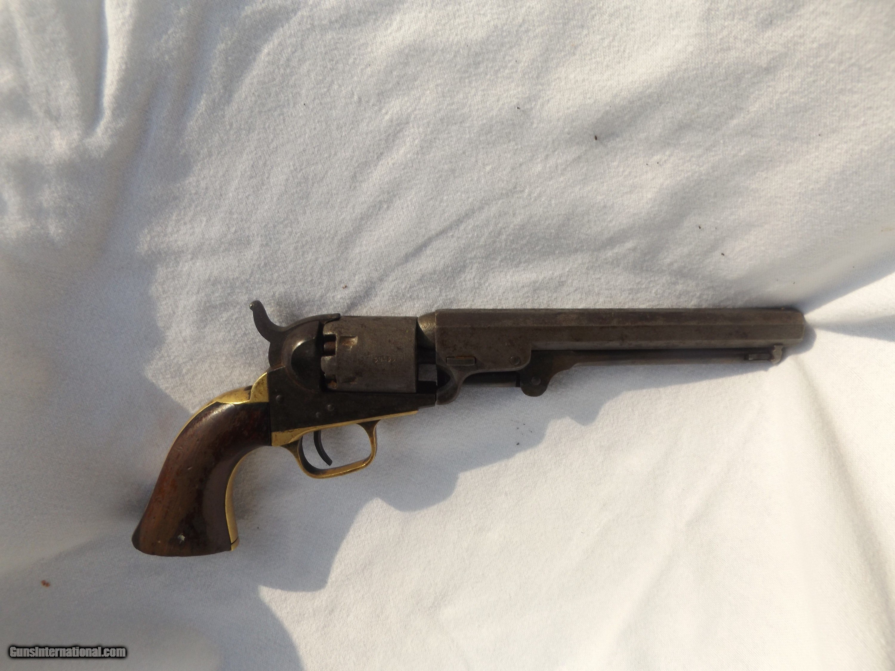 Description: This is an Original Colt 31 Cal. model 1849 Pocket Revolver. The Naval battle scene is only 10% visible. The serial number is 244764. It was made in 1863. These Colt revolvers were a Civilian weapon, small easy to conceal. But many were purchased by Civil War officers and Calvarymen as a Backup Gun. The Stagecoach scene is almost gone, but both Stagecoach wheels are easily seen. The matching serial number is clear. Other parts of the scene are there but weak. Shipping is $25.00 to the lower 48. AL, CA, HI, OR, WA, pay $35.00. I ship Priority Mail and it includes tracking and insurance. Money back if not satisfied, with the buyer paying the return shipping. SOLD Antique: Yes Handgun Caliber: .31 Manufacturer: Colt Model: 1849 Pocket Serial Number: 244764 Barrel Length: 6 inches Bore: Rifled Chambers: 6 Condition: Good+ Metal Condition: Some pitting Wood Condition: Chips and dings Bore Condition: Good Barrels: 1 Barrel Type: Octogon Action: Single Action Triggers: 1 Finish: Even Patina Sights: Fixed Engraving: Partial naval scene Item Location: Indiana |