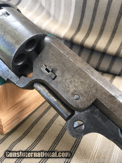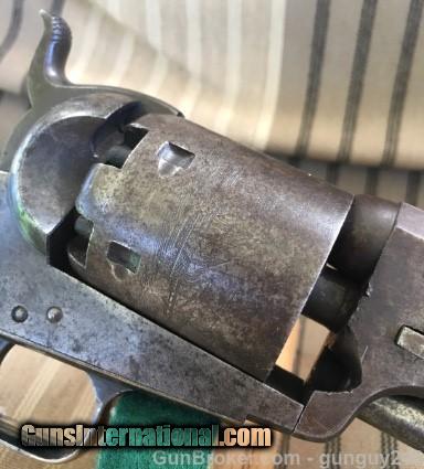 Description: This outstanding Colt Model 1851 Navy early 2nd Model in very fine condition. This Colt 2nd model has the scarce small square back trigger guard. Approx 75% silver is left. On the left side of the frame you will see the smaller "Colts Patent" mark. This Colt has approx 90% cylinder scene that is very visible, there is a bit of pitting in a small area that can be seen, that is the only issue with the entire finish of the Colt. The action works great with a tight lock up. The grips to have near 90% original Varnish. This Colt is covered with a beautiful untouched patina. Every serial number matches. Serial number#2,6**. Mfg in 1851 so this is a early 2nd year production 1851. Asking $5,250. Inventory #198 SOLD Antique: Yes Manufacturer: Colt Model: 1851 Caliber Info: 36 Condition: Fine Metal Condition: Fine Wood Condition: Fine Bore Condition: Good Action: Works great Manufacture Date: 1851 Item Location: Lompoc |