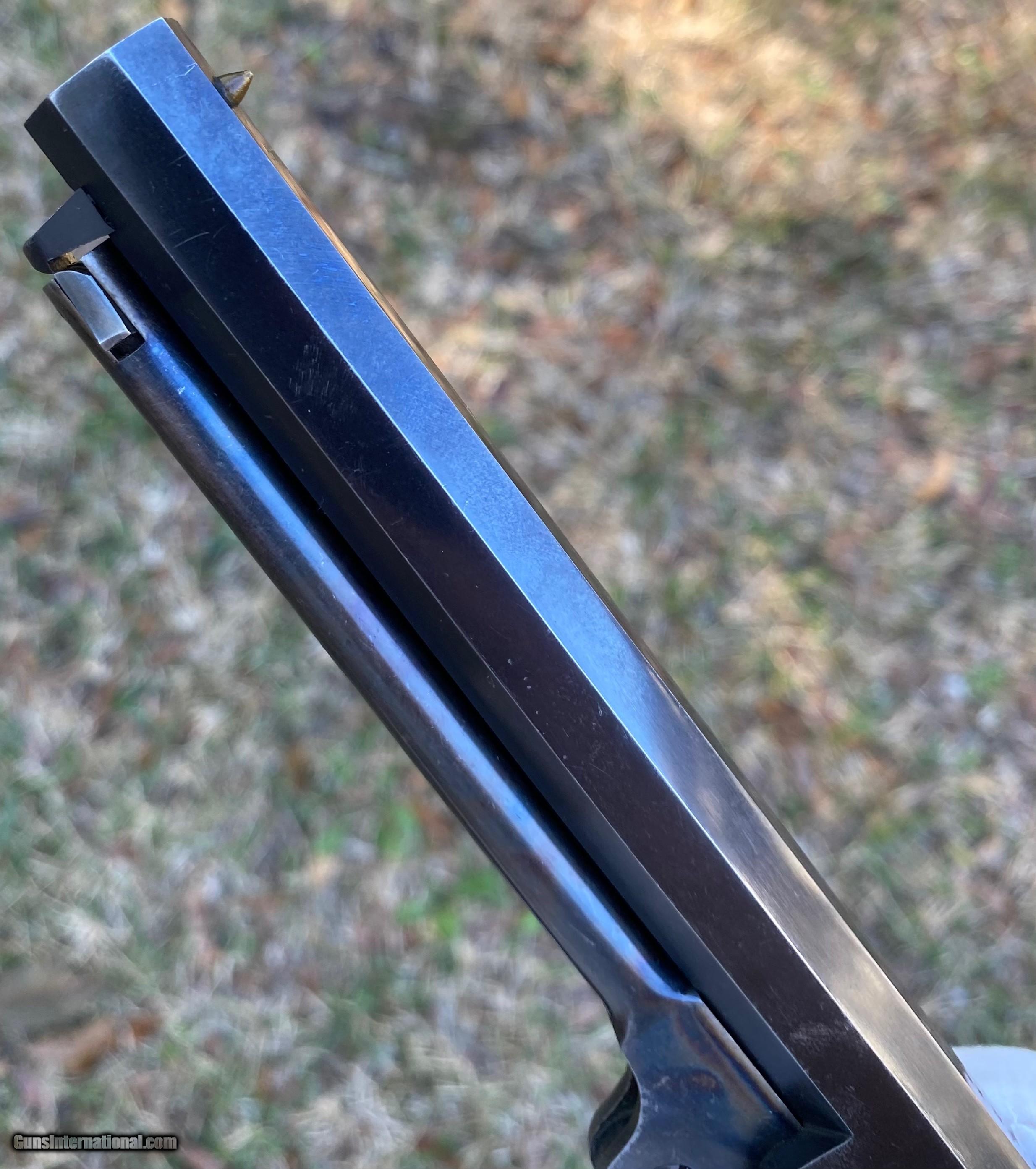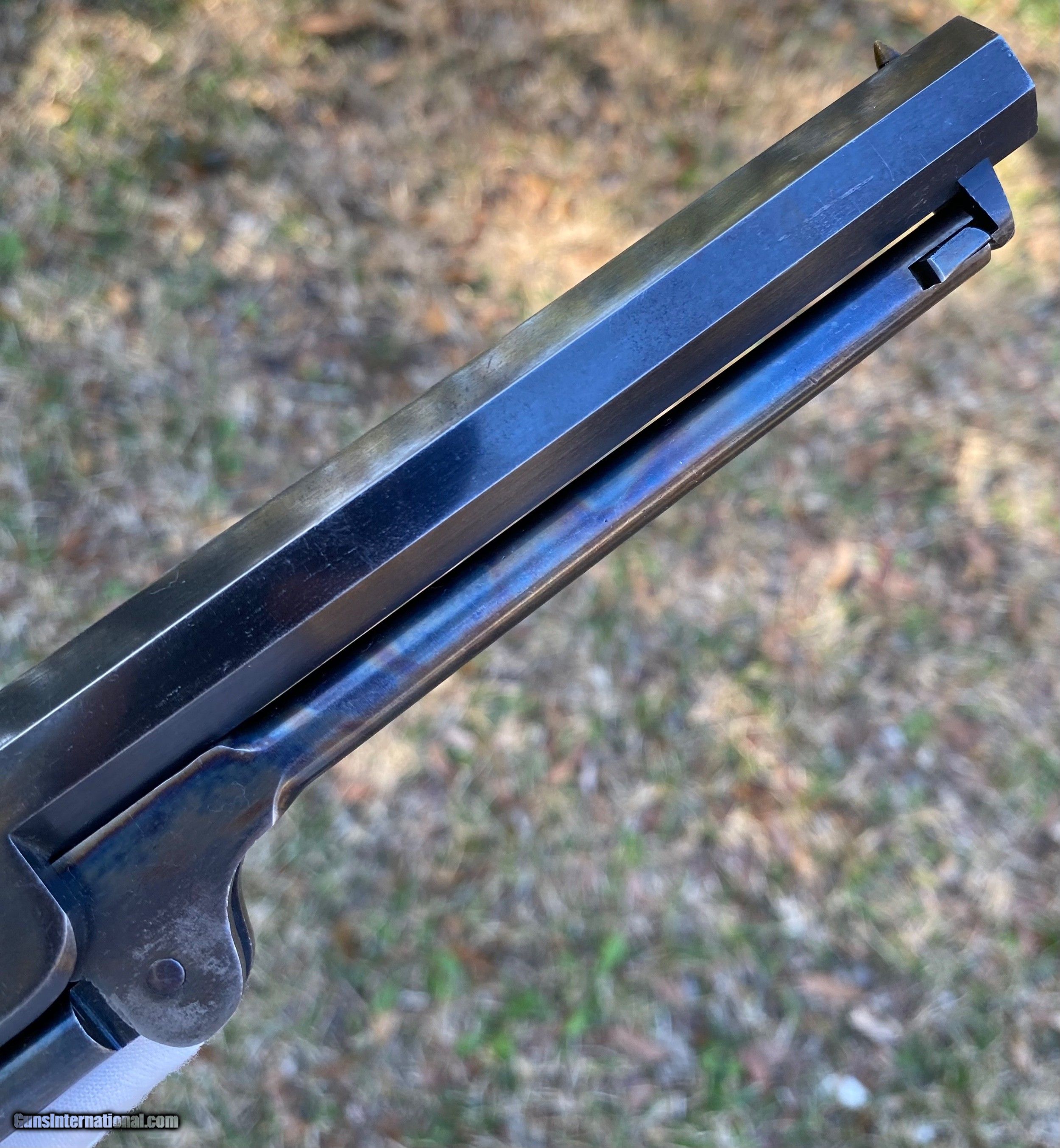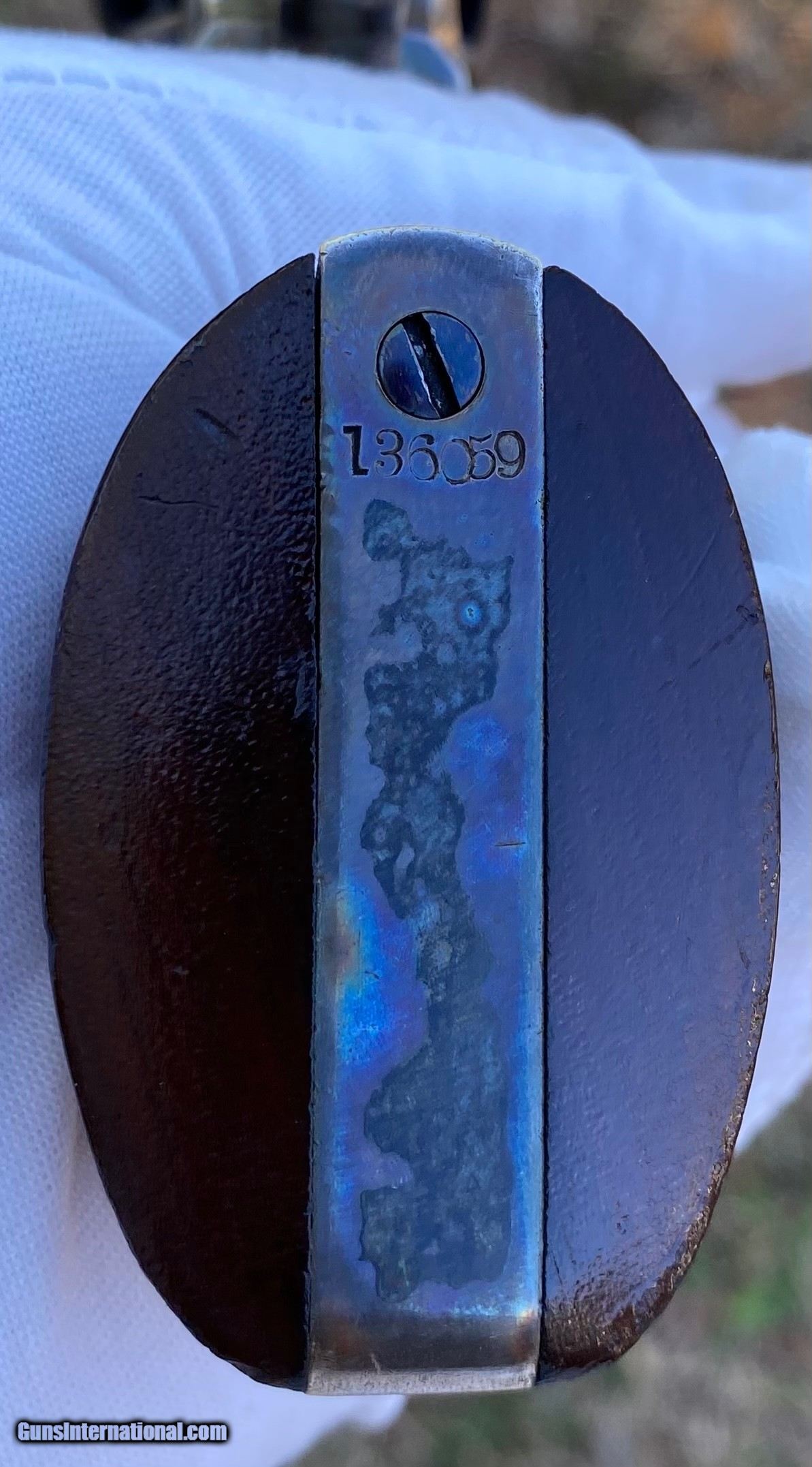 Description: This is truly an exceptional Colt 1851 Navy. The condition is as found exhibiting approximately 98% original deep blue on the barrel. The frame shows nearly all of the original vibrant color case hardening finish. The grip is mint. Virtually all of the silver remains on the backstrap and trigger guard. Now what makes this example so affordable is the cylinder showing about 75-80% of the original blue that has flaked off. There is a slight bit of abrasion showing near the serial number stamping on the cylinder. An example almost identical to this condition except for having a better cylinder sold recently for $92,000. The only difference between the two in condition were the cylinders. This is a top-tier example that if your looking for a high condition nearly new example and don’t want to pay for the extra 3-4% total finish this is as good as you are going to find. Excellent investment and collector grade firearm! Asking: $15,000.00 SOLD Antique: Yes |