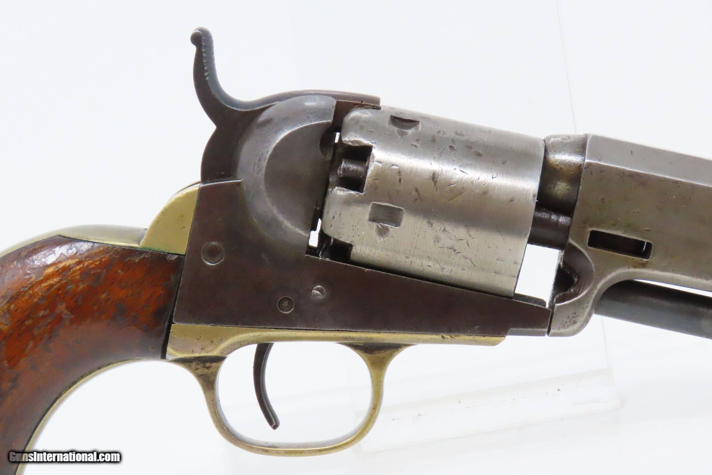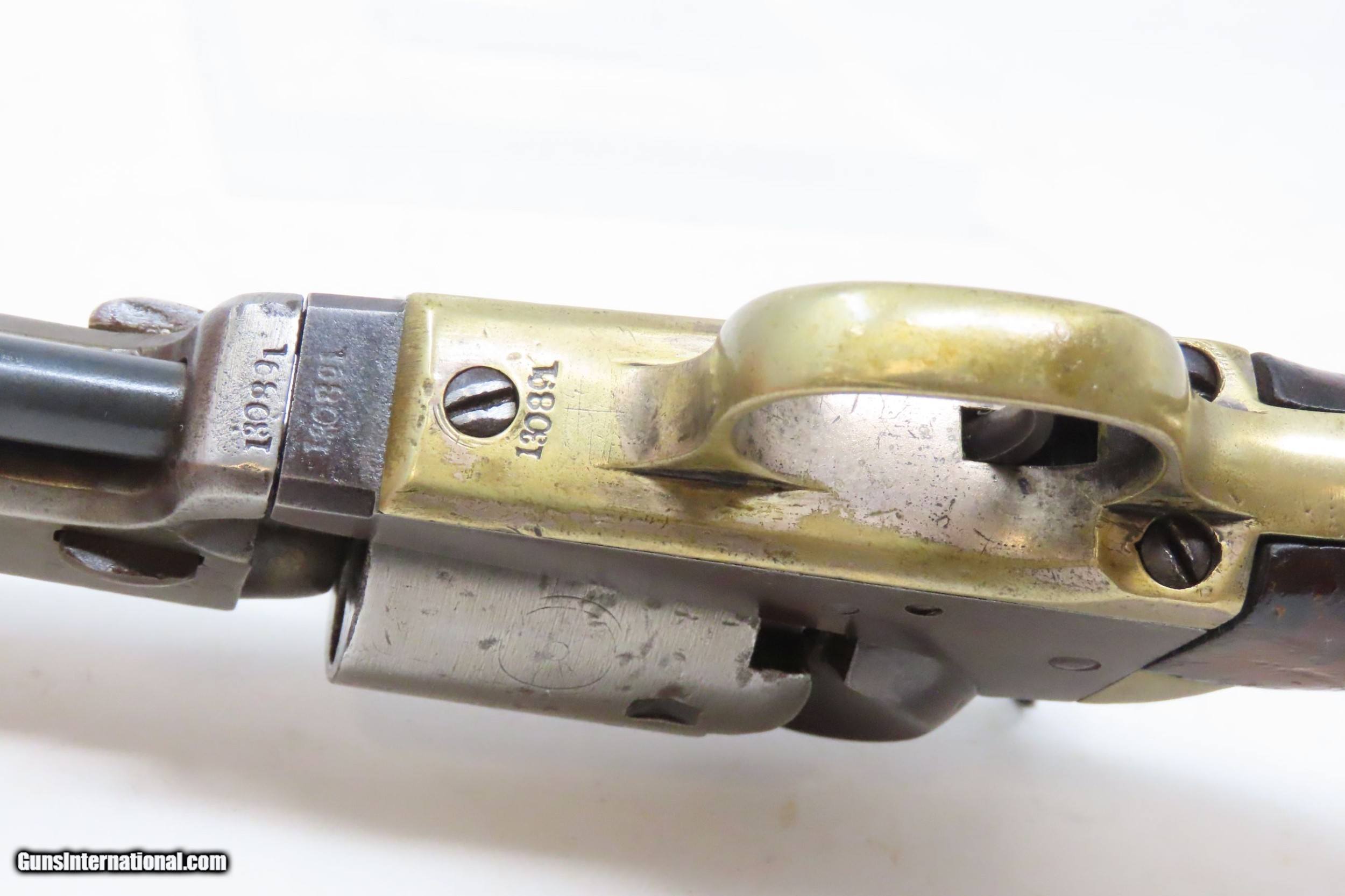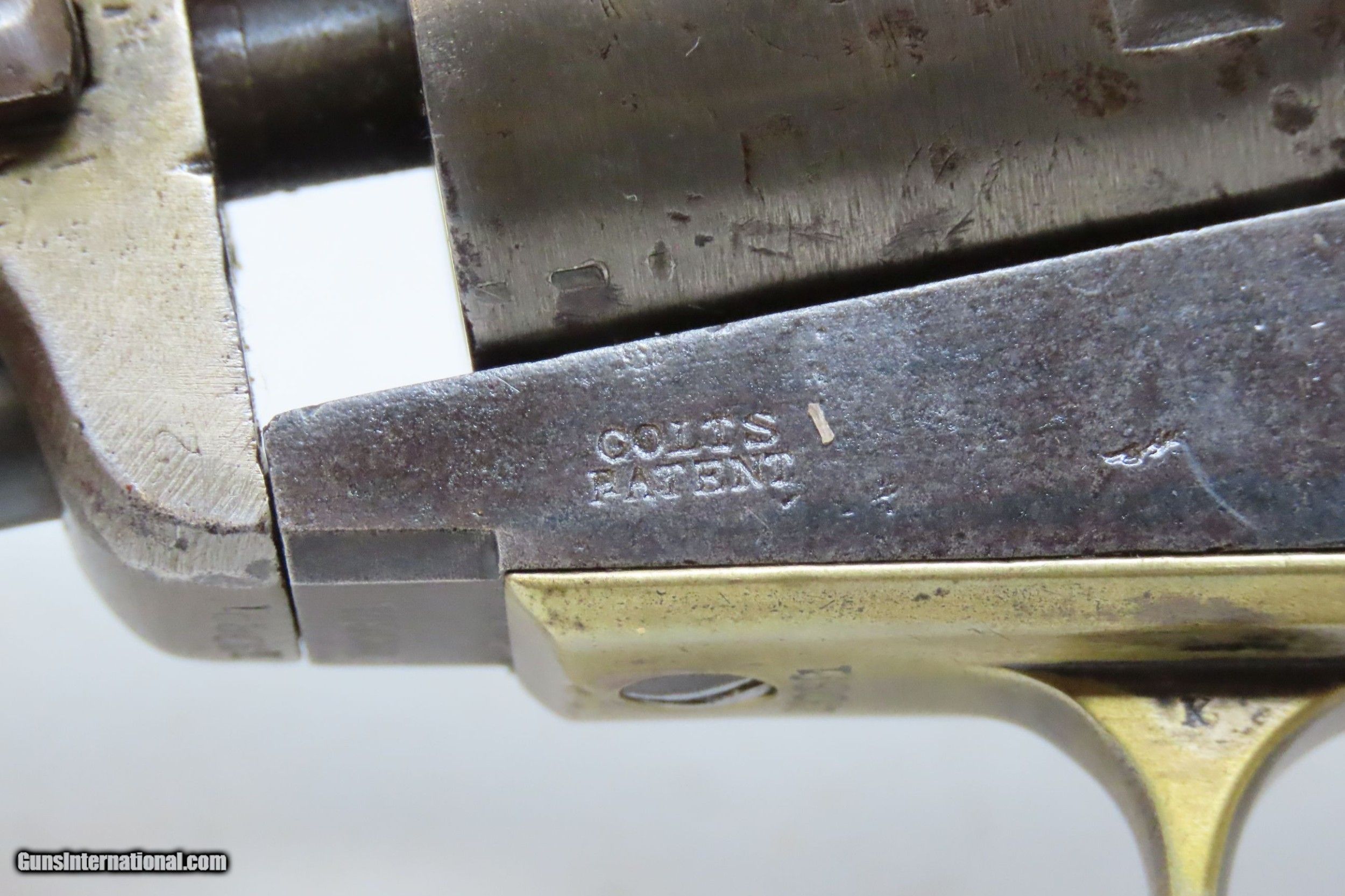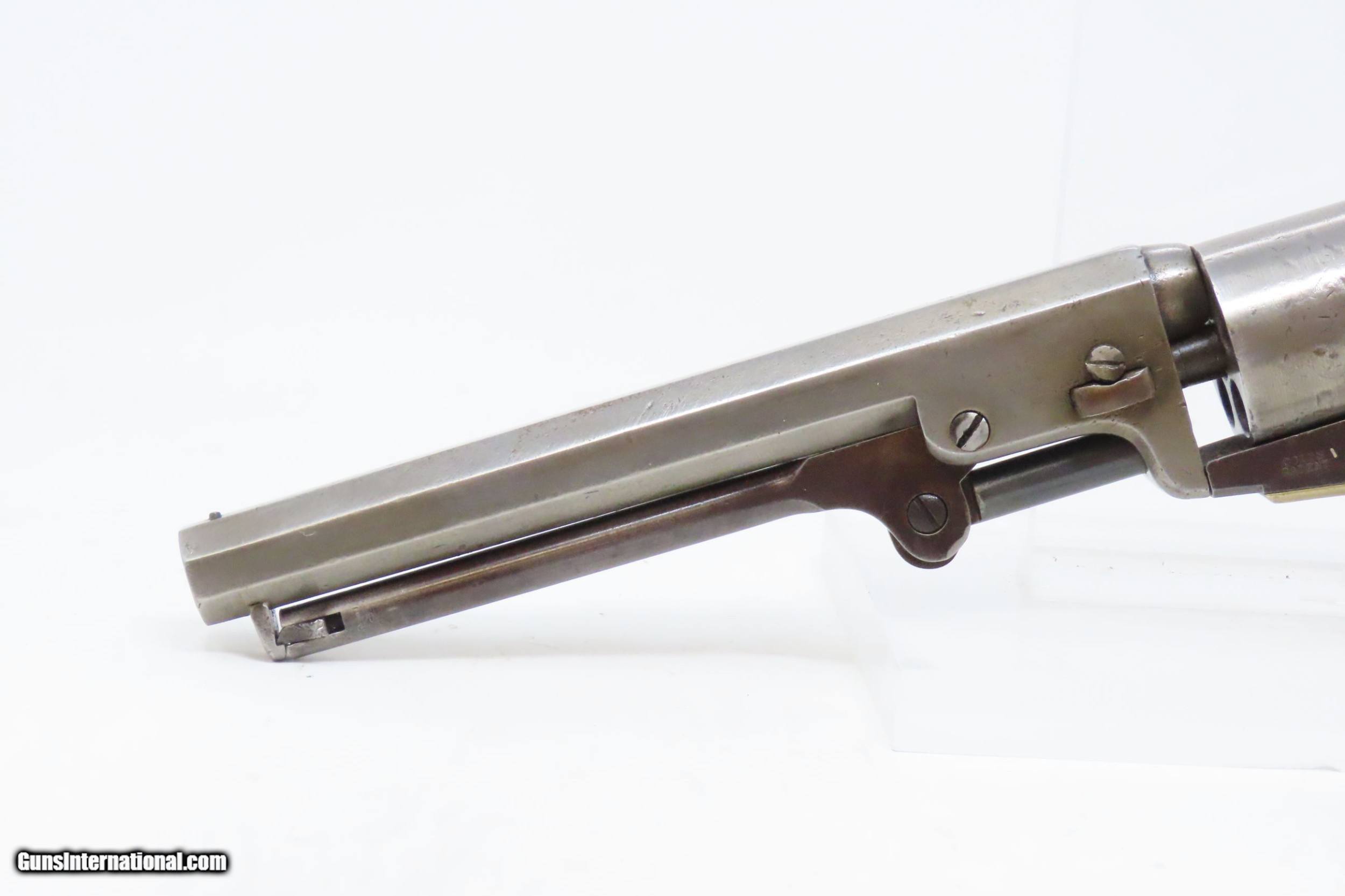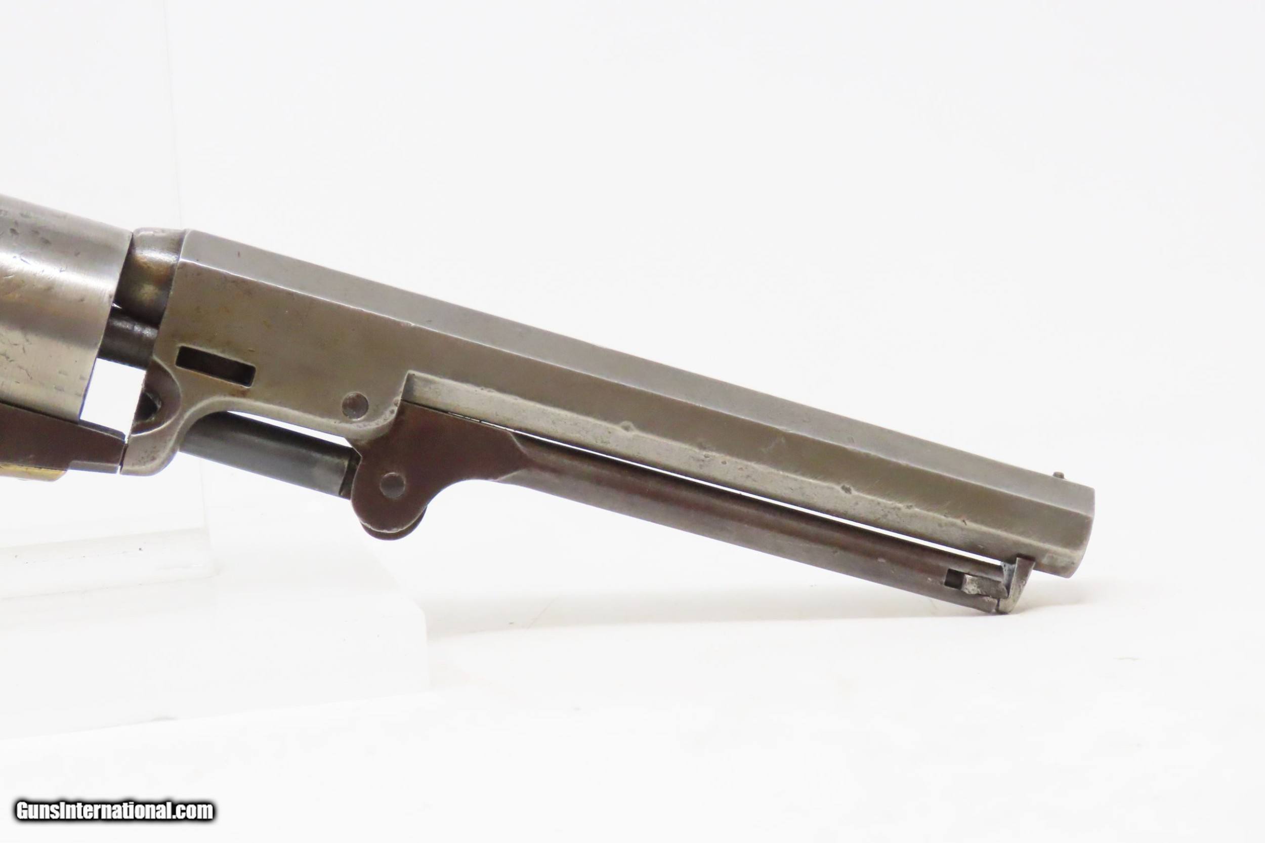 Description: Pre-CIVIL WAR Antique COLT Model 1849 POCKET .31 Cal. PERCUSSION Revolver HARTFORD, CONNECTICUT Manufactured in 1857 Here we present an antique percussion Colt Model 1849 Pocket Revolver, made in 1857 in Hartford, Connecticut. The Model 1849 Pocket, the replacement for the Baby Dragoon, was the most widely produced of any Colt percussion pistol. Nearly 340,000 were manufactured during its 23-year production run that ended in 1873. Over 280,000 of these were produced by Colt’s factory at Hartford by the end of the American Civil War in 1865. These were very popular and saw a lot of use on the battlefield, on the home front and in the West. These were some of the smallest, handiest pocket revolvers of the time. One of the most aesthetically pleasing aspects of the 1849 Pocket is its cylinder scene. Cylinder scenes during this period were common, especially for Colt, not only for their visual appeal, but because it made a revolver more difficult to forge. The scene on the 1849 Pocket is that of a stagecoach robbery. The focal point is the stagecoach drawn by four horses. A woman in a dress is seen framed in the doorway of the side of the coach. The driver is standing alongside wielding his pistol against multiple assailants as the horses rear and struggle against their harnesses. Several of the bandits lay dying on the ground, one tries to control the horses, two are running away and one is in the process of falling dead after being shot. Not a bad way to show interested buyers what a pistol like this would be good for. It did a fine job as a self-defense handgun for the average citizen in 19th Century America. The overall condition is good. The cylinder and barrel have been polished. The action is strong. The bore is in good shape with strong rifling. The numbers match. The grip is solid. Own the original! This is a legitimate antique and not a reproduction. Barrel is 6 inches. Caliber: .31 Percussion Overall condition as seen in photos. Very Fast. Very Safe. FREE SHIPPING WORLDWIDE. Delivered directly to your door by express mail! Guaranteed AUTHENTIC & Includes CERTIFICATE OF AUTHENTICITY. ancestryguns $1400 #220555 SOLD Antique: Yes |