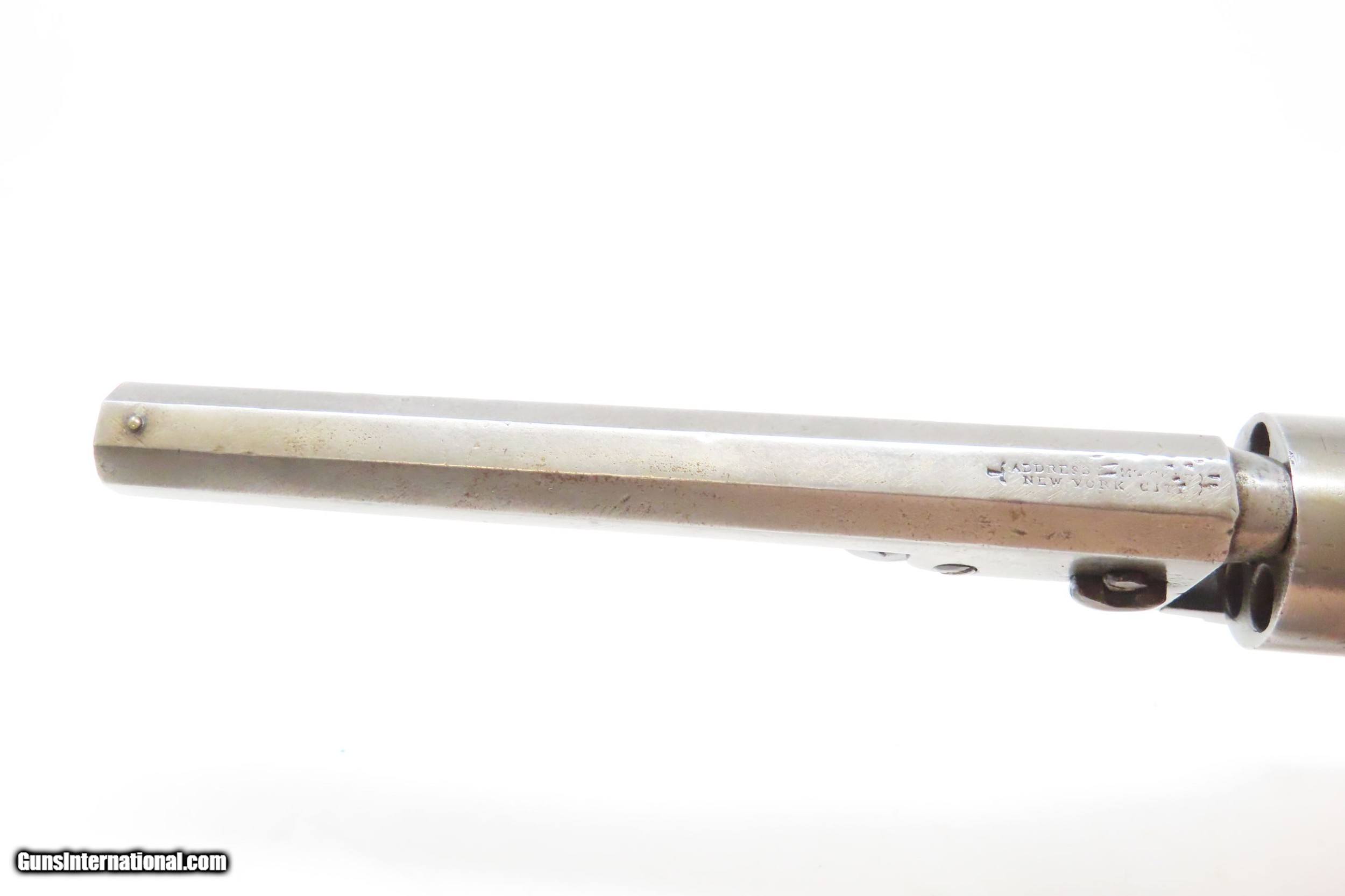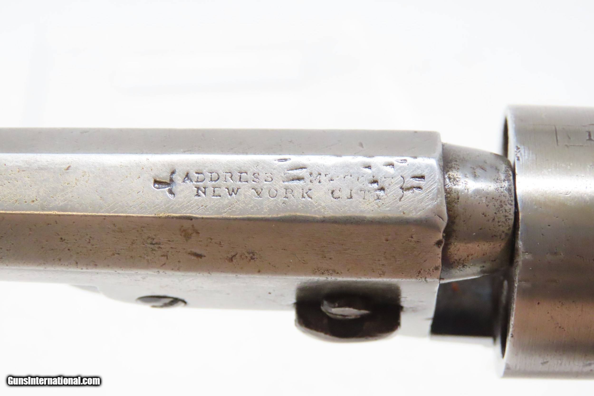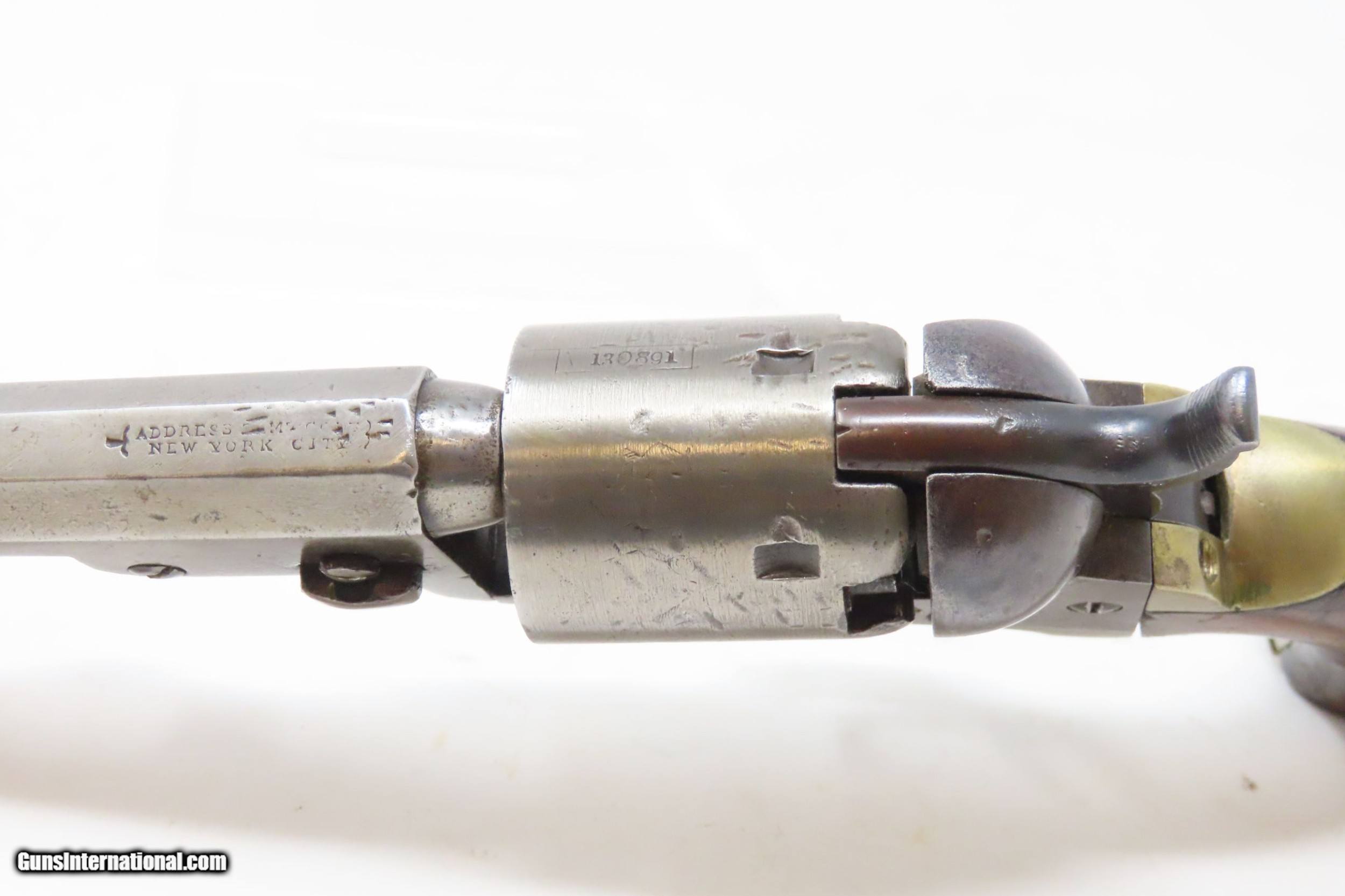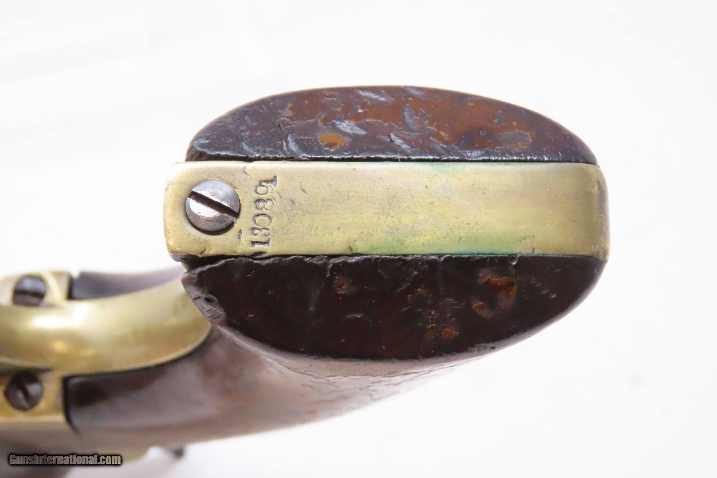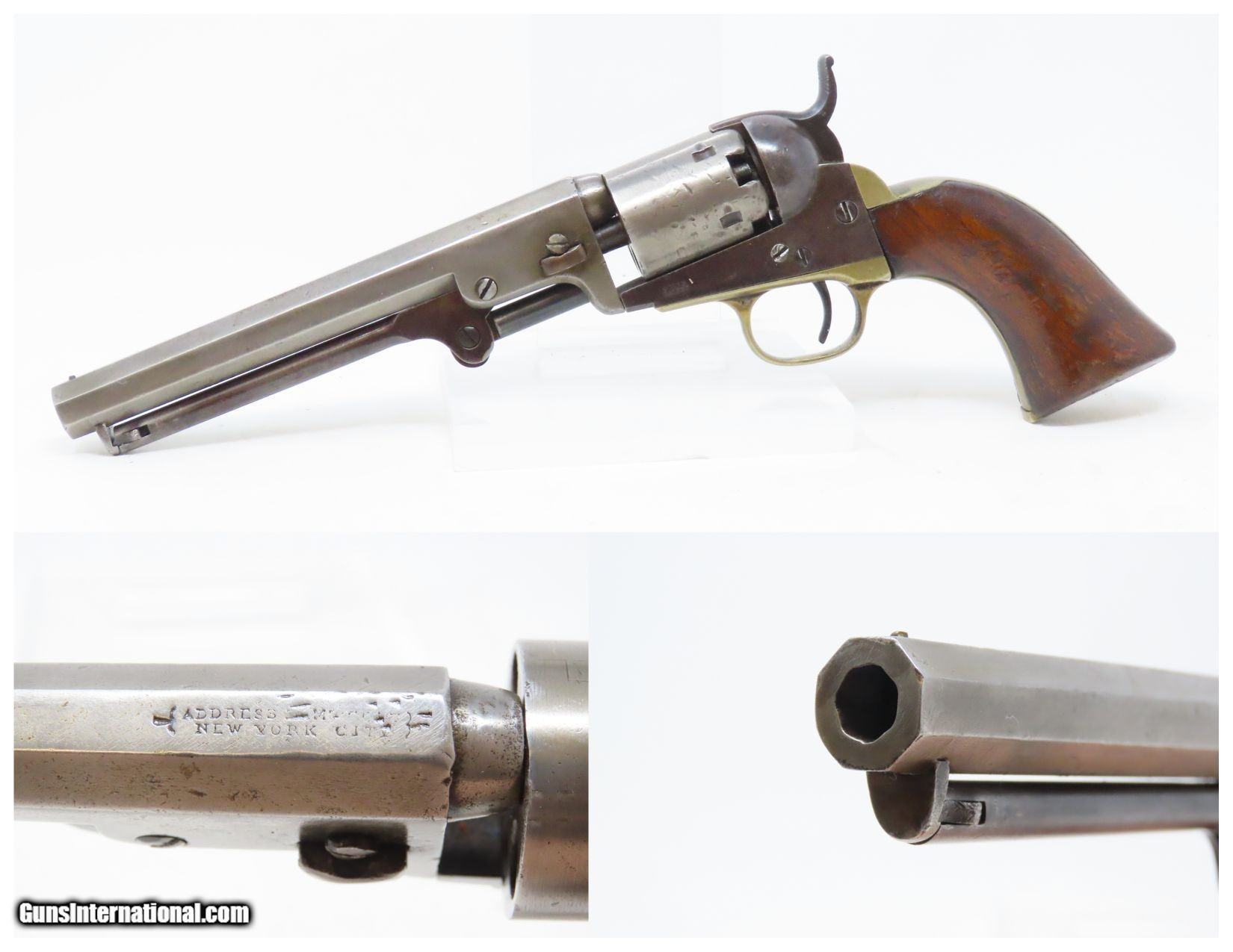 Description: Pre-CIVIL WAR Antique COLT Model 1849 POCKET .31 Cal. PERCUSSION Revolver HARTFORD, CONNECTICUT Manufactured in 1857 Here we present an antique percussion Colt Model 1849 Pocket Revolver, made in 1857 in Hartford, Connecticut. The Model 1849 Pocket, the replacement for the Baby Dragoon, was the most widely produced of any Colt percussion pistol. Nearly 340,000 were manufactured during its 23-year production run that ended in 1873. Over 280,000 of these were produced by Colt’s factory at Hartford by the end of the American Civil War in 1865. These were very popular and saw a lot of use on the battlefield, on the home front and in the West. These were some of the smallest, handiest pocket revolvers of the time. One of the most aesthetically pleasing aspects of the 1849 Pocket is its cylinder scene. Cylinder scenes during this period were common, especially for Colt, not only for their visual appeal, but because it made a revolver more difficult to forge. The scene on the 1849 Pocket is that of a stagecoach robbery. The focal point is the stagecoach drawn by four horses. A woman in a dress is seen framed in the doorway of the side of the coach. The driver is standing alongside wielding his pistol against multiple assailants as the horses rear and struggle against their harnesses. Several of the bandits lay dying on the ground, one tries to control the horses, two are running away and one is in the process of falling dead after being shot. Not a bad way to show interested buyers what a pistol like this would be good for. It did a fine job as a self-defense handgun for the average citizen in 19th Century America. The overall condition is good. The cylinder and barrel have been polished. The action is strong. The bore is in good shape with strong rifling. The numbers match. The grip is solid. Own the original! This is a legitimate antique and not a reproduction. Barrel is 6 inches. Caliber: .31 Percussion Overall condition as seen in photos. Very Fast. Very Safe. FREE SHIPPING WORLDWIDE. Delivered directly to your door by express mail! Guaranteed AUTHENTIC & Includes CERTIFICATE OF AUTHENTICITY. ancestryguns $1400 #220555 SOLD Antique: Yes |