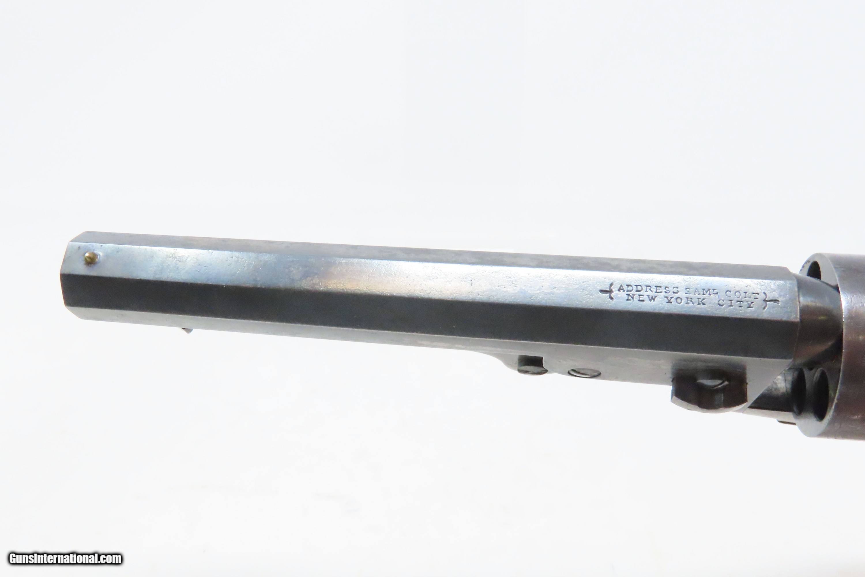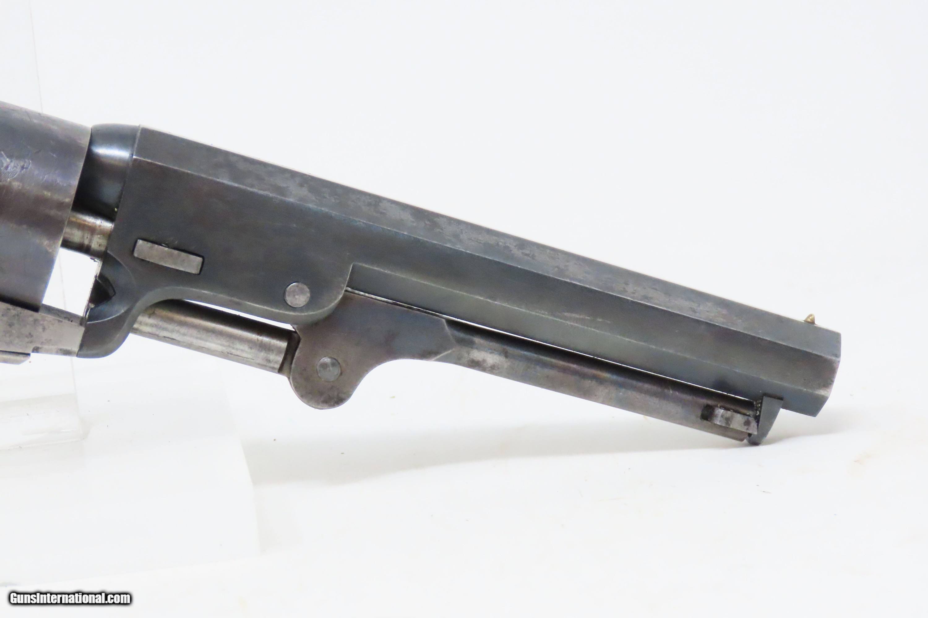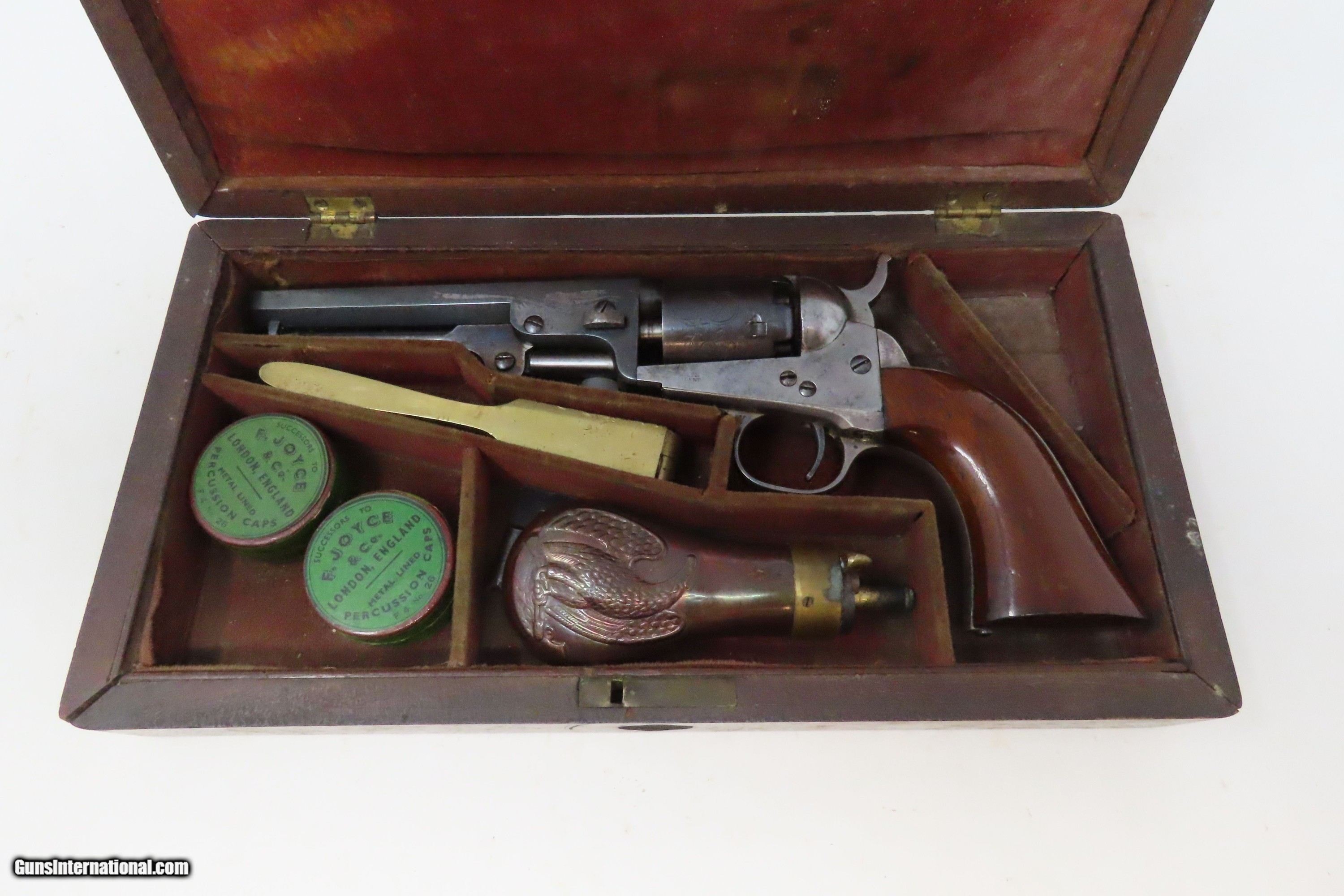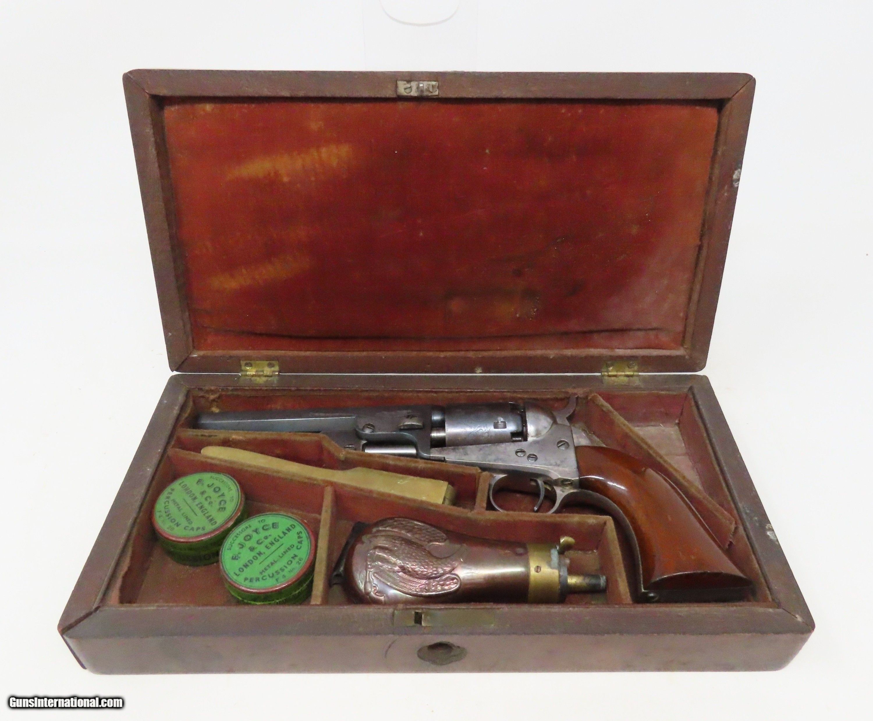 Description: Pre-CIVIL WAR Cased Antique COLT Model 1849 POCKET w Robbery Cylinder Scene Inscribed to “JAs MERCER” on the Frame Here we present an antique Cased Colt Model 1849 Pocket Revolver, Inscribed to James Mercer, made just three years before the start of the Civil War in 1858 in Hartford, Connecticut. There were 40 Union soldiers by this name and 28 Confederates. The Model 1849 Pocket, the replacement for the Baby Dragoon, was the most widely produced of any Colt percussion pistol. Nearly 340,000 were manufactured during its 23-year production run that ended in 1873. Over 280,000 of these were produced by Colt’s factory at Hartford by the end of the American Civil War in 1865. These were very popular and saw a lot of use on the battlefield, on the home front and in the West. These were some of the smallest, handiest pocket revolvers of the time. One of the most aesthetically pleasing aspects of the 1849 Pocket is its cylinder scene. Cylinder scenes during this period were common, especially for Colt, not only for their visual appeal, but because it made a revolver more difficult to forge. The scene on the cylinder of the 1849 Pocket is that of a stagecoach robbery. The focal point is the stagecoach drawn by four horses. A woman in a dress is seen framed in the doorway of the side of the coach. The driver is standing alongside wielding his pistol against multiple assailants as the horses rear and struggle against their harnesses. Several of the bandits lay dying on the ground, one tries to control the horses, two are running away and one is in the process of falling dead after being shot. Not a bad way to show interested buyers what a pistol like this would be good for. It did a fine job as a self-defense handgun for the average citizen in 19th Century America. Though not a primary military arm during the American Civil War, these handguns were commonly privately purchased by soldiers for use on the battlefield. Whether legend or fact, it is interesting to note something commonly read about pocket revolvers of the day, that while they could be used for self-defense against the enemy, many soldiers kept them on their person to defend themselves against an unwanted amputation in the primitive field hospitals that were notorious, even in their day. The overall condition is fine. Original blue and silver finish. The stagecoach robbery cylinder scene remains clear. The action is excellent. The bore is fine, bright with sharp rifling. The grip is solid. Numbers match. The case is a bit delicate as there is a crack on the bottom from one side to another. Contains a bullet mold, powder flask, nipple wrench and two cap tins. Own the original! This is a legitimate antique and not a reproduction. Barrel is 5 inches. Caliber: .31 Percussion Overall condition as seen in photos. Very Fast. Very Safe. FREE SHIPPING WORLDWIDE. Delivered directly to your door by express mail! Guaranteed AUTHENTIC & Includes CERTIFICATE OF AUTHENTICITY. ancestryguns $4500 #240019 SOLD Antique: Yes |