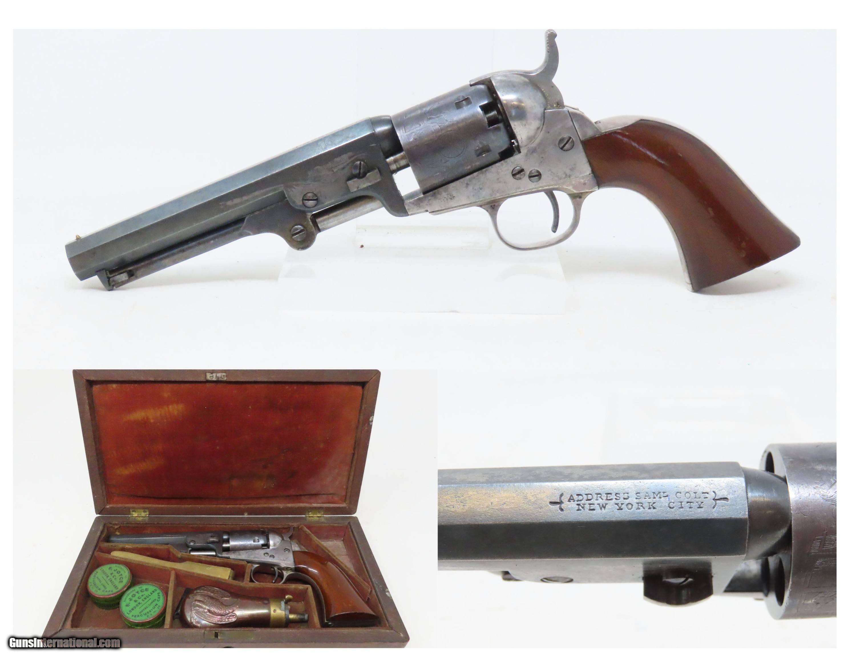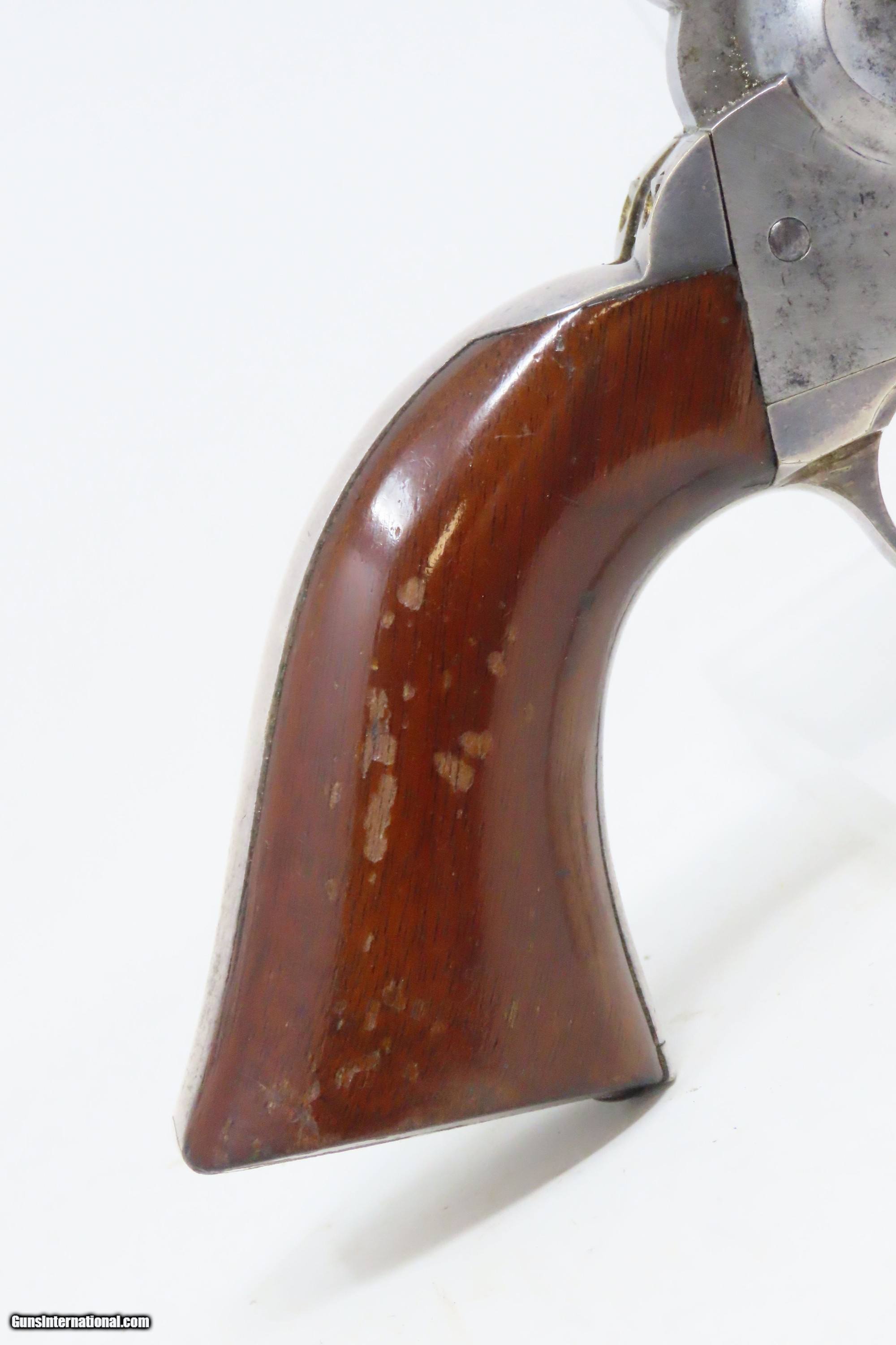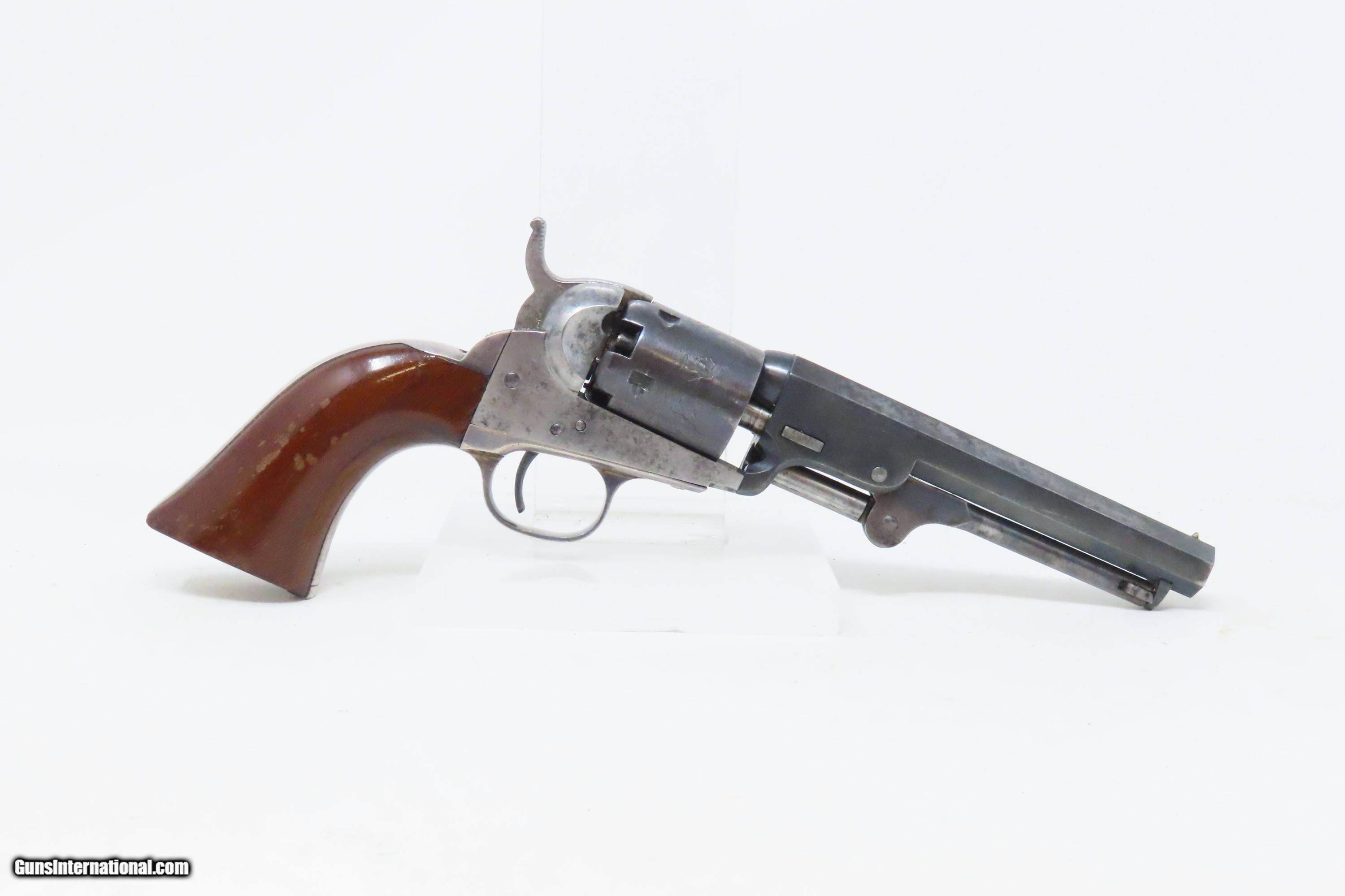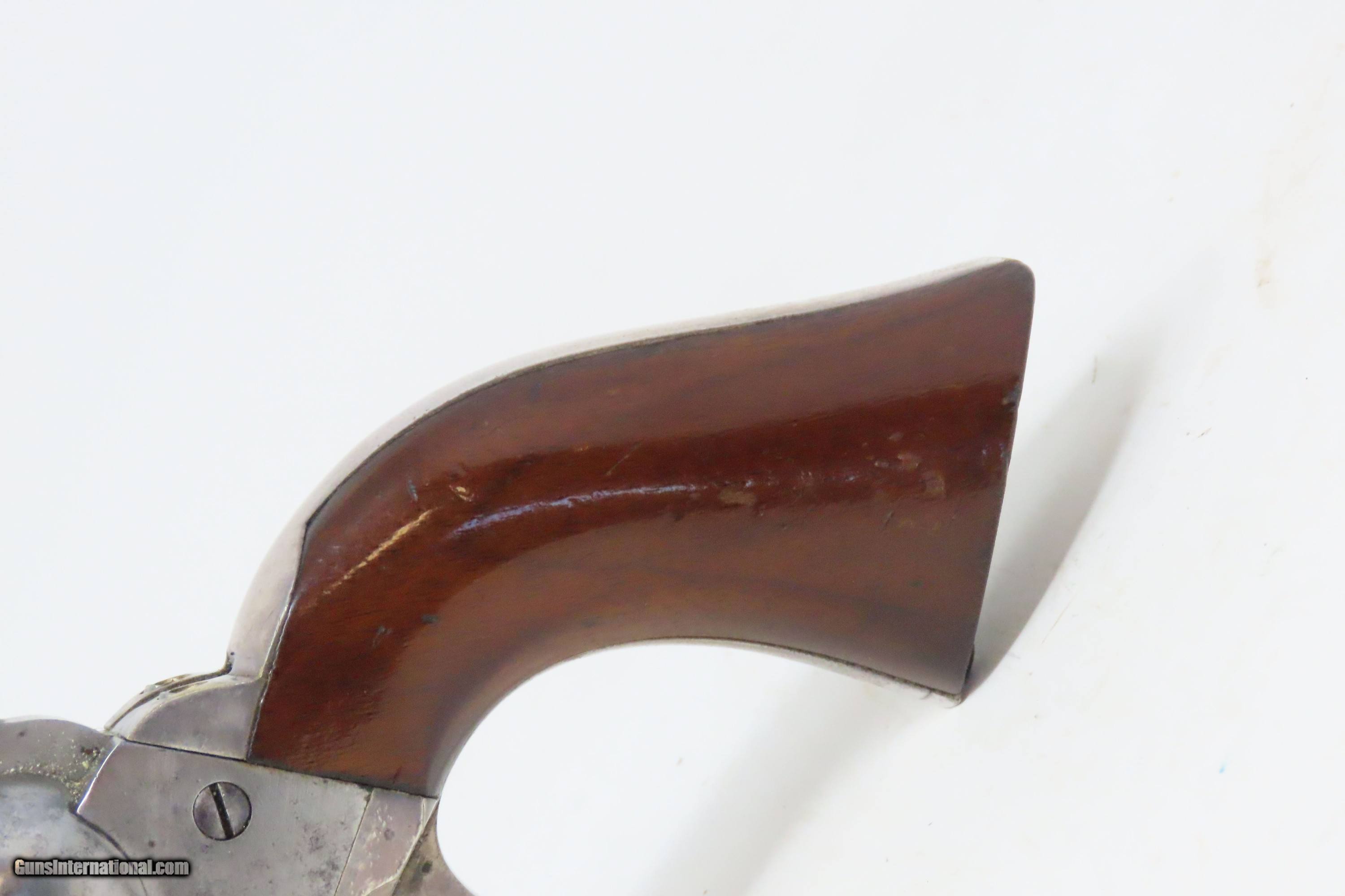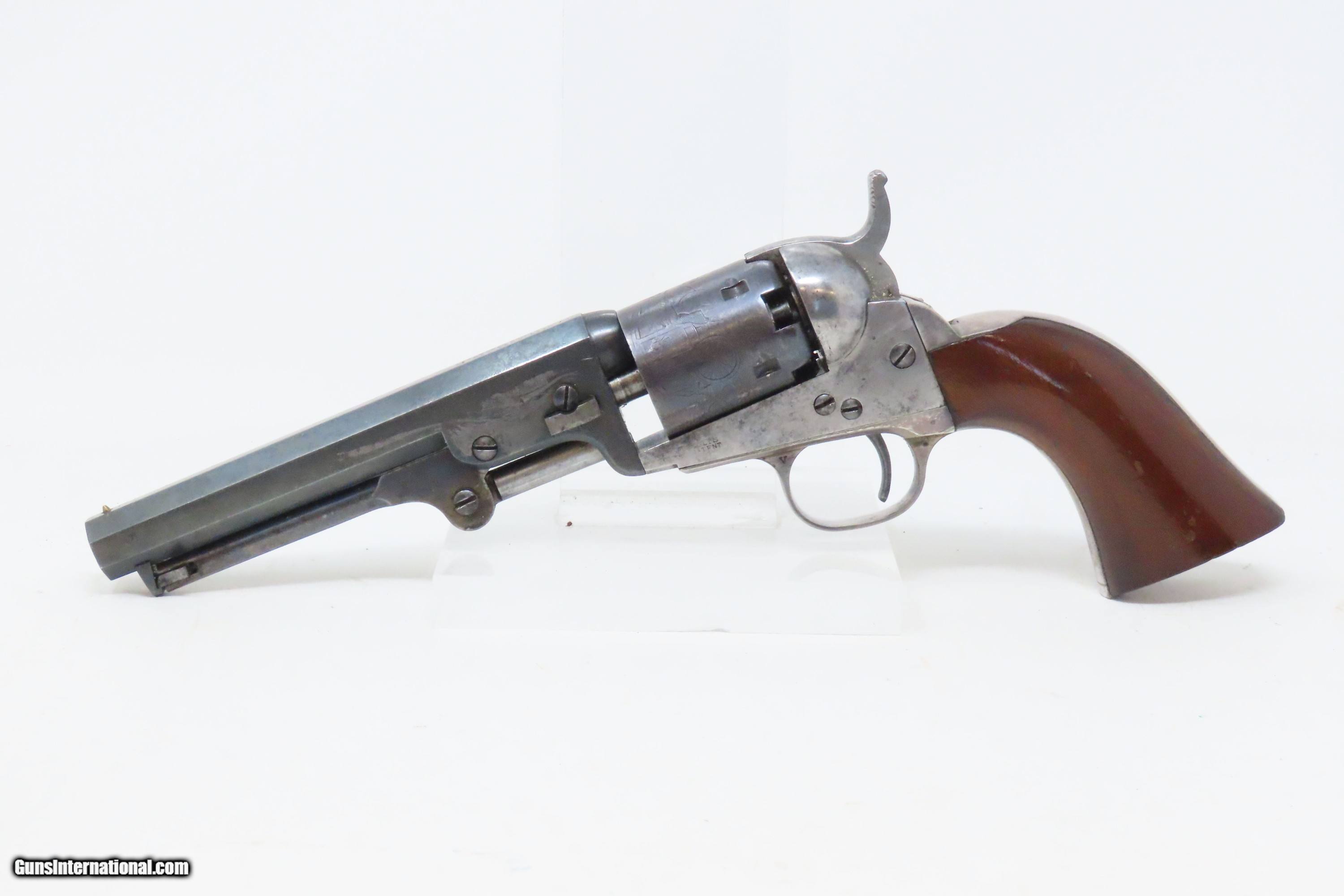 Description: Pre-CIVIL WAR Cased Antique COLT Model 1849 POCKET w Robbery Cylinder Scene Inscribed to “JAs MERCER” on the Frame Here we present an antique Cased Colt Model 1849 Pocket Revolver, Inscribed to James Mercer, made just three years before the start of the Civil War in 1858 in Hartford, Connecticut. There were 40 Union soldiers by this name and 28 Confederates. The Model 1849 Pocket, the replacement for the Baby Dragoon, was the most widely produced of any Colt percussion pistol. Nearly 340,000 were manufactured during its 23-year production run that ended in 1873. Over 280,000 of these were produced by Colt’s factory at Hartford by the end of the American Civil War in 1865. These were very popular and saw a lot of use on the battlefield, on the home front and in the West. These were some of the smallest, handiest pocket revolvers of the time. One of the most aesthetically pleasing aspects of the 1849 Pocket is its cylinder scene. Cylinder scenes during this period were common, especially for Colt, not only for their visual appeal, but because it made a revolver more difficult to forge. The scene on the cylinder of the 1849 Pocket is that of a stagecoach robbery. The focal point is the stagecoach drawn by four horses. A woman in a dress is seen framed in the doorway of the side of the coach. The driver is standing alongside wielding his pistol against multiple assailants as the horses rear and struggle against their harnesses. Several of the bandits lay dying on the ground, one tries to control the horses, two are running away and one is in the process of falling dead after being shot. Not a bad way to show interested buyers what a pistol like this would be good for. It did a fine job as a self-defense handgun for the average citizen in 19th Century America. Though not a primary military arm during the American Civil War, these handguns were commonly privately purchased by soldiers for use on the battlefield. Whether legend or fact, it is interesting to note something commonly read about pocket revolvers of the day, that while they could be used for self-defense against the enemy, many soldiers kept them on their person to defend themselves against an unwanted amputation in the primitive field hospitals that were notorious, even in their day. The overall condition is fine. Original blue and silver finish. The stagecoach robbery cylinder scene remains clear. The action is excellent. The bore is fine, bright with sharp rifling. The grip is solid. Numbers match. The case is a bit delicate as there is a crack on the bottom from one side to another. Contains a bullet mold, powder flask, nipple wrench and two cap tins. Own the original! This is a legitimate antique and not a reproduction. Barrel is 5 inches. Caliber: .31 Percussion Overall condition as seen in photos. Very Fast. Very Safe. FREE SHIPPING WORLDWIDE. Delivered directly to your door by express mail! Guaranteed AUTHENTIC & Includes CERTIFICATE OF AUTHENTICITY. ancestryguns $4500 #240019 SOLD Antique: Yes |