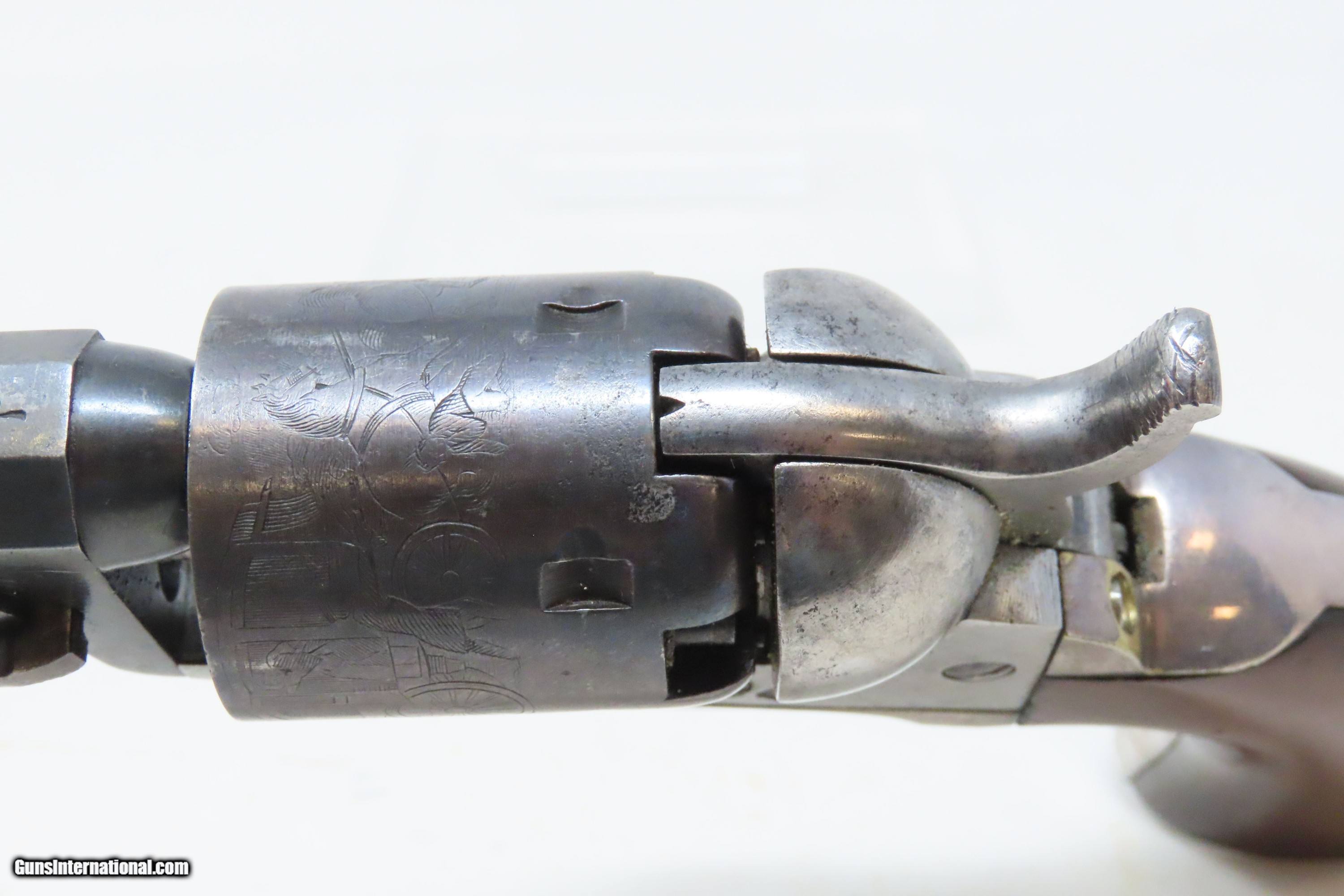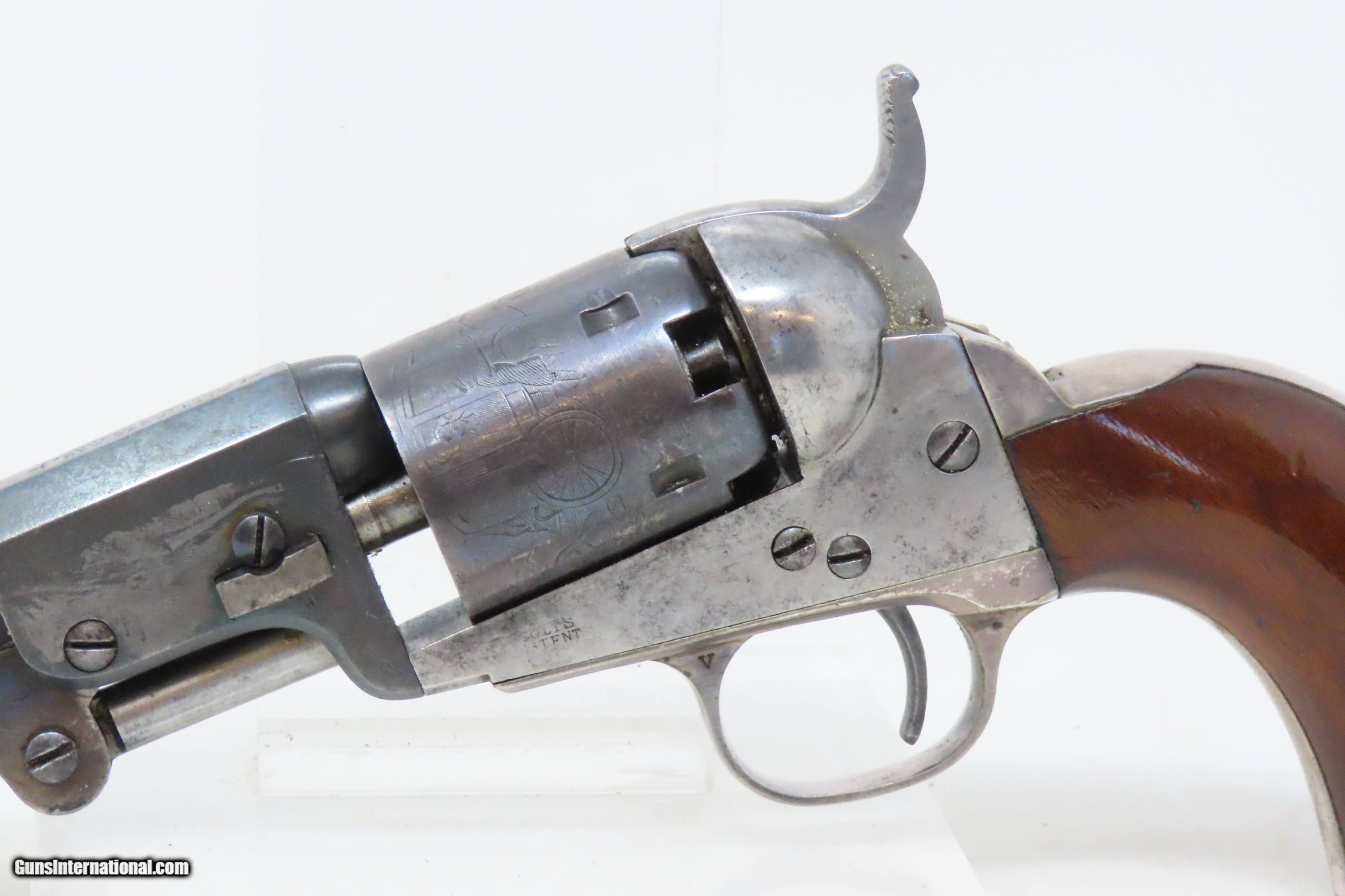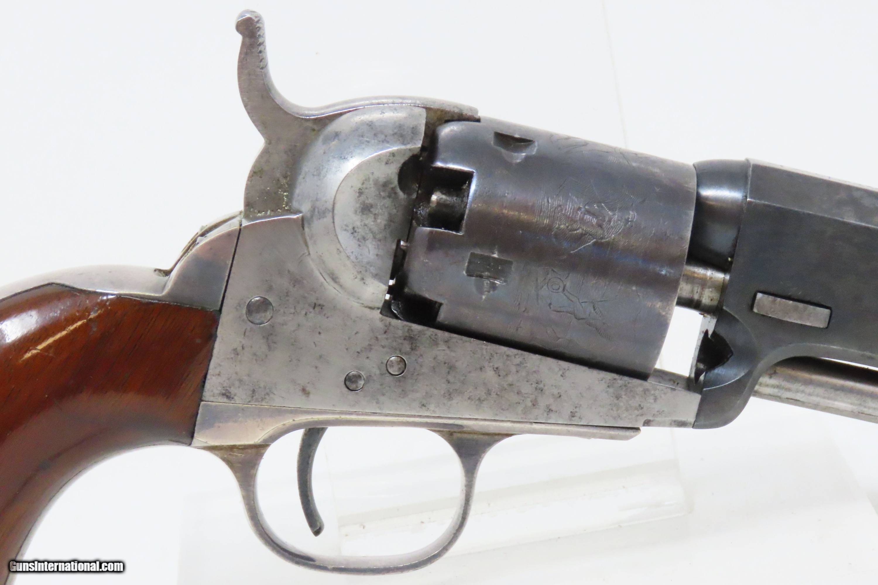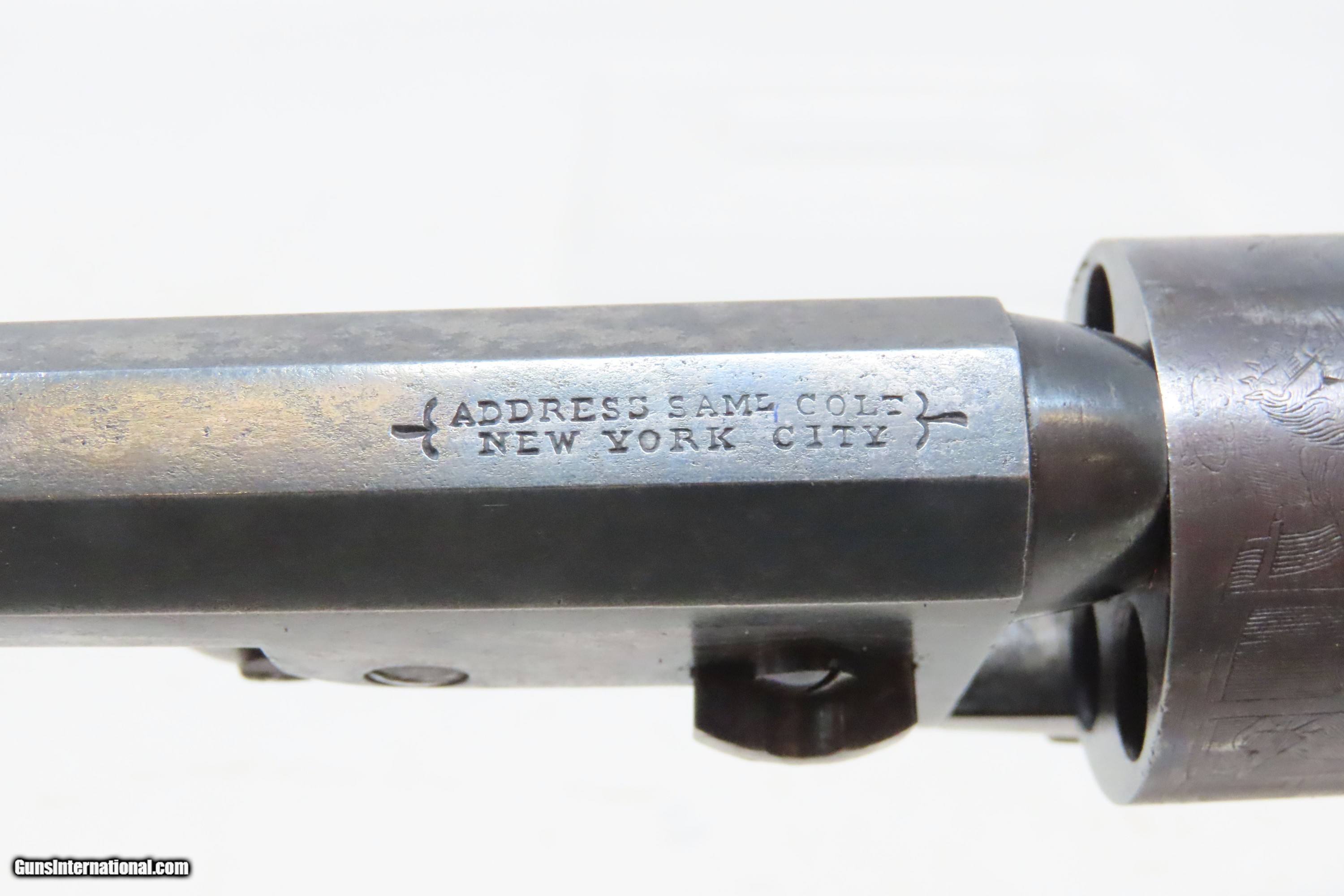 Description: Pre-CIVIL WAR Cased Antique COLT Model 1849 POCKET w Robbery Cylinder Scene Inscribed to “JAs MERCER” on the Frame Here we present an antique Cased Colt Model 1849 Pocket Revolver, Inscribed to James Mercer, made just three years before the start of the Civil War in 1858 in Hartford, Connecticut. There were 40 Union soldiers by this name and 28 Confederates. The Model 1849 Pocket, the replacement for the Baby Dragoon, was the most widely produced of any Colt percussion pistol. Nearly 340,000 were manufactured during its 23-year production run that ended in 1873. Over 280,000 of these were produced by Colt’s factory at Hartford by the end of the American Civil War in 1865. These were very popular and saw a lot of use on the battlefield, on the home front and in the West. These were some of the smallest, handiest pocket revolvers of the time. One of the most aesthetically pleasing aspects of the 1849 Pocket is its cylinder scene. Cylinder scenes during this period were common, especially for Colt, not only for their visual appeal, but because it made a revolver more difficult to forge. The scene on the cylinder of the 1849 Pocket is that of a stagecoach robbery. The focal point is the stagecoach drawn by four horses. A woman in a dress is seen framed in the doorway of the side of the coach. The driver is standing alongside wielding his pistol against multiple assailants as the horses rear and struggle against their harnesses. Several of the bandits lay dying on the ground, one tries to control the horses, two are running away and one is in the process of falling dead after being shot. Not a bad way to show interested buyers what a pistol like this would be good for. It did a fine job as a self-defense handgun for the average citizen in 19th Century America. Though not a primary military arm during the American Civil War, these handguns were commonly privately purchased by soldiers for use on the battlefield. Whether legend or fact, it is interesting to note something commonly read about pocket revolvers of the day, that while they could be used for self-defense against the enemy, many soldiers kept them on their person to defend themselves against an unwanted amputation in the primitive field hospitals that were notorious, even in their day. The overall condition is fine. Original blue and silver finish. The stagecoach robbery cylinder scene remains clear. The action is excellent. The bore is fine, bright with sharp rifling. The grip is solid. Numbers match. The case is a bit delicate as there is a crack on the bottom from one side to another. Contains a bullet mold, powder flask, nipple wrench and two cap tins. Own the original! This is a legitimate antique and not a reproduction. Barrel is 5 inches. Caliber: .31 Percussion Overall condition as seen in photos. Very Fast. Very Safe. FREE SHIPPING WORLDWIDE. Delivered directly to your door by express mail! Guaranteed AUTHENTIC & Includes CERTIFICATE OF AUTHENTICITY. ancestryguns $4500 #240019 SOLD Antique: Yes |
