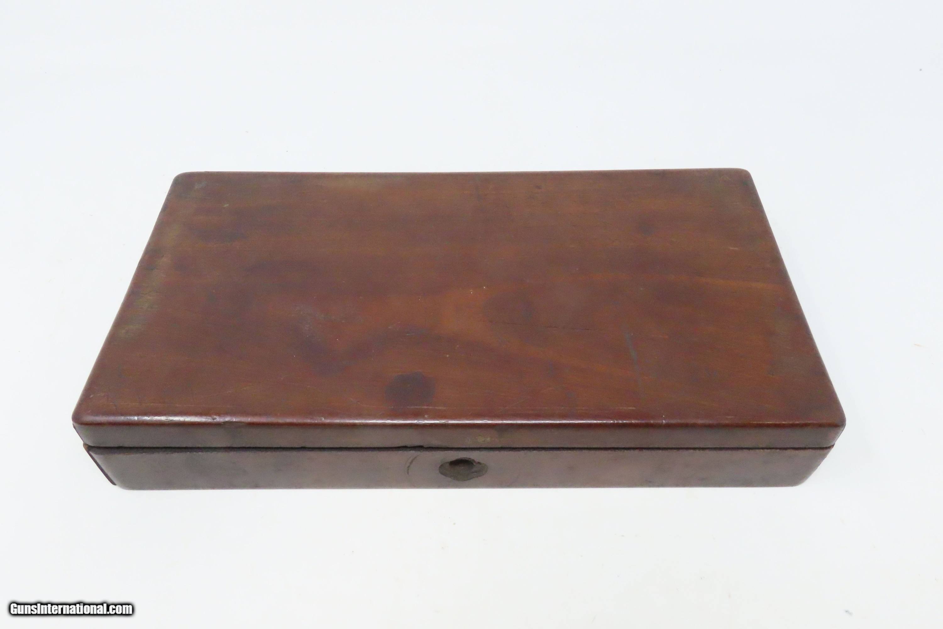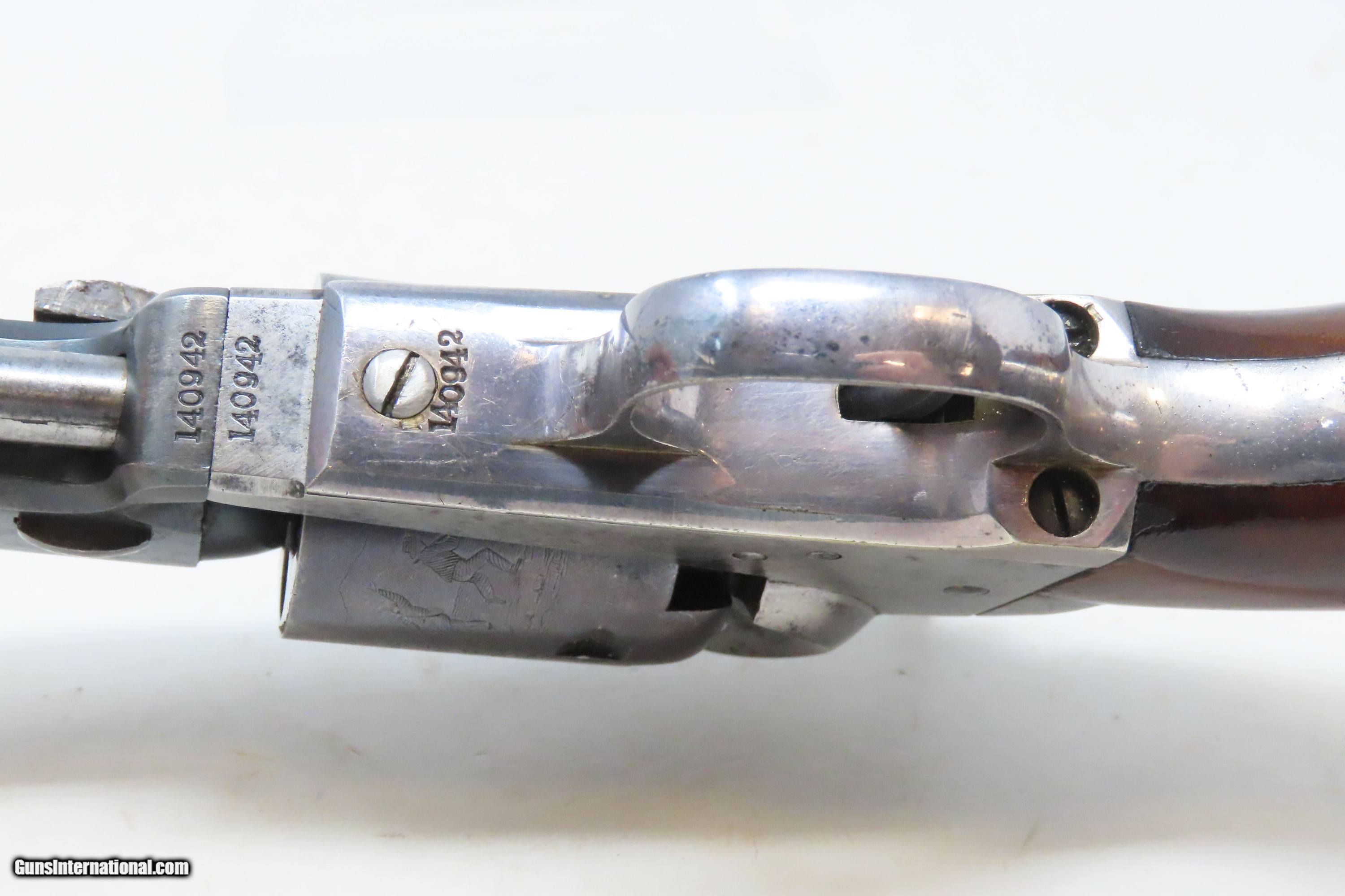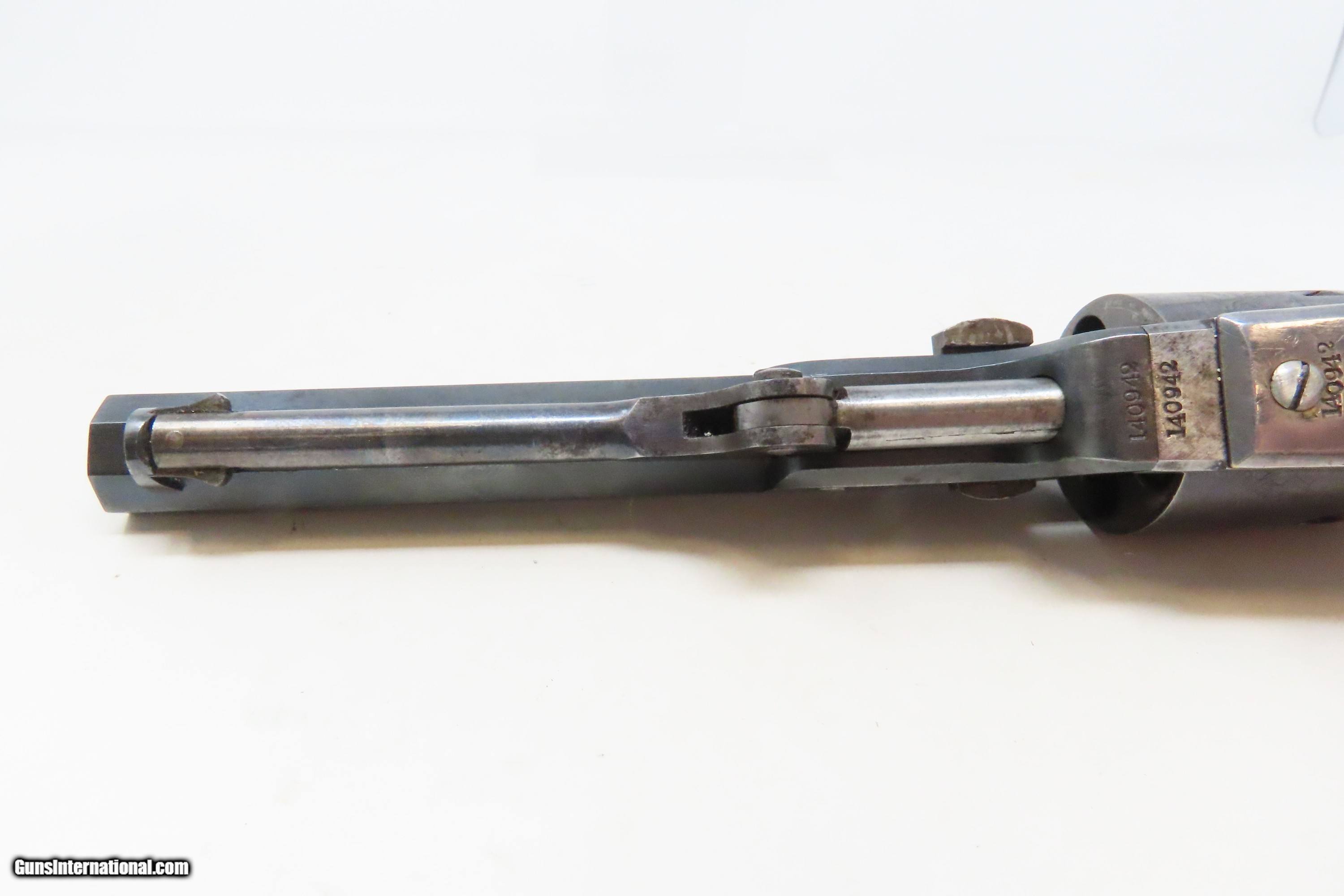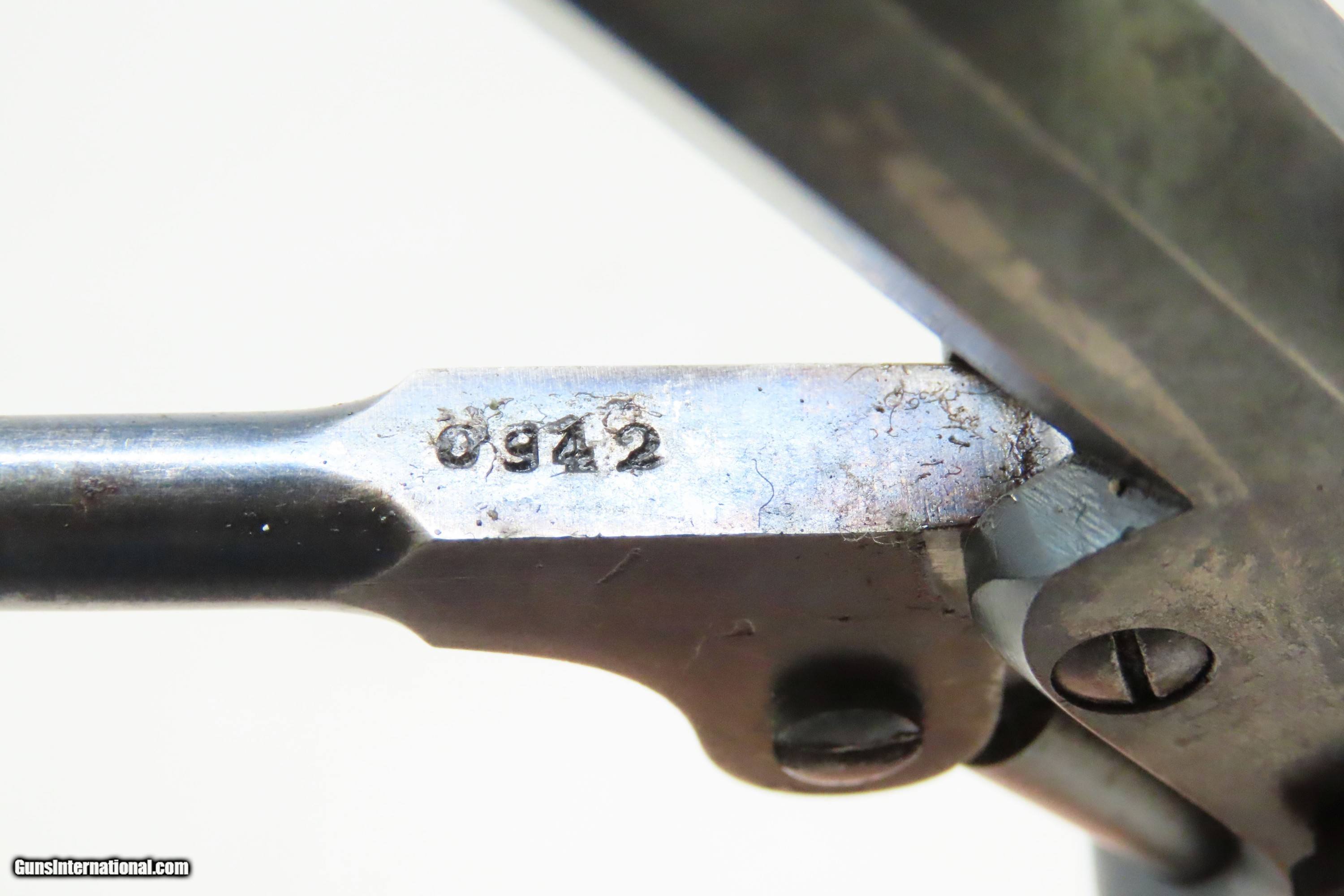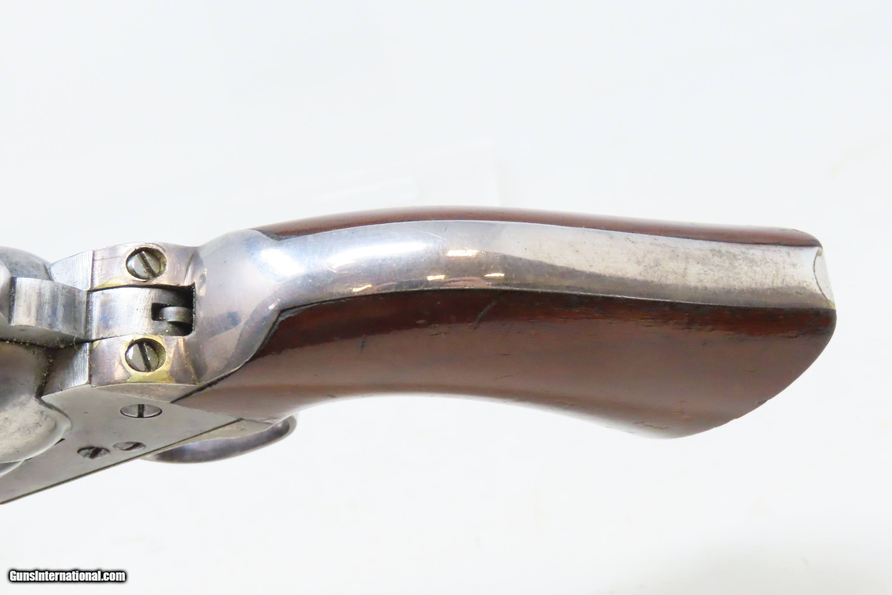 Description: Pre-CIVIL WAR Cased Antique COLT Model 1849 POCKET w Robbery Cylinder Scene Inscribed to “JAs MERCER” on the Frame Here we present an antique Cased Colt Model 1849 Pocket Revolver, Inscribed to James Mercer, made just three years before the start of the Civil War in 1858 in Hartford, Connecticut. There were 40 Union soldiers by this name and 28 Confederates. The Model 1849 Pocket, the replacement for the Baby Dragoon, was the most widely produced of any Colt percussion pistol. Nearly 340,000 were manufactured during its 23-year production run that ended in 1873. Over 280,000 of these were produced by Colt’s factory at Hartford by the end of the American Civil War in 1865. These were very popular and saw a lot of use on the battlefield, on the home front and in the West. These were some of the smallest, handiest pocket revolvers of the time. One of the most aesthetically pleasing aspects of the 1849 Pocket is its cylinder scene. Cylinder scenes during this period were common, especially for Colt, not only for their visual appeal, but because it made a revolver more difficult to forge. The scene on the cylinder of the 1849 Pocket is that of a stagecoach robbery. The focal point is the stagecoach drawn by four horses. A woman in a dress is seen framed in the doorway of the side of the coach. The driver is standing alongside wielding his pistol against multiple assailants as the horses rear and struggle against their harnesses. Several of the bandits lay dying on the ground, one tries to control the horses, two are running away and one is in the process of falling dead after being shot. Not a bad way to show interested buyers what a pistol like this would be good for. It did a fine job as a self-defense handgun for the average citizen in 19th Century America. Though not a primary military arm during the American Civil War, these handguns were commonly privately purchased by soldiers for use on the battlefield. Whether legend or fact, it is interesting to note something commonly read about pocket revolvers of the day, that while they could be used for self-defense against the enemy, many soldiers kept them on their person to defend themselves against an unwanted amputation in the primitive field hospitals that were notorious, even in their day. The overall condition is fine. Original blue and silver finish. The stagecoach robbery cylinder scene remains clear. The action is excellent. The bore is fine, bright with sharp rifling. The grip is solid. Numbers match. The case is a bit delicate as there is a crack on the bottom from one side to another. Contains a bullet mold, powder flask, nipple wrench and two cap tins. Own the original! This is a legitimate antique and not a reproduction. Barrel is 5 inches. Caliber: .31 Percussion Overall condition as seen in photos. Very Fast. Very Safe. FREE SHIPPING WORLDWIDE. Delivered directly to your door by express mail! Guaranteed AUTHENTIC & Includes CERTIFICATE OF AUTHENTICITY. ancestryguns $4500 #240019 SOLD Antique: Yes |