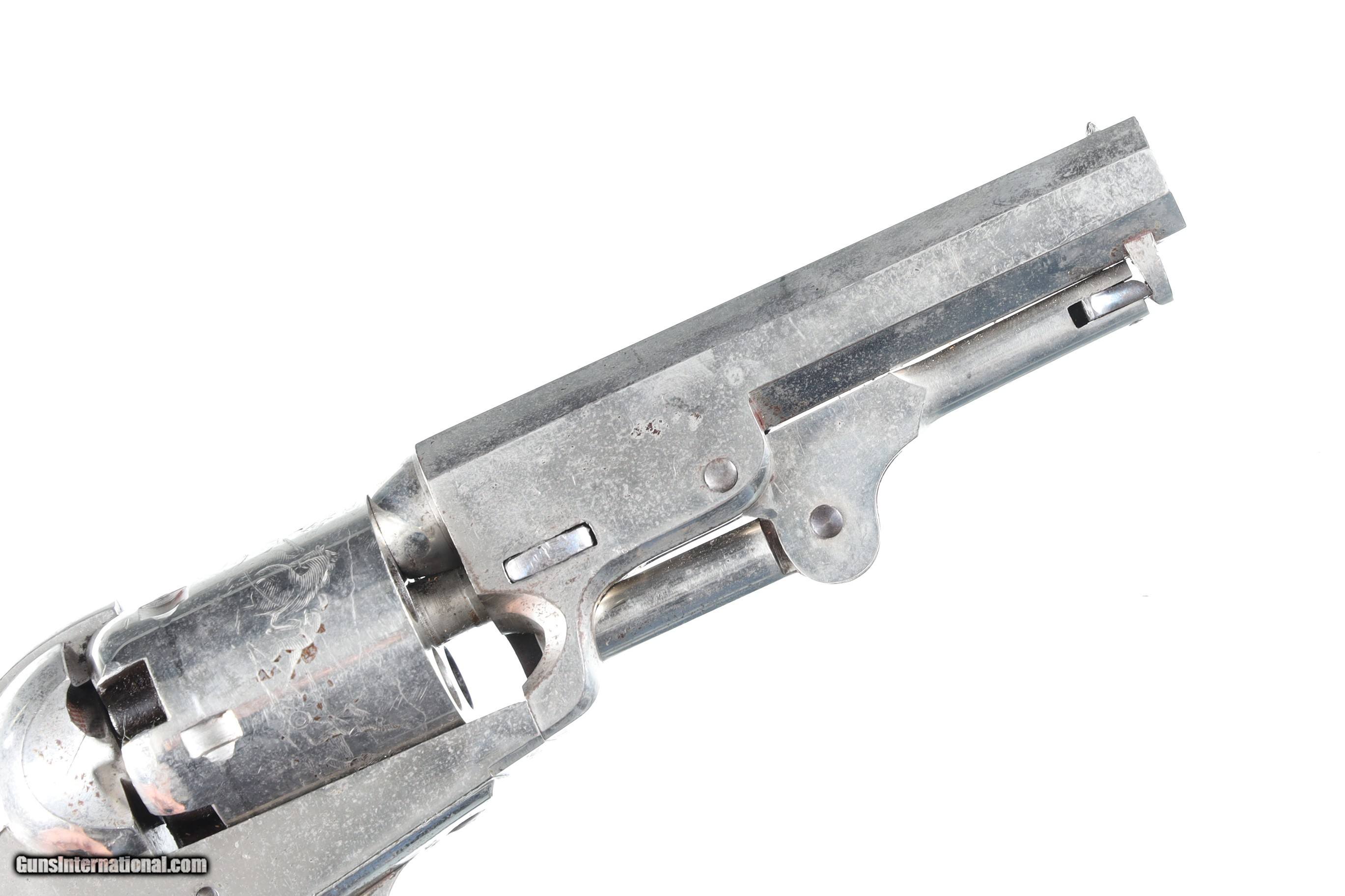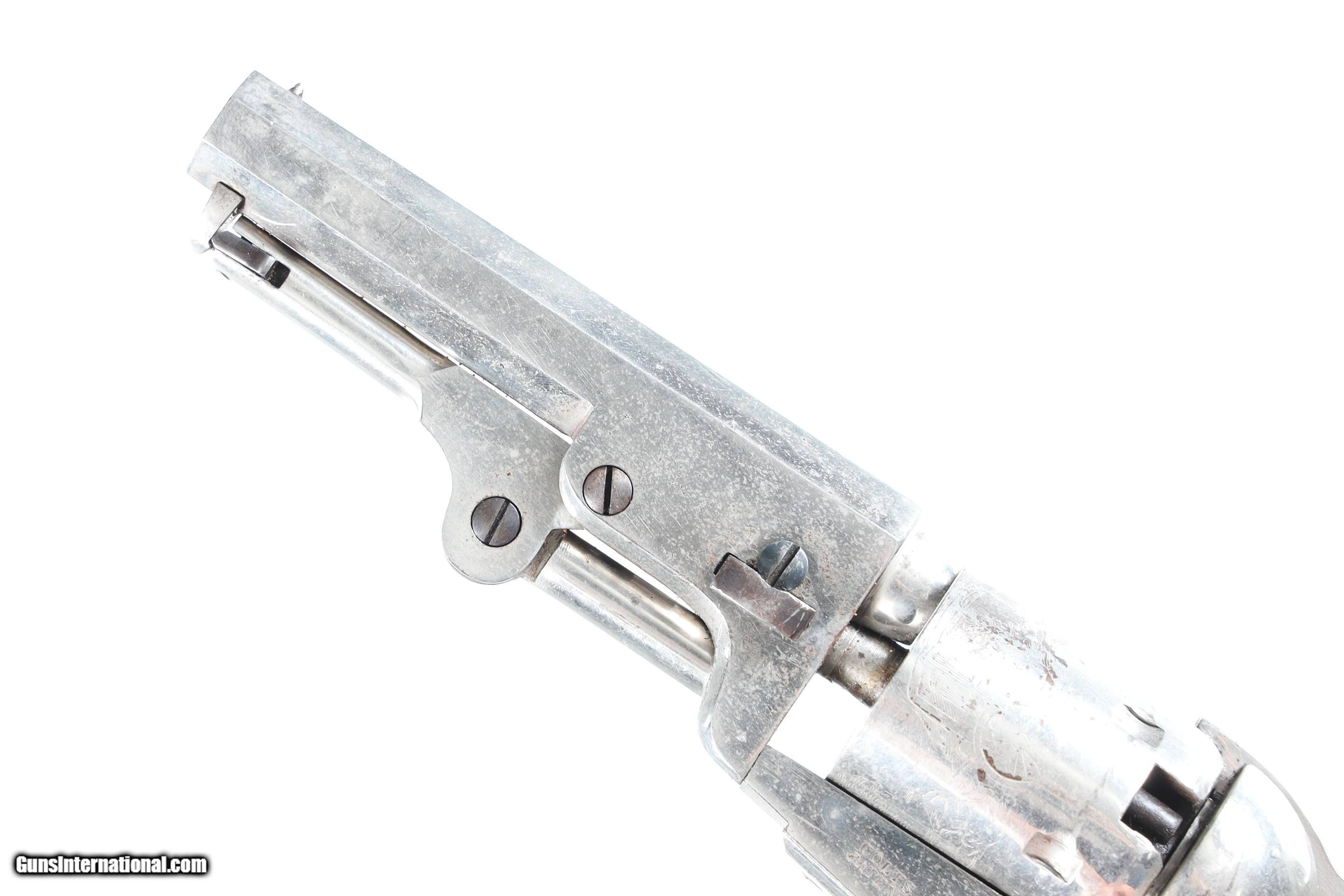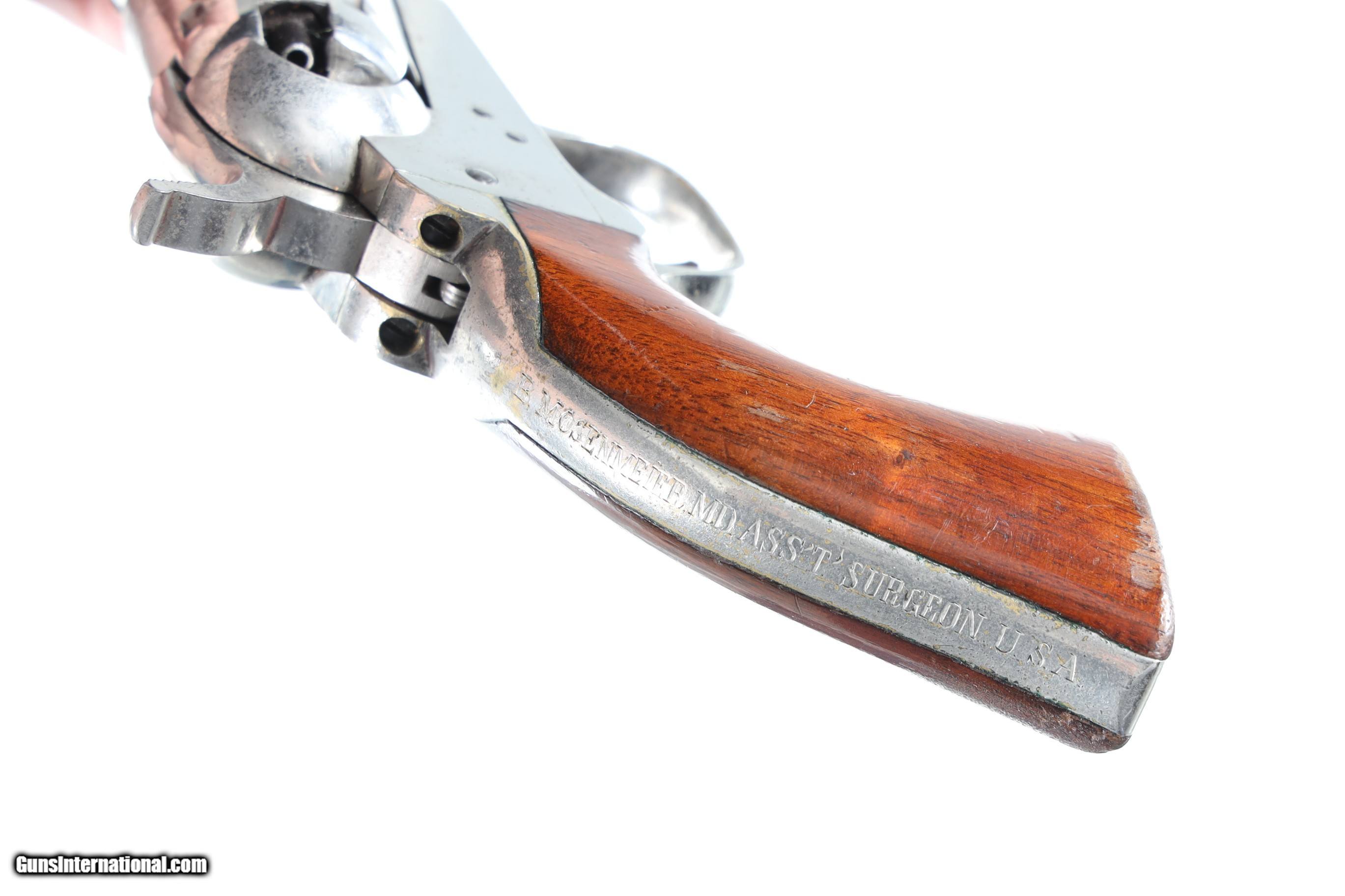 Description: Serial Number 189474 Bbl, 4" Cal, .31 Percussion Mfg, 1861. New York Address with Wm Ormsby statgecoach cylinder scene and full nickel finish. Varnished one piece walnut grips. Matching numbers including wedge.Very good overall condition, possible period renickeled, crisp action and markings. Manufactured in 1861. "B. MOSENMEIER MD ASS'T'SURGEON U.S.A." inscribed on the backstrap. Research shows a "Bernard/Berhard Mosenmeier" active as a physician in Cincinnati, Ohio in the 1860s and onward, with a widow's pension card from 1896, and other records listing him as an assistant surgeon with the 33rd Ohio Volunteer Infantry Regiment which saw action at Perriville, Stones River, Missionary Ridge, and other battles. Information provided by previos owner. Antique • Free Shipping, No Credit Card Fees. • Lay-a-way available for this firearm. • 1/3 Down, a 1/3 in 30 Days, 1/3 in 60 Days. SOLD Antique: Yes Manufacturer: Colt Model: 1849 Serial Number: 189474 Barrel Length: 4 |