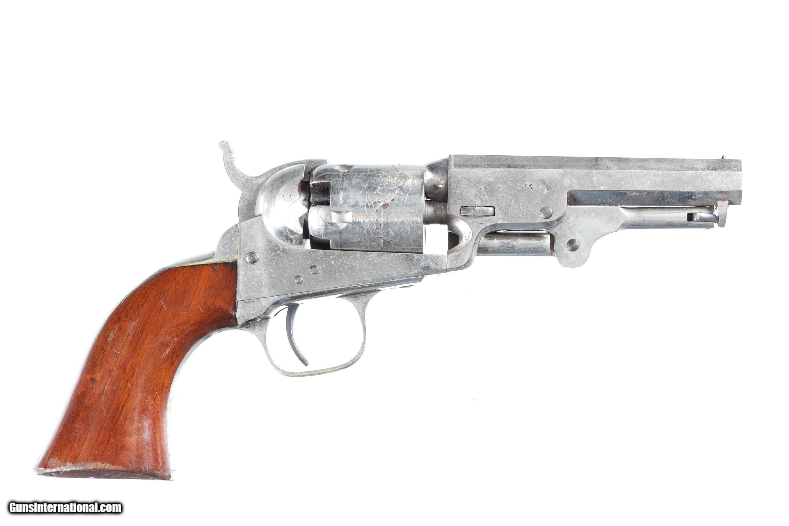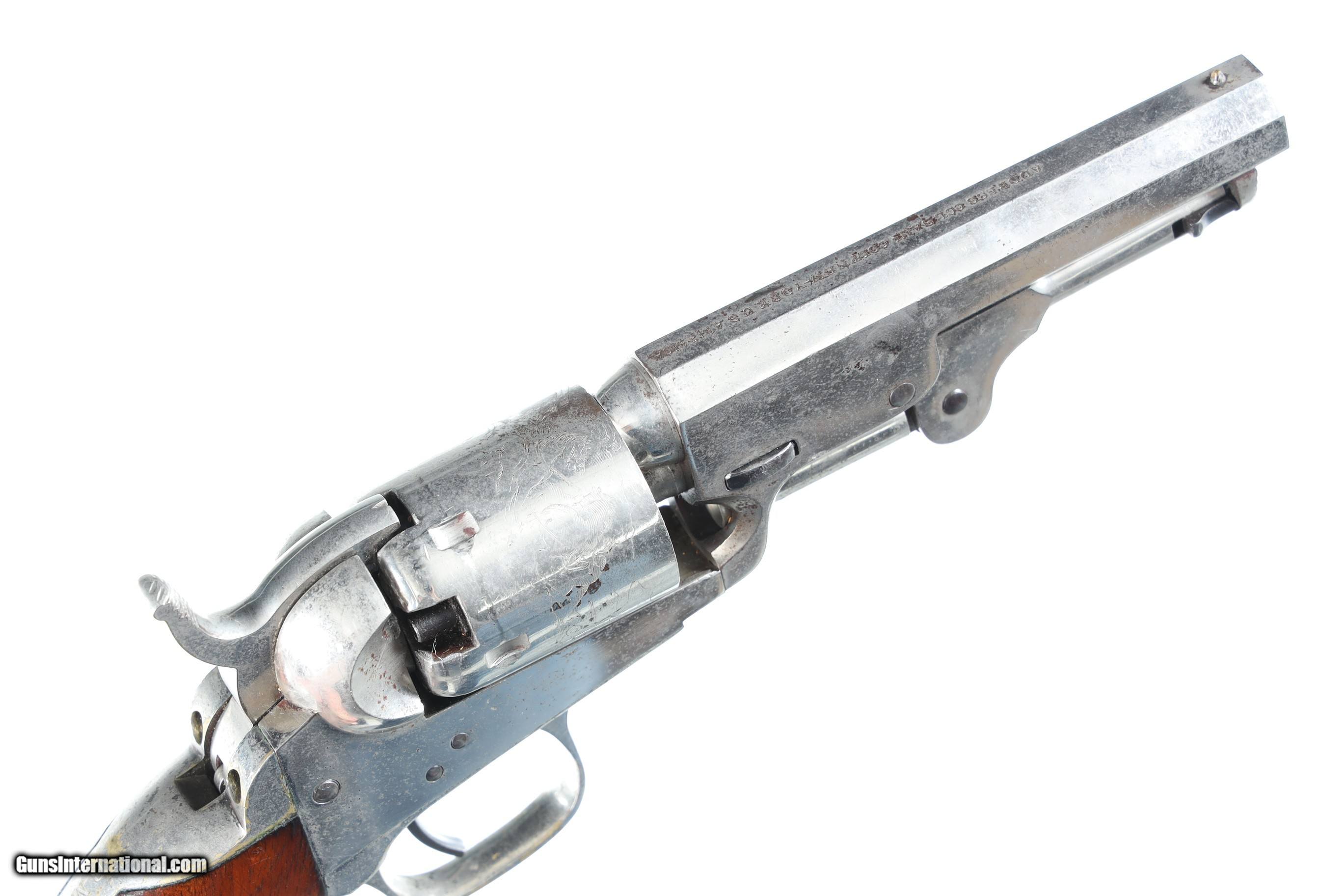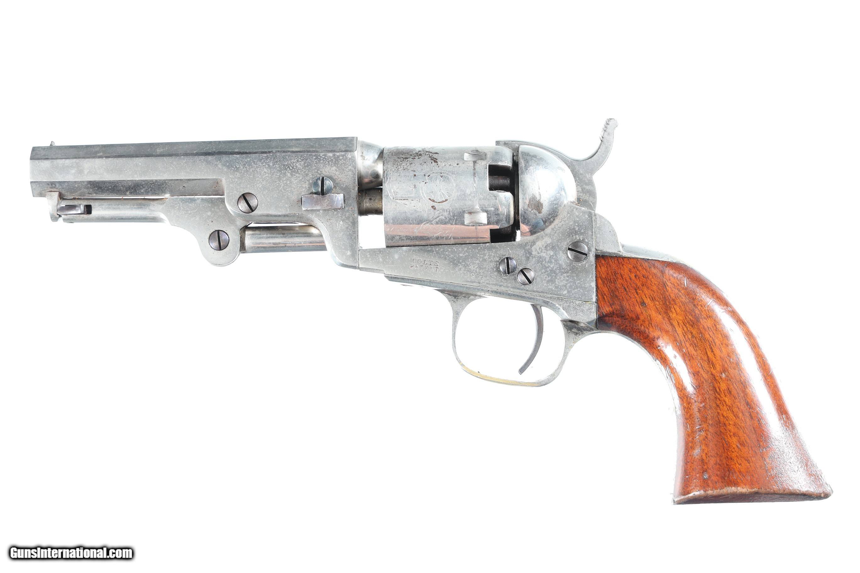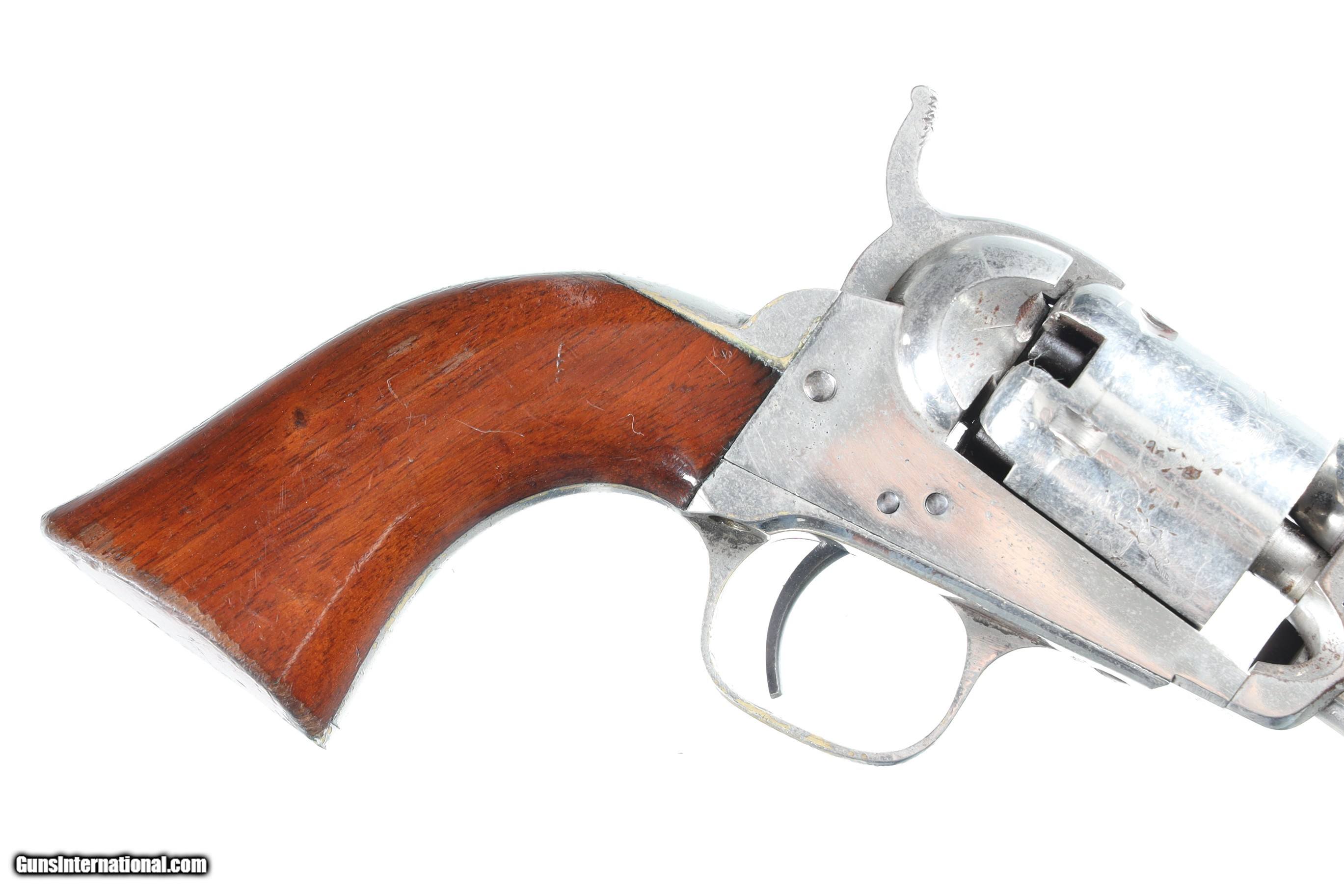 Description: Serial Number 189474 Bbl, 4" Cal, .31 Percussion Mfg, 1861. New York Address with Wm Ormsby statgecoach cylinder scene and full nickel finish. Varnished one piece walnut grips. Matching numbers including wedge.Very good overall condition, possible period renickeled, crisp action and markings. Manufactured in 1861. "B. MOSENMEIER MD ASS'T'SURGEON U.S.A." inscribed on the backstrap. Research shows a "Bernard/Berhard Mosenmeier" active as a physician in Cincinnati, Ohio in the 1860s and onward, with a widow's pension card from 1896, and other records listing him as an assistant surgeon with the 33rd Ohio Volunteer Infantry Regiment which saw action at Perriville, Stones River, Missionary Ridge, and other battles. Information provided by previos owner. Antique • Free Shipping, No Credit Card Fees. • Lay-a-way available for this firearm. • 1/3 Down, a 1/3 in 30 Days, 1/3 in 60 Days. SOLD Antique: Yes Manufacturer: Colt Model: 1849 Serial Number: 189474 Barrel Length: 4 |