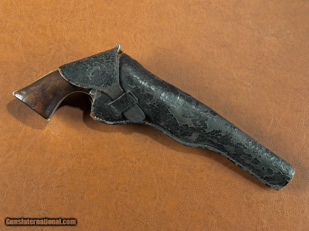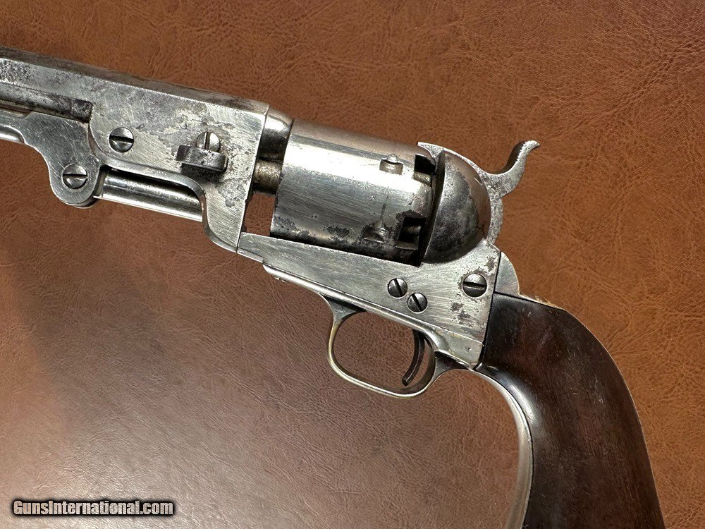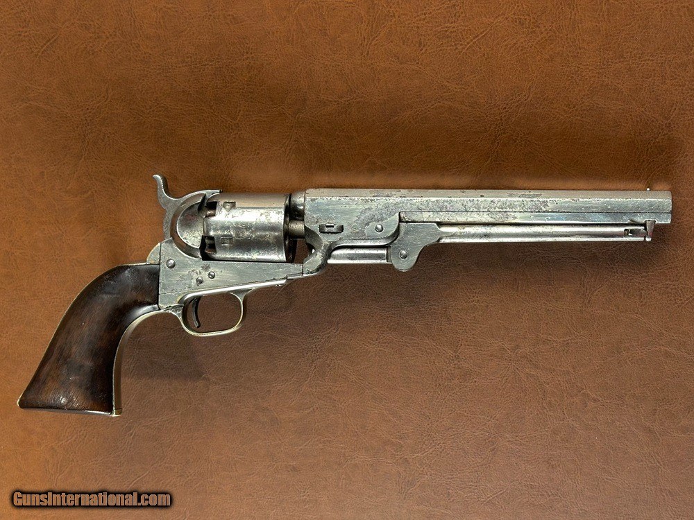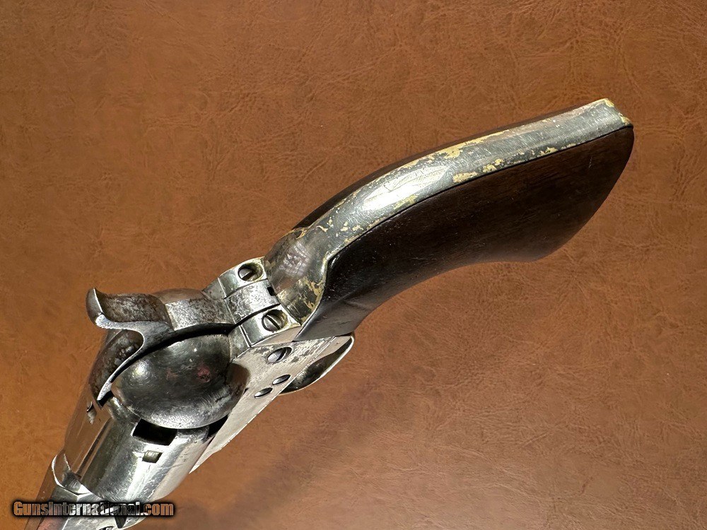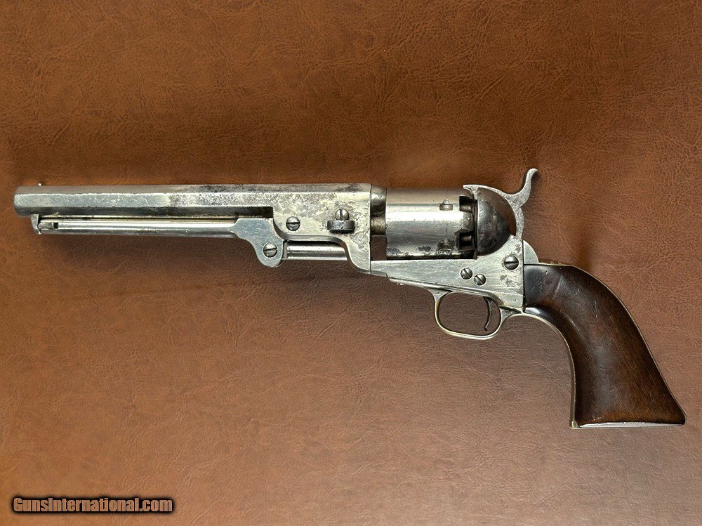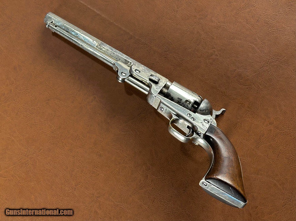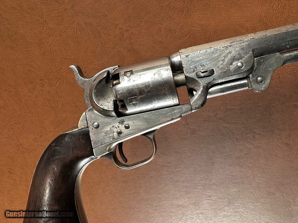 Description: Published Civil War Model 1851 Colt Navy Percussion Revolver Attributed to Confederate General John Hunt Morgan's 2nd Kentucky Cavalry, Nickel Plated with Holster, .36 Cal, mfg. 1856. This early Colt Navy revolver was pictured on the cover of GUNS Magazine in July 1962 and noted as; “a Colt's Model 1851 Navy, caliber .36, nickel plated, together with a flag, cap, and canteen owned by a member of the 2nd Kentucky Cavalry ”Morgan's Men" - a Civil War regiment formed by Gen. John Hunt Morgan in Lexington, Kentucky, in 1861". Morgan's men participated in several famous raids throughout the war and did seem to favor '51 Navies historically. The pistol is positively identifiable on the cover due to numerous marks in the finish and grips. Overall the pistol retains 80%+ bright period applied nickel finish with wear along the barrel sides and small flaking throughout. Original wood grips are just slightly undersized due to wear and shrinkage yet fit nicely and show moderate/heavy wear with a small chip at the left lower forward corner which is visible in the magazine photo. Clear barrel address with matching serial number “57504” stamped on frame, barrel, backstrap, triggerguard, wedge, loading lever, cylinder pin and cylinder (cylinder very faint but legible). Cylinder scene is no longer visible as well as the ‘patent’ in “COLTS PATENT” on the frame. Inspector's marks “K” and “M” stamped on left side of triggerguard. Original hammer, trigger, screws, and bead front sight. Action is crisp and smooth and functions very nicely. Nipples are all clean originals. Barrel is rock solid against the frame with no movement. Bore shows good strong rifling overall with moderate/heavy blackpowder frosting and fine pinprick pitting throughout. The leather flap holster fits as snug as a glove and is surprisingly supple despite showing surface crackling from age. Magazine is included - cover has separated but otherwise it is complete and in good shape. A very solid, honest, and original Civil War Colt that will make an awesome display piece! Jeremiah Johnson Trading sells antique arms manufactured prior to 1899 and muzzleloading blackpowder reproductions only. For the purpose of these conditions the term "antique arms" will also include muzzleloading blackpowder reproductions. Buyers must be 21 years of age or older and have no felony convictions to purchase antique arms. Antique arms do not require Federal licensing and may be shipped directly to the buyer with the following exceptions. No antique arms will be shipped to Washington D. C. or any of the five boroughs of New York City (or residents thereof). Some restrictions may apply to antique firearms shipped to California and will be noted in the item description if applicable. Any antique arm shipped to New Jersey or Ohio must ship to a licensed FFL holder, no exceptions. Any muzzleloading blackpowder reproduction rifle, shotgun, or handgun shipped to Illinois must ship to an FFL holder. Items containing antique ivory will not be sold or shipped to residents of California, Hawaii, Illinois, Nevada, New Hampshire, New Jersey, New York, Oregon, or Washington. Antique muzzleloaders and antiques which fire obsolete cartridges may be shipped internationally however it is the responsibility of the buyer to know and abide by their local laws and provide proof that the antique arm is legal to receive and own. Payment can be made by money order, banker's check, personal check, credit card (no additional fees), or bank wire. Please allow 7-10 business days for clearance on personal checks. If paying by credit card please call us directly to process your order. Items are professionally packed and shipped USPS Priority Mail with insurance coverage for the sale price and signature required for delivery. Items valued over $5,000.00 are shipped Registered Mail. Buyer pays actual shipping costs with no added charge for packing materials or handling. We describe items accurately and thoroughly. If an item has been misrepresented or significant defect overlooked you may return it for a full refund (minus return shipping costs) within 3 days of having received it. This timeframe begins once the package is delivered by the carrier. Buyer's remorse or concerns over issues noted in the description and/or pictures is not a valid excuse for return. Returned items must be received in the same condition as originally shipped - cleaning, disassembly, alteration, or damage of any kind will void inspection privileges. Occasionally a post-1898 firearm from my personal collection may be sold under this account and any such transaction is a personal sale in no way affiliated with Jeremiah Johnson Trading. Any such arm will be shipped to a licensed FFL or C&R holder in accordance with Federal law. All antique arms are sold as collector's items and are not warranted safe for shooting. Please consult a competent gunsmith prior to shooting any firearm. SOLD Antique: Yes Handgun Caliber: .36 Manufacturer: Colt Model: 1851 Navy Serial Number: 57504 Finish: Nickel Manufacture Date: 1856 Extras: Magazine & Holster |