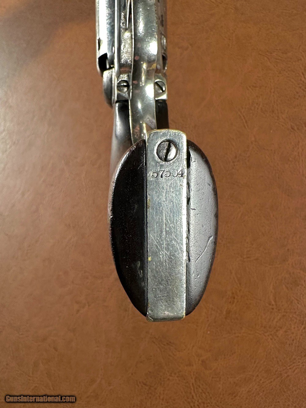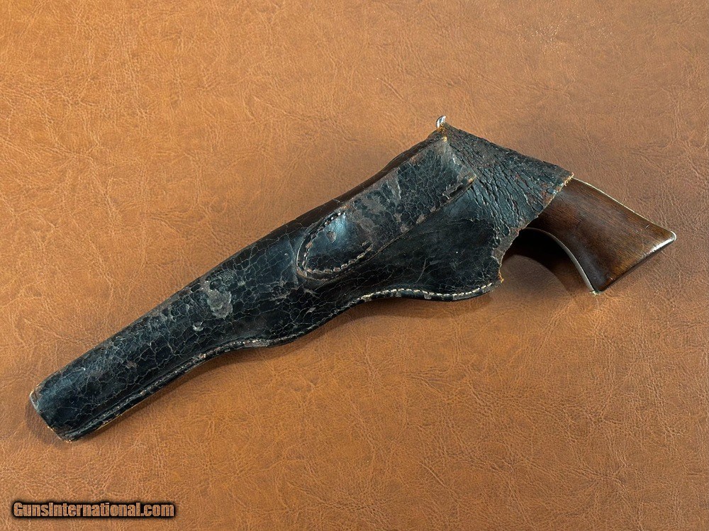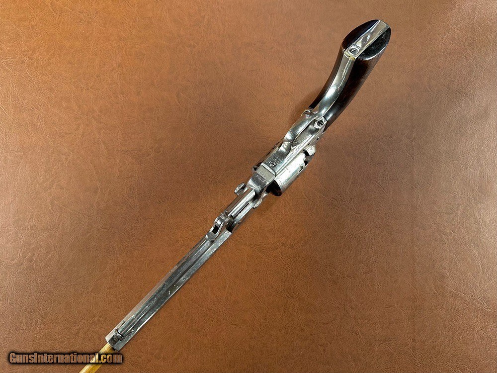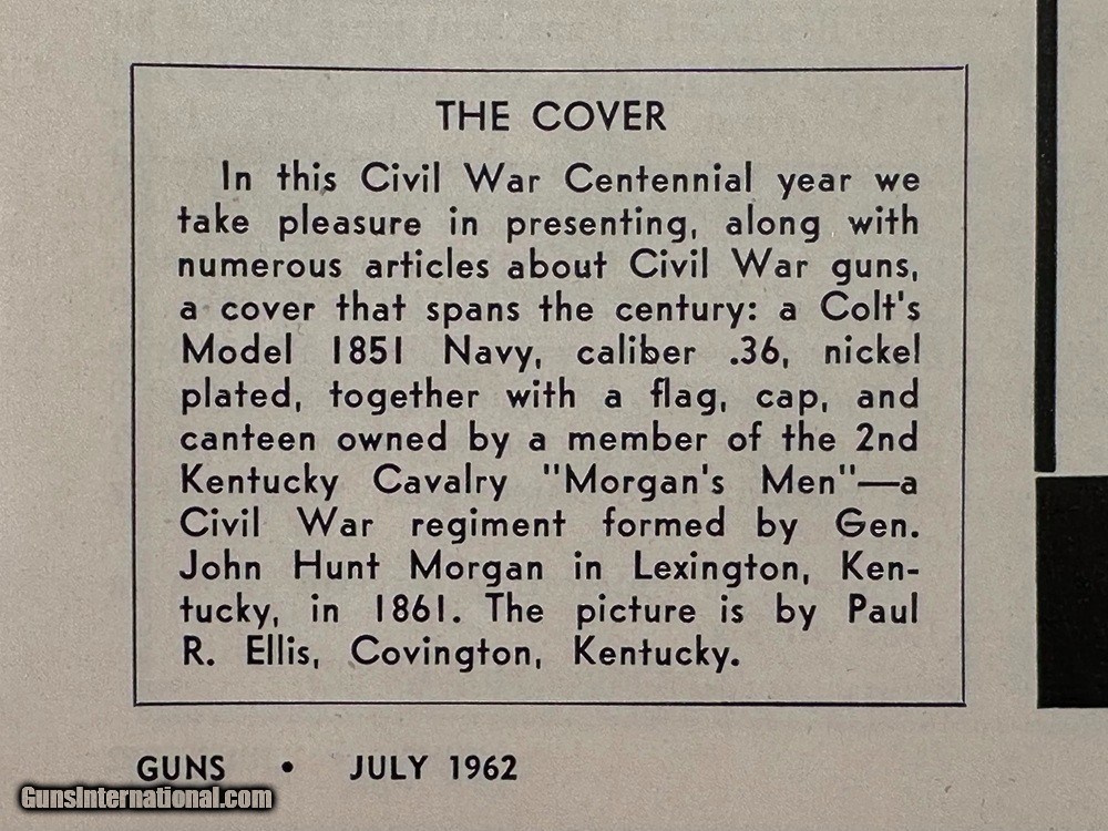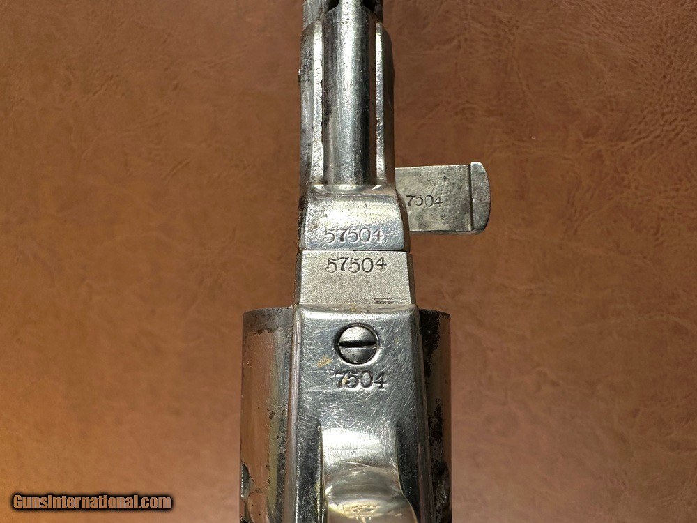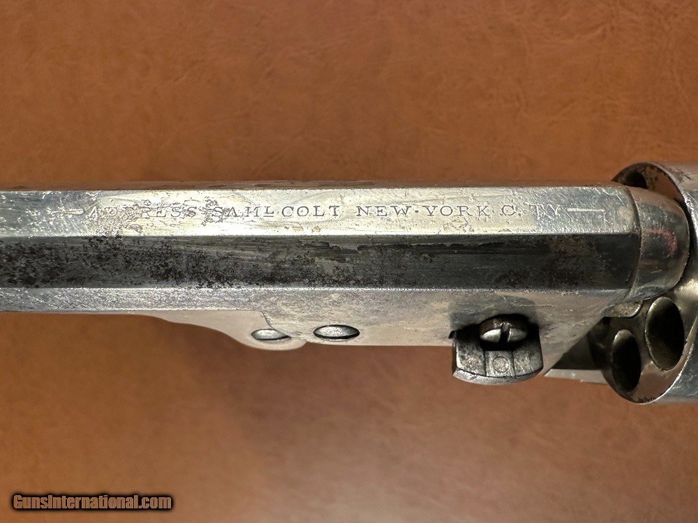 Description: Published Civil War Model 1851 Colt Navy Percussion Revolver Attributed to Confederate General John Hunt Morgan's 2nd Kentucky Cavalry, Nickel Plated with Holster, .36 Cal, mfg. 1856. This early Colt Navy revolver was pictured on the cover of GUNS Magazine in July 1962 and noted as; “a Colt's Model 1851 Navy, caliber .36, nickel plated, together with a flag, cap, and canteen owned by a member of the 2nd Kentucky Cavalry ”Morgan's Men" - a Civil War regiment formed by Gen. John Hunt Morgan in Lexington, Kentucky, in 1861". Morgan's men participated in several famous raids throughout the war and did seem to favor '51 Navies historically. The pistol is positively identifiable on the cover due to numerous marks in the finish and grips. Overall the pistol retains 80%+ bright period applied nickel finish with wear along the barrel sides and small flaking throughout. Original wood grips are just slightly undersized due to wear and shrinkage yet fit nicely and show moderate/heavy wear with a small chip at the left lower forward corner which is visible in the magazine photo. Clear barrel address with matching serial number “57504” stamped on frame, barrel, backstrap, triggerguard, wedge, loading lever, cylinder pin and cylinder (cylinder very faint but legible). Cylinder scene is no longer visible as well as the ‘patent’ in “COLTS PATENT” on the frame. Inspector's marks “K” and “M” stamped on left side of triggerguard. Original hammer, trigger, screws, and bead front sight. Action is crisp and smooth and functions very nicely. Nipples are all clean originals. Barrel is rock solid against the frame with no movement. Bore shows good strong rifling overall with moderate/heavy blackpowder frosting and fine pinprick pitting throughout. The leather flap holster fits as snug as a glove and is surprisingly supple despite showing surface crackling from age. Magazine is included - cover has separated but otherwise it is complete and in good shape. A very solid, honest, and original Civil War Colt that will make an awesome display piece! Jeremiah Johnson Trading sells antique arms manufactured prior to 1899 and muzzleloading blackpowder reproductions only. For the purpose of these conditions the term "antique arms" will also include muzzleloading blackpowder reproductions. Buyers must be 21 years of age or older and have no felony convictions to purchase antique arms. Antique arms do not require Federal licensing and may be shipped directly to the buyer with the following exceptions. No antique arms will be shipped to Washington D. C. or any of the five boroughs of New York City (or residents thereof). Some restrictions may apply to antique firearms shipped to California and will be noted in the item description if applicable. Any antique arm shipped to New Jersey or Ohio must ship to a licensed FFL holder, no exceptions. Any muzzleloading blackpowder reproduction rifle, shotgun, or handgun shipped to Illinois must ship to an FFL holder. Items containing antique ivory will not be sold or shipped to residents of California, Hawaii, Illinois, Nevada, New Hampshire, New Jersey, New York, Oregon, or Washington. Antique muzzleloaders and antiques which fire obsolete cartridges may be shipped internationally however it is the responsibility of the buyer to know and abide by their local laws and provide proof that the antique arm is legal to receive and own. Payment can be made by money order, banker's check, personal check, credit card (no additional fees), or bank wire. Please allow 7-10 business days for clearance on personal checks. If paying by credit card please call us directly to process your order. Items are professionally packed and shipped USPS Priority Mail with insurance coverage for the sale price and signature required for delivery. Items valued over $5,000.00 are shipped Registered Mail. Buyer pays actual shipping costs with no added charge for packing materials or handling. We describe items accurately and thoroughly. If an item has been misrepresented or significant defect overlooked you may return it for a full refund (minus return shipping costs) within 3 days of having received it. This timeframe begins once the package is delivered by the carrier. Buyer's remorse or concerns over issues noted in the description and/or pictures is not a valid excuse for return. Returned items must be received in the same condition as originally shipped - cleaning, disassembly, alteration, or damage of any kind will void inspection privileges. Occasionally a post-1898 firearm from my personal collection may be sold under this account and any such transaction is a personal sale in no way affiliated with Jeremiah Johnson Trading. Any such arm will be shipped to a licensed FFL or C&R holder in accordance with Federal law. All antique arms are sold as collector's items and are not warranted safe for shooting. Please consult a competent gunsmith prior to shooting any firearm. SOLD Antique: Yes Handgun Caliber: .36 Manufacturer: Colt Model: 1851 Navy Serial Number: 57504 Finish: Nickel Manufacture Date: 1856 Extras: Magazine & Holster |