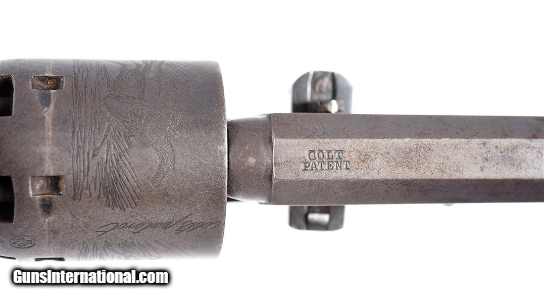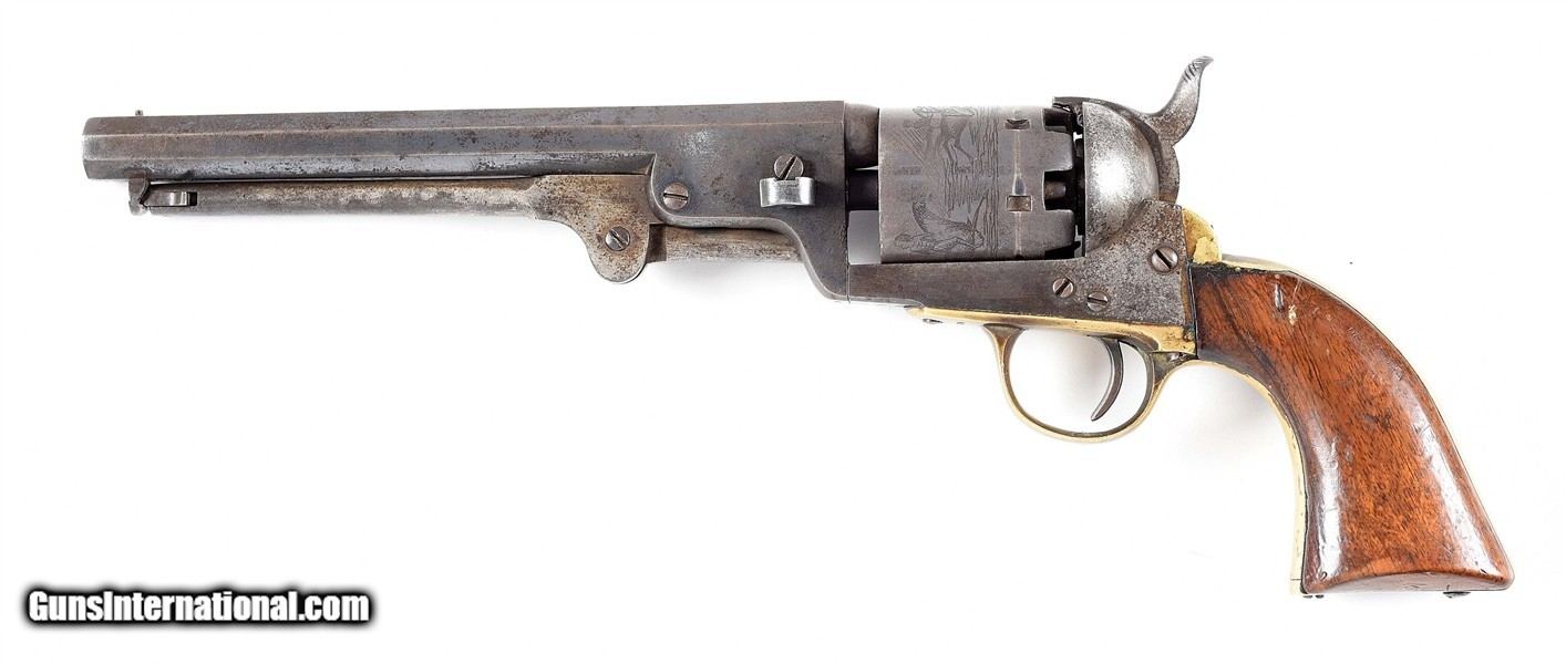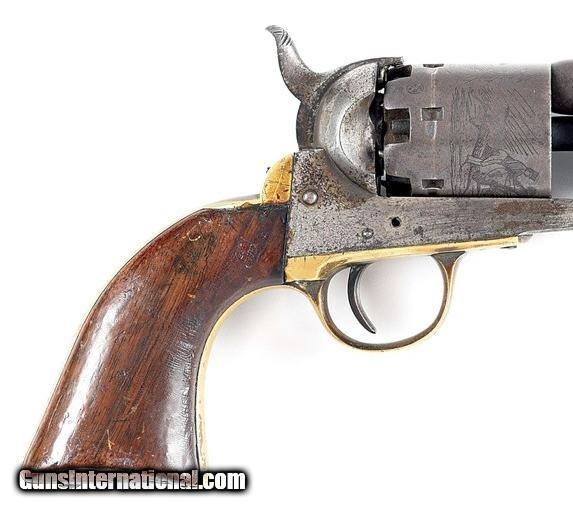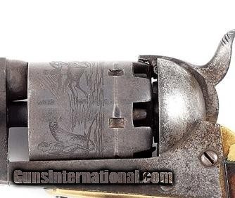 Description: USE FREE N EZ LAYAWAY PLAN. NEVER A FEE!! 25% DWN Then you deside how many payments you wish to make. Here we present an antique Colt 1851 Navy Brevete Revolver, made in the 1850s by Liege gun maker N. Gilon. In 1851 Colt’s patent agent in Liege, William E. Newton, made a deal with multiple Belgian gun makers to manufacture licensed copies of the Model 1851 Navy. Ten francs was the settled upon royalty. Nicolas Joseph Gilon was one of these makers. Several other countries saw licensed copies as well, like Austria and Russian, but typically none as good as the Belgium. With only limited production capabilities at Samuel Colt's factories, numerous European makers began legally and illegally manufacturing revolvers using Colt's patents. Upon inspection at the Liege proofhouse, a royalty was charged and the revolver marked, in this case on the top barrel flat with "COLT PATENT", in addition to the standard Belgian proofs. It is fitted with a 7 - 1/2" .36 caliber blued octagon barrel with brass pin front sight, 6 shot percussion cylinder with "N. GILON" maker mark on face and mounted ranger scene, case hardened frame and loading lever, brass grip straps with round trigger guard, and smooth walnut grips. CONDITION: Very good retaining traces of original finish, especially in protected areas such as the bottom of the barrel, with balance taking on a Very Attractive gray/brown patina. Good shootable bore with strong rifling. Good mechanics. Numbers matching on barrel, frame and trigger guard. This example is one made under license in Belgium (see the Liege stamp on the front of the cylinder) and marked by the maker, N. Gilon. Instead of the typical 1851 cylinder scene of the Texas Navy fighting the Mexican Navy, this specimen reflects a fleeing stag and a pursuing hound with hills and trees in the background. It is a very nice piece, and the grips are stamped with the year “1854”. The bottom of the loading lever is stamped “NG”. Own the original! This is a legitimate antique and not a reproduction. Here is something you will not see every day—licensed and unique versions of Colt’s 1851 Navy! DISCLAIMER: All firearms are sold as collector's items only - we do not accept responsibility as to the shooting safety or reliability of any antique firearm. All firearms are described as accurately as possible. We want Happy heathly satisfied customers. Any city or state regulations regarding owning antique firearms are the responsibility of the purchaser. All firearms are "mechanically sound" unless noted, but again, are NOT warranted as safe to fire! SOLD Antique: Yes |