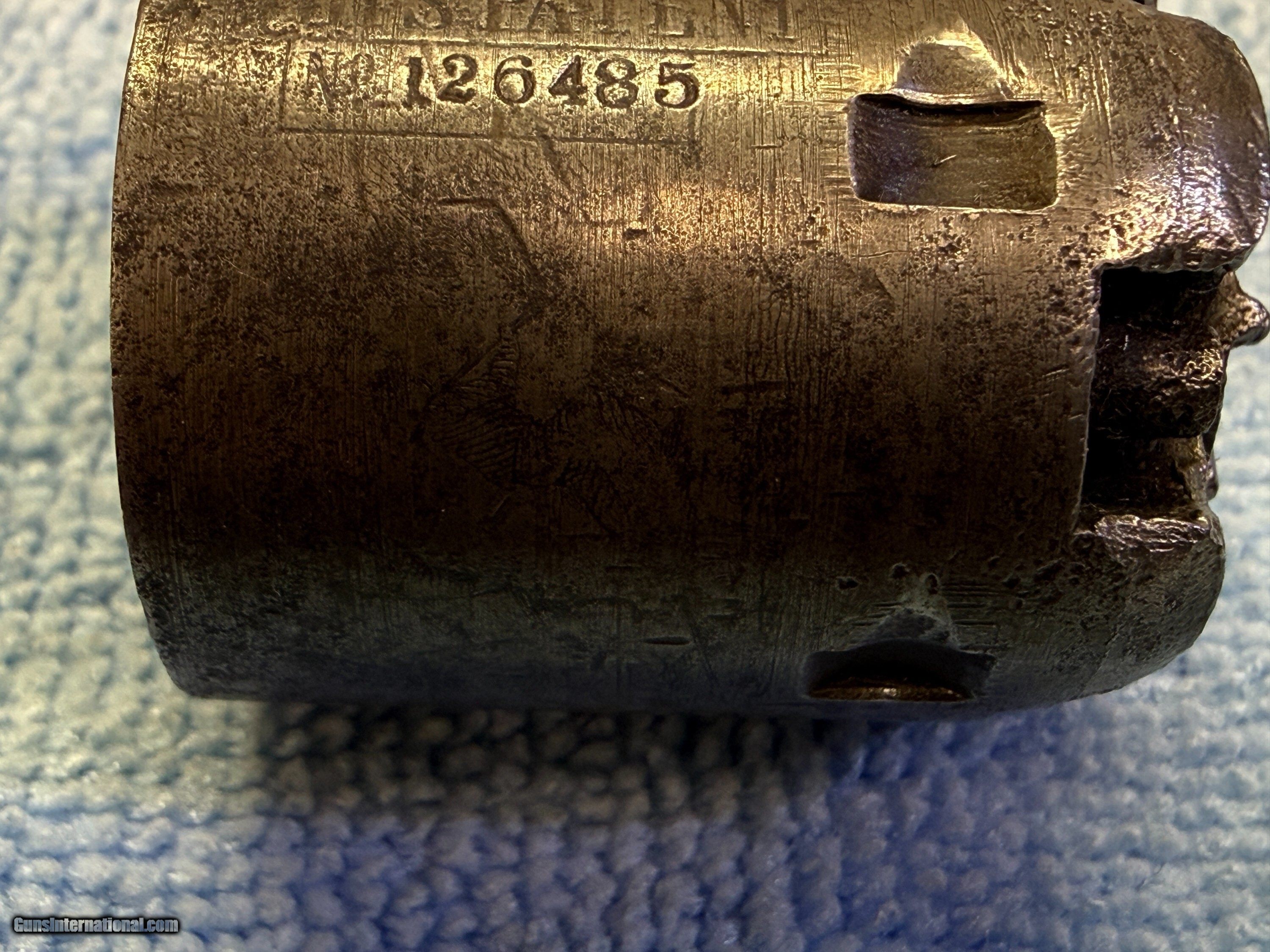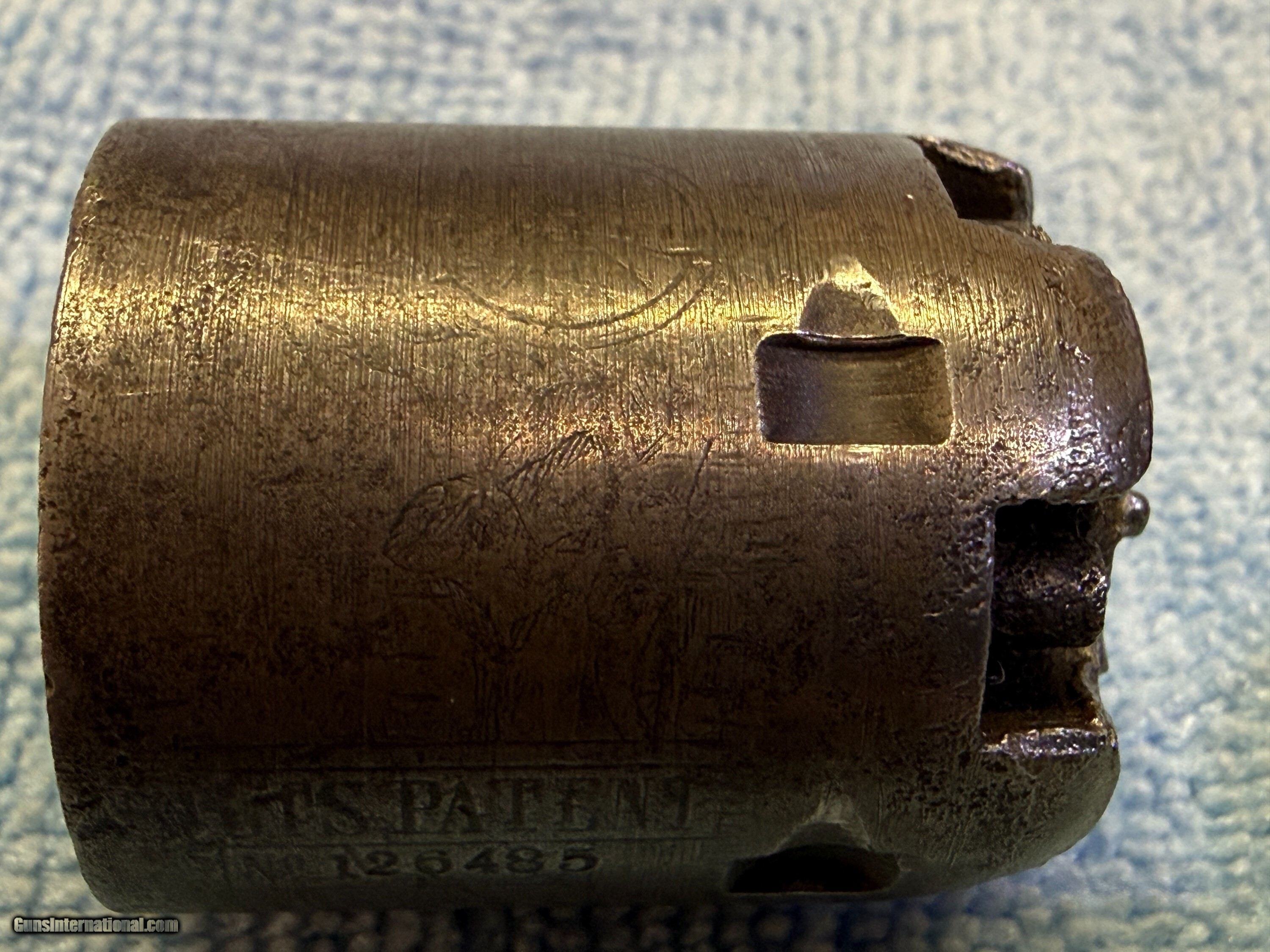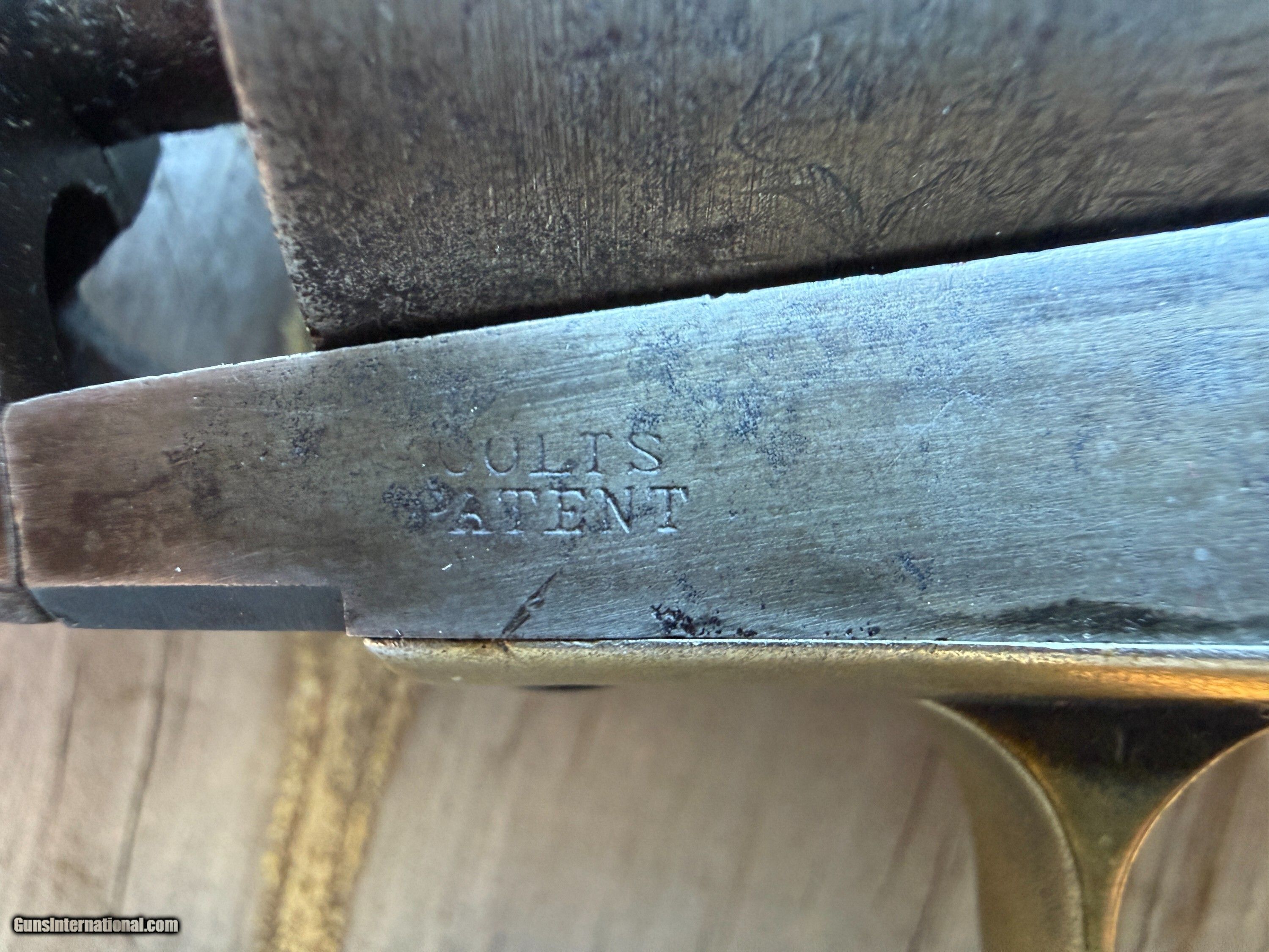 Description: Here we have a Sam Colt model 1849 .31cal percussion revolver. This revolver was manufatured in 1856. The pistol is in good condition, it still has a fair amount of the stagecoach scene on the cylinder and the colts patent is visibleon the left side of the frame and Address Sam Colt New York city on top of the barrel, barrel has some minor pitting with good rifling.