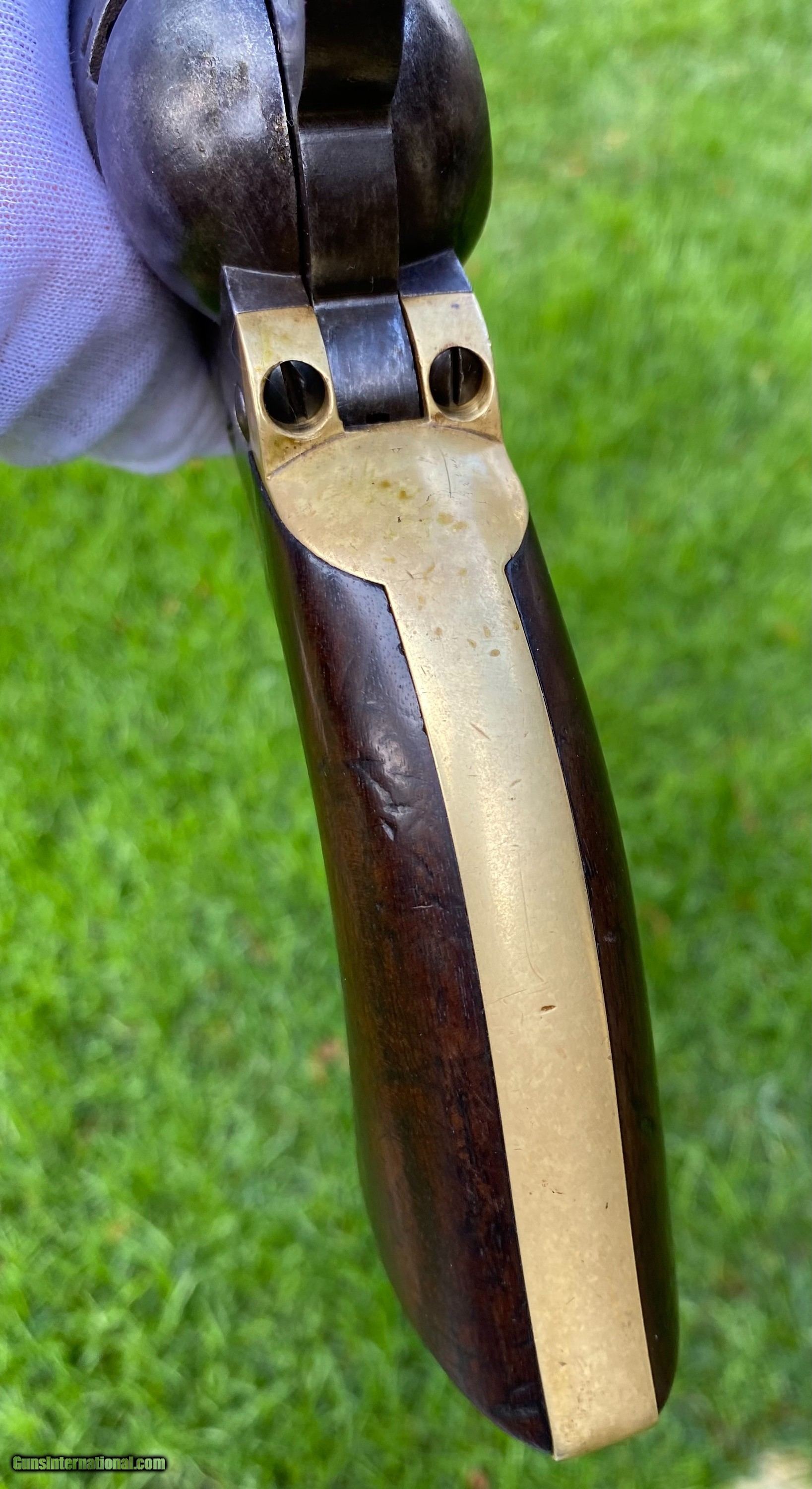 Description: This Martially Inspected Colt 3rd Model Dragoon shows a scarce "US Dragoons" rolled cylinder scene, much scarcer then their USMR counterparts. This example shows a decent amount of the original cylinder scene present. The grip shows faint cartouches on both sides. Matching serial numbers throughout. Mechanically the action needs to be fixed, as it holds on half cock but very rarely will it hold on full. The cylinder doesn't rotate when the hammer is cocked back. That can be fixed fairly easily and fairly cheap. A bit scarcer loading lever variation. Small Martial inspectors initials are found throughout. Priced very fairly for a US Dragoons cylinder scene example! Shipping method can be chosen by the buyer. Buyer to pay actual shipping cost plus insurance. Thank you! Asking: $6,500.00 Sale Pending SOLD Antique: Yes |