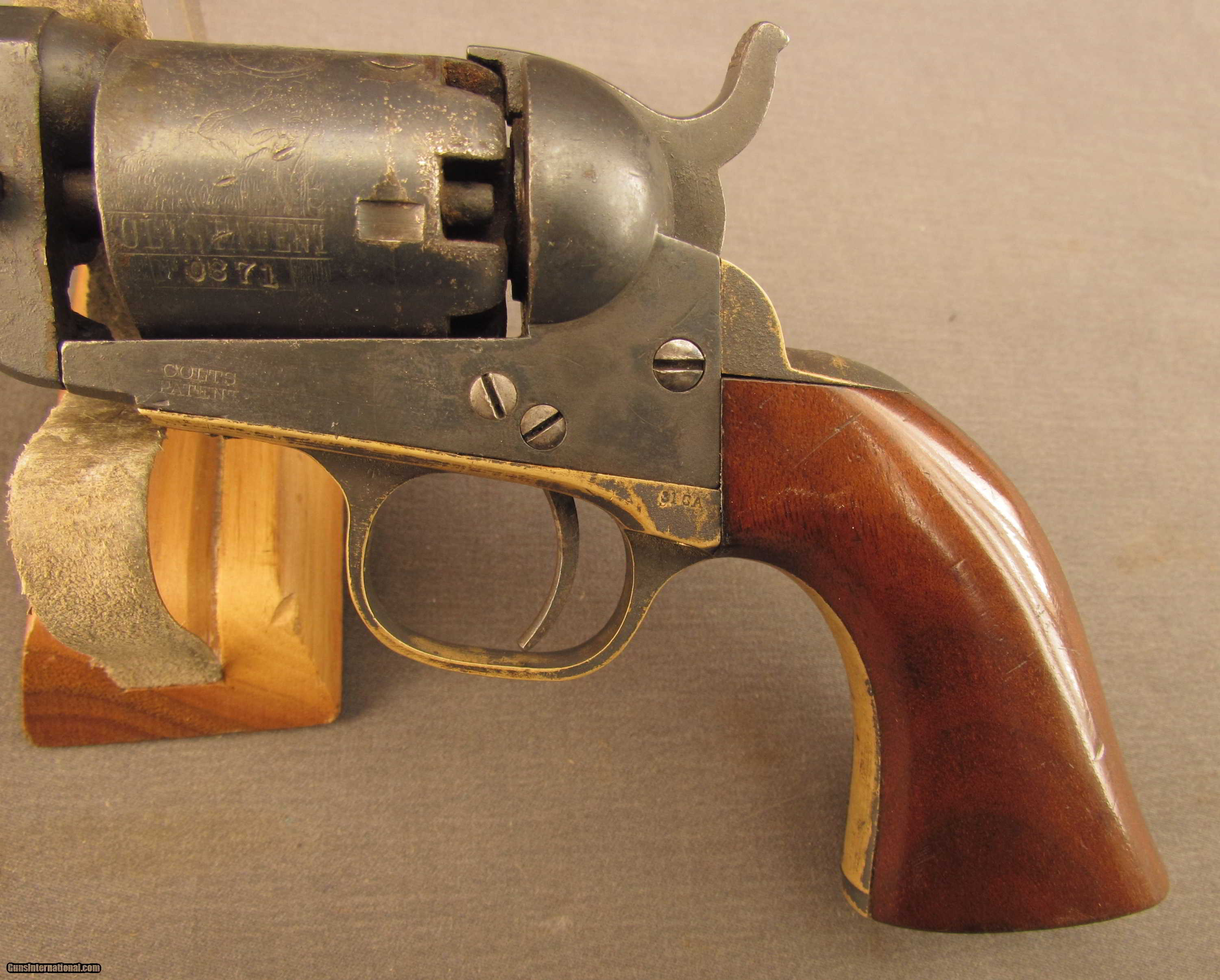 Description: Serial #300871, .31 caliber, 4" octagon barrel with a good bore that has some dark freckling and pitting within the grooves. This revolver was made in 1868 and has matching numbers on the frame, barrel, cylinder, arbor, wedge, triggerguard, and backstrap. The metal retains 85-90% of the original full silver-plated finish (now turned to a dark blue-black patina throughout) with some flaking along the edges and spots of dark freckling and pinprick pitting at the muzzle. The cylinder likewise has some bubbling of the silver plate with some further pinprick pitting around the nipples. Evidently, the revolver was loaded and forgotten about because all six chambers are filled with period conical bullets that have varying amounts of impact damage at their noses. The brass has about 40-50% of the original silver remaining in darkly tarnished patches, and has a pale yellow-ochre patina where the underlying metal is exposed. The one-piece grip has most of the original piano varnish finish remaining with a few scattered handling marks and blemishes, most noticeably a diagonal impact mark that carries onto the gripstrap on the underside just behind the triggerguard bow. The lock-up is still tight and the revolver rates fine-near excellent overall. It is a simply splendid, and unusual, example of a silver-plated '49 Pocket. We have contacted Colt on this little revolver and they have no record available. All evidence points to this being a factory silver finish. Antique SOLD Antique: Yes Manufacturer: Colt Model: 1849 Serial Number: 300871 Caliber Info: .31 Cal Gauge Info: .31 Cal |