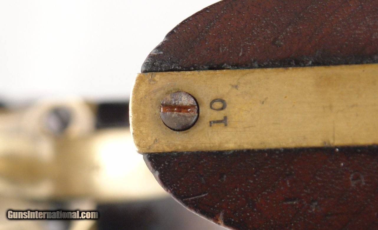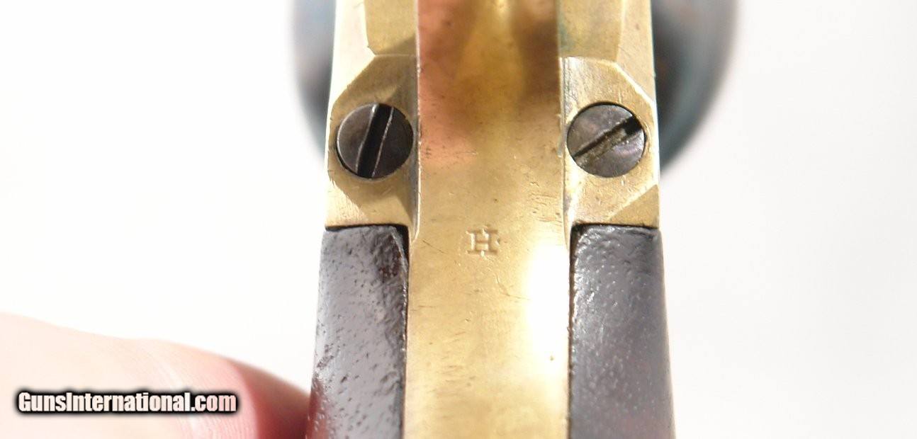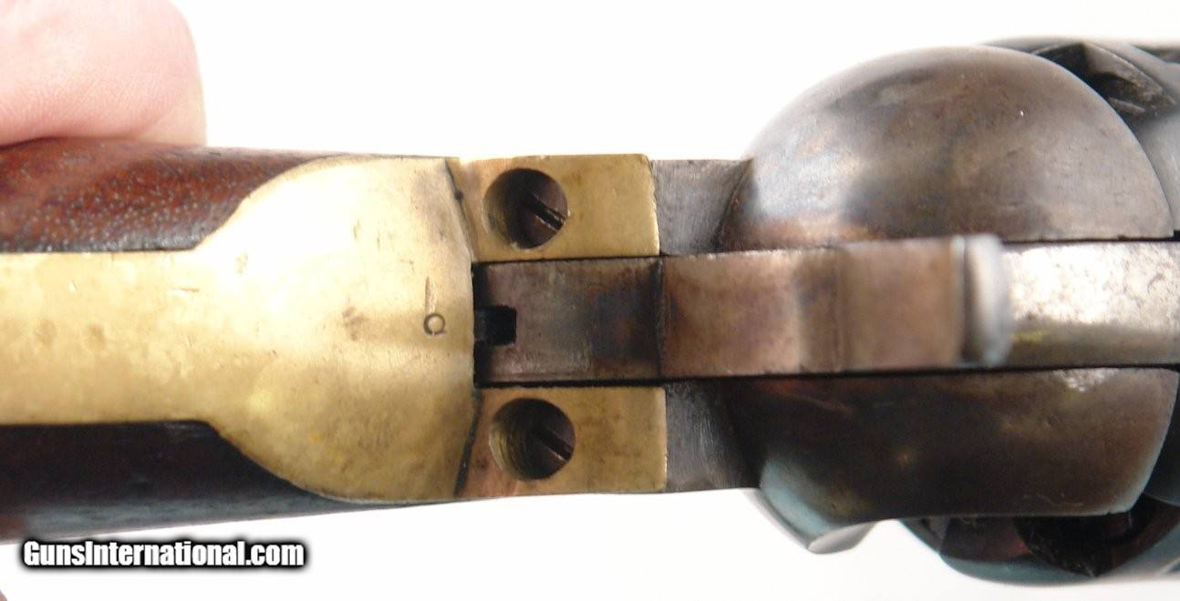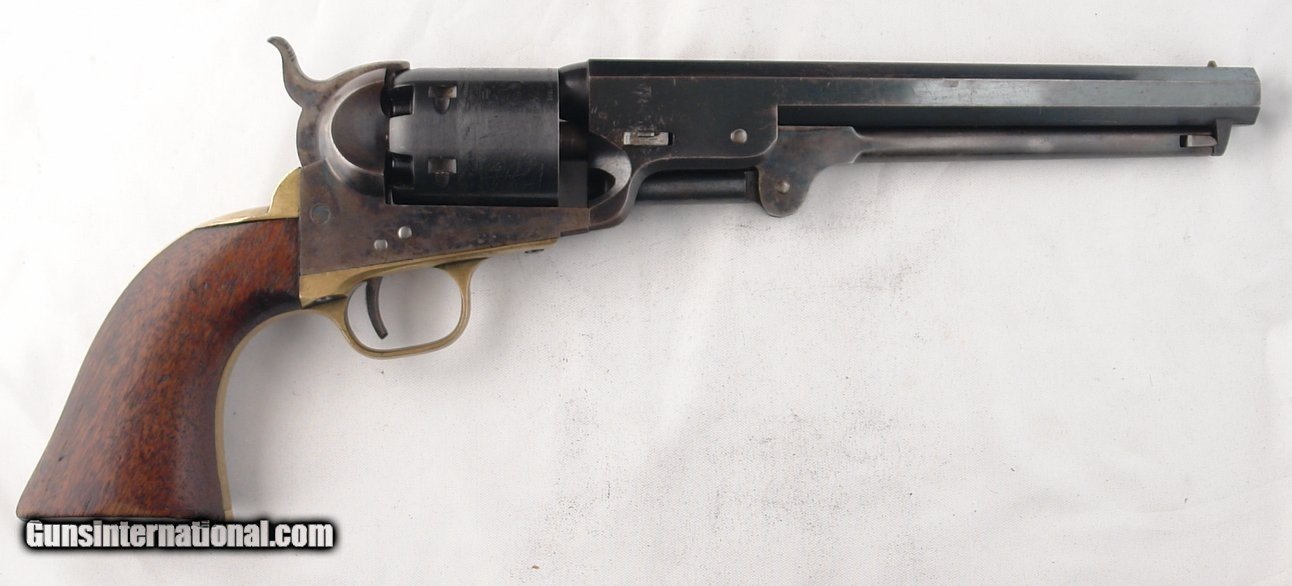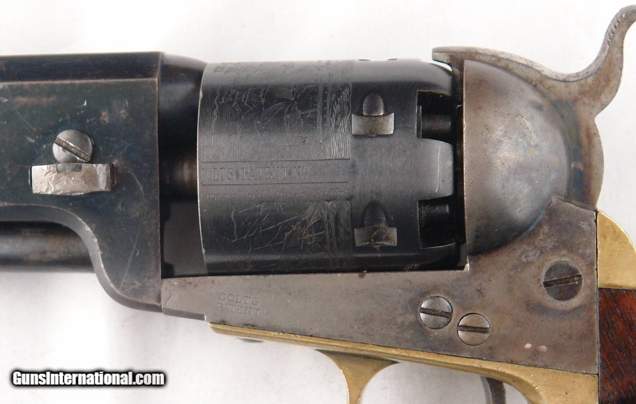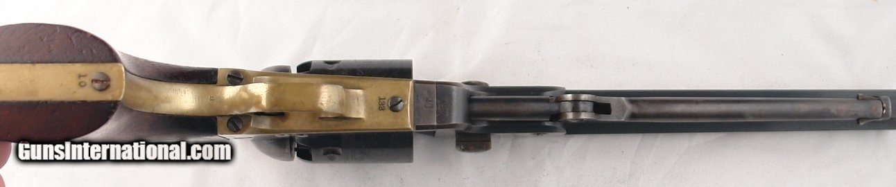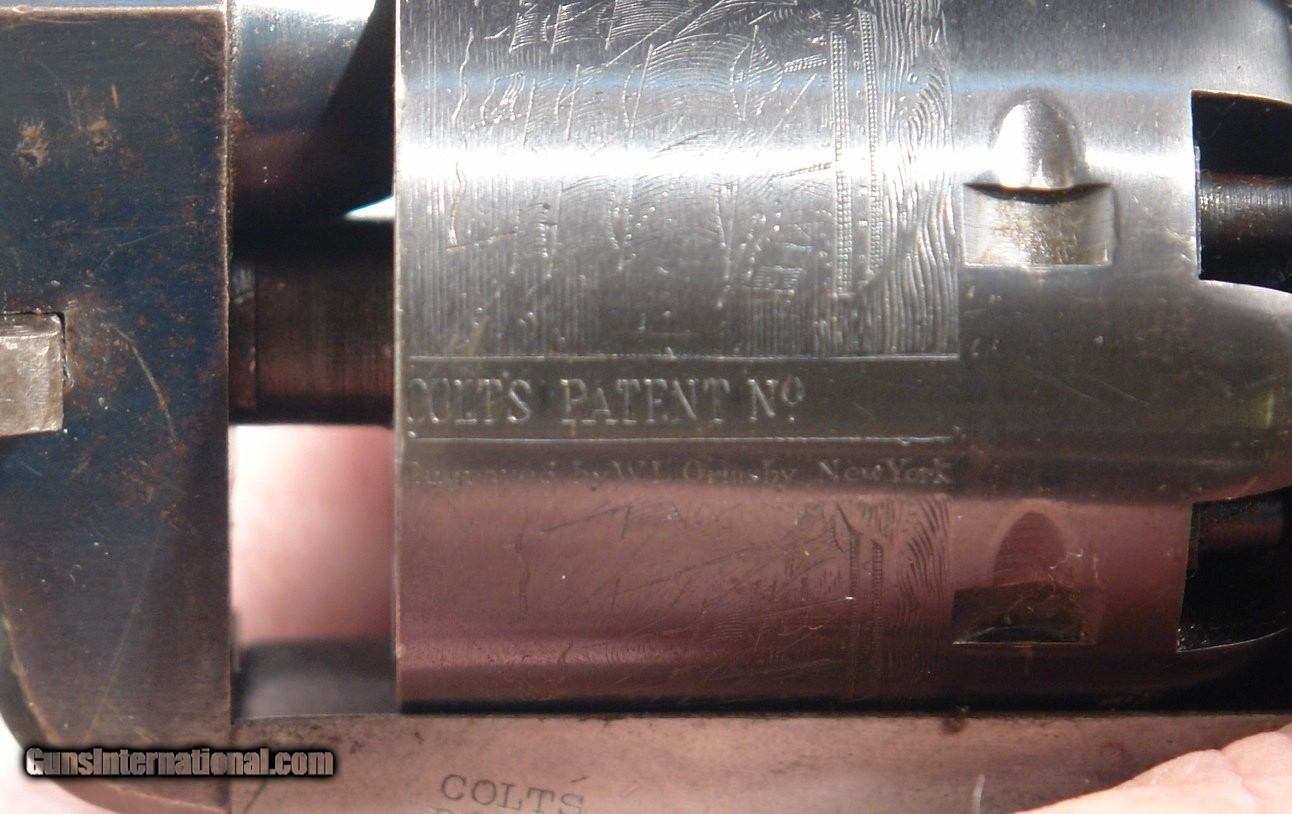 Description: ULTRA RARE COLT U.S. MODEL 1851 PERCUSSION .36 CAL. “1 OF 100” NAVY REVOLVERS SERIAL # 20. 6 shot with 7 ½” barrel with one line “NEW YORK U.S. AMERICA” address. Extensively discussed in Nathan L. Swayze’s venerable book “’51 COLT NAVIES” in the chapter entitled “1 OF 100 TEST GUNS” pages 93-97 leaving an open ended conclusion that these mixed numbered very low numbered Navies were originally part of test for the U.S. Ordnance Department on the interchangeability of parts of Colt’s Navy pistol with the parts all below or very near 100. It is certain these were later assembled in mixed number format and subsequently issued or sold circa early 1870’s after the commencement of the cartridge conversion production and purchase by the Ordnance Department. Only a handful known with one other illustrated on page number 95 in the Swayze chapter. One other also low number and with mixed serials was owned by Arnie Chernoff in the 1970’s. Note that most of the major parts on these Navies are Ordnance inspected with supplemental parts uninspected original Colt 1871-2 era replacements as is the cylinder on this example. Otherwise the frame is #20, back strap #10, barrel #18, trigger guard #133, wedge #1113, and lever un-numbered as it should be for the late series 1871-2 Navy. Beautiful excellent plus condition with most of the original factory blue and case colors. Perfect markings with circa 1870-2 larger “COLTS/PATENT” frame stamp and late series barrel address. 100% cylinder scene on the late replacement cylinder with the larger cylinder stops and longer ramps as used on the conversions. Excellent bore and working order. Rare and interesting Martial 1851 Colt Navy. SOLD Antique: Yes Handgun Caliber: .36 |