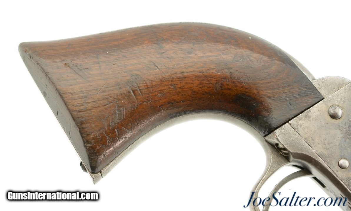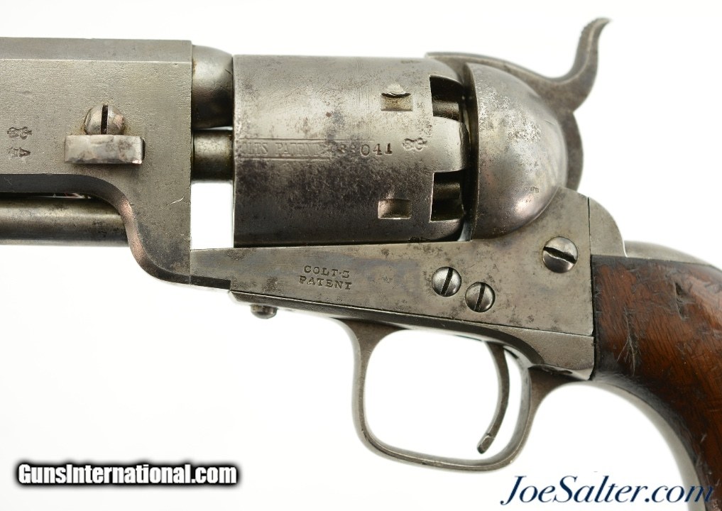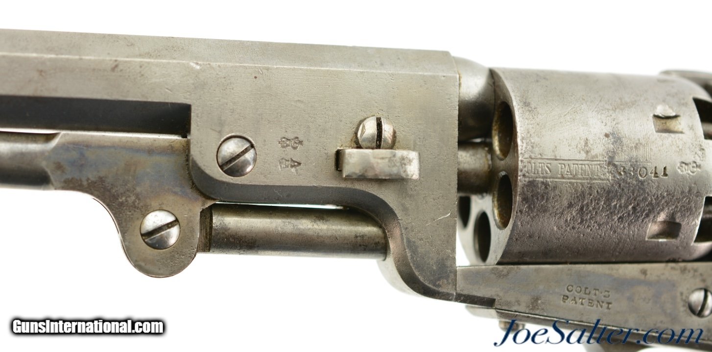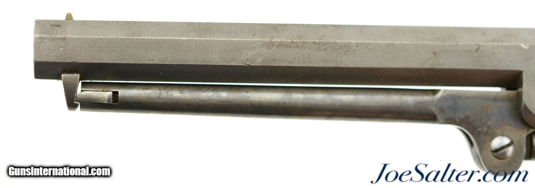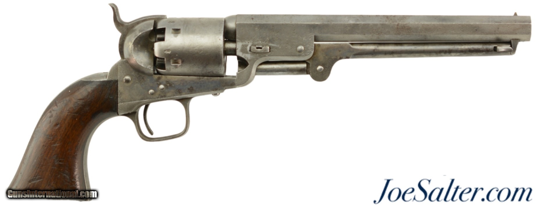 Description: Serial #33041, .36 Caliber, 7 1/2" octagon barrel with an excellent, bright bore. This is an 1855-made revolver that has an overall pewter gray patina, with some scattered areas of freckling, as well as some areas of pinprick pitting on the rear of the cylinder, hammer nose, and forward edge of the recoil shield. Original muted color case-hardening is still present on the sides of the frame and protected portions of the loading lever. All numbers, except for the wedge (in common with nearly all extant UC marked ‘51 Navies), are matching. The walnut grip has numerous small handling marks throughout on both sides. The left side of the grip has legible Canadian Militia markings: "UC / F / 48" (Upper Canada / Troop F / Gun #48). This corresponds to Canadian Militia troops based in an around Cornwall, Ontario. The lock-up is tight, and the action functions flawlessly. This is a very good-near fine example of an Upper Canada ‘51 Navy, and would make a great addition to any collection. Antique SOLD |