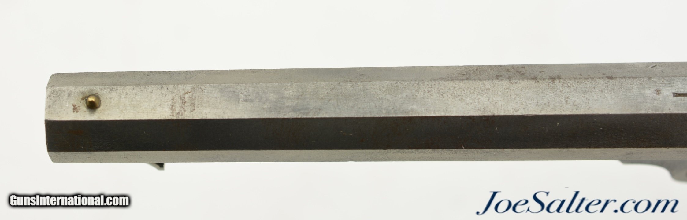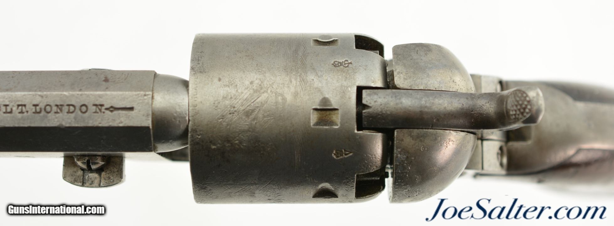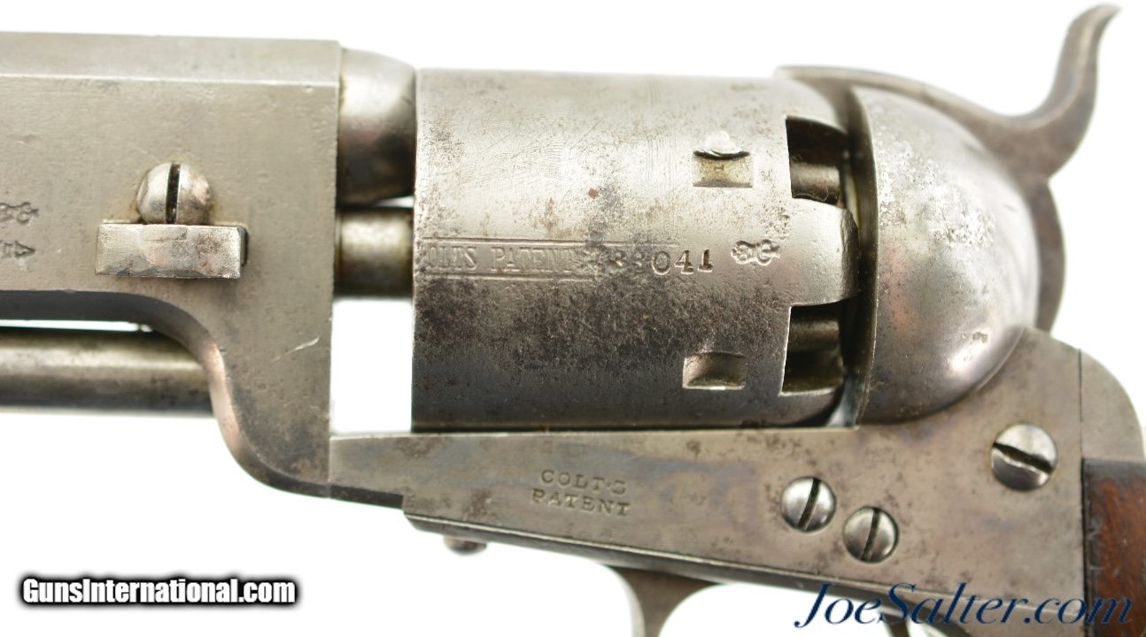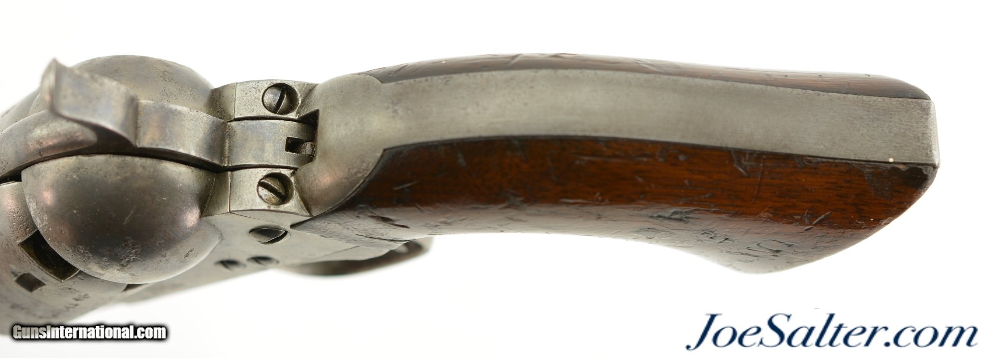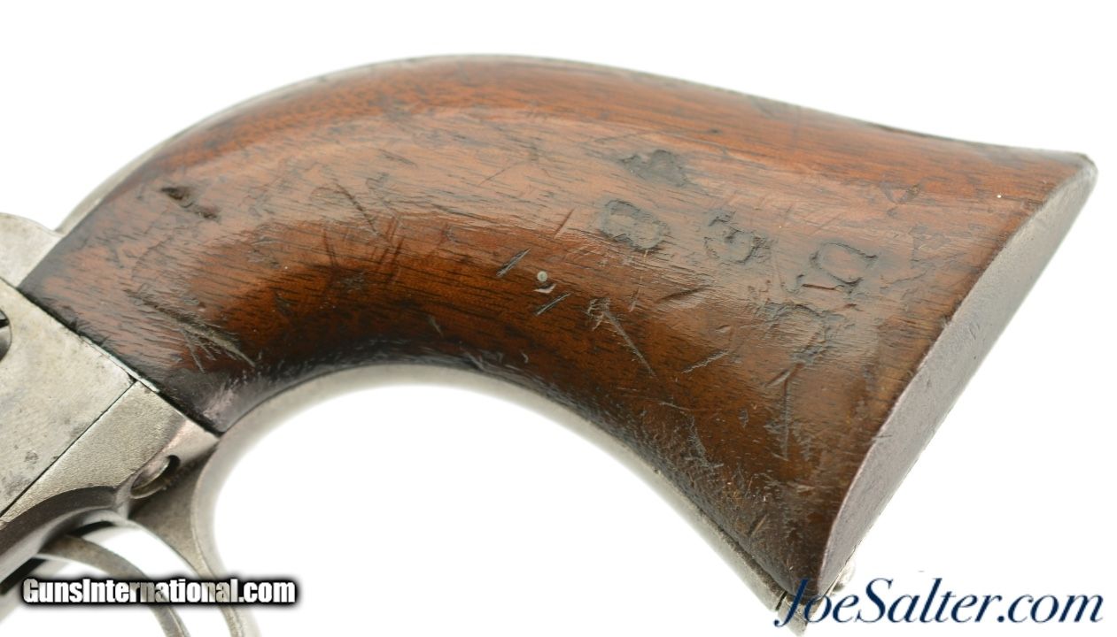 Description: Serial #33041, .36 Caliber, 7 1/2" octagon barrel with an excellent, bright bore. This is an 1855-made revolver that has an overall pewter gray patina, with some scattered areas of freckling, as well as some areas of pinprick pitting on the rear of the cylinder, hammer nose, and forward edge of the recoil shield. Original muted color case-hardening is still present on the sides of the frame and protected portions of the loading lever. All numbers, except for the wedge (in common with nearly all extant UC marked ‘51 Navies), are matching. The walnut grip has numerous small handling marks throughout on both sides. The left side of the grip has legible Canadian Militia markings: "UC / F / 48" (Upper Canada / Troop F / Gun #48). This corresponds to Canadian Militia troops based in an around Cornwall, Ontario. The lock-up is tight, and the action functions flawlessly. This is a very good-near fine example of an Upper Canada ‘51 Navy, and would make a great addition to any collection. Antique SOLD |