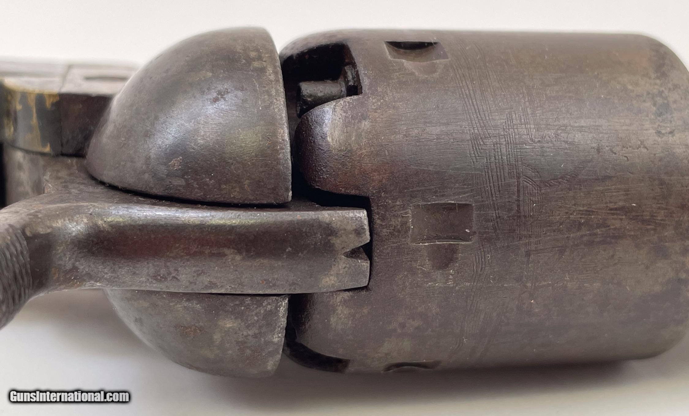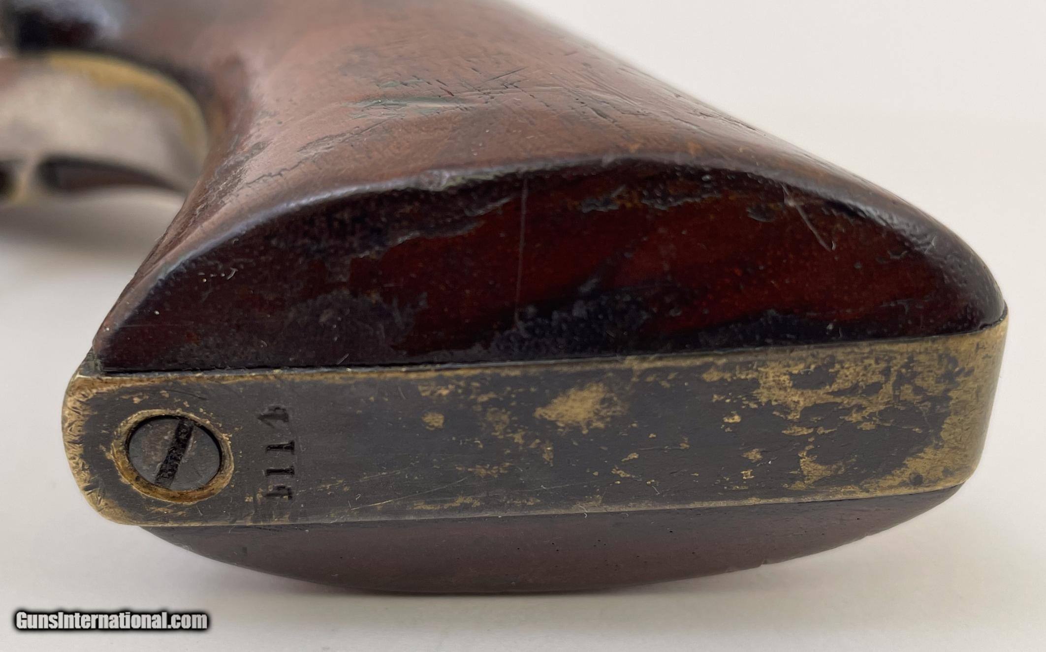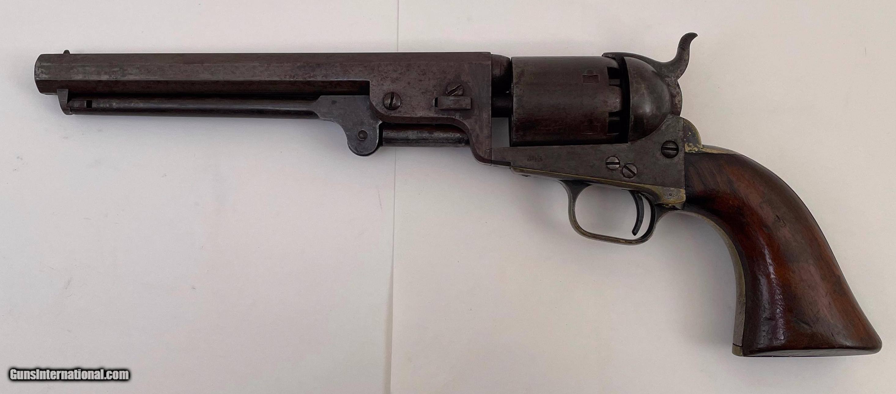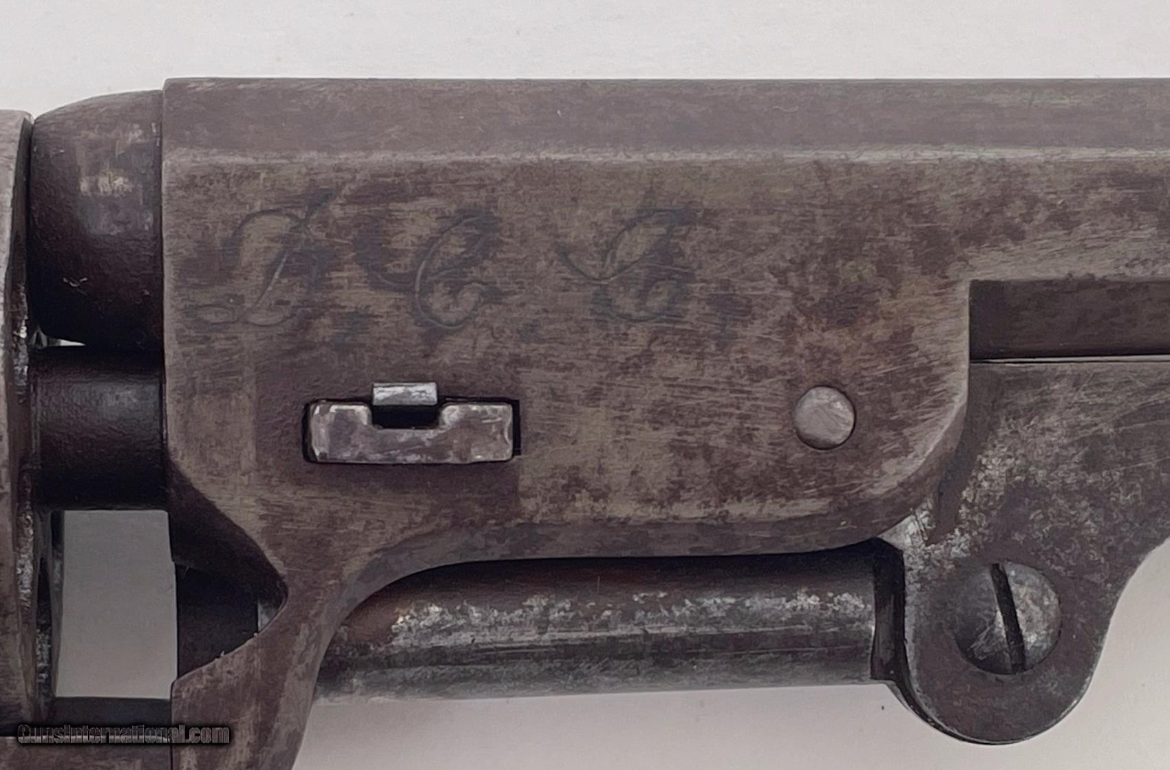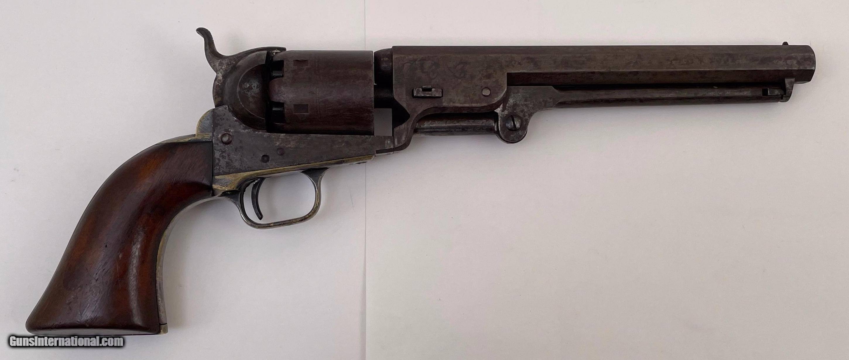 Description: This gun was produced in 1851 during the overlap period when Colt was still producing some 2nd Model Squareback Navies at the same time as the early 3rd Model guns. The letters" D C C " are engraved on the right barrel lug. See photos for condition. SOLD Antique: Yes Handgun Caliber: .36 Manufacturer: Colt Model: 1851 Navy Serial Number: 4114 Barrel Length: 7.5 |