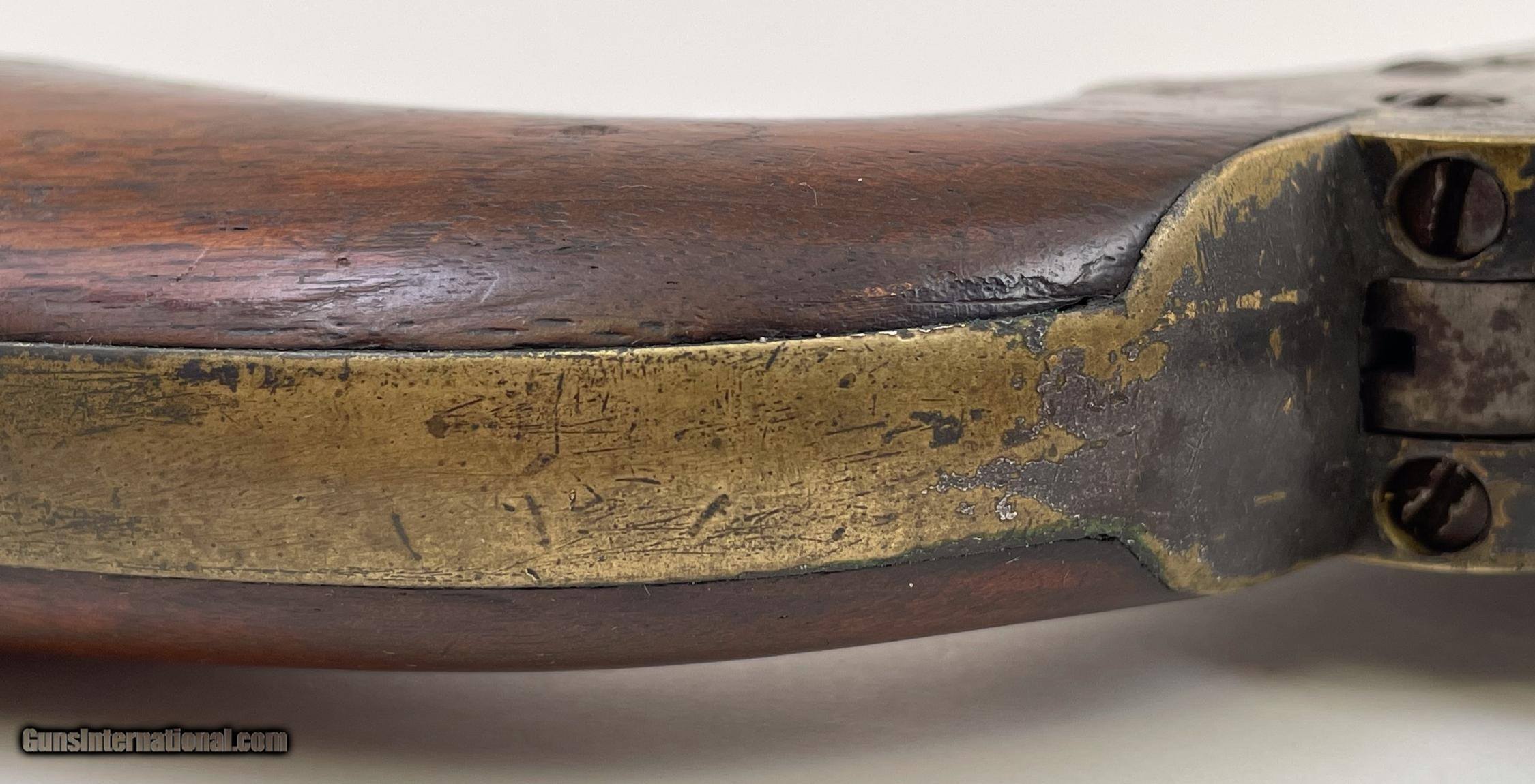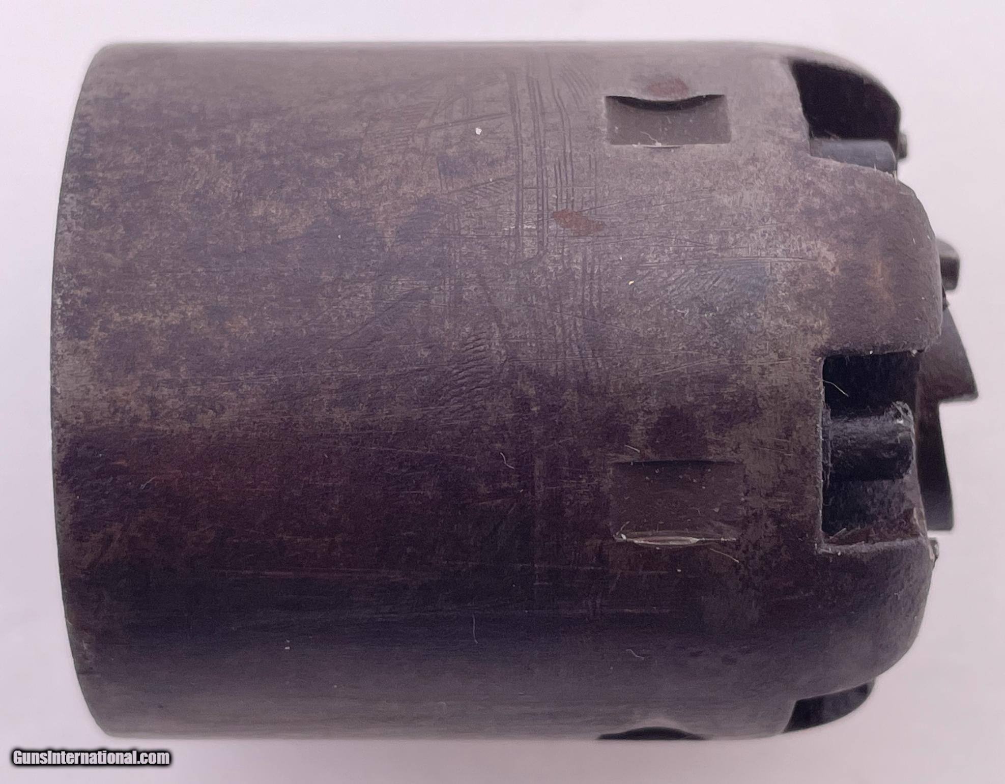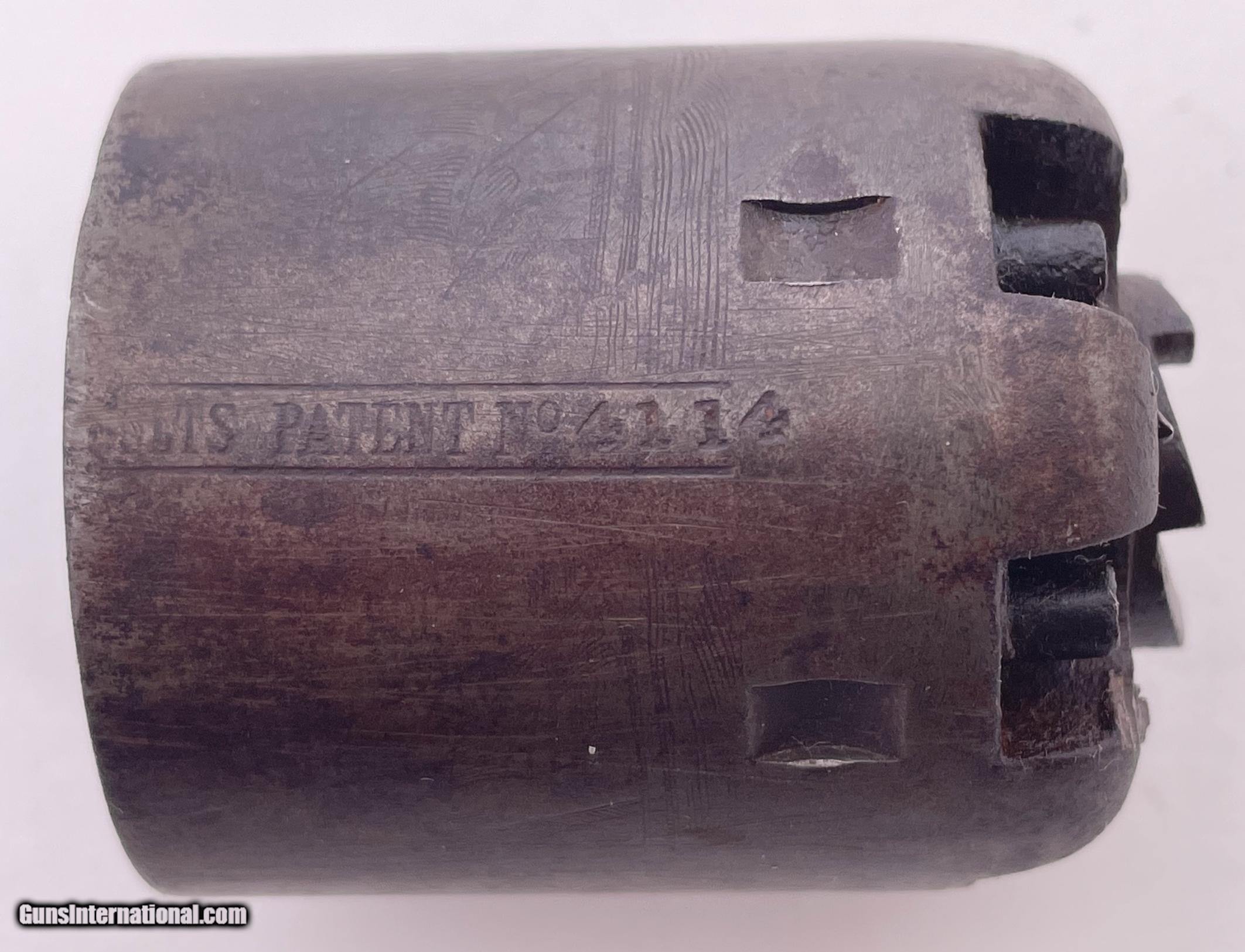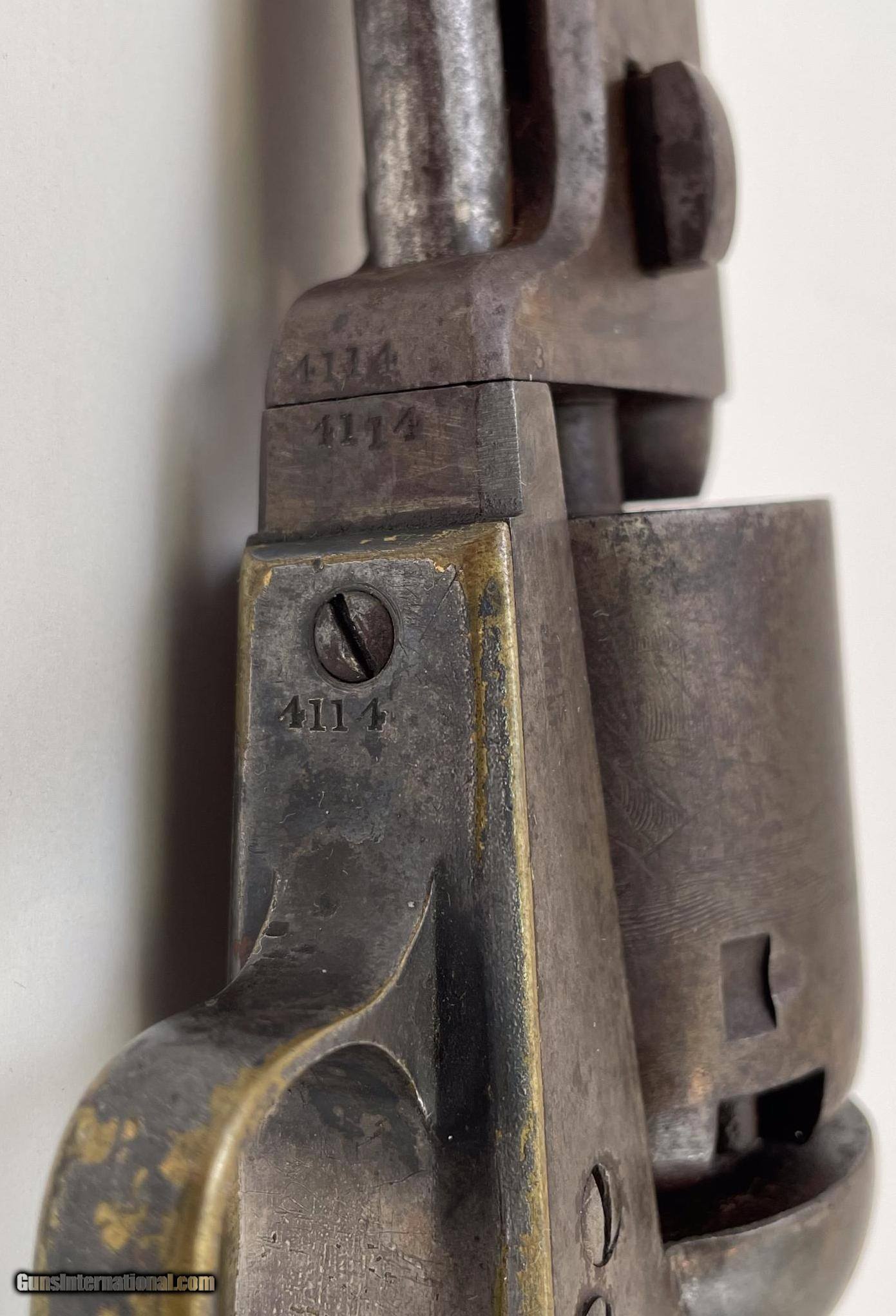 Description: This gun was produced in 1851 during the overlap period when Colt was still producing some 2nd Model Squareback Navies at the same time as the early 3rd Model guns. The letters" D C C " are engraved on the right barrel lug. See photos for condition. SOLD Antique: Yes Handgun Caliber: .36 Manufacturer: Colt Model: 1851 Navy Serial Number: 4114 Barrel Length: 7.5 |