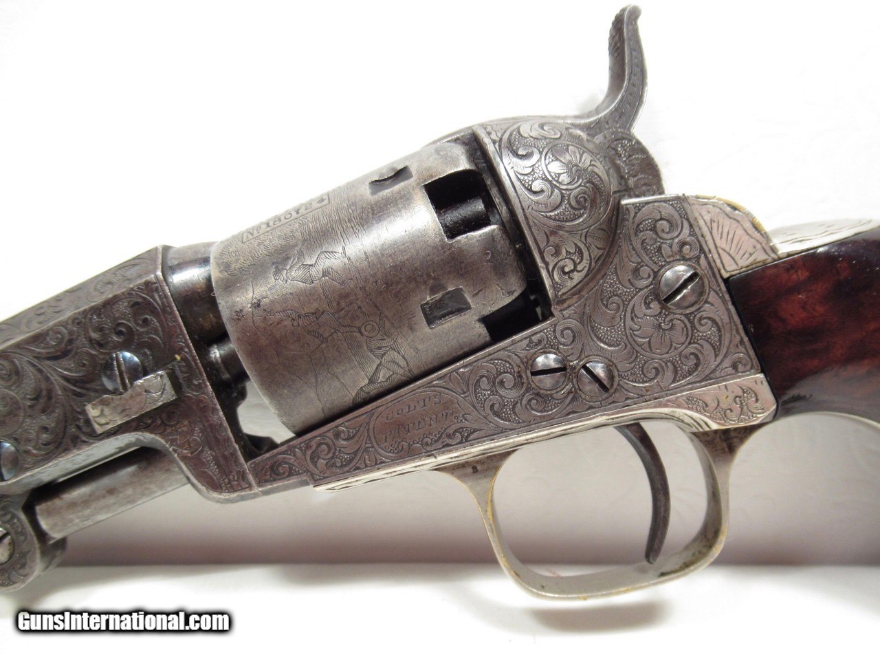 Description: Colt 1849 Pocket Model Revolver; Serial No. 180724; 5-Shot .31 Caliber with Scarce 4” Barrel; Made 1860; Probable Civil War Use; Gustave Young Engraved; Most of the Original Metal Finish Remains; All Original Varnish Remains on Burl Walnut Grips; Cylinder Scene Near 100%; Perfect Action and Bore; All Numbers Match except wedge is numbered 0721 (Factory Error) which is Engraved; Scarce Very Fine 161 Year-Old Civil War Era Colt Revolver; See All Photos for Condition; No Texts; Call (254)541-5765 or Email Only; PERSONAL PROPERTY of Harold Wieser; Price: $7,975 + $45 S&H Via USPS PRIORITY MAIL; Payment Address: Harold Wieser - 1466 U.S. Hwy 77 - Rosebud, TX 76570; SEND PAYMENTS VIA USPS PRIORITY MAIL; BEWARE of SCAMS!!! – DO NOT SEND MONEY or CORRESPONDENTS ELECTRONICALLY UNLESS YOU HAVE SPOKEN to HAROLD WIESER FIRST! 254-541-5765 SOLD Antique: Yes Manufacturer: Colt Model: 1849 Pocket Serial Number: 180724 |
