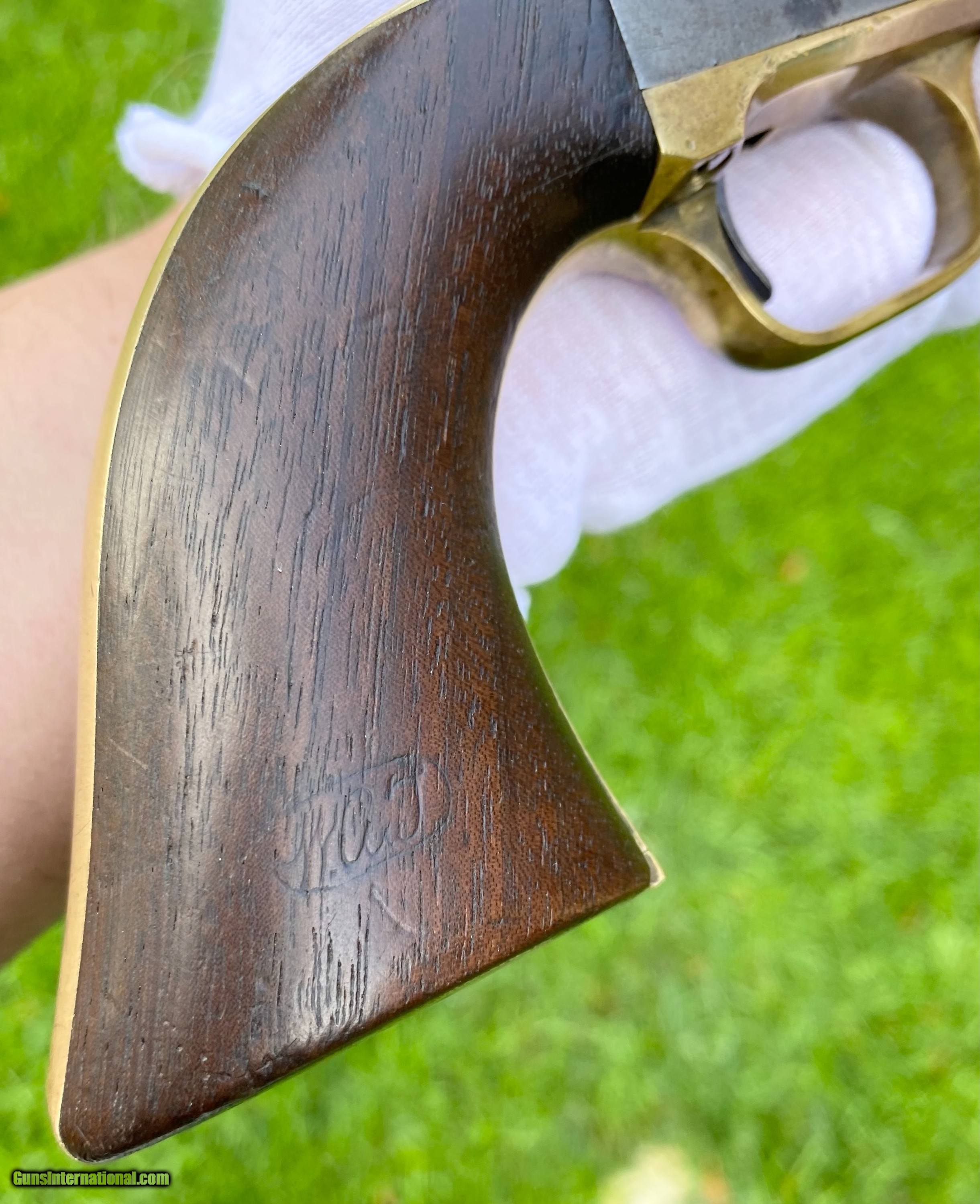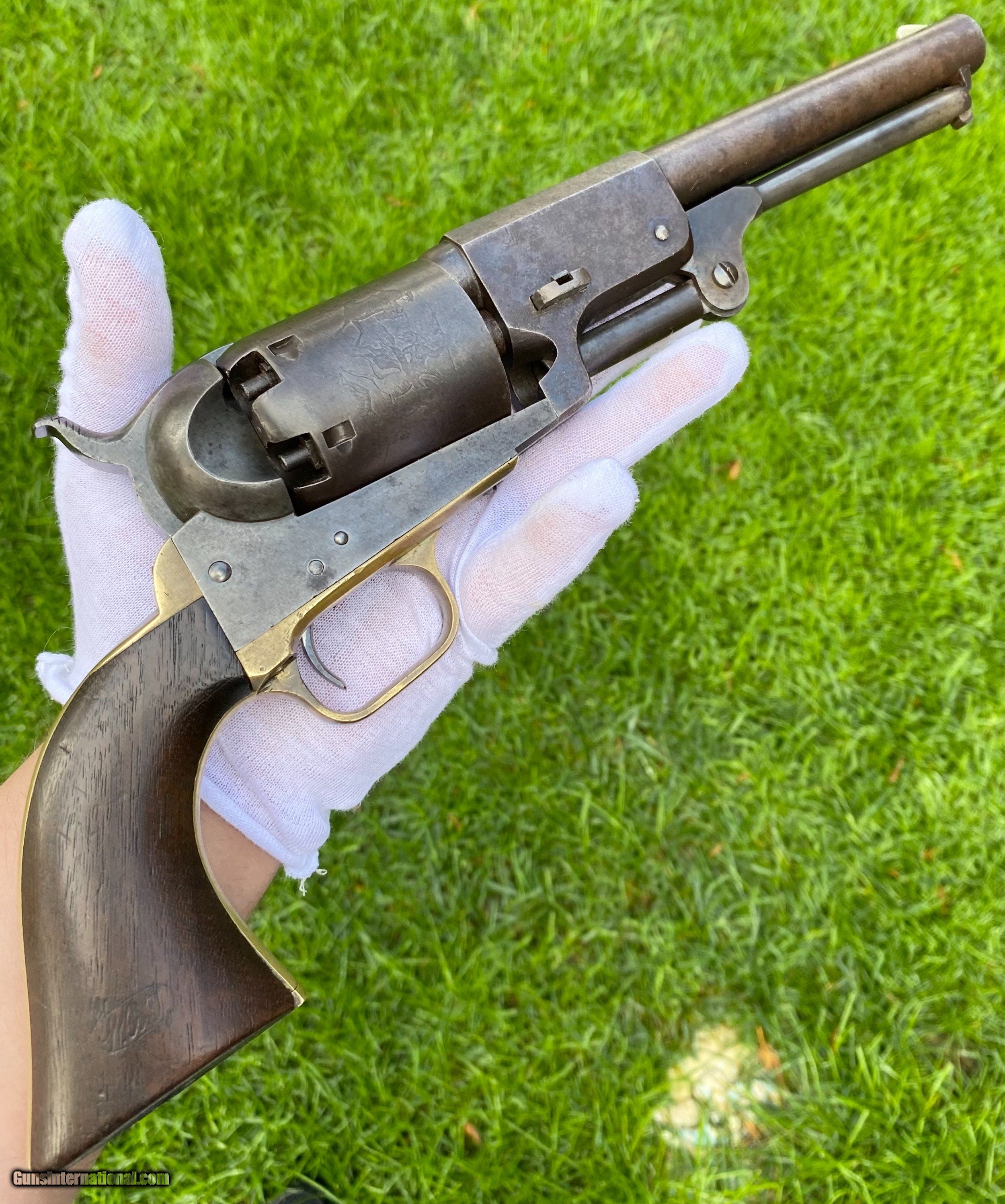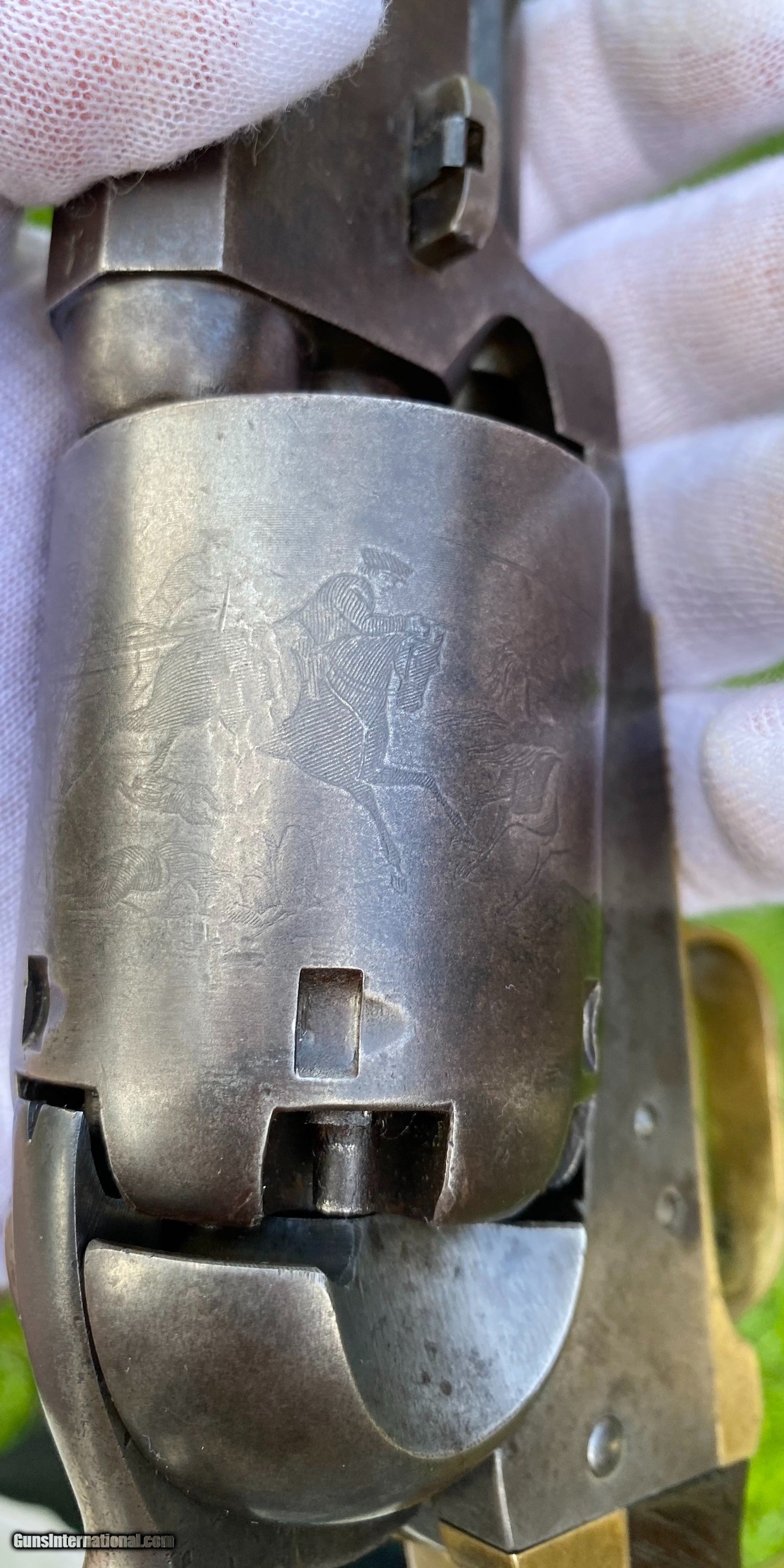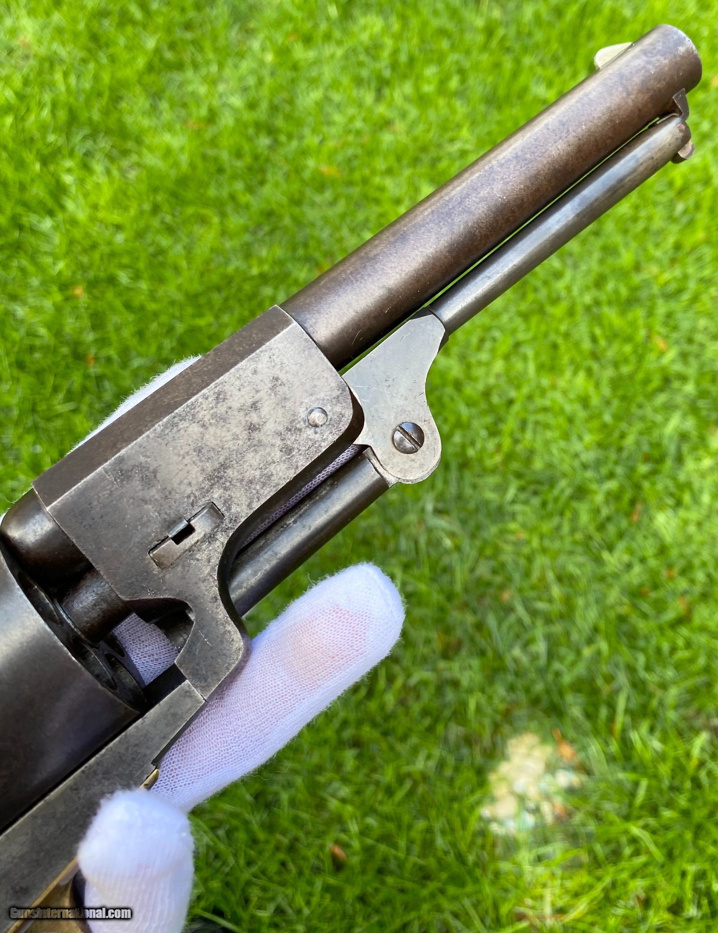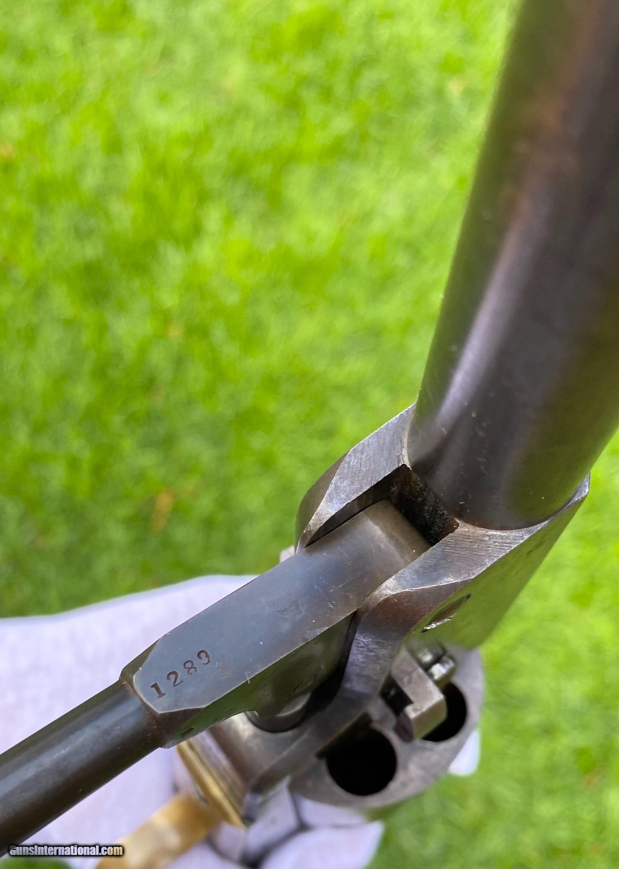 Description: This is an outstanding and completely untouched example of a Martially Inspected Colt 3rd Model Dragoon. This example is exactly how you want to find them, untouched and fine. This example wouldn't be considered a high condition gun, but if it was it would be over $100,000. This is the next best thing, absolutely untouched and original in every way. The finish has just turned to a beautiful patina with finish showing underneath. The barrel still shows plenty of traces of the original blue. The frame shows silvered patterns of the original color case hardened finish. All edges are sharp, as this gun has not been handled much over its life. Bore is very fine condition. Still some blue in the cylinder chambers. The grips are exceptional with 2 fine cartouches. The backstrap and trigger guard show a beautiful mustard patina. The cylinder scene is exceptional and virtually almost all visible. The loading lever shows patterns of original case hardened finish visible. All matching serial numbers throughout. This is an absolutely stunning Dragoon that one could improve upon but for nearly double the price minimum to not get that much better. Buyer can choose shipping method. Buyer to pay actual shipping and insurance cost. Thank you! More photographs are available upon request. Asking $16,500.00 SOLD Antique: Yes |