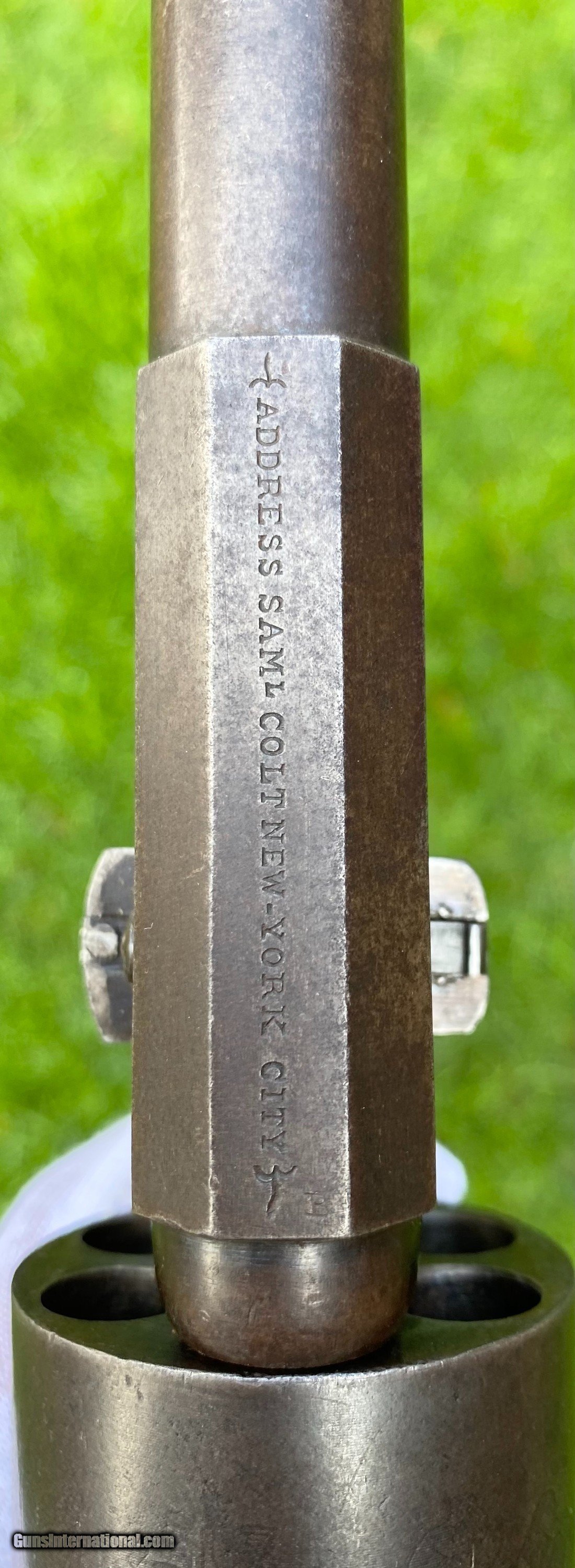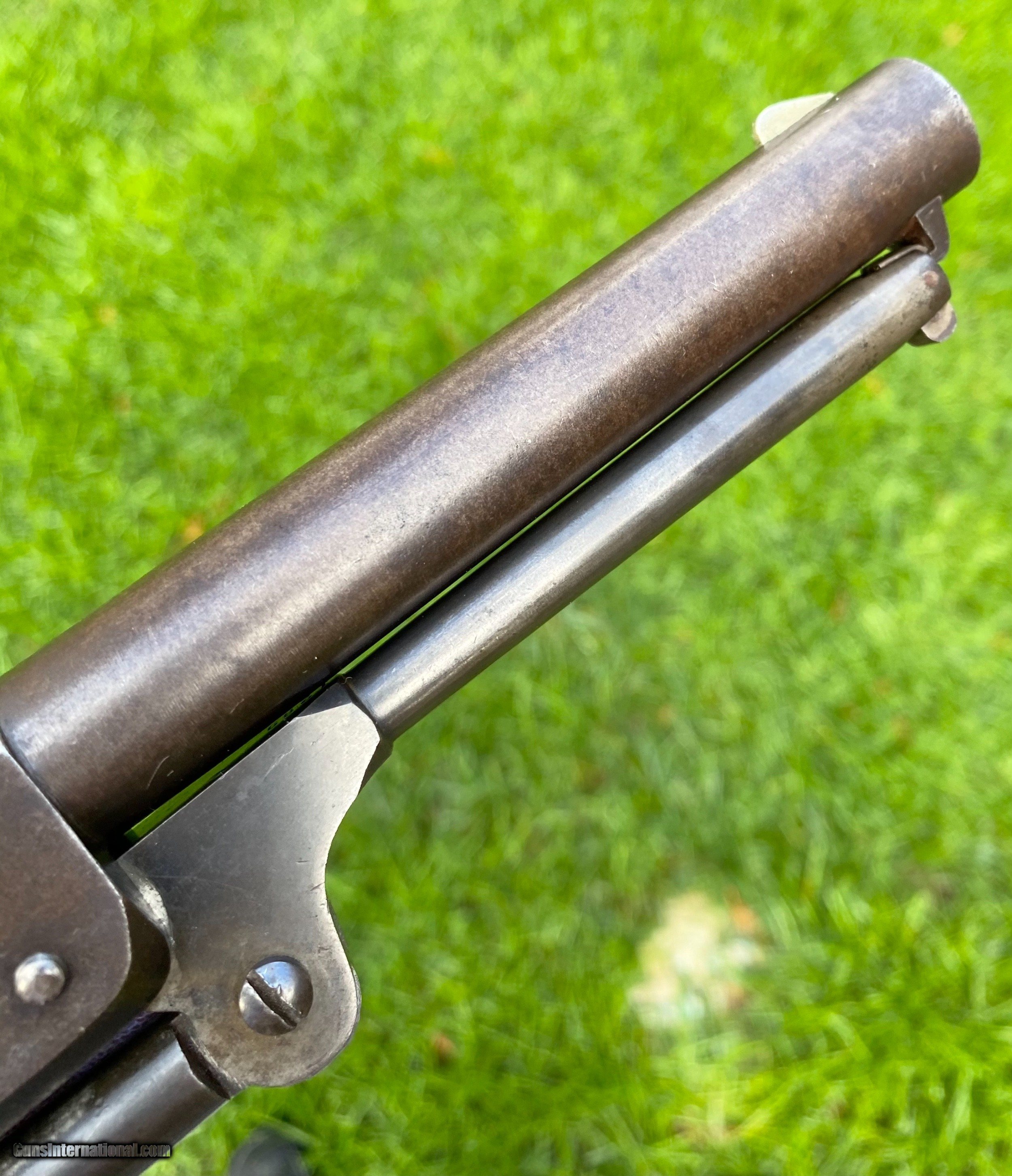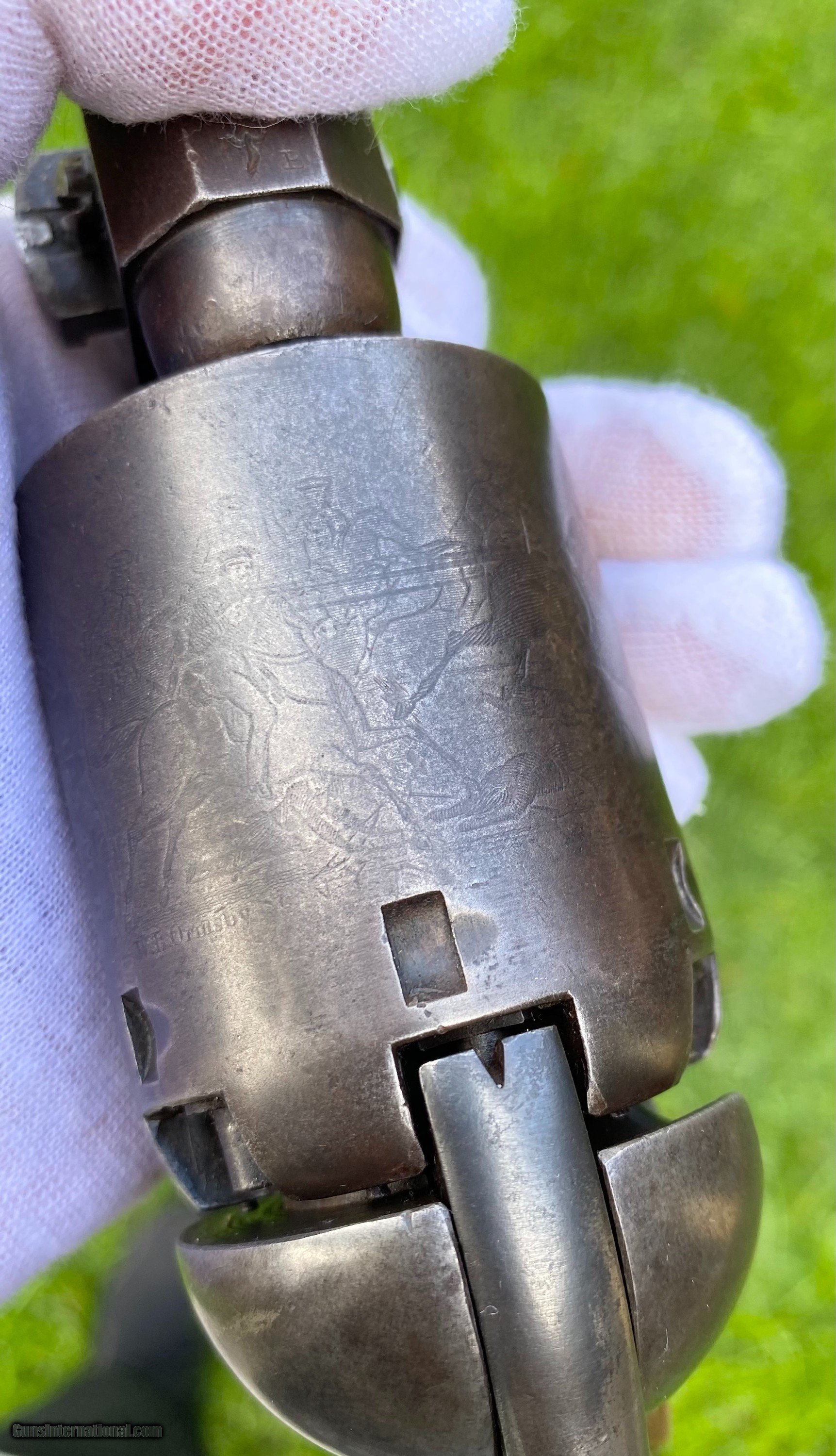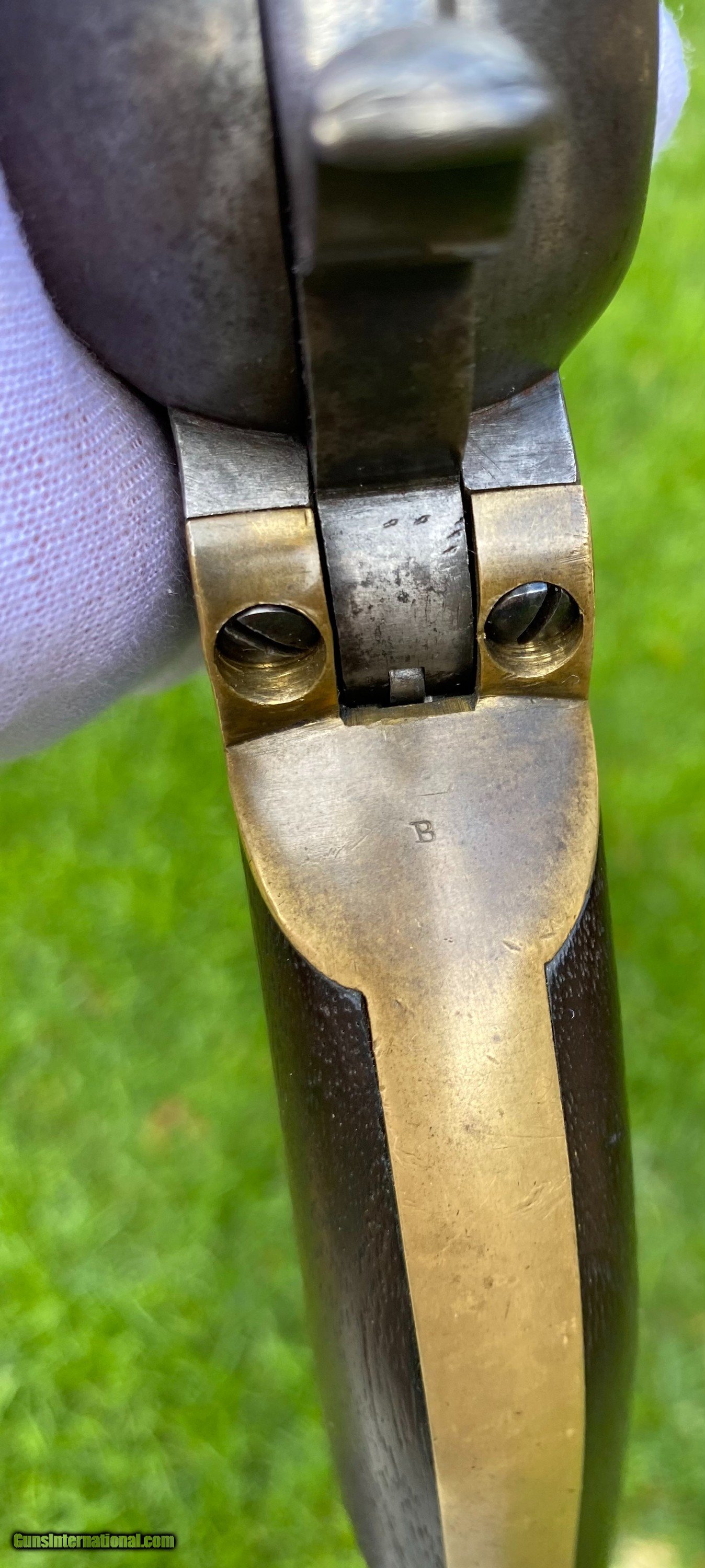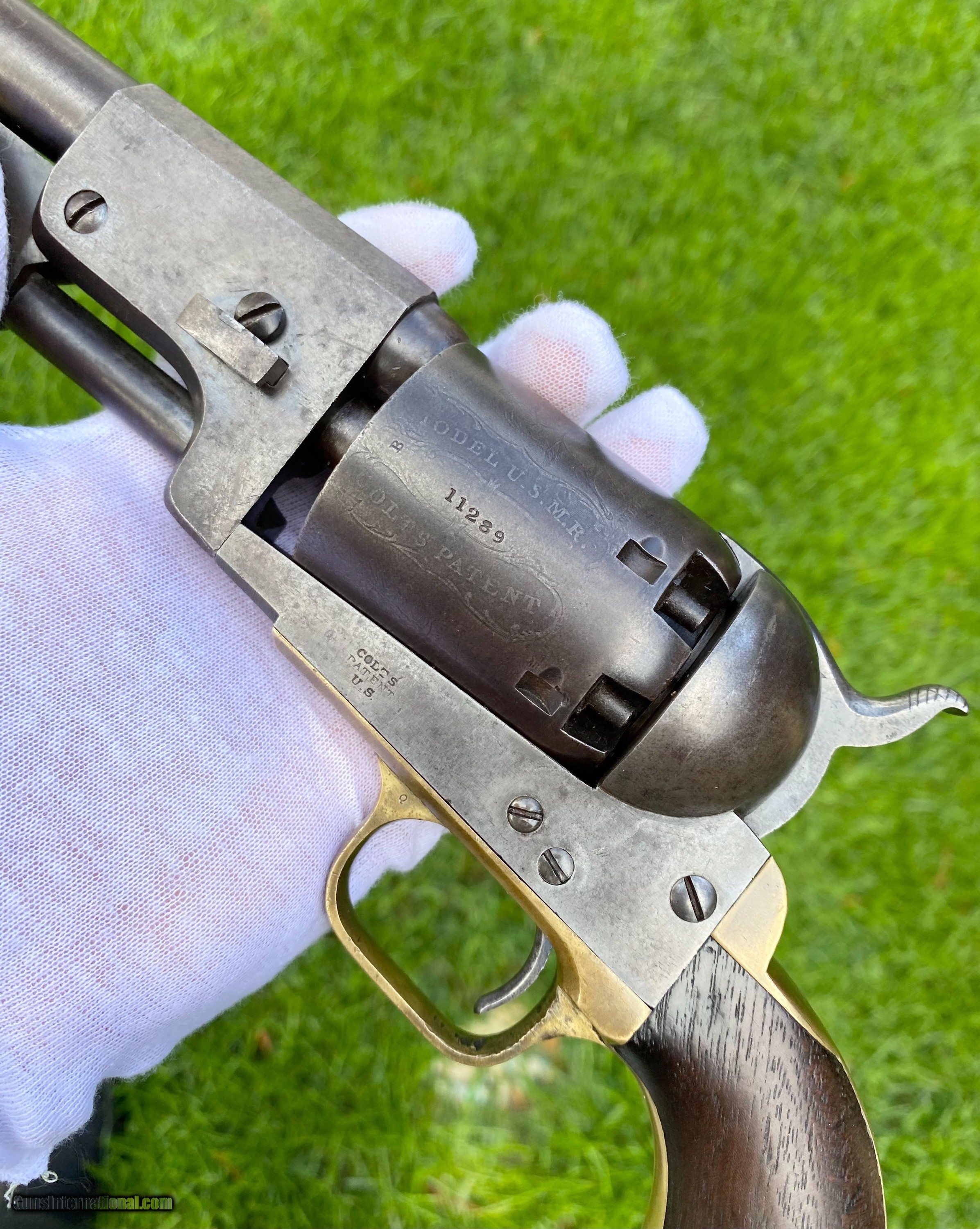Description: This is an outstanding and completely untouched example of a Martially Inspected Colt 3rd Model Dragoon. This example is exactly how you want to find them, untouched and fine. This example wouldn't be considered a high condition gun, but if it was it would be over $100,000. This is the next best thing, absolutely untouched and original in every way. The finish has just turned to a beautiful patina with finish showing underneath. The barrel still shows plenty of traces of the original blue. The frame shows silvered patterns of the original color case hardened finish. All edges are sharp, as this gun has not been handled much over its life. Bore is very fine condition. Still some blue in the cylinder chambers. The grips are exceptional with 2 fine cartouches. The backstrap and trigger guard show a beautiful mustard patina. The cylinder scene is exceptional and virtually almost all visible. The loading lever shows patterns of original case hardened finish visible. All matching serial numbers throughout. This is an absolutely stunning Dragoon that one could improve upon but for nearly double the price minimum to not get that much better. Buyer can choose shipping method. Buyer to pay actual shipping and insurance cost. Thank you! More photographs are available upon request. Asking $16,500.00 SOLD Antique: Yes |